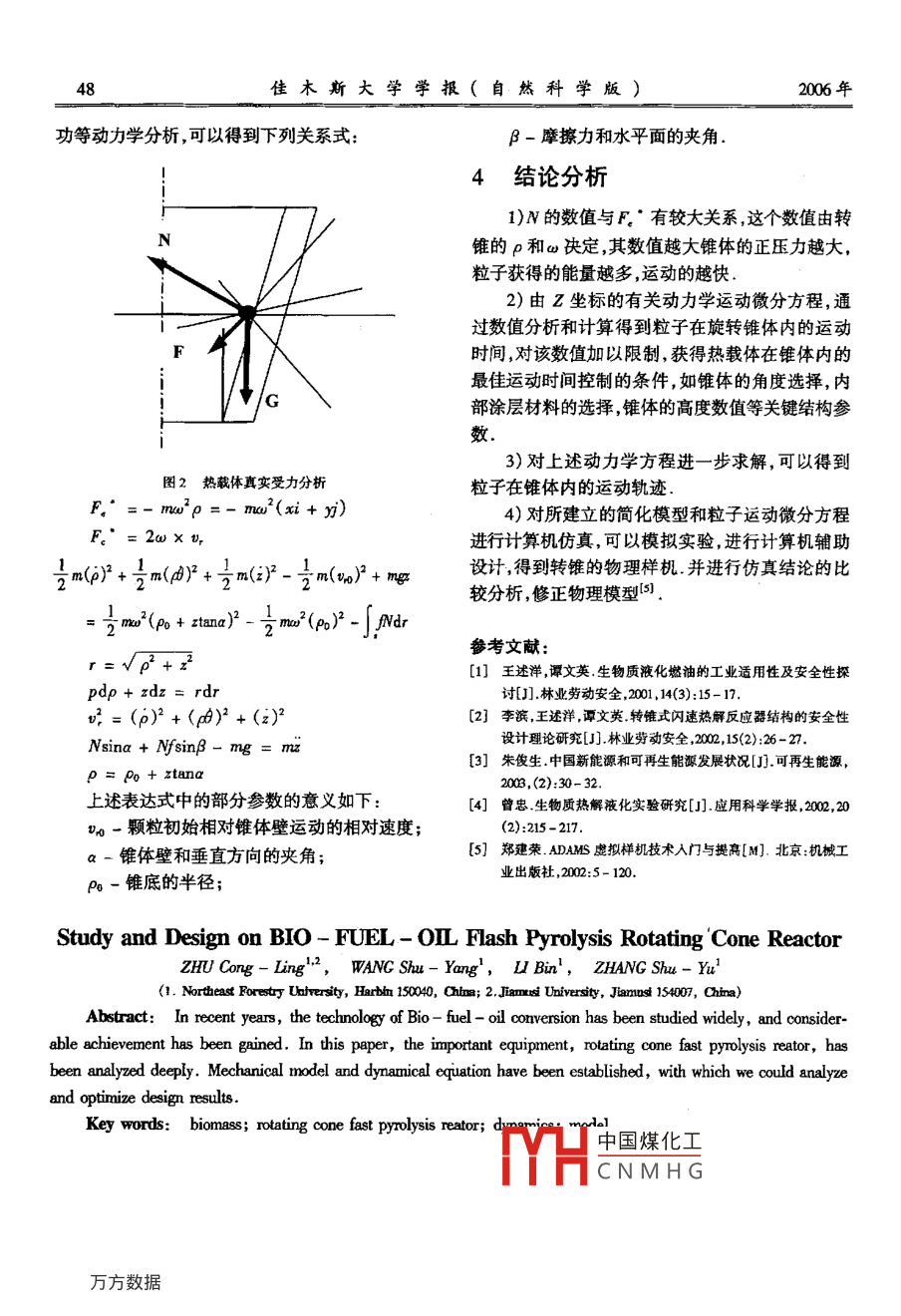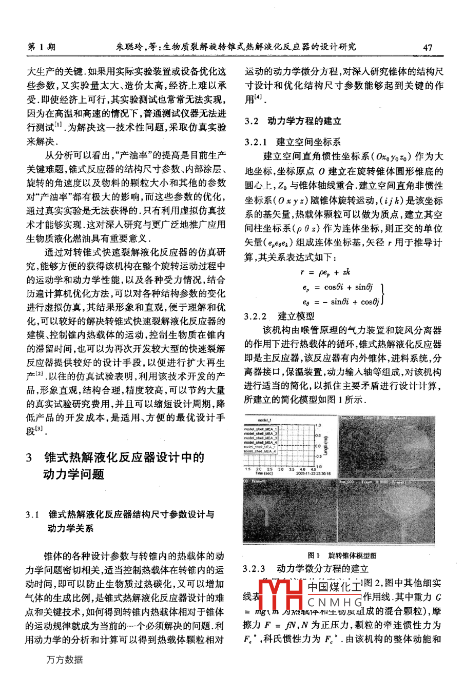 第24卷第1期佳木斯大學學報(自然科學版)Vol 24 No. 12006年01月Journal of Jiamusi University(Natural Science EditionJar2006文章編號:1008-1402(20601-0046-03生物質(zhì)裂解旋轉(zhuǎn)錐式熱解液化反應器的設計研究朱聰玲12,王述洋1,李濱,張姝玉(1東北林業(yè)大學黑龍江哈爾濱15000;2佳木斯大學黑龍江佳木斯154007)摘要:近年來科技界對生物質(zhì)快速轉(zhuǎn)化生物燃油技術進行了大量的研究,并且取得了很大的成就,本文就該技術中的關鍵設備錐式熱解液化反應器的動力學問題進行了詳細的分析,建立了力學模型,并且得出熱載體和生物質(zhì)混合顆粒的運動方程,利用該結(jié)論可以進一步對旋轉(zhuǎn)錐體進行優(yōu)化設計關鍵詞:生物質(zhì);錐式熱解液化反應器;動力學;模型中圖分類號:X941文獻標識碼:A0引言各種工業(yè)燃油鍋爐的燃料,也可通過對現(xiàn)有內(nèi)燃機供油系統(tǒng)進行簡單改裝,直接作為各種內(nèi)燃機、引能源短缺是當前中國所面臨的重大問題,近擎的燃料,并且不含硫,不會造成酸雨,其它排放物年來生物質(zhì)利用技術有了很大突破,一些新技術已均在可接受的范圍內(nèi)來生產(chǎn)運載工具用柴油對生能夠?qū)⑸镔|(zhì)經(jīng)濟快速地轉(zhuǎn)化成生物燃油(一種新物原油進行催化和品位升級處理,可獲得高質(zhì)量的型液體燃料).生物質(zhì)液化燃油(Bio-oil,Bio-fuel汽油或柴油生物原油經(jīng)這種處理后所得到的產(chǎn)物-ol, Liquid-bio-ol)是一種以廢棄生物質(zhì),如各分別稱為生物汽油和生物柴油,可同石化汽油和柴種廢棄農(nóng)業(yè)秸稈、廢棄木本植物、草本植物及城市油一樣直接用于汽車、拖拉機和各種內(nèi)燃機和動力有機垃圾等)為原料,在特定的熱裂解工藝條件下,機械,是物美廉價的石化柴油、汽油的替代品經(jīng)快速分離、轉(zhuǎn)化所獲得的新型、綠色可再生的生現(xiàn)在,英國、荷蘭和加拿大等幾個國家已經(jīng)完物質(zhì)液體燃料.生物質(zhì)液化燃油能替代石油已成為成中試,加拿大已開始向商業(yè)化的方向邁進(產(chǎn)油當今國際能源與環(huán)保領域的重大課題25噸/日),荷蘭完成的中試設備能力為200kg/h廢1國內(nèi)外研究概況及發(fā)展趨勢棄生物質(zhì),目前正在上馬一套200kg/h生物質(zhì)生產(chǎn)工廠,英國則在研制生物燃油發(fā)動機、燃氣發(fā)電90年代中期開始到現(xiàn)在,國外已經(jīng)有少量的機方面遙遙領先研究表明生物質(zhì)可以轉(zhuǎn)換為液體燃料.英國、荷蘭、意大利、加拿大等國相繼在生物質(zhì)轉(zhuǎn)化生物燃油技2關鍵設備錐式熱解液化反應器的術方面取得突破.國內(nèi)的一些高校和科研院所也已設計研究問題開始研制用廢棄物質(zhì)快速轉(zhuǎn)化生物燃油的工藝與設備如,山東理工大學易唯明教授領導的生物質(zhì)目前,生物質(zhì)裂解液體燃料尚處于研發(fā)的初級能研發(fā)團隊,東北林業(yè)大學王述洋院長組建的研發(fā)階段,尚未形成高轉(zhuǎn)化率的規(guī)?;a(chǎn)受設備裝團隊,浙江大學朱清石校長領導的研發(fā)團隊等都在置的限制,尤其是錐式反應器,它的內(nèi)部涂層、錐奮力研究和發(fā)展生物質(zhì)液化燃油制造和應用技術,角、內(nèi)部結(jié)構、尺寸參數(shù)、角速度等眾多設計參數(shù)都并且均已取得了技術性突破生物原油可直接用作有中國煤化工常是影響產(chǎn)油率和擴CNMHG①收稿日期:2005-11-07金項1:2:232然金5(號33頂項1(編9:310389進國際先進農(nóng)業(yè)技術項目(輸號作者介:奎選澤(332龍江結(jié)杰頂人北業(yè)夫?qū)W機餐查形奇被工程學院教投,第1期朱聰玲,等:生物質(zhì)裂解旋轉(zhuǎn)錐式熱解液化反應器的設計研究大生產(chǎn)的關鍵如果用實際實驗裝置或設備優(yōu)化這運動的動力學微分方程,對深入研究錐體的結(jié)構尺些參數(shù),又實驗量太大、造價太高,經(jīng)濟上難以承寸設計和優(yōu)化結(jié)構尺寸參數(shù)能夠起到關鍵的作受即使經(jīng)濟上可行,其實驗測試也常常無法實現(xiàn),用4因為在高溫和高速的情況下,普通測試儀器無法進行測試.為解決這一技術性問題,采取仿真實驗3.2動力學方程的建立來解決3.21建立空間坐標系從分析可以看出,“產(chǎn)油率”的提高是目前生產(chǎn)建立空間直角慣性坐標系(Ox0y)作為大關鍵難題錐式反應器的結(jié)構尺寸參數(shù)內(nèi)部涂層、地坐標坐標原點O建立在旋轉(zhuǎn)錐體圓形錐底的旋轉(zhuǎn)的角速度以及物料的顆粒大小和其他的參數(shù)圓心上,Z0與錐體軸線重合建立空間直角非慣性對“產(chǎn)油率”都有極大的影響,而這些參數(shù)的優(yōu)化,坐標系(Oxy)隨錐體旋轉(zhuǎn)運動,(A)是該坐標通過真實實驗是無法獲得的只有利用虛擬仿真技系的基矢量,熱載體顆??梢宰鰹橘|(zhì)點建立其空術才能夠?qū)崿F(xiàn)這對深人研究與更廣泛地推廣應用間柱坐標系(p6)作為連體坐標則正交的單位生物質(zhì)液化燃油具有重要意義矢量(eeae)組成連體坐標基,矢徑r用于推導計通過對轉(zhuǎn)錐式快速裂解液化反應器的仿真研算,其關系表達式如下究,能夠方便的獲得該機構在整個旋轉(zhuǎn)運動過程中的運動學和動力學性能,以及各種受力情況,結(jié)合歷遍計算機優(yōu)化方法,可以對各種結(jié)構參數(shù)的變化cosei sin aj進行虛擬仿真,其結(jié)果形象和直觀,便于理解和優(yōu)ea =