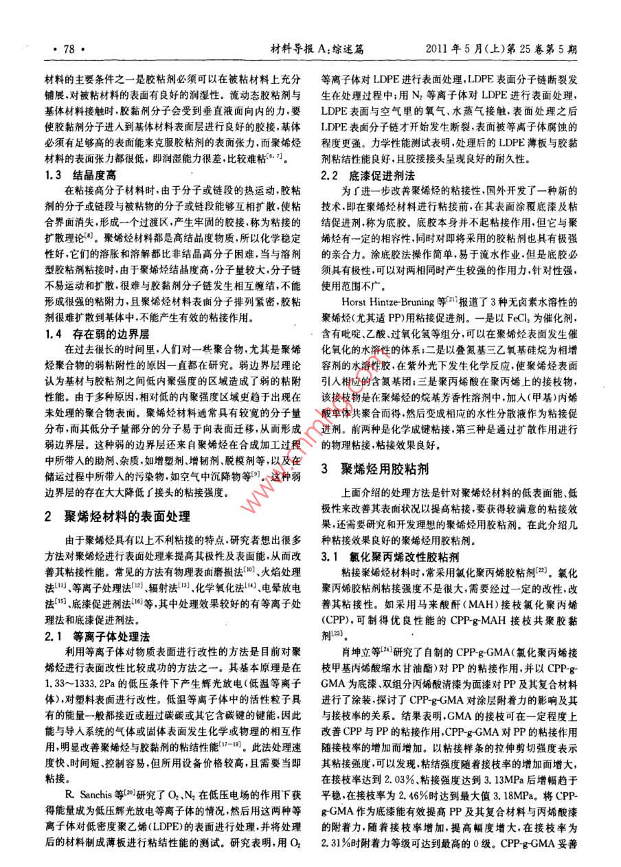 聚烯烴粘接的研究進(jìn)展/張翼等,77●聚烯烴粘接的研究進(jìn)展張翼,齊暑華,段國晨,吳新明(西北工業(yè)大學(xué)理學(xué)院應(yīng)用化學(xué)系,西安710129)摘要聚烯烴是一類性能優(yōu)良的通用塑料,廣泛應(yīng)用于包裝工業(yè)、電子工業(yè)、建筑工業(yè)等領(lǐng)域,但聚烯烴材料難于粘接。在分析聚烯烴材料難粘原因的基礎(chǔ)上,綜述了聚烯烴表面處理技術(shù)及各種聚烯烴用膠黏劑。論述了等離子體處理、底漆促進(jìn)劑等技術(shù),同時(shí)討論了氯化聚丙烯改性膠粘劑、熱熔膠粘劑、SBS熱塑性彈性體膠粘劑、丙烯酸酯類膠粘劑、有機(jī)硅密封膠粘劑。最后對今后聚烯烴粘結(jié)的發(fā)展趨勢做了簡要介紹。關(guān)鍵詞聚烯烴粘結(jié)表面處理 膠黏劑The Development of Polyolefin AdhesionZHANG Yi, QI Shuhua, DUAN Guochen, W∪Xinming(Department of Applied Chemistry, School of Science, Northwestem Polytechnical University, Xi'an 710129)AbstractPolyolefin is a kind of common plastic with excellent properties which is widely used in the fields ofpackaging industry, electronics industry and construction industry, but it is dificult to be bonded with other materi-als. The reasons why it is dificult to be bonded have been introduced firstly. Then the surface treatments of polyolefinand adhesives for bonding polyolefin are summarized in detail. In the first part, plasma treatment and primer promoterare mainly related. In the second part, it comprises adhesives modified by chlorinated polypropylene, hot melt adhe-sives, SBS thermoplastic elastomer adhesives, acrylate adhesives and organosilicone sealants. The developing trend ofpolyolefin adhesion in the future is presented fnally.Key words polyolefin, adhesion, surface treatment, adhesive聚烯烴材料以聚乙烯( PE)、聚丙烯(PP)為主,是通用高構(gòu)的原因,也有外界條件的原因??偟膩碚f,可以歸結(jié)為以分子材料的最大品種,也是合成材料家族中的重要成員,大下4個(gè)方面。約占世界熱塑性塑料產(chǎn)量的1/2以上1.2]。它具有優(yōu)異的物1.1 非極性高分子理性能、化學(xué)穩(wěn)定性,良好的加工性,可以循環(huán)利用,為現(xiàn)代膠粘劑吸附在被粘物的表面上是由分子間作用力引起農(nóng)業(yè)提供了必不可少的農(nóng)膜、灌溉材料,為現(xiàn)代建筑業(yè)提供的,這種作用力包括取向力、誘導(dǎo)力和色散力。極性分子相了大量性能優(yōu)異的基礎(chǔ)材料0。聚烯烴片材及各種注塑成互靠近時(shí),分子的固有偶極之間同極相斥異極相吸,分子在型制品還被廣泛應(yīng)用于包裝工業(yè)、汽車工業(yè)、電子工業(yè)等領(lǐng)空間按- -定取向排列,使體系處于更穩(wěn)定狀態(tài),這種固有的域。偶極之間的作用力稱為取向力。在極性分子和非極性分子PE自1933年實(shí)現(xiàn)工業(yè)化生產(chǎn)以來,已形成低密度聚乙之間, 由于極性分子偶極所產(chǎn)生的電場對非極性分子發(fā)生影烯(LDPE).高密度聚乙烯(HDPE)和線型低密度聚乙烯響,非極性分子就產(chǎn)生了偶極,叫作誘導(dǎo)偶極,誘導(dǎo)偶極和固(LLDPE)3大系列。PE具有優(yōu)異的加工性能和使用性能,有偶極相互吸引而產(chǎn)生的作用力叫作誘導(dǎo)力。由于分子中應(yīng)用領(lǐng)域廣泛。PP于1957年實(shí)現(xiàn)工業(yè)化生產(chǎn),已成為通用電子和原子核不停地運(yùn)動(dòng),非極性分子電子云的分布呈現(xiàn)有熱塑性樹脂發(fā)展最快的品種,是合成樹脂的第二大品種。PP漲有落的狀態(tài),從而使它與原子核之間出現(xiàn)瞬時(shí)相對位移,生產(chǎn)工藝簡單,原料來源豐富,可以通過化學(xué)和物理手段開產(chǎn)生 了瞬時(shí)偶極,瞬時(shí)偶極可使其相鄰的另一非極性分子產(chǎn)發(fā)多樣化、系列化、高性能化產(chǎn)品。聚烯烴材料物理化學(xué)性生瞬時(shí)誘導(dǎo)偶極,這種隨時(shí)產(chǎn)生的分子瞬時(shí)誘導(dǎo)偶極間的作能都很優(yōu)異,但是,它難于粘接,使其在更多領(lǐng)域的應(yīng)用受到用力為色散力。極性分子和極性分子之間既有取向力又有了限制。本文首先分析了聚烯烴材料難粘的原因,然后綜誘導(dǎo)力,而聚乙烯、聚丙烯等都是非極性高分子,對于這些非述了聚烯烴材料的表面處理及各種聚烯烴用膠黏劑,最后對極性高分子材料表面,不具備形成取向力和誘導(dǎo)力的條件,它的發(fā)展趨勢作了簡要介紹。只能形成較弱的色散力,因而其粘附性能較差5。.1.2 潤濕能力差1聚烯烴材料難粘的原因膠粘劑在未固化前一般都呈流動(dòng)態(tài),粘接過程是膠液在聚烯烴材料之所以難粘,原因是多方面的,既有自身結(jié)粘接件表面浸潤,然后固化的過程,所以膠粘劑能牢固粘接張翼: 1985年生,博士,主要從事膠粘劑等方面的研究E mail: zhangyi520love@yahoo. com. cn材料導(dǎo)報(bào)A:綜述篇2011年5月(上)第25卷第5期材料的主要條件之- -是膠粘劑必須可以在被粘材料上充分等離子體對LDPE進(jìn)行表面處理,LDPE表面分子鏈斷裂發(fā)鋪展,對被粘材料的表面有良好的潤濕性。流動(dòng)態(tài)膠粘劑與生在處理過程中;用N2等離子體對LDPE進(jìn)行表面處理,基體材料接觸時(shí).膠黏劑分子會(huì)受到垂直液面向內(nèi)的力,要LDPE表面與空氣里的氧氣、水蒸氣接觸,表面處理之后使膠黏劑分子進(jìn)人到基體材料表面層進(jìn)行良好的膠接,基體LDPE表面分子鏈才開始發(fā)生斷裂,表面被等離子體腐蝕的必須有