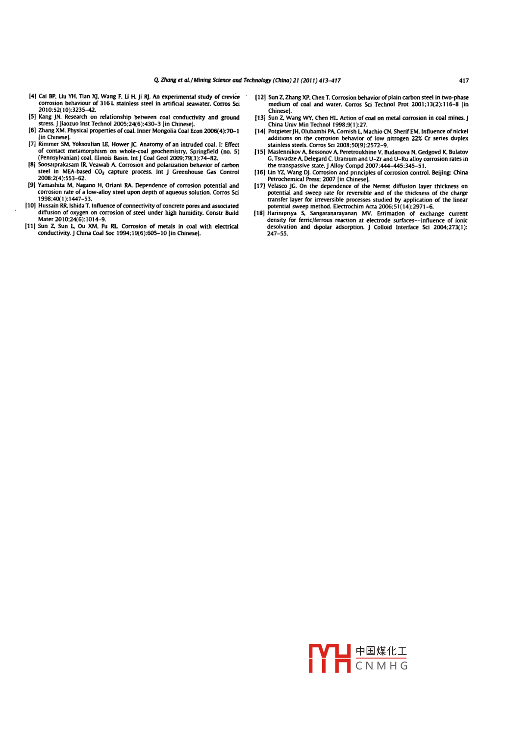 Mining Science and Technology(China)21(2011)413-417Contents lists available at Science Direct氵Mining Science and Technology( China)ELSEVIERjournalhomepagewww.elseviercom/locate/mstcEffect of coal slurry on the corrosion of coal-mine equipmentZhang Qi, Xie Jingxuan*. Zhao Wei, Bai Shasha, Zhong Shiteng, Chu ZhenfengKey laboratory of Coal Processing and Eficient Utilization, School of Chemical Engineering and Technology, China University of Mining and Technology, Xuzhou 221008, ChinaARTICLE INFOABSTRACTThe corrosion of coal mine equipment immersed in coal slurry is addressed. The corrosion of low carbonReceived 22 october 2010Received in revised form 18 November 2010steel samples immersed in coal slurries of different concentrations(80. 130, and 180 g/L)preparedAccepted 15 December 2010rom coals of different rank(long-flame coal, meager lean coal, and anthracite)and different granularityAvailable online 12 June 2011(0.25-0.5 mm. 0.074-0. 25 mm, and less than 0.074 mm particle size) was studied by the electrochemicalmethod of polarization curve measurement controlled potential sweeping and continuous scanning. Theresults show that the corrosion rate in an anthracite slurry where the coal has high coalification, is fargreater than corrosion in a long-flame or a meager lean coal slurry. Furthermore the corrosion current.polarization current, and corrosion rate of low carbon steel become larger, and the polarizability becomessmaller. as the coal particle size decreases. The same trend is seen as the concentration of the coal slurryo 2011 Published by Elsevier B V, on behalf of China University of Mining Technology1 Introduction2. ExperimentalEquipment corrosion has always been a key factor related2.1. Instruments and reagentsservice life in coal mining. Some equipment is immersed in slimewater for a long time and any low-carbon steel structure isThe electrochemical workstation(IM6e, Zahnereletrik Gmbhdestroyed by this corrosive medium. in addition, running equip- Co., KG), potentiometer(EL20, Shanghai). and conductivity meterment also suffers serious erosion due to abrasion between media (DDS]-308A, Shanghai)were used in this study a low carbon steeland equipment. For example, the flotation vanes of a coal washery (Q235)with 0. 14-0. 22 carbon content was used. The working elec-located in the Huaibei mining field suffered corrosion and erosion trode had an area of 7. 065 cm and a saturated calomel electrodeof a large area after only three months in operation. Furthermore, was used as the reference. Anthracite meager lean coal, and longthe coal slurry transportation pipelines were worn out. These prob- flame coal samples were from the Taixi, Xuzhou and Yulin mineslems created great difficulties in terms of maintenance and caused respectively. the chemical composition of the test solution comeshuge economic losses to the enterprisefrom water quality analysis of flotation feed and flotation tailingsFactors influencing electrochemical corrosion of metal are found in the Guobei coal washery. Its chemical components arediverse. Many publications address the characteristics of the metal given in Table 1and the corrosive medium including pH value, concentration ofanionic and cationic ions, oxygen content, and the distribution ofoxygen within the area suffering corrosion 1-4]. However, in the 22. Methodscoal industry corrosion of equipment is closely related to contactwith slime water containing complex ions and coal.First, the coal sample was crushed and screened into three dif-The effect of the coal on metal corrosion is the primary focus of ferent size ranges: 0. 25-0. 25 mm. 0.074-0 25 mm, and less thanthis paper. Preliminary studies on the corrosion of low carbon steel 0.074 mm. These granulated samples were used in making the coalimmersed in coal slurries of various concentrations prepared from slurry at concentrations of 80, 130, or 180 g/L using the test solucoals of different rank and particle size have been investigated by tion as the liquid medium.electrochemical methods. The goal is to provide useful informationThe low carbon steel was de-rusted, polished, and then cleanedconcerning the corrosion and protection of coal mining equipment. with distilled water, acetone, and then distilled water again. It wasthen put into the slime water for one hour while ensuring adequatecontact between the steel and the coal. After the system reached astable potential its free corrosion potential was measured using aCorresponding author. Tel +86 15996915259potentiometer. Theum and the stea-E-mailaddress:zhangqi@126.comUxie).dy-state polarizat中國煤化工nd anode wer1674-5264/s-see front matter o 2011 Published by Elsevier B.V. on behalf of China University of Mining & TeCNMHGdoi:10.1016mstc201105015414Q Zhang et aL/ Mining Science and Technology(China)21(2011)413-417Table 1Chemical components of the test solution.ComponentO Mg* Ca2+c(mg/L)3202501.16measured with a conductivity meter and an electrochemical work-station, separately. a curve showing corrosion current density versus scanning onog coordinate scale was automaticallyplotted. This curve, E vs log i, along with the slope of the polariza-tion curve and some electrochemical parameters, including corrosion potential and corrosion current, were automatically obtainedThe corrosion rate was derived from the corrosion current accordEscE(ing to Faraday's law. The tests were done at ambient temperature. fig 2. Polarization curves of low carbon steel in coal slurries: diferent ranks ofhe media will be indicated in this paper as: A: blank solutionBlong flame coal slurry: C: meager lean coal slurry: D: anthracitecoalification.slurry: E: slurry prepared with 0.25-0.5 mm anthracite: F: slurryprepared with 0.074-0.25 mm anthracite: G: slurry prepared with the anthracite slurry is 480 us cm, which corresponds to the big-<0.074 mm anthracite: L: 80 g/L anthracite slurry: M: 130 g/ gest corrosion rate of low carbon steel in it. Whereas the conduanthracite slurry: