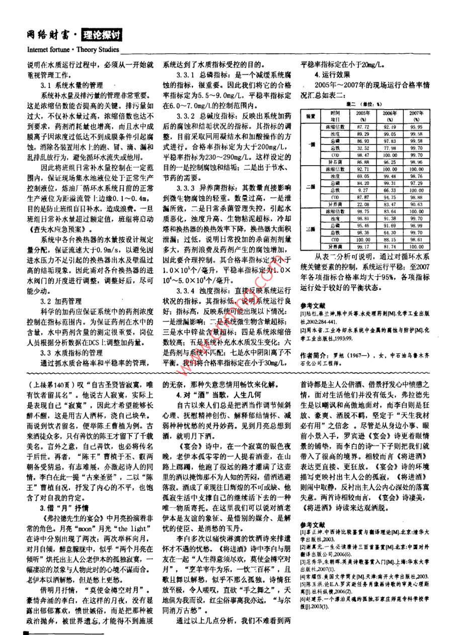 理論探討●網(wǎng)絡財富Theory Studies●Intemet fortune煉油廠循環(huán)水系統(tǒng)水質(zhì)日??刂埔亓_旭,彭衛(wèi)(中國石油烏魯木齊石化公司研究院,新疆烏魯木齊830000)[摘要]煉油廠循環(huán)水系統(tǒng)水質(zhì)日??刂埔蛩赜性S多,要使循環(huán)水系統(tǒng)水質(zhì)控制處于受控狀態(tài),經(jīng)過多年的觀察和分析,認為抓住幾個日常關(guān)鍵要素的控制,其它因素圍繞這幾個關(guān)鍵要素進行適度調(diào)整就能使系統(tǒng)運行保持在腐蝕與結(jié)垢的平衡狀態(tài)中,同時增加系統(tǒng)的縵沖和抗風險能力。[關(guān)鍵詞]泄漏介質(zhì);濁度;總確;總堿度;異養(yǎng)菌循環(huán)水系統(tǒng)日常控制土要是掌握好腐1.3 日常投加藥劑:阻垢緩蝕劑、陰2.3.1 影響:供水壓力低,會引起裝蝕與結(jié)垢的平衡問題。循環(huán)水系統(tǒng)水質(zhì)好垢分散劑、 殺菌劑。目前投加的阻垢緩蝕劑置 換熱器流速低,加速系統(tǒng)腐蝕傾向;供壞的直接反映因素是濁度,濁度低,系統(tǒng)中含磷有機化合物和鋅鹽, 鋅鹽低,纓蝕水壓力高, 提高裝置換熱器運行風險。運行狀態(tài)優(yōu)良:濁度高,反映出系統(tǒng)存在效果不理想: 鋅鹽高,易引起水體泛白,2.3.2對策:水質(zhì)風險隱患,如:泄漏、H常加藥是否濁度 上升,其沉積,會產(chǎn)生松軟浮垢:磷●要求當班班組每4小時對系統(tǒng)所帶到位、加藥量是否合適、水質(zhì)控制因素是有機化合物低, 藥劑起不到緩蝕的效果,各裝置進行供水壓力查詢并記錄, 不能低于否定位合適、水質(zhì)控制因素是否運行平穩(wěn)、而 其含最高又會引起點蝕和微生物的滋生。裝置正常生產(chǎn)運行的安全壓力, 一旦發(fā)現(xiàn)壓等請多問題。經(jīng)過多年的觀察與分析,認投 加的殺菌劑目前有氧化型殺菌劑和非氧化力低于安全生產(chǎn)壓力, 立即對系統(tǒng)壓力進為循環(huán)水系統(tǒng)的關(guān)鍵控制因素主要有濁度、型殺菌劑兩 人類,氧化型殺菌劑主要是含鹵行調(diào)整??偭住⒖傎\度、異養(yǎng)蘭,控制好這四個關(guān)族元素 的殺菌劑,其含量高易造成設備腐●定期對各用水裝置進行流速測試,鍵因素,循環(huán)水系統(tǒng)的腐蝕與結(jié)垢的平衡蝕: 非氧化型殺菌劑主要有季銨鹽類、異噻確保換熱器流速 大于0.9m/s.向題就能夠得到較好的保證。唑啉酮類、醛類化合物等,這類殺菌劑投2. 4阻垢緩蝕劑的影響1.系統(tǒng)現(xiàn)狀加量大,易引起水體發(fā)白,新水消耗量人。阻垢緩蝕劑的主要成分是磷,磷足成1.1系統(tǒng)補水:主要是新水,新水中2.循環(huán)水系統(tǒng)的影響因素及對策膜因子,因此系統(tǒng)中總磷含量的高低直接的陰陽離子是平衡的。水中含最較多并對2.1介質(zhì)泄漏的影響體現(xiàn)裝置設備的腐蝕強弱。水的性質(zhì)起主要作用的陽離子有鉀、鈉、2.1.1介質(zhì)泄漏的判定:介質(zhì)泄漏后2.4.1影響:總磷含量過低,系統(tǒng)腐鈣、鎂;陰離子有硫酸根、氯離子、碳酸的直接反映一是氣味的判定, 二是濁度上蝕增強: 總磷含量過高,系統(tǒng)易產(chǎn)生磷酸氫根;陽離子鉀、鈉含量高及圉離子硫酸升, 隨后觀測分析其他數(shù)據(jù),如COD、 異養(yǎng)鹽垢, 引起點蝕:同時磷義是微生物的營根、氯離子含量高會使系統(tǒng)腐蝕傾向增加:菌、 生物粘泥、PH值等參數(shù)的變化,可分養(yǎng)源, 過高會使系統(tǒng)微生物及生物粘泥滋陽離子鈣離子含量高及陰離子碳酸氨根離析出泄漏介 質(zhì)是汽油、或柴油、或芳烴、生嚴重。子含量高會使系統(tǒng)結(jié)垢傾向增加。新水中不或液態(tài)烴、 或重油、或機械密封油等:如2.4.2 對策;能測出COD、總磷的含量,一旦測出將預 果再增加氨氮、 硫化物分析數(shù)據(jù)后,通過●在生產(chǎn)運行過程中通過數(shù)據(jù)統(tǒng)計分示著我們的飲用水系統(tǒng)遭到污染,需立即橫向數(shù)據(jù)對比分析, 可大致確定泄漏介質(zhì)析, 確定出適合自身系統(tǒng)的總磷控制指標。查明原因進行糾錯。日前煉油廠新水的水是否為 T.業(yè)問用污水,或精制裝置泄漏?!袢粘_\行過程中,嚴格控制總磷指質(zhì)狀況見表- -2.1.2影響:系統(tǒng)濁度超標、異養(yǎng)菌標, 把它作為水質(zhì)指標控制的重中之重來1.2泄漏介質(zhì):主要是含碳的烴類物 超標、生物粘泥超標、腐蝕加劇,換熱效 管理。質(zhì),如:汽油、柴油、航空煤油、液化氣、果下降。2.5殺菌劑的影響渣油、芳烴等。2.1.3對策:殺菌劑是一-把雙貝劍,力度掌握不好新水水質(zhì)狀況●立即組織人力進行查漏,及時切出反而會傷及自身。項目單位數(shù)據(jù)泄漏源。2.5.1影響:投加殺菌劑的劑最過低,7.6●提高殺菌劑的投加劑量,控制微生無法控制系統(tǒng)微生物含量: 投加殺菌劑的電導本(25T)615物的大量滋生。劑量過高,會破壞設備材質(zhì),引起換熱器0.05●將殺死的微生物通過排污的方式,疏松穿孔。來檢出清除出系統(tǒng)。:2.5.2 對策: :143.1●投加緩蝕阻垢劑,對系統(tǒng)進行緩蝕●根據(jù)系統(tǒng)微生物種群的不同,投加229.3不同類型的殺菌劑。167.22.12.2供水溫度的影響●根據(jù)系統(tǒng)微生物數(shù)量的多少,確定破酸服電/L40.42.2.1影響:供水溫度高系統(tǒng)呈結(jié)垢投加劑量。氧化園/L1.8傾向,供水溫度低系統(tǒng)腐蝕傾向?!駠栏袢粘O到y(tǒng)微生:物指標的管理,COOBg/L本檢出g/2.2.2