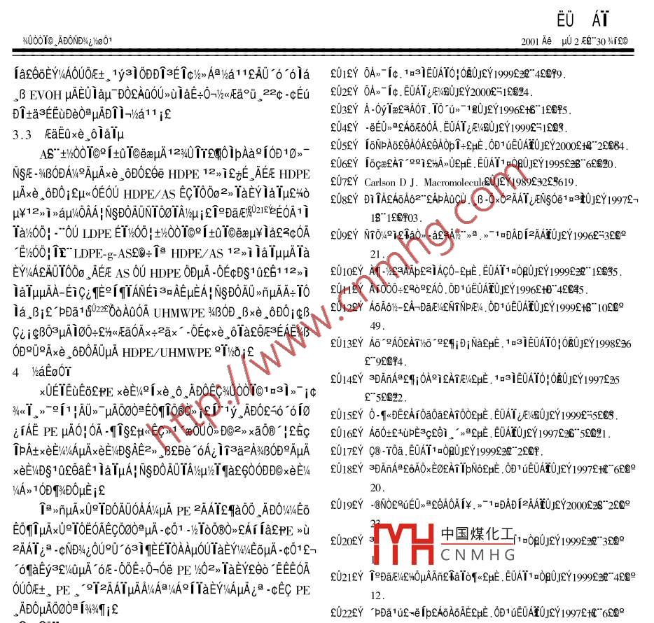 E AT2001 Ae μ0 2日~"30 %iEO40010. ADONDW2/ha01的的創(chuàng)前> 1~6Nsz2AATjENg0e1c3iN8092. 1:21/>> i" '6NS》-x/30e》- Ng1c3iNg0ez斜+ 02 710049200助0ε9UE8AE1uAU4000T@TPA+xeE%2「xe。,6 ADOμAND%ε V%01 Cejo2HOAOAEEuACμAx+0A>UAi2Zc%eEUAE,EuACμAOAEtpajf10/0C9000T0C第PA+xeEN4Exe, ,02AAT232>i0D1/-0AaAE9Q325. 12 TATxteETAeEA TAOAtaeAEr00 - 9456" 200102 - 0038 - 04Progress in the Modification of PEQIAN Jun-min'fHI Xu xiang2E" 1. College of Materials Science and Engineering22. College of Environment and Chemical Engineering£E-Xii an Jiaotong UniversilyE-Xi an 710049E -China 20Abstract£Studies on the non-halogen flame relardation and barrier modifications of PE at home are reviewed.The operating mechanisms of non-halogen flame retardant agent and barrier material in PE matrix composites are alsodiscussed. In addition2 the advantages and disadvantages of the modified PE are introduced.Key wordsfPEEnon-halogen flame retardantfEbarrier materialEblending1 C°NOμATP>UuxEVWNAECCaNo>- AAi e%>-TrjA8EaDijea>~9[3400T"PEE@U nμ1A@C≥ED1401 aEY0x&qoCO34BOD個780>-i8~ ATOLOMNy>- e9xEaxExE/4AVN46ONkmEeEeTAOAAVD0AUEOqoDeCOA;' 6£0|AAxe 1aifuδNx”<2$EUqEμi iafNipTq%∈C>UE0N4Aig1%2μcD0A000%° xeE/4μED0A02> 9A&> AUAuxaTEXxEV4AμA>U+40@C6EAxAU_ ,i%0N134pi60%kμAECxE/%/A1°0μ0:0AμA0≌C6jE0a;E001" 1y0eFaEd1a3iE0A12>iμAEaE0D0AU2%° 0@C6xeE/)A。BDSδ6uDei i1%0A;E>2>>a>O%OEei i404A911個A1μA00. AEEjEOE0U PE E+0-3∈-Cμul40A1y9aμA. B3401T1401 口1 a001Ei 22>>au/40A>u2A>uNauITATμAIaEYD0vYDμD0AOμA1yq惟h>- jf@AEia ,BxeE%4 ,B401μA3a>+Gi27EH0μ¥12>if6ajEE1AaA30》-/kAaeD0A0μA00_ AEEEpAOAuxaEμ%4EO:0AμA0@Ax1 ahagE6u0ATp >Ux∈EV%I%AμAASqEOE3-T,》 2啊ρ @AECoif0o EE為a%4o400010eFaEu2AAIμAaEYD01EiaEC>n。AE4O0TμAv401 aD0A0j@Oq作91x個002uE .μADOAU£P(guān)μAxU°TDOA00AANqμA PE >u2AATμA10%uTE1a£0=EC%4000 >xE1%/IA>10!0DAi IeμAAE作-029" -02≥%40≌0-E@210。ADOμAEEμa' TElaj&x%TAq0%uAeA^ PE TpA+xeE/49「2.1 M& 0H2@xeEl1a1μxe, ,6 ,ADOμAxTDANDWj/koDBAEx0EojfMf"0HA@0e AOHEOWBODEETEST DOAORAjieE%ji中2 PE 1PAtxeE%4 ,ADO1pbiz@>>0-$j@>2uEu.,-E' DOEo iajcNiAiDi j@>2GEu2E0AAtE0AxE/A90400010:2oDDxeE/4 ADOt6aE>>IPT10EWquEOAμa&6Cμ1Atj和PA+xeEMia1μA0+0≌0-ATj2 .xENADS1Q°Q°A1slp《A+EO>-=TTr0U2AATODE/E0E+>a0e舊"OHEO latESM6" 0H2O -0%a TAE. ,BEE土9421μ1ε→_A3°"6AjμAA+>~CaFo iax AEo ia0x TuEO;OEODμAE@_Y °xE%12AfC°∩HF@∩A A11N1@xIWx$4 Mf" OH2④0=Di3ECaAtEat%BODOUCuHA_-E x+0Axθi≈EIp個1<2|6θo 0≌EC°TH中國煤化A工ATA1AH02%N6oETPOEAEA+EOxE)%AμAO|0A qisjf淚-ciPA+xeEV%A》 2409. CN MH GA吸μxEVe04x9EMgμANDNzf+AUONx6AE 6AiuA1ox+ iSAεσ°NDNixi@yv~0D f" 0HAQ iEOAx+ wW00YμAxEV%xAA Mf" OHAQ Ia* EO_aEOL2000- 05-15i9 38印AT40010. ADONDWZ/ho012001 Ae μ0 2的"30 %1公⑥HDPE OExeE/2AAT2θE0U ME" 0H200e HDPE μATaEYDOTEjROCuCimEjA- EiAA;91AOCuASAμEEia, BEEtaDTTA212M6" 0HEO 6AAi EUEEHO2> μ/xeE4DS 102{oOAAiTa E2q:46EU IBDOA001 TμEy29σ 9103>+Ci q001i2》6ifE$6a0DO>9" xeE/4D81 0fH的1P9E2> 2uuOAv400μif個≌-E£2> EUNgOBNDN;36AED1-a-%-"A". AERE。E'DOEo ia2euou ' ae1y310D2> >0-Q2>> 1δ83δ0θD30%AμAHDPE 0e ME"OH2Q@Wa μA Ia EY DOEEuAGiE .0個2 90xeEVDS10f2$C00-A1A-0- -a。>£4U。μ1A@jEME" OHSQtiAx^ |Ar91q0 HDPE +iAxe ADOAz0OifCaN6> AAμAxeEN>uAiSATH EUEE6Ej3]haWSE@E+i6NAi5sSAe16ANATO N("Hf+rIrxo 0 -c26 AEE&EA1E5迫A3BμAE@OFEoETiEiTAi96_。βir3a HDPE E士SA-Ei Ci NEμAμhA+ 10ia. ,BEFa>+>δNaeCo iEEV4Fo AμA"ES2c0DO》I uAAaE”x+0A£6D0uCizEAOia_BEfoqOqYANEAEμAO°7E0O-O2oA+ T0f- 0090T0+TA*DT*ETi> °2axWExeDOEEAE°ENOEoμA2AAIE0≥∈' aD0qTANDDis jEE60U AiaTμoDyOEe 5 -Y6CVo0Eesθ0;Exe01θi -.0xOμAiEEIAF ia0Y3ojf>1e0i2c AOATNEa6¥ANAMYA ' |Ai Mf" 0H&QtHAμ%μA6ACaN6》- AAx+ @xeEV%AO在士。HDPE xeE/2AATE士Bia HDPE uA"TANEi3zAE Tμk 53.3% fri1036A-Ei1u1u>a0i3E2AATA:NSDOAUμATA/4uLf4o i~ 1yOxeE/AuAEIDOqTANDDT≌SGaqYANEi3aAEtET-。AD0inaialμia_Bt1Ax%o0D。AD0006εE%a460aO> TEiajEAT -006Ax01491AE 9 +q6+j∪3a+GiTEla ,BAE 2.1 f9ifμ+%<6C>u1e0i3EμA CntiAai.2IWADPEiCaN6> AAzEOOE1CaN6》AAμAv:OEeAi la. Bμk 10 -YEtEME" 0HEO βi個3a HDPE μA0U>uiaODNBOD/hT°AμA -0Ec x+0AEZ> Vhδ xeE/4DOAUhTAqTANEi3aAE9j3a>=Ci作-0t0個280.8%2137.3kJ/m2E-Er"N6O, ey[a 27國9oC0. AEAE2AATμAAINSDOAOfEC2OA2AAT+fT038AV9AμAEIDOqTANDD ie ifoOC>u1e01 ;EAOECAj0U 4% ~ 8%uA-.TSA2AAT4BODVT°AμAAINSD0AOE→°0。20U1TAT+1AaDi3EAEO》. 6EaDO/hcAazaGajEAOECE1A-Ei ii作0148MPa la .βμ/% 154MPaEPa>+Ci作0in3aialμEIDOμAμla_ ,BμA2; -00-006無awBia0-00ED2> .2.43k.i 4n-2la .Buμ/AE2.8kJi qn-2i匯ADOGaNo> AAuAEE國_0Ca3pj& Focel:AA A TμADqO ME 0H2@1oDD-0/haTAqEjE T 264CEzAAT>ulaμAEE -0%a1AmEO2OE”i"!A196 i個3a HDPE-C I02AAT x09TA| NSDOAUA- 101aNuA 437cEy .Bμk 465 C ifμ+i i140CaNo》" AAμAx∈El4Oδ。BEN&" OHS@T |Ai TAEOeE+yaqOA! NSD0A0012>”62>DS/%A9iAx 96E6aN6> AAμAEE -0%a TAmEO60A 275CEzANf" OHSQiEeAi 06%/0zEA+ 10ia BxEI%DOAO<>aE1AT>uIayuAEE -0)%a TATETa 466C [00112601- 1y0ULDPE x∈EV&%盤~ ATH 9jqj Ax&@aTμODyOEe EPDME%E0oAINSDOAUTAN/UuiODEEOoOA γ∞04E600 PE -0x0A ETOyE/<uv40AEiaTμuAE iD0f0208/OAETP>xEV/AμAij40Ai i&μAμpuμAZAAT%B0DOAAvqμAxeEl4DOA0ja| NgDOAUOeμgFo DO1AE6006 40 Mf" OHE@VHDPE la IμμAδ3 9[ DBI7EYtDiAUEGa% IPN60, Eg~ LOIEQE T 30ftqu/AE s 40ys/miA0sεOδ≥E0Aμcx0Eo -00%6E0E0A J-2E5 Diy2μ%0EUATH %4-個NEao&" 40 -YEO!Ar96EiT3a 100 -Y ATH μAiaE:2UEuμA_ βA0μgxOE&^ A0Ai 1. 7eV ~ 1. 8eVZEo A+Tμ26aA-EiCi qE9qTANEi 3zAE -0t0 01|AiEtμA 7.20μAE0 HDPE )o0D -00020U HDPE -0x0A- ETOyEeAE5MPa °i 90% la_Bu/z 8.4MPa 2i 285%&foirsa 150丫δE>uμE/4< DO》u 1AEZc/%《Aa0AOU Mf" OH2@VHDPE i個3aATH μAiaTμiGaA-EiG;TE9iηIANEi3aAE -0+0。BT 14.a1u2%E10 ME 0H2@/HDPE la1uμAA-EiGiE9TGu-p 4MPa e 340%i&CimEμAμzla, BEHo9TANEi3xAEe isa>+Gi E0δ≈ETA/zuG≈2.3 Ax IμxεExialμEiEAi la%- -000 AiμA HDPE μAEOμa9 iE0EUEEU+%4AxIμxeEVWIAAεC°0D°xAx jeiAx j@OAxEaTSμEif2>tai6uA+%a11μAta>~0+0@ -cEu0U -G%8CoEtaSWa11-eEO> @046A9iAx j&xAx1@xeE%aAA”0F HDPE x∈E%4>U+%2>E0°Tijf2ATE6xAa0Aj06%0Ria1uμAA-EiCimEi 4TANEi3aAEjφ2.2 AATμxeE41aTμ3a>+GiE00%4° MI 3E1TAY&uC+