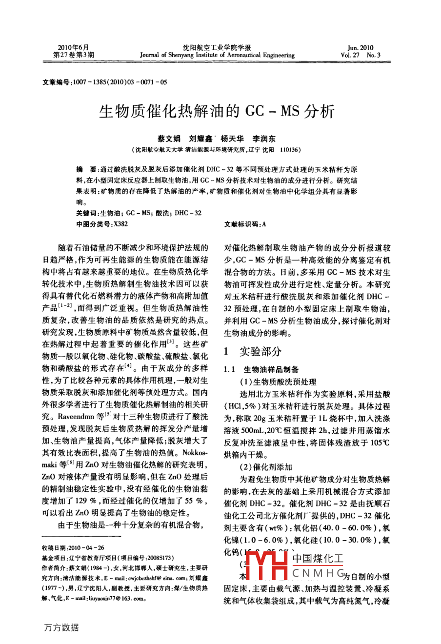 2010年6月沈陽(yáng)航空工業(yè)學(xué)院學(xué)報(bào)第27卷第3期Journal of Shenyang Institute of Aeronautical EngineeringVol 27 No. 3文章編號(hào):1007-1385(2010)03-0071-05生物質(zhì)催化熱解油的GC-MS分析蔡文娟劉耀鑫楊天華李潤(rùn)東(沈陽(yáng)航空航天大學(xué)清潔能源與環(huán)境研究所,遼寧沈陽(yáng)110136)摘要:通過酸洗脫灰及脫灰后添加催化劑DHC-32等不同預(yù)處理方式處理的玉米秸稈為原料,在小型固定床反應(yīng)器上制取生物油,用CC一MS分析技術(shù)對(duì)生物油的成分進(jìn)行分析。研究結(jié)果表明:礦物質(zhì)的存在降低了熱解油的產(chǎn)率,礦物質(zhì)和催化劑對(duì)生物油中化學(xué)組分具有顯著影響關(guān)鍵詞:生物油;CC-MS;酸洗;DHC-32中圖分類號(hào):X382文獻(xiàn)標(biāo)識(shí)碼:A隨著石油儲(chǔ)量的不斷減少和環(huán)境保護(hù)法規(guī)的對(duì)催化熱解制取生物油產(chǎn)物的成分分析報(bào)道較日趨嚴(yán)格,作為可再生能源的生物質(zhì)能在能源結(jié)少,GC-MS分析是一種高效能的分離鑒定有機(jī)構(gòu)中將占有越來(lái)越重要的地位。在生物質(zhì)熱化學(xué)混合物的方法。日前,多采用GC-MS技術(shù)對(duì)生轉(zhuǎn)化技術(shù)中,生物質(zhì)熱解制生物油技術(shù)因可以獲物油可揮發(fā)性成分進(jìn)行定性、定量分析。本研究得具有替代化石燃料潛力的液體產(chǎn)物和高附加值對(duì)玉米秸稈進(jìn)行酸洗脫灰和添加催化劑DHC產(chǎn)品2,而得到廣泛重視。但生物質(zhì)熱解油性32預(yù)處理,在自制的小型固定床上制取生物油,質(zhì)復(fù)雜改善生物油的品質(zhì)依然是研究的熱點(diǎn)。并利用GC-MS分析生物油成分探討催化劑對(duì)研究發(fā)現(xiàn),生物質(zhì)原料中礦物質(zhì)雖然含量較低,但生物油成分的影響在熱解過程中起著重要的催化作用。這些礦物質(zhì)一般以氧化物、硅化物、碳酸鹽、硫酸鹽氯化1實(shí)驗(yàn)部分物和磷酸鹽的形式存在。由于灰成分的多樣1.1生物油樣品制備性,為了比較各種元素的具體作用機(jī)理,一般對(duì)生(1)生物質(zhì)酸洗預(yù)處理物質(zhì)采取脫灰和添加催化劑等預(yù)處理方式。國(guó)內(nèi)選用北方玉米秸稈作為實(shí)驗(yàn)原料,采用鹽酸外很多學(xué)者進(jìn)行了生物質(zhì)催化熱解制油的相關(guān)研(HCl,5%)對(duì)玉米秸稈進(jìn)行脫灰處理。具體過程究。 Raveendmn等對(duì)十三種生物質(zhì)進(jìn)行了酸洗為,稱取20g玉米秸稈置于1L燒杯中,加入洗滌預(yù)處理發(fā)現(xiàn)脫灰后生物質(zhì)熱解的揮發(fā)分產(chǎn)量增溶液500mL,20℃恒溫?cái)嚢?h,過濾并用蒸餾水加、生物油產(chǎn)量提高,氣體產(chǎn)量降低;脫灰增大了反復(fù)沖洗至濾液呈中性,將固體殘?jiān)庞?05℃其有效比表面積提高了生物油的熱值。NOko烘箱內(nèi)干燥。mk等6用ZnO對(duì)生物油催化熱解的研究表明,(2)催化劑添加ZnO對(duì)液體產(chǎn)量沒有明顯影響,但在ZnO處理后為避免生物質(zhì)中其他礦物成分對(duì)生物質(zhì)熱解的精制油穩(wěn)定性實(shí)驗(yàn)中沒有經(jīng)催化的生物油黏的影響,在去灰的基礎(chǔ)上采用機(jī)械混合方式添加度增加了129%,而經(jīng)過催化的僅增加了55%,催化劑DHC-32。催化劑DHC-32是由撫順石可以看出ZnO明顯提高了生物油的穩(wěn)定性油化工公司北方催化劑廠提供的,DHC-32催化由于生物油是一種十分復(fù)雜的有機(jī)混合物,劑主要含有(w%):氧化鋁(4.0-60.0%),氧化鎳(1.0-6.0%),氧化硅(10.0-30.0%),氧收稿日期:2010-04-26化鎢(基金項(xiàng)目:遼寧省教育廳項(xiàng)目(項(xiàng)目編號(hào):20085173)中國(guó)煤化工作者簡(jiǎn)介蔡文姐(1984-),女河北邯鄲人,碩士研究生,主要研究方向:清潔能源技術(shù),E-mal:cwjcbczhshf@sin.com;劉耀鑫CNMHG為自制的小型(1977-)男遼寧沈陽(yáng)人副教授主要研究方向:煤/生物質(zhì)熱固定床,主要由載氣源加熱與溫控裝置、冷凝系解、氣化,E-mal:liuyaoxin77@163.com統(tǒng)和氣體收集袋組成,其中載氣為高純氮?dú)?冷凝沈陽(yáng)航空工業(yè)學(xué)院學(xué)報(bào)第27卷系統(tǒng)包括4支吸收瓶,并將吸收瓶放入盛有冰水表1不同預(yù)處理熱解產(chǎn)物比較混合物的容器中,如圖1所示。生物油產(chǎn)率焦炭產(chǎn)率氣體產(chǎn)率玉米秸稈34酸洗+DHC-32由表中可以看出,未處理的玉米秸稈熱解油經(jīng)過酸洗脫灰的玉米秸稈熱解油產(chǎn)率為35%和38%,呈上升趨勢(shì)。 Julien指出無(wú)機(jī)離子加強(qiáng)了纖維素的脫水反應(yīng)、分子間以及分子內(nèi)的鍵斷裂,1.N2氣罐;2.流量計(jì);3.控溫電阻爐;4.石英管;5.連續(xù)進(jìn)料口;6.冰水冷凝裝置;7收集瓶從而降低了左旋葡聚糖的產(chǎn)量。在酸洗過程中將圖1固定床反應(yīng)器生物質(zhì)快速熱解簡(jiǎn)易裝置圖引人CI,也有利于生物油的生成,而且脫灰增大(4)生物油制備方法了生物質(zhì)有效比表面積,提高生物油的熱值。在自制的小型固定床上,在溫度450℃,N2流而在酸洗玉米秸稈的基礎(chǔ)上加入催化劑量100mL/min條件下,對(duì)玉米秸稈、酸洗玉米秸HC-32的玉米秸稈熱解油產(chǎn)率為33%,比玉米稈以及添加DHC-32催化劑的酸洗玉米秸稈進(jìn)秸桿和酸洗玉米秸稈的熱解油產(chǎn)率都低,這是因行快速熱解實(shí)驗(yàn)制取生物油,并用孔徑為045m為在快速熱解過程中,生物質(zhì)內(nèi)礦物質(zh