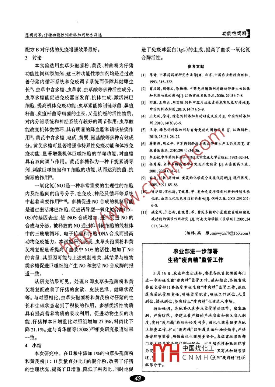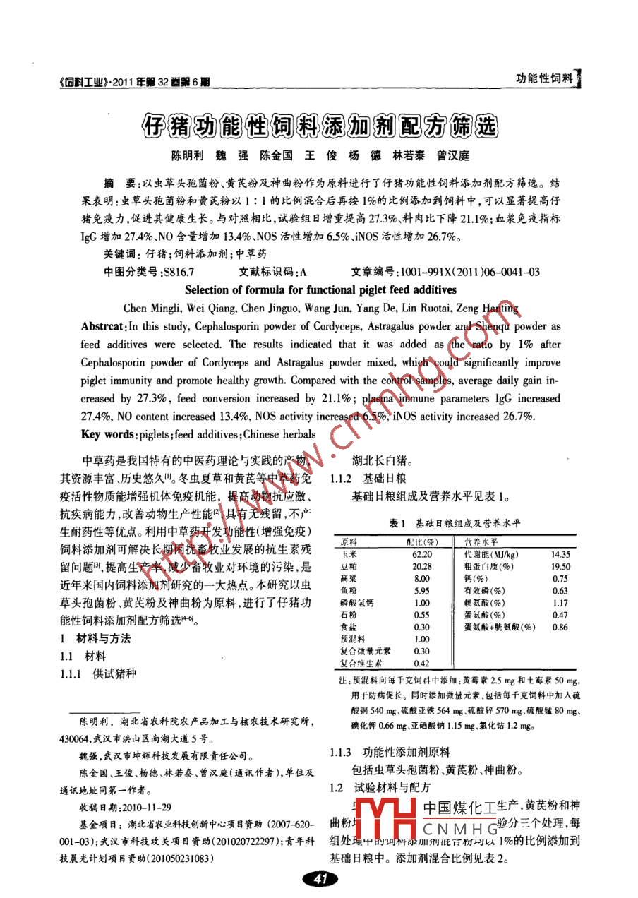 《飼料工業(yè)》-2011年第32眷第6期功能性飼料仔豬功能性飼料添加劑配方篩選陳明利魏強陳金國王俊楊德林若泰曾漢庭摘要:以蟲草頭孢菌粉、黃 芪粉及神曲粉作為原料進行了仔豬功能性飼料添加劑配方篩選。結(jié)果表明:蟲草頭孢菌粉和黃芪粉以1: 1的比例混合后再按1%的比例添加到飼料中,可以顯著提高仔豬免疫力,促進其健康生長。與對照相比,試驗組日增重提高27.3%、料肉比下降21.1%;血漿免疫指標(biāo)IgG增加27.4%、NO含量增加13.4%、NOS活性增加6.5%、iNOS活性增加26.7%。關(guān)鍵詞:仔豬;飼料添加劑;中草藥中圖分類號:S816.7文獻標(biāo)識碼:A文章編號:1001-991X(2011 )06- 0041-03Selection of formula for functional piglet feed additivesChen Mingli, Wei Qiang, Chen Jjinguo, Wang Jun, Yang De, Lin Ruotai, Zeng HantingAbstrcat:In this study, Cephalosporin powder of Cordyceps, Astragalus powder and Shenqu powder asfeed additives were selected. The results indicated that it was added as the ralio by 1% afterCephalosporin powder of Cordyceps and Astragalus powder mixed, which could significantly improvepiglet immunity and promote healthy growth. Compared with the control samples, average daily gain in-creased by 27.3%, feed conversion increased by 21.1% ; plasma immune parameters IgG increased27.4%, NO content increased 13.4%, NOS activity increased 6.5%, iNOS activity increased 26.7%.Key words:piglets feed additives ;Chinese herbals中草藥是我國特有的中醫(yī)藥理論與實踐的產(chǎn)物,湖北長白豬。其資源豐富歷史悠久"。冬蟲夏草和黃芪等中草藥免1.1.2 基礎(chǔ)日糧疫活性物質(zhì)能增強機體免疫機能,提高動物抗應(yīng)激、基礎(chǔ)H糧組成及營養(yǎng)水平見表1??辜膊∧芰?改善動物生產(chǎn)性能網(wǎng),具有無殘留,不產(chǎn)表1基礎(chǔ)日糧組成及營養(yǎng)水平生耐藥性等優(yōu)點。利用中草藥開發(fā)功能性(增強免疫)原料配比(%)代養(yǎng)水平飼料添加劑可解決長期閑擾畜牧業(yè)發(fā)展的抗生素殘K米62.20代謝能(MJ/kg)14.35留問題B.提高生產(chǎn)率,減少畜牧業(yè)對環(huán)境的污染,是高梁20.28粗蛋門|質(zhì)(%)0.75.508.00鈣(%)近年來國內(nèi)飼料添加劑研究的一大熱點。 本研究以蟲5.95有效磷(%)0.63草頭孢菌粉、黃芪粉及神曲粉為原料,進行了仔豬功.磷酸氫鈣1.00賴氨酸(%)1.170.55蛋氨酸(%)0.47能性飼料添加劑配方篩選140。0.30蛋氨酸+胱氨酸(%) 0.861材料與方法預(yù)混料,復(fù)合微最元素1.1 材料父合維生術(shù)1.1.1供試豬種注:預(yù)混料向每下克飼料巾添加:黃霉素2.5 mg和土霉素50 mg,用f防病促長。同時添加微量元素,包括每千克飼料中加入硫酸銅540 mg、硫酸亞鐵564 mg.硫酸鋅570 mg.硫酸錳80 mg、陳明利,湖北省農(nóng)科院農(nóng)產(chǎn)品加工與核農(nóng)技術(shù)研究所,碘化鉀0.66 mg .亞砸酸鈉1.15 mg.氯化鉆1.2 mg。430064,武漢市洪山區(qū)南湖大道5號。魏強,武漢市坤輝科技發(fā)展有限責(zé)任公司。1.1.3功能性添加劑原料陳金國、王俊、楊德、林若泰、曾漢庭(通訊作者),單位及包括蟲草頭孢菌粉、黃芪粉.神曲粉。通訊地址同第一作者。.1.2 試驗材料與配方收稿日期:2010-11-29中國煤化工生產(chǎn),黃芪粉和神基金項目:湖北省農(nóng)業(yè)科技創(chuàng)新中心項目資助(2007-620- 曲 粉MHCN M H G驗分三個處理,每001-03);武漢市科技攻關(guān)項目資助(201020722297);青年科組 處理中的調(diào)料爾加利低百材圳以1%的比例添加到技晨光計劃項目資助(201050231083)基礎(chǔ)日糧中。添加劑混合比例見表2。(41[功能性飼料陳明利等:仔豬功能性飼料添加劑配方篩選表2功能性飼料添加劑混合比例稱重前空腹過夜.禁水3 h,記錄初重.末重總增二處理蟲草頭孢兩粉:黃芪粉:神曲粉1:0:0添加劑組成重、日增重,分析處理水平的差異。稱重后對試驗小豬進行耳緣靜脈采血8 ml,迅速B蟲草頭孢菌粉:黃芪粉:神曲粉1:1 :0蟲總頭炮菌粉:苗民粉:神曲粉1:1:1 。注人肝索鈉管混勻低溫保存(4 C),35 000 r/min 離心10 min,取上清(血漿)-20 C低溫保存待測。采用elisa1.3 仔豬選擇及試驗期試劑盒(美國RnD公司)雙抗體兩步夾心酶聯(lián)免疫吸選擇(40+3) d的斷奶仔豬40頭(來自武漢漢南附法測定NO .NOS .iNos IgG活性或含量。區(qū)養(yǎng)豬示范基地),平均體重( 15+0.5) kg,隨機分為42試驗結(jié)果 與分析個處理,每個處理5個重復(fù),每個重復(fù)2頭仔豬,公母2.1功能性飼料添加劑對仔豬外在 表征的影響各半。以食欲、睡眠時間、皮膚光澤、健康狀況、精神狀.4 檢測指標(biāo)態(tài)為考察指標(biāo),在飼喂功能性飼料期間,每天觀察、記試驗仔豬等量給食,自由飲水,飼養(yǎng)30 d,隨時觀察錄,30d后進行打分,每項滿分10分,對仔豬的外在采食、排糞、健康狀況。表征進行評價,具體見表3。表3功能性飼料添加劑對仔豬外在表征的影響處理評分員人數(shù)食欲睡眠皮膚色澤健康狀況精神狀態(tài)CK107.60+0.846.40+0.52*7.30+0.487.2+0.567.10+0.57*08.70+0.48*8.80+0.42*9.30+0.52*8.7+0.43*8.50+0.53*9.60+0.32*9.1+0.557.90+0.57"7.50+0.7168.00+0.47b7.4+0.497.90+0.74注:1.CK為對照,A.B.C為處理。2.同列數(shù)據(jù)肩注字母相同、相鄰、相隔分別表示差異不顯著(P>0.05)、顯著(P<0.05)、極顯著(P<0.01)。下表同。由表3可以看出,食欲指標(biāo)和健康狀況方面與對改 善仔豬外在表征方面起到了積極作用。照相比,處理A、B差異顯著(P<0.05),處理C無顯著2.2功能性飼料添加劑對仔豬生 長及產(chǎn)投效益影響性差異(P>0.05);在睡眠.皮膚色澤和精神狀