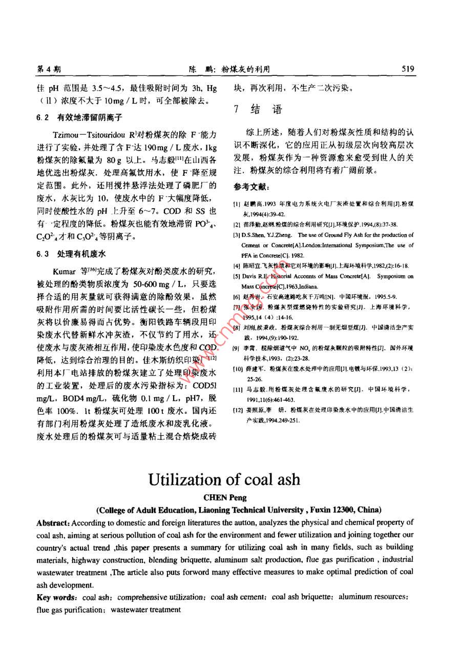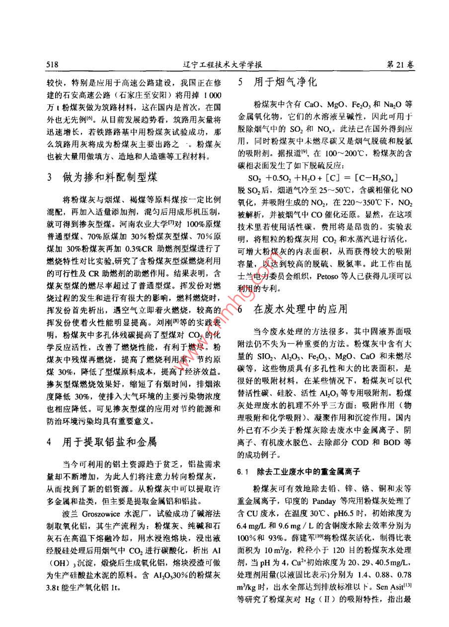 第21卷第4期遼寧工程技術(shù)大學(xué)學(xué)報(bào)2002年8月Vol 21 No 4Journal of Liaoning Technical Universit2002文章編號(hào):1008-0562(2002)4051703粉煤灰的利用(遼寧T程技術(shù)大學(xué)成人教育學(xué)院,遼寧阜新123000摘要:根據(jù)國(guó)內(nèi)外文獻(xiàn)資料調(diào)研,分析了粉煤灰的物輝化學(xué)性質(zhì),針對(duì)日前粉煤火利環(huán)境污染嚴(yán)重并且利用率較,結(jié)合我國(guó)的實(shí)際情況,綜述了粉煤灰在建筑材料、修筑遒路、制型煤、提取鋁鹽、氣凈化和L業(yè)廢水¢地等領(lǐng)域的綜合利用狀,提出多種切實(shí)可行的方案,為作實(shí)踐中推!'粉煤灰的利田定了理論簊礎(chǔ),并對(duì)粉煤綜合利阻的發(fā)展趨勢(shì)作了樂(lè)觀的展望關(guān)鍵詞:粉煤灰:綜合利用;粉煤灰水泥;粉煤灰型燦:鉆資源:煙氣凈化:廢水處理中圖號(hào):TD98文獻(xiàn)標(biāo)識(shí)碼:B0引言粉煤灰是燃煤過(guò)程中產(chǎn)生的一種固體廢棄鉑等稀有元素。表1是我國(guó)粉煤灰化學(xué)成分變化物,隨著能源需求量的增加,粉煤灰的產(chǎn)生里也范圍和國(guó)外幾個(gè)地區(qū)典型粉煤灰的化學(xué)成分。粉與日俱增。近幾年來(lái)我國(guó)電力系統(tǒng)年耗煤約:3.05煤灰外觀類似水泥,它的成分和細(xì)度都將影響其億t,年排粉煤灰和渣達(dá)8600萬(wàn)t,絕大多數(shù)灰渣顏色,從乳白色到灰黑色。粉煤灰呈多孔性蜂窩堆積灰場(chǎng),估計(jì)到2005年,貯灰場(chǎng)的占地面積狀組織,比表面積較大,一般在2500~500cm3g。將超過(guò)666×10m3,這不僅嚴(yán)重污染環(huán)境,也因此具有較高的吸附活性。粉煤灰的顆粒大小為耗費(fèi)了大量的上地資源。因此長(zhǎng)期以來(lái)粉煤灰的0.5~300μm。由于煤種、燃燒方式、鍋爐構(gòu)造和綜合利用成為環(huán)境保護(hù)領(lǐng)域的個(gè)重要課題。收集方式的不同,粉煤灰的粒徑、比表面積和化在發(fā)達(dá)國(guó)家粉煤灰資源化程度已很高。英國(guó)學(xué)成分也隨之變化。粉煤灰的這些理化特性決定粉煤灰利用率為46.2%,德國(guó)為65%,法國(guó)75%,了它可以在許多領(lǐng)域得到利用日本已達(dá)100%。美國(guó)很早就把粉煤灰與其他礦產(chǎn)表1粉煤灰的化學(xué)成分34(%)并列為主要的礦物資源.并著手從中提取各種金Tab 1 chymic ingredient of coal ash屬2。我國(guó)粉煤灰的利用率相對(duì)較低,亦已取得了加大西班才阿持斯加可喜的成績(jī)。根據(jù)文獻(xiàn)調(diào)研,介紹粉煤灰綜合利40-6049.8917-3516.598.53用的現(xiàn)狀20.131粉煤灰的物理化學(xué)性質(zhì)aO及KO0.541.141.98粉煤灰是燃煤顆粒中所含礦物質(zhì)經(jīng)歷了·系L.3列變化而形成的。這些礦物質(zhì)主要是硅酸鹽礦物04-6(粘士、巖鹽、長(zhǎng)石等)和石英,經(jīng)髙溫晶格(除少量石英外)受到破壞而熔融,在表面張力和外部壓力作用下變成液滴,逸出鍋爐后急驟降溫凝2在建材和筑路領(lǐng)域的應(yīng)用固成硅酸鹽玻璃態(tài)微珠(漂珠、磁珠、沉珠等)。早在50年代,美國(guó)蒙大拿洲的俄馬壩工程就這些微珠混合物夾雜少量單體碳和石英,由肉大規(guī)模地使用粉煤灰,數(shù)量達(dá)13萬(wàn),以取代當(dāng)排出影成粉煤灰。時(shí)供應(yīng)緊缺的水泥,同時(shí)也降低了工程造價(jià)。實(shí)粉煤矢的主要化學(xué)成分是SO2和AO3鋁硅踐表明,該大壩工程質(zhì)量毫不遜色,所以世人把酸鹽,還含有少見(jiàn)的PeQO3CaO、MgO和未燃盡俄馬壩工程稱為粉煤灰應(yīng)用史上的第一塊里程碳。有些粉煤灰還可能富集了鍺、鎵、鈾、鎳碑。近兒年粉煤灰在道路工程方面的應(yīng)用發(fā)展比收稿日期:2002-0620作者簡(jiǎn)介陳鵬(1975),男,內(nèi)蒙古巴盟人,助教。本文編校:孫樹(shù)江518遼寧工程技術(shù)大學(xué)學(xué)報(bào)第21卷較快,特別是應(yīng)用于高速公路建設(shè),我國(guó)正在修5用于煙氣凈化建的石安高速公路(石家莊至安陽(yáng))將用掉1000萬(wàn)t粉煤灰做為筑路材料,這在國(guó)內(nèi)是首次,在國(guó)粉煤灰中含有CaO、MgO、Fe2O3和Na2O等外也無(wú)先例。從目前發(fā)展趨勢(shì)看,筑路用灰量將金屬氧化物,它們的水溶液呈堿性,因此可用于迅速增長(zhǎng),若鐵路路基中用粉煤灰試驗(yàn)成功,那脫除煙氣中的SO2和NO。此法已在國(guó)外得到應(yīng)么筑路用灰將成為粉煤灰主要出路之·。粉煤灰用,同時(shí)粉煤灰中未燃盡碳又是煙氣脫硫和脫氬也被大量用做填方、造地和人造礁等工程材料。的吸附劑。據(jù)報(bào)道門(mén),在100~200℃,粉煤灰的含碳相表面發(fā)生了如下脫硫反應(yīng)3做為摻和料配制型煤SO2+0.502+H,0+[C]=[C-H2SO4J脫SO2后,煙道氣冷至25~50℃,含碳相催化NO將粉煤灰與煙煤、褐煤等原料煤按一定比例氧化,并吸附生成的NO2,在220-350℃下,NO2混配,再加入適量添加劑,混勻后用成形機(jī)壓制,被解析,并被煙氣中co催化還原。顯然,在這項(xiàng)就可得到摻灰型煤。河南農(nóng)業(yè)大學(xué)四對(duì)10%原煤技術(shù)里若使用活性碳,費(fèi)用將是昂貴的。實(shí)驗(yàn)表普通型煤、70%原煤加30%粉煤灰型煤、70%原明,將粗粒的粉煤灰用CO2和水蒸汽進(jìn)行活化,煤加30%粉煤灰再加03%CR助燃劑型煤進(jìn)行了可增大粉煤灰的內(nèi)表面積,從而獲得較大的吸附燃燒特性對(duì)比實(shí)驗(yàn)研究了含粉煤灰型煤燃燒利用容量,以達(dá)到較高