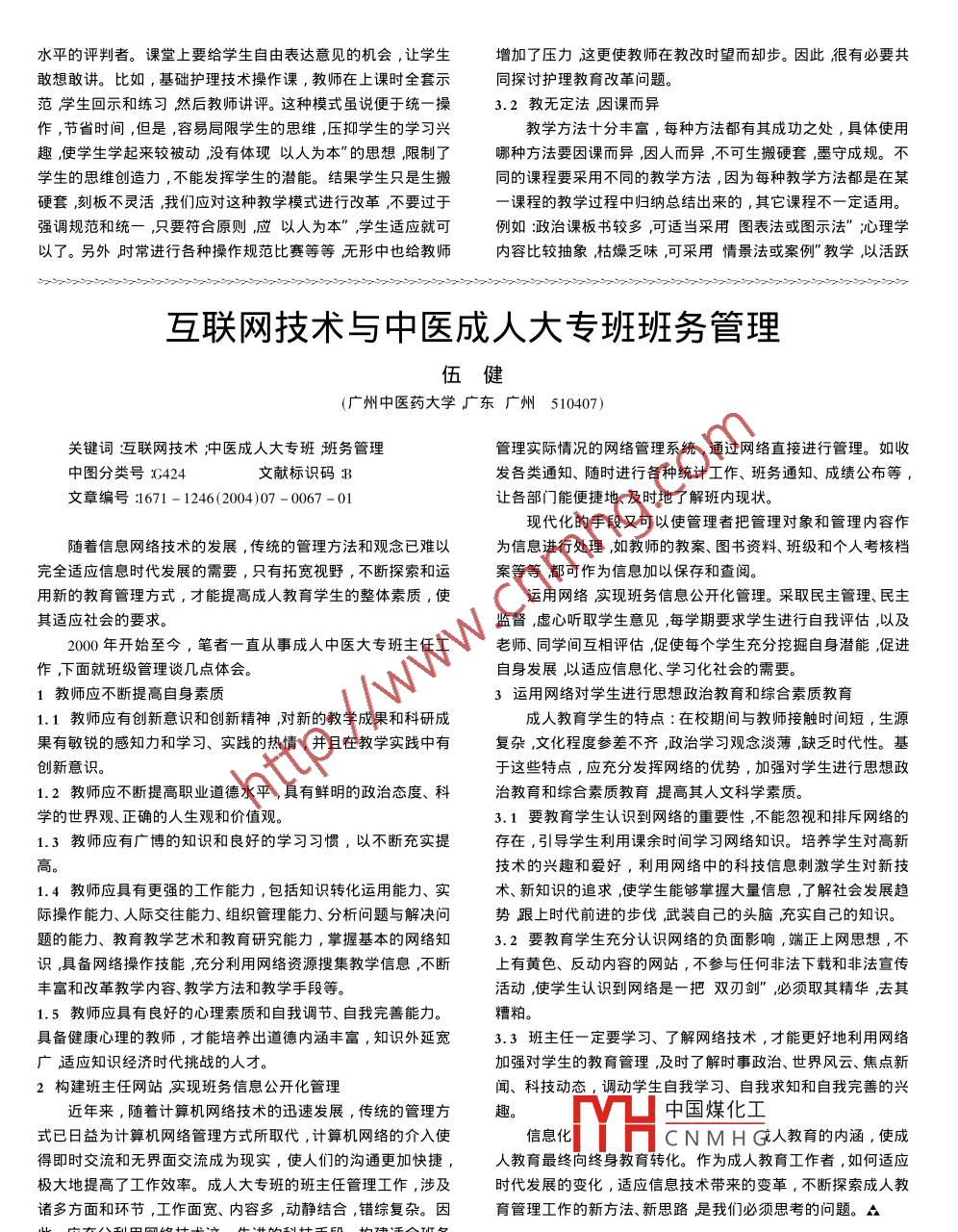 教學(xué)探討衛(wèi)生職業(yè)教育Vol. 222004 No. 7_優(yōu)化教學(xué)之我見陳麗蘭(惠州衛(wèi)校廣東惠州516002)關(guān)鍵詞教師課堂教學(xué)方法教學(xué)效果從幻燈投影的教學(xué)應(yīng)用,-直 到計(jì)算機(jī)在教育領(lǐng)域的介入中圖分類號:G424文獻(xiàn)標(biāo)識碼:B和發(fā)展,現(xiàn)代技術(shù)已經(jīng)為我們創(chuàng)造了豐富的教學(xué)手段,電子傳文章編號:1671- 1246(2004)07 - 0066 - 03媒在教育教學(xué)中的有效運(yùn)用,給教師提供了多樣化的教學(xué)方法。目前信息時(shí)代和學(xué)習(xí)化社會對人才培養(yǎng)高速度、高質(zhì)量和教學(xué)工作是學(xué)校工作的重頭戲,是教育質(zhì)量的一個(gè)重要組不斷繼續(xù)教育的要求已經(jīng)把教育推向危機(jī)的邊緣,而教育技術(shù)成部分。教學(xué)應(yīng)包含教與學(xué)兩個(gè)方面二者缺-不可。重教輕學(xué)的深刻影響也展示了- -個(gè)不爭的事實(shí), 教育應(yīng)該充分利用現(xiàn)代是中等職業(yè)教學(xué)活動中存在的---個(gè)突出問題。以教代學(xué),教師電子傳媒,共同致力于學(xué)習(xí)化環(huán)境的構(gòu)造,更好地應(yīng)答學(xué)習(xí)化上課滿堂灌,學(xué)生被動聽課,缺少參與,缺乏學(xué)習(xí)的主動性和創(chuàng)社會對教育提出的挑戰(zhàn)。造性造成這種局面的主要原因是茌教" 的一方而不茌學(xué)”的2教師要鉆研教材編寫教案--方。由于中等職業(yè)教育長期存在重教輕學(xué)傾向,把教與學(xué)合2.1變教材為學(xué)材二為-,使學(xué)生養(yǎng)成依賴性,嚴(yán)重影響教育質(zhì)量的提高,如何提任何-本教材都有其編寫的框架,都有知識點(diǎn)的排列和連高教學(xué)質(zhì)量是每位教師首選課題。因此,教師要正確理解教與結(jié),教師在研究教材的過程中,要摸清教材的編寫思路,理 出教學(xué)的內(nèi)涵克服重教輕學(xué)、以教代學(xué)的不良傾向。怎樣恰當(dāng)理解材中的知識點(diǎn)和聯(lián)系點(diǎn),區(qū)別知識與技能的界線,掌握知識與教與學(xué),才能取得理想的教學(xué)效果呢?我們不妨從以下幾個(gè)方技能的聯(lián)系, 制訂一份學(xué)習(xí)方案 , 提供給學(xué)生-個(gè)總的學(xué)習(xí)思面做一探討。路變教材為學(xué)材。1教師要轉(zhuǎn)變觀念迎接挑戰(zhàn)2.2有教案又有學(xué)案面對信息時(shí)代的種種挑戰(zhàn),對傳統(tǒng)的教學(xué)方法必須進(jìn)行冷教師上課必須編寫教案,編寫教案就是編寫教與學(xué)的方靜的反思,在教育觀念、教育內(nèi)容、教育制度、教育手段等方面案,如在編寫教案過程中,只編寫教的部分,而忽視學(xué)的部分,都應(yīng)轉(zhuǎn)變觀念。這是一份不完整的教案。編寫教學(xué)方案要有教的設(shè)計(jì),還要有1.1教育觀念的轉(zhuǎn)變學(xué)的安排。如教的思路清晰,學(xué)的方向就明確;教的方法得當(dāng),教育觀念的轉(zhuǎn)變,包括教育本質(zhì)觀、目的觀、功能觀、人才學(xué)的方法就科學(xué)。這是編寫教案中特別需要認(rèn)真研究的問題。觀、師生觀等方面由傳統(tǒng)向現(xiàn)代轉(zhuǎn)變。隨著全社會政治經(jīng)濟(jì)改只有在編寫教案中加入學(xué)案的部分,才能真正體現(xiàn)以學(xué)生為主革的深入現(xiàn)代科技的迅猛發(fā)展,競爭的激化,傳統(tǒng)教育觀受到體的教育思想,有利于學(xué)生更好地學(xué)會學(xué)習(xí),提高學(xué)習(xí)的效沖擊,而與時(shí)代脈搏相吻合的教育觀念逐步滲入教育實(shí)踐中。從教育目標(biāo)看,知識技能教育將被素質(zhì)教育替代。從教育過程3教師要既講教法,又講學(xué)法看,被動接受教育將被主動參與教育替代。從人才觀方面看知每次成功的教學(xué)組織與教學(xué)活動都離不開學(xué)生的參與。教識型、專才型、地域型人才將向通才型、國際型轉(zhuǎn)變。師作為教學(xué)組織者和教學(xué)活動的策劃者, 應(yīng)該把教與學(xué)都置于1.2教育內(nèi)容的轉(zhuǎn)變同等重要的地位。在組織教學(xué)時(shí)既講教法又要講學(xué)法更重要根據(jù)信息時(shí)代對教育的要求,應(yīng)加大教育內(nèi)容改革的力的是教給學(xué)生一種學(xué)習(xí)的方法。 例如:在課堂教學(xué)中筆者引用度,-是社會教育要使學(xué)生形成一種世界觀 , 讓他們按這個(gè)看教師提問一-學(xué)生自 學(xué)求解一師生 討論解答一應(yīng) 用測練待、處理客觀生活并決定自己的前途;二是科學(xué)教育要致力于鞏固”的啟發(fā)式教學(xué)方法,調(diào)動學(xué)生積極性,使學(xué)生在課堂上動把課堂知識和科學(xué)實(shí)踐聯(lián)系起來;把科學(xué)與人文統(tǒng)一起來。三腦、動口、動手,讓學(xué)生從單純聽"中解脫出來,由被動變?yōu)橹魇峭ㄟ^藝術(shù)教育使學(xué)生與社會環(huán)境自然環(huán)境相互了解和溝通。動,這樣,不僅使學(xué)生學(xué)會" ,而且使學(xué)坐會學(xué)”,學(xué)得有質(zhì)有1.3教育制度的轉(zhuǎn)變未。為適應(yīng)新時(shí)代各方面的挑戰(zhàn),教育制度應(yīng)有所創(chuàng)新,以人3.1以人為中國煤化工為本、以人的發(fā)展為本將是教育價(jià)值的根本取向,形成有助于教育要:MYHCNMHG所觀念,教師要以培養(yǎng)人的全面發(fā)展,有助于完善人格的塑造,有助于創(chuàng)新能力培養(yǎng)高素質(zhì