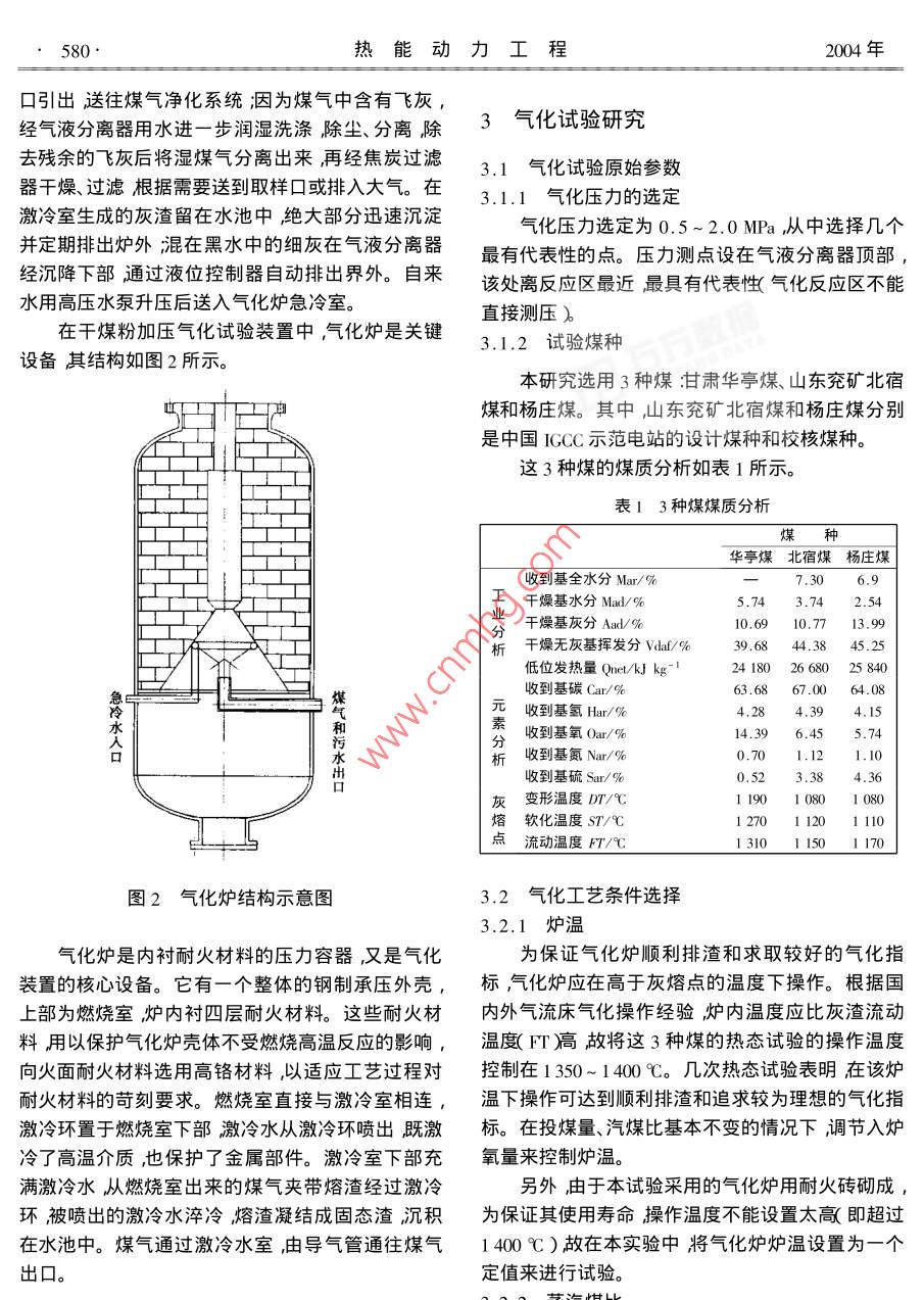 第19卷第6期熱能動(dòng)力工程 Vol.19,No.62004年11月 JOURNAL OF ENGINEERING FOR THERMAL ENERGY AND POWERNov.,2004文章編號(hào):1001-206020046-0579-03粉煤加壓氣化小型試驗(yàn)研究任永強(qiáng)許世森2夏軍倉2朱鴻昌2(1.西安交通大學(xué)能源與動(dòng)力工程學(xué)院,陜西西安7100492.西安熱工研究院有限公司,陜西西安710032摘要煤氣化技術(shù)是燃煤聯(lián)合循環(huán)發(fā)電、煤化工、綜合利用干粉加壓氣化試驗(yàn)裝置的工藝流程如圖1所系統(tǒng)近零排放系統(tǒng)中的核心技術(shù)。干煤粉加壓氧氣氣化技示。術(shù)是煤氣化技術(shù)發(fā)展的一個(gè)主流方向。介紹了國電熱工研究院的干煤粉加壓氣化試驗(yàn)系統(tǒng)以及干煤粉加壓氣化試驗(yàn)研究的過程和結(jié)果。試驗(yàn)結(jié)果達(dá)到了預(yù)期的目的得到干煤粉加壓氣化過程的規(guī)律并驗(yàn)證了試驗(yàn)系統(tǒng)在高壓下的穩(wěn)定性?;瘜W(xué)軟水關(guān)鍵詞煤氣化汽流床IGCC法進(jìn)料取樣口中圖分類號(hào)TQ546.2文獻(xiàn)標(biāo)識(shí)碼A丟火炬1引言自來水10污水渣水煤氣化技術(shù)是燃煤聯(lián)合循環(huán)發(fā)電、煤化工、煤制油及其它煤基、近零排放系統(tǒng)的核心技術(shù)。煤氣化6-計(jì)量泵;7-蒸汽發(fā)生器8-氮?dú)鉀_罐9氣緩沖中罐1-煤粉倉2-變壓;3-加壓:4螺旋輸送機(jī)5氣10-電動(dòng)往復(fù)泵11-噴嘴;12-氣化爐13-汽液分離器方式可分固定床、流化床和氣流床3種1。氣流床14-焦炭過濾器氣化是用極細(xì)的粉煤為原料干煤粉或制成的水煤漿)被氧氣和水蒸氣組成的氣化劑高速氣流攜帶,噴入氣化爐2]氣化的過程。其中干煤粉加壓氧氣氣圖1干煤粉加壓氣化試驗(yàn)裝置的工藝流程化工藝具有煤種的適應(yīng)性廣、冷煤氣效率和熱煤氣效率以及碳的轉(zhuǎn)化率都很高、適于開發(fā)單爐容量大含水量低于1%、粒度85%小于200目的粉煤的氣化爐等特點(diǎn)3】是煤氣化工藝技術(shù)的發(fā)展方向。儲(chǔ)于常壓煤粉倉靠重力落入變壓煤倉變壓倉用到了20世紀(jì)90年代后期隨著CC潔凈煤發(fā)N2充壓充到與加壓倉壓力相等或略大時(shí)粉煤落電技術(shù)的推廣應(yīng)用國電熱工研究院建立了國內(nèi)第入加壓倉由此用螺旋輸送機(jī)定量送出被N2吹送一套干煤粉加壓氣化特性試驗(yàn)裝置并進(jìn)行了試驗(yàn)研入氣化爐。試驗(yàn)用O2經(jīng)緩沖罐穩(wěn)壓后送往燃燒器究。該裝置的氣化能力為每小時(shí)10~20kg煤粉壓外套管?;瘜W(xué)軟水經(jīng)計(jì)量泵升壓在電加熱器內(nèi)蒸力為3.0Ma研究的目的是積累中國主要?jiǎng)恿γ喊l(fā)成過熱蒸汽,與氧氣混合后進(jìn)入燃燒器外套管。在干粉氣化狀態(tài)下的氣化數(shù)據(jù)庫形成一套干煤粉粉煤、氧氣、水蒸氣在燃燒器出口處著火并進(jìn)行氣流加壓氣化評價(jià)方法。式火焰反應(yīng),生成以CO和H2為主的粗合成氣,氣化爐燃燒室排出的高溫氣體和熔渣在氣化爐內(nèi)從2干粉加壓氣化試驗(yàn)流程簡介上向下進(jìn)入激冷室被激冷環(huán)噴出的激冷水激冷后,下降到激冷室的水浴直接與水接觸冷卻熔渣迅速固化工藝氣被水飽和并由位于激冷室上部的煤氣收稿日期2004-02-25;修訂日期2004-03-31580熱能動(dòng)力工程2004年口引出送往煤氣凈化系統(tǒng)因?yàn)槊簹庵泻酗w灰,經(jīng)氣液分離器用水進(jìn)一步潤濕洗滌除塵、分離除3氣化試驗(yàn)研究去殘余的飛灰后將濕煤氣分離出來再經(jīng)焦炭過濾3.1氣化試驗(yàn)原始參數(shù)器干燥、過濾根據(jù)需要送到取樣口或排入大氣在3.1.1氣化壓力的選定激冷室生成的灰渣留在水池中絕大部分迅速沉淀氣化壓力選定為0.5~2.0MPa從中選擇幾個(gè)并定期排出爐外混在黑水中的細(xì)灰在氣液分離器最有代表性的點(diǎn)。壓力測點(diǎn)設(shè)在氣液分離器頂部,經(jīng)沉降下部通過液位控制器自動(dòng)排出界外。自來該處離反應(yīng)區(qū)最近最具有代表性氣化反應(yīng)區(qū)不能水用高壓水泵升壓后送入氣化爐急冷室。在干煤粉加壓氣化試驗(yàn)裝置中,氣化爐是關(guān)鍵直接測壓3.1.2試驗(yàn)煤種設(shè)備其結(jié)構(gòu)如圖2所示。本研究選用3種煤甘肅華亭煤、山東兗礦北宿煤和楊莊煤。其中山東兗礦北宿煤和楊莊煤分別是中國IGCC示范電站的設(shè)計(jì)煤種和校核煤種。這3種煤的煤質(zhì)分析如表1所示。表13種煤煤質(zhì)分析煤種華亭煤北宿煤楊莊煤收到基全水分Mar/%7.306.9工干燥基水分Mad/%5.743.742.54業(yè)干燥基灰分Aad/%10.6910.7713.99析干燥無灰基揮發(fā)分af/%39.6844.3845.25低位發(fā)熱量Qnet/kkg241802668025840收到基碳Car/%63.6867.0064.08急冷水人口煤氣和污水出口元收到基氫Har/%4.284.394.15素收到基氧Oar/%14.396.455.74析收到基氮Nar/%0.701.121.10收到基硫Sar/%0.523.384.36灰變形溫度DT/℃119010801080熔軟化溫度ST/℃127011201110點(diǎn)流動(dòng)溫度FT/℃131011501170圖2氣化爐結(jié)構(gòu)示意圖3.2氣化工藝條件選擇3.2.1爐溫氣化爐是內(nèi)襯耐火材料的壓力容器,又是氣化為保證氣化爐順利排渣和求取較好的氣化指裝置的核心設(shè)備。它有一個(gè)整體的鋼制承壓外殼,標(biāo)氣化爐應(yīng)在高于灰熔點(diǎn)的溫度下操作。根據(jù)國上部為燃燒室爐內(nèi)襯四層耐火材料。這些耐火材內(nèi)外氣流床氣化操作經(jīng)驗(yàn)爐內(nèi)溫度應(yīng)比灰