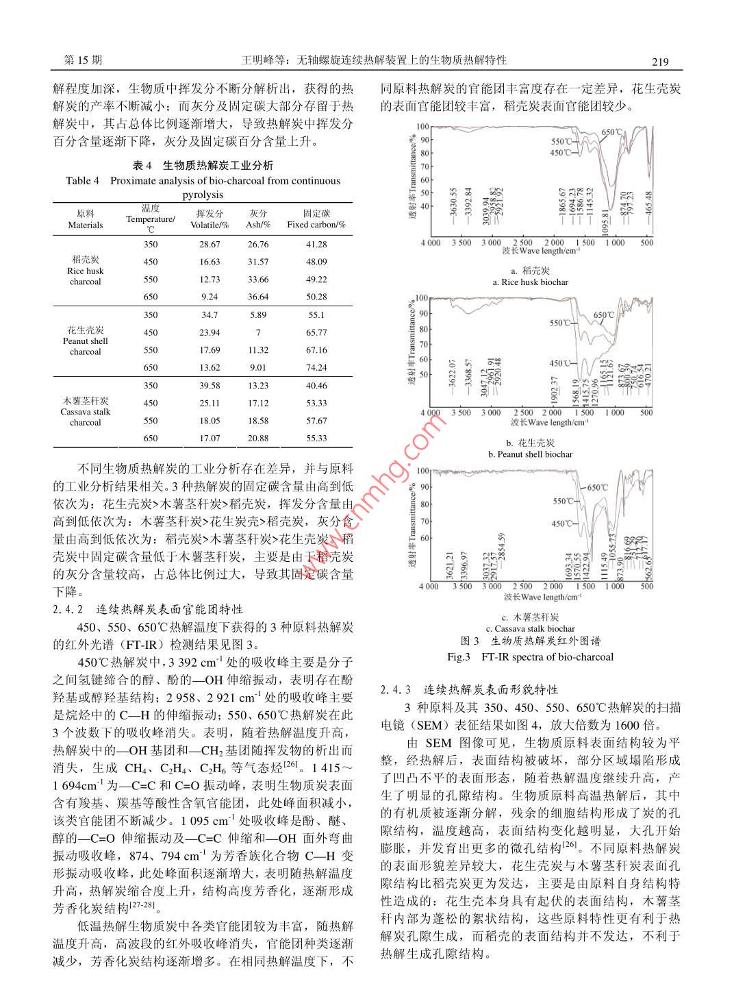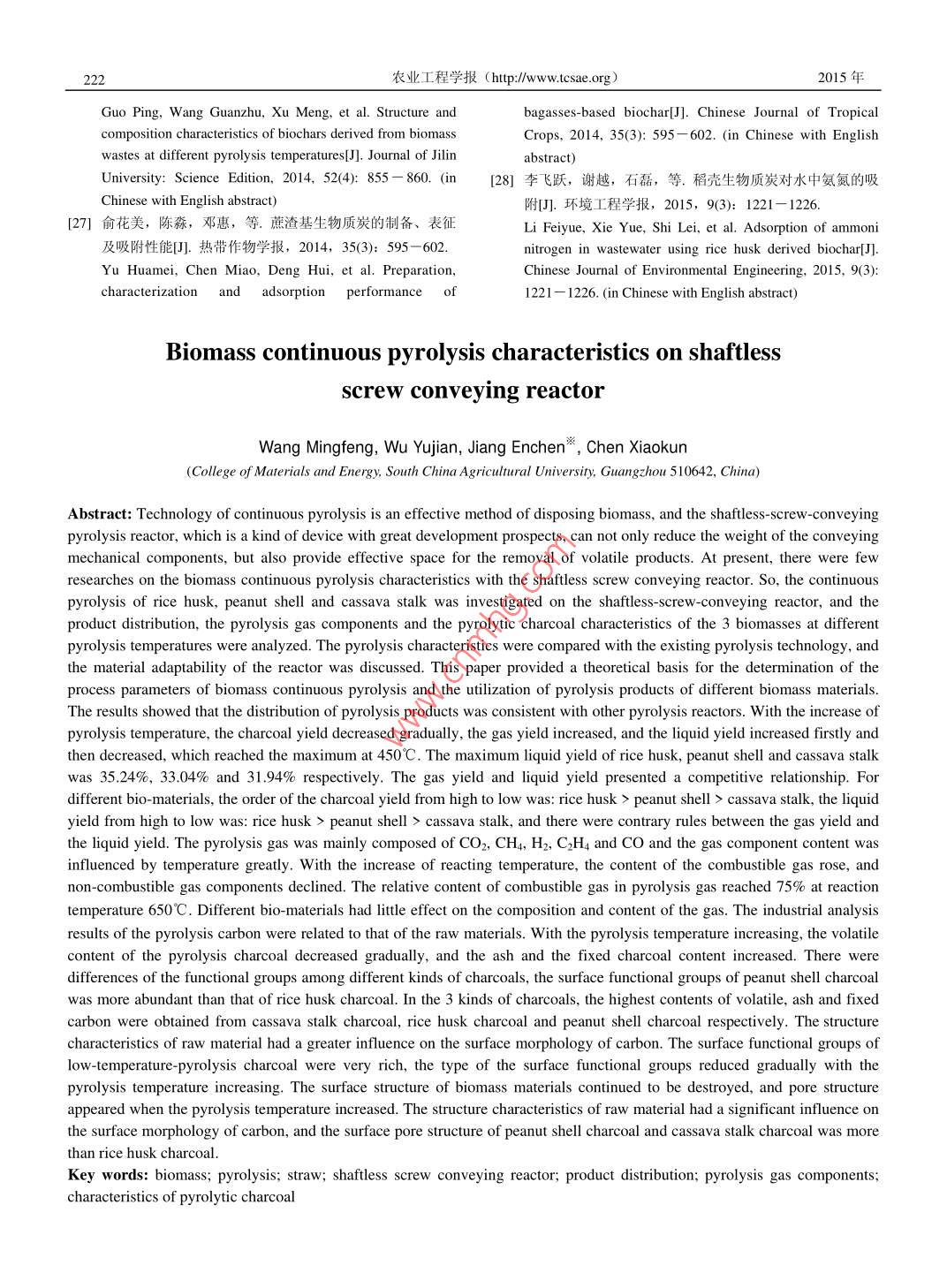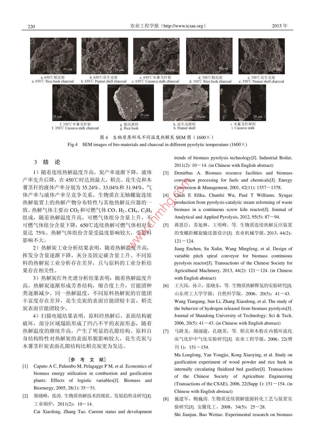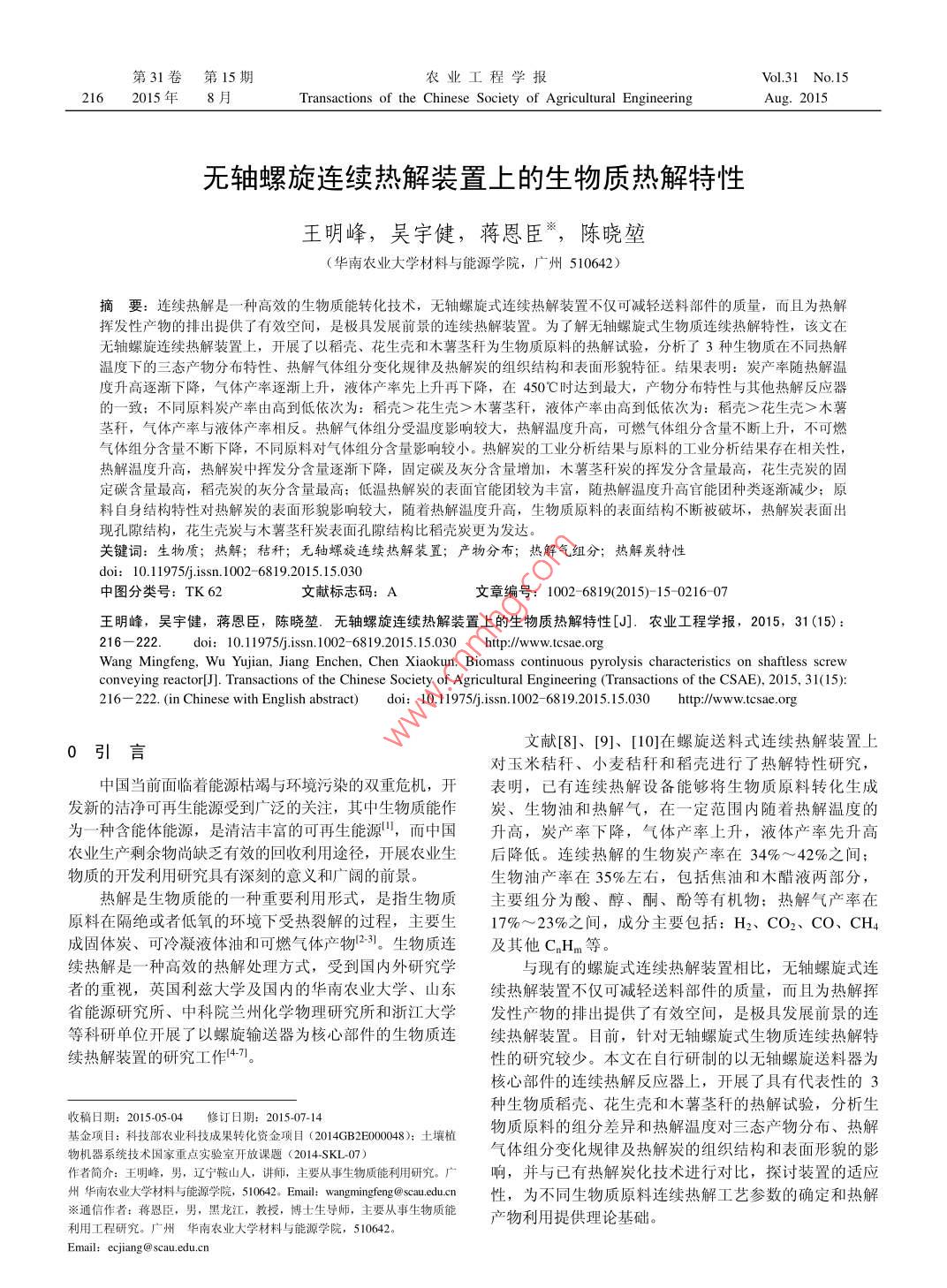 第31卷第15期農(nóng)業(yè)工程學(xué)報(bào)Vol.3l No.152162015年8月Transactions of the Chinese Society of Agricultural EngineeringAug. 2015無軸螺旋連續(xù)熱解裝置上的生物質(zhì)熱解特性王明峰,吳宇健,蔣恩臣*,陳曉塹(華南農(nóng)業(yè)大學(xué)材料與能源學(xué)院,廣州510642)摘要:連續(xù)熱解是--種高效的生物質(zhì)能轉(zhuǎn)化技術(shù),無軸螺旋式連續(xù)熱解裝置不僅可減輕送料部件的質(zhì)量,而且為熱解揮發(fā)性產(chǎn)物的排出提供了有效空間,是極具發(fā)展前景的連續(xù)熱解裝置。為了解無軸螺旋式生物質(zhì)連續(xù)熱解特性,該文在無軸螺旋連續(xù)熱解裝置上,開展了以稻殼、花生殼和木薯莖稈為生物質(zhì)原料的熱解試驗(yàn),分析了3種生物質(zhì)在不同熱解溫度下的三態(tài)產(chǎn)物分布特性、熱解氣體組分變化規(guī)律及熱解炭的組織結(jié)構(gòu)和表面形貌特征。結(jié)果表明:炭產(chǎn)率隨熱解溫度升高逐漸下降,氣體產(chǎn)率逐漸上升,液體產(chǎn)率先上升再下降,在450C時(shí)達(dá)到最大,產(chǎn)物分布特性與其他熱解反應(yīng)器的一-致:不同原料炭產(chǎn)率由高到低依次為:稻殼>花生殼>木薯莖稈,液體產(chǎn)率由高到低依次為:稻殼>花生殼>木薯莖稈,氣體產(chǎn)率與液體產(chǎn)率相反。熱解氣體組分受溫度影響較大,熱解溫度升高,可燃?xì)怏w組分含量不斷上升,不可燃?xì)怏w組分含量不斷下降,不同原料對(duì)氣體組分含量影響較小。熱解炭的工業(yè)分析結(jié)果與原料的工業(yè)分析結(jié)果存在相關(guān)性,熱解溫度升高,熱解炭中揮發(fā)分含量逐漸下降,固定碳及灰分含量增加,木薯莖稈炭的揮發(fā)分含量最高,花生殼炭的固定碳含量最高,稻殼炭的灰分含量最高;低溫?zé)峤馓康谋砻婀倌軋F(tuán)較為豐富,隨熱解溫度升高官能團(tuán)種類逐漸減少:原料自身結(jié)構(gòu)特性對(duì)熱解炭的表面形貌影響較大,隨著熱解溫度升高,生物質(zhì)原料的表面結(jié)構(gòu)不斷被破壞,熱解炭表面出現(xiàn)孔隙結(jié)構(gòu),花生殼炭與木薯莖稈炭表面孔隙結(jié)構(gòu)比稻殼炭更為發(fā)達(dá)。關(guān)鍵詞:生物質(zhì);熱解;秸稈;無軸螺旋連續(xù)熱解裝置;產(chǎn)物分布;熱解氣組分;熱解炭特性doi: 10.11975/j.issn.1002- 6819.2015.15.030中圖分類號(hào): TK 62文獻(xiàn)標(biāo)志碼: A文章編號(hào): 1002- 6819(2015)-15 -0216- 07王明峰,吳宇健,蔣恩臣,陳曉塹.無軸螺旋連續(xù)熱解裝置上的生物質(zhì)熱解特性[J].農(nóng)業(yè)工程學(xué)報(bào), 2015, 31(15):216- 222. doi: 10.1175/.issn.1002- 6819.2015.15.030htp://www.tcsae.orgWang Mingfeng, Wu Yujian, Jiang Enchen, Chen Xiaokun. Biomass continuous pyrolysis characteristics on shaftless screwconveying reactor[J]. Transactions of the Chinese Society of Agricultural Engineering (Transactions of the CSAE), 2015, 31(15):216 - 222. (in Chinese with English abstract)doi: 10.11975/jissn. 1002-68 19.2015.15.030http://www.tcsae. .org文獻(xiàn)[8]、[9]、 [10]在螺旋送料式連續(xù)熱解裝置上0引言對(duì)玉米秸稈、小麥秸稈和稻殼進(jìn)行了熱解特性研究,中國當(dāng)前面臨著能源枯竭與環(huán)境污染的雙重危機(jī),開表明,已有連續(xù)熱解設(shè)備能夠?qū)⑸镔|(zhì)原料轉(zhuǎn)化生成發(fā)新的潔凈可再生能源受到廣泛的關(guān)注,其中生物質(zhì)能作炭、生物油和熱解氣,在一定范圍內(nèi)隨著熱解溫度的為- -種含能體能源,是清潔豐富的可再生能源",而中國升高,炭產(chǎn)率下降,氣體產(chǎn)率上升,液體產(chǎn)率先升高農(nóng)業(yè)生產(chǎn)剩余物尚缺乏有效的回收利用途徑,開展農(nóng)業(yè)生后降低。連續(xù)熱解的生物炭產(chǎn)率在34% ~42%之間;物質(zhì)的開發(fā)利用研究具有深刻的意義和廣闊的前景。生物油產(chǎn)率在35%左右,包括焦油和木醋液兩部分,熱解:是生物質(zhì)能的一-種 重要利用形式,是指生物質(zhì)主要組分為酸、醇、酮、酚等有機(jī)物;熱解氣產(chǎn)率在.原料在隔絕或者低氧的環(huán)境下受熱裂解的過程,主要生17%~23%之間,成分主要包括: H2、 CO2、CO、CH4成固體炭、可冷凝液體油和可燃?xì)怏w產(chǎn)物123。生物質(zhì)連及其他ChHm等。續(xù)熱解是-一種高效的熱解處理方式,受到國內(nèi)外研究學(xué)與現(xiàn)有的螺旋式連續(xù)熱解裝置相比,無軸螺旋式連者的重視,英國利茲大學(xué)及國內(nèi)的華南農(nóng)業(yè)大學(xué)、山東續(xù)熱解裝置不僅可減輕送料部件的質(zhì)量,而且為熱解揮省能源研究所、中科院蘭州化學(xué)物理研究所和浙江大學(xué)發(fā)性產(chǎn)物的排出提供了有效空間,是極具發(fā)展前景的連等科研單位開展了以螺旋輸送器為核心部件的生物質(zhì)連續(xù)熱解裝置。目前,針對(duì)無軸螺旋式生物質(zhì)連續(xù)熱解特續(xù)熱解裝置的研究工作[47。性的研究較少。本文在自行研制的以無軸螺旋送料器為核心部件的連續(xù)熱解反應(yīng)器上,開展了具有代表性的3種生物質(zhì)稻殼、花生殼和木薯莖稈的熱解試驗(yàn),分析生收稿日期: 2015-05-04 修訂 日期: 2015-07-14基金項(xiàng)目:科技部農(nóng)業(yè)科技成果轉(zhuǎn)化資金項(xiàng)目(2014G2000048); 土壤植物質(zhì)原料的組分差異和熱解溫度對(duì)三態(tài)產(chǎn)物分布、熱解物機(jī)器系統(tǒng)技術(shù)國家重點(diǎn)實(shí)驗(yàn)室開放課題(2014-SKL-