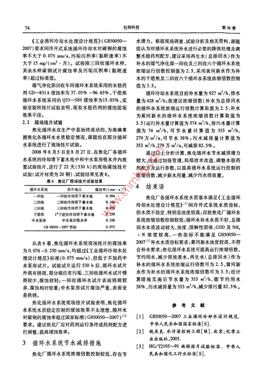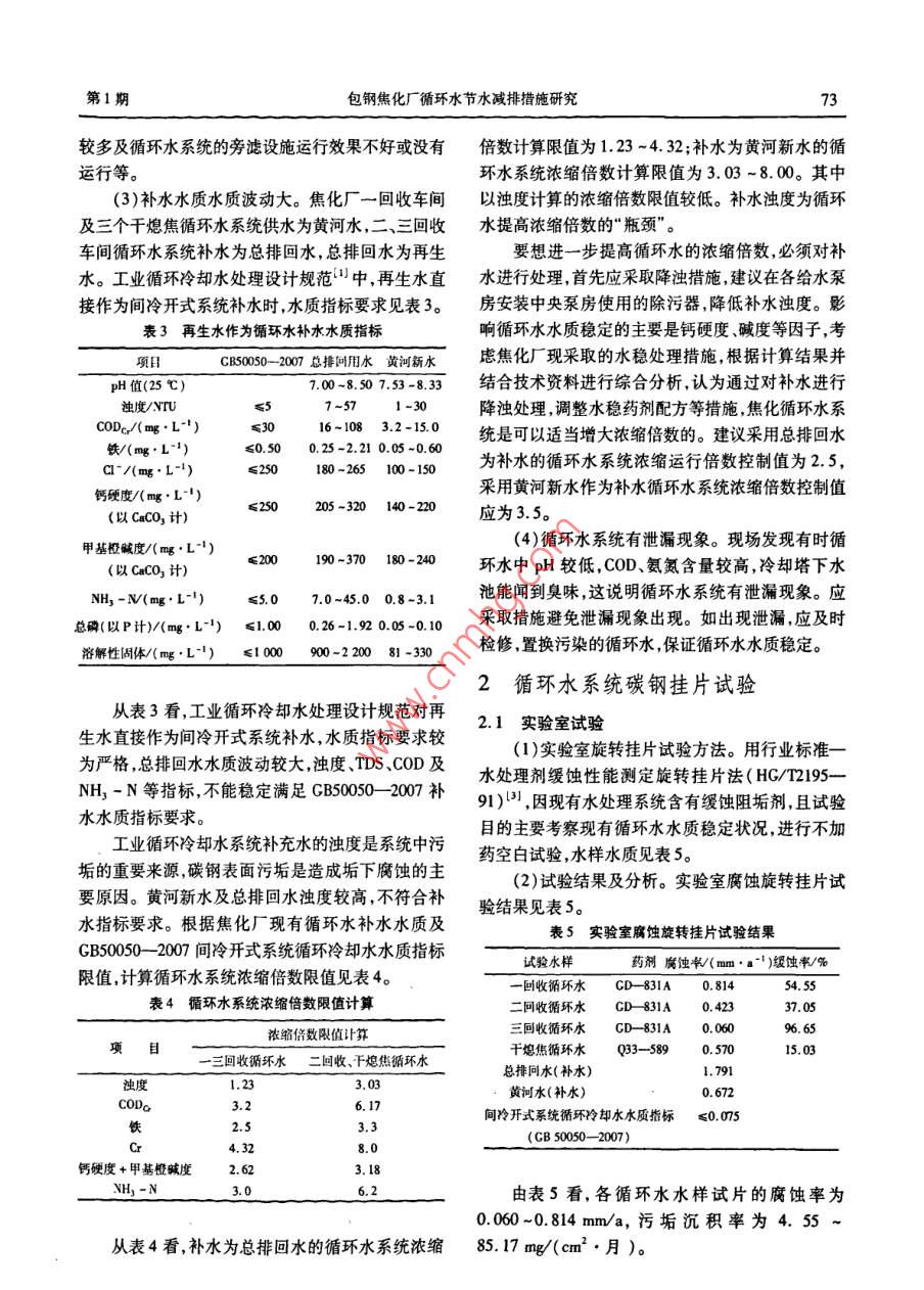 第36卷第1期包鋼科技2010年2月Science and Technology of Baotou SteelFebruary, 2010包鋼焦化廠(chǎng)循環(huán)水節(jié)水減排措施研究田顆2,延克軍!,陳燕(1.內(nèi)蒙古科技大學(xué)能源與環(huán)境學(xué)院,內(nèi)蒙古包頭0140102.內(nèi)蒙古包鋼鋼聯(lián)股份有限公司技術(shù)中心,內(nèi)蒙古包頭014010;3.內(nèi)蒙古包鋼鋼聯(lián)股份有限公司給水廠(chǎng),內(nèi)蒙古包頭014010)摘要:文章根據(jù)現(xiàn)場(chǎng)分析了包鋼焦化廠(chǎng)循環(huán)水水質(zhì)狀況存在問(wèn)題通過(guò)試驗(yàn)研究了循環(huán)水對(duì)碳鋼腐蝕、結(jié)垢影響根據(jù)國(guó)家標(biāo)準(zhǔn)工業(yè)冷卻循環(huán)水設(shè)計(jì)規(guī)范GB500-2007要求并結(jié)合包鋼焦化廠(chǎng)實(shí)際情況提出了焦化循環(huán)水有效節(jié)水減排措施關(guān)鍵詞:焦化;循環(huán)水;濃縮倍數(shù)中圖分類(lèi)號(hào):X832文獻(xiàn)標(biāo)識(shí)碼:B文章編號(hào):1009-5438(2010)01-0071-04Research on Measures of Water Saving and Discharge Reduction forRecycled Water in Coking Plant of Baotou SteelTIAN Ying 2, YAN Ke-jun', CHEN Yan".3(1. School of Energy and Enuironment, Inner Mongolia University of Science and Technology, Baotou014010, Nei Monggol, China2. Technical Center of Steel Union Co. Ld. of Baotou Steel( Group)Corp., Baotou 014010, Nei Monggol3. Water Supply Plant of Steel Union Co. Ltd. of Baotou Steel( Group) Corp, Baotou 014010, Nei MongAbstract: In the article, the water quality and existing problems of recycled water in Coking Plant of Baotou Steel areanalysed based on situations in the work field. Moreover, the influences of recycled water on corrosion of carbon steel andscale are researched with experiments. Finally, the measures of water saving and discharge reduction for recycled water areproposed according to the requirements of National Standard GB50050--2007, and combining with the actual situations ofCoking Plant of Baotou SteelKey words: coking: recycled water; times of concentration根據(jù)調(diào)查,包鋼焦化廠(chǎng)新水總用量約排污水占焦化廠(chǎng)總排水量約39%。循環(huán)水系統(tǒng)用為1400m/h,外排水量為1100m3/h循環(huán)冷卻水水量及排水量都較大提高循環(huán)冷卻水的處理水平,總水量為3633m3/h,循環(huán)冷卻水系統(tǒng)補(bǔ)水量為搞好循環(huán)冷卻水的運(yùn)行管理不僅可以降低企業(yè)新927m3/h;循環(huán)冷卻水系統(tǒng)排水量為428m/h。循水用量還能減少?gòu)U水排放量對(duì)節(jié)水減排意義重環(huán)冷卻水補(bǔ)水占新水總用量65%,循環(huán)冷卻水系統(tǒng)大。收稿日期:2009作者簡(jiǎn)介:田穎(1971-),男,吉林省長(zhǎng)嶺縣人碩士,環(huán)境保護(hù)高級(jí)工程師現(xiàn)從事環(huán)境保護(hù)研究、環(huán)境影響評(píng)價(jià)工作包鋼科技第36卷1循環(huán)冷卻水系統(tǒng)水質(zhì)分析分循環(huán)水系統(tǒng)的濁度都超過(guò)20NrU(GB500502007《工業(yè)循環(huán)冷卻水處理設(shè)計(jì)規(guī)范》間冷開(kāi)式系1.1水質(zhì)分析統(tǒng)循環(huán)冷卻水水質(zhì)指標(biāo)),除濁度外,其余水質(zhì)指焦化廠(chǎng)循環(huán)冷卻水系統(tǒng)主要在煤氣凈化部標(biāo)能夠滿(mǎn)足或接近標(biāo)準(zhǔn)要求。(一、二、三回收循環(huán)冷卻水系統(tǒng))和干熄焦部(1、利用穩(wěn)定指數(shù)RSI、結(jié)垢指數(shù)PSI對(duì)焦化廠(chǎng)各2"、3干熄焦循環(huán)冷卻水系統(tǒng))。一、三回收循環(huán)冷循環(huán)冷卻水系統(tǒng)的水質(zhì)作定性判定。卻水系統(tǒng)補(bǔ)水為包鋼總排回用水,二回收循環(huán)冷卻根據(jù)焦化廠(chǎng)各循環(huán)冷卻水系統(tǒng)的實(shí)際情況及現(xiàn)水系統(tǒng)和1、2、3干熄焦循環(huán)冷卻水系統(tǒng)補(bǔ)水為黃場(chǎng)取樣監(jiān)測(cè)數(shù)據(jù),分析計(jì)算各循環(huán)水系統(tǒng)目前實(shí)際河澄清水。根據(jù)現(xiàn)場(chǎng)取樣化驗(yàn)的結(jié)果,焦化廠(chǎng)各循運(yùn)行控制的濃縮倍數(shù)及水質(zhì)穩(wěn)定指數(shù)RSI、結(jié)垢指環(huán)冷卻水系統(tǒng)水質(zhì)見(jiàn)表1。數(shù)PSI見(jiàn)表2。目前焦化廠(chǎng)各循環(huán)水系統(tǒng)水質(zhì)濁度較高,大部表1焦化循環(huán)水水質(zhì)指標(biāo)度(TU)電導(dǎo)/(μg·cm-1)總堿度/(mg·Lˉ)總硬度/(ng·L4)cl-/(mg·L1)回收循環(huán)水610-1500510-650二回收循環(huán)水7602390300-410880300-405三回收循環(huán)水33615-915干熄焦循環(huán)水15870-1530315-865GB0o50-2007指標(biāo)注:表中數(shù)據(jù)為2008年6月到8月焦化廠(chǎng)監(jiān)測(cè)值,總硬度、Ca2以CBCO計(jì)。旨數(shù)表2焦化循環(huán)冷卻水穩(wěn)定指數(shù)RSI、結(jié)垢指穩(wěn)定指數(shù)RSI結(jié)垢指數(shù)PSI循環(huán)水系統(tǒng)T/℃濃縮倍數(shù)判別l值回收循環(huán)水45-466.65腐蝕顯著二回收循環(huán)水嚴(yán)重結(jié)三回收循環(huán)水37-40嚴(yán)重結(jié)垢干熄焦循環(huán)水32-334.31結(jié)垢嚴(yán)重結(jié)垢cB50050-2007指標(biāo)1≥3.3根據(jù)表2計(jì)算的水質(zhì)指數(shù)可以判定:除一回收系統(tǒng)設(shè)計(jì)濃縮倍數(shù)不宜小于50,且不應(yīng)小于3.0,循環(huán)水系統(tǒng)由于濃縮倍數(shù)控制較低,為微量結(jié)垢或采用再生水作為補(bǔ)水的循環(huán)水系統(tǒng)濃縮倍數(shù)控制值腐蝕性水質(zhì)其余循環(huán)水系統(tǒng)均為嚴(yán)重結(jié)垢型水質(zhì)。為25~3.0,且不應(yīng)