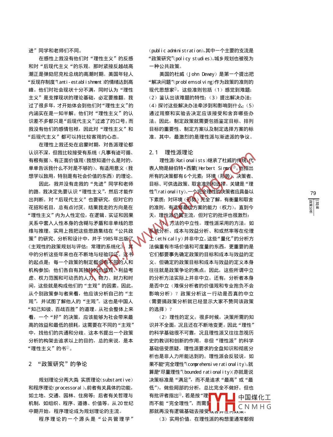 Letter From abroad政策分析[加梁鶴年【摘要】公共政策決策和實施的參與者各有不同境,就叫城鄉(xiāng)規(guī)劃。作為處事方法,規(guī)劃強調(diào)監(jiān)的觀點。按這些不同觀點去分析政策的效應(yīng)、效辨問題、確定目標(biāo)、設(shè)計方案,評估、選擇、實率、合法性和可行性會提高公共決策的水平。本施、監(jiān)察和反饋。文提供了一套完整的理論和方法這套重邏輯、實證和因果律的清楚而直接的【關(guān)鍵詞】公共政策;方法論思考和處事方法,卻遭到了強烈的批評。在二次大戰(zhàn)后西方的社會與文化日趨多元化,民主制度POLICY ANALYSIS(人人都可以有不同的論點,而每一個論點都有同Hok-lin leung樣的政治地位)和自由風(fēng)氣(人人都想發(fā)表其論ABSTRACTS: Participants in public policy decision點,人人都想其論點獨尊)增加了社會的復(fù)雜性making and implementation have different points of( compl exi ty)和相互關(guān)系 Ki nt erred at i ons),再沒有view, Policy evaluation taken from consistent view公認的權(quán)威和一致的共識。個人和利益團體都強points focusing on policy effectiveness, efficiency調(diào)由他們鑒定的問題才算是真正的問題,他們追quality of求的目標(biāo)才是理想的目標(biāo),他們設(shè)計的方案才是policy decision. This paper proposes a coherent合理的方案,他們采取或要求的行動才是有效的theory and method行動。規(guī)劃的政治性成了規(guī)劃理論和實踐的焦點KEYWORDS: public policy: methodology其實,這些都不是問題,只代表著當(dāng)時過分著重物質(zhì)層面的和技術(shù)至上的規(guī)劃專業(yè)的覺醒1前言問題是這“覺醒”帶來了“失措”,亂了陣腳,混淆了“方法”和“方法的利用(或誤用)”,也就我是個“方法論”者。是混淆了“技術(shù)”和“政治”。邏輯、實證和因果規(guī)劃的學(xué)術(shù)領(lǐng)域范圍很廣,從歷史學(xué)到未來的“理性主義”可用在一元的社會,也可以用在學(xué),從建筑學(xué)到經(jīng)濟學(xué),從分析到歸納,窮一生多元的社會。問題是當(dāng)西方社會從一元到多元的時間去研究所得都只不過是一些進門的學(xué)問。(只是相對來說,因為社會是群體,從來不會完全規(guī)劃又是實用科學(xué),理想與實際的印證、理論與元)的轉(zhuǎn)向中,一元社會受到了批評,就連與實踐的交錯,窮一生的時間去體會也只是一些點元社會并存的理性主義也被殃及,到最后,理滴的啟發(fā)。所謂規(guī)劃專家,他們的知識面可能很性主義更被認為是頑固維護一元社會的中堅和阻廣,但在每一個面上他們的功夫卻不及專攻這個礙走向多元社會的絆腳石。在“破舊”的空氣中【文章編號】1002-1329面的專家。規(guī)劃專家的經(jīng)濟學(xué)知識,總不及經(jīng)濟理性主義就被摒棄了,最低限度在學(xué)院的理論課(2004)11-0078-0學(xué)家;規(guī)劃專家的歷史學(xué)知識總不及歷史學(xué)家。程中是如此。正如西方諺語中【中圖分類號】TU984規(guī)劃作為一個獨立的學(xué)科,雖不如其他的學(xué)科有兒洗澡水一起倒掉了”?!疚墨I標(biāo)識碼】A淵博和獨特的知識庫存,但有其放之四海皆準(zhǔn)的我沒有西方(應(yīng)該說是美國)規(guī)劃學(xué)者的幸思考和處事的實用方法。(或不幸)。在香港念建筑時,沒有得到一套完【作者簡介】作為思考方法,規(guī)劃是系統(tǒng)地預(yù)測和設(shè)計未中國煤化工也去找。初到美梁鶴年,男,加拿大女皇大來遠景從而決定現(xiàn)在應(yīng)采取的行動,把它用來處學(xué)教授?!?CNMHG理性主義”當(dāng)理財政,就叫財政計劃,把它用來處理商務(wù)就叫時是1970年代早期,剛崛起的“后現(xiàn)代主義”正【收稿日期】2004-07-07做生意計劃,把它用來處理城鄉(xiāng)土地、空間和環(huán)強烈批判“理性主義”。我對此的反應(yīng)與我的“先進”同學(xué)和老師們不同。( publ i c admini strat i on,其中一個主要的支流是在感性上我沒有他們對“理性主義”的反感“政策研究” pol i cy st udi es)城鄉(xiāng)規(guī)劃也被視為和對“后現(xiàn)代主義“的樂觀。那時緊接反越戰(zhàn)高種公共政策潮正是彈劾尼克松總統(tǒng)的高潮時期。美國年輕人美國的杜威( ohn Dewey)是第一個提出把“反現(xiàn)存制度"anti- est abl i shnent的情緒達到高“解決問題” pr obl esol vi ng作為政策的準(zhǔn)則的峰。他們對社會現(xiàn)狀十分不滿,同時認為“理性現(xiàn)代思想家,這些準(zhǔn)則包括(1)感覺到難題;主義”是支撐現(xiàn)狀的理論基礎(chǔ),必定要推翻。我(2)鑒認出該難題的特性;(3)提出解決辦法;!多年,才開始體會到他們對“理性主義”的4)探討這些解決辦法牽涉到和影響到什么;(5)內(nèi)涵實在是一知半解。他們對“理性主義”的認通過觀察和實驗去決定應(yīng)該接受和舍棄哪些辦識差不多都只是“后現(xiàn)代主義”過濾了的口號。而法。因此,制定政策就需要包括鑒定目標(biāo)、排列我沒有他們的感情包袱,因此對“理性主義”和目標(biāo)的重要性、制定方案以及制定選擇方案的標(biāo)“后現(xiàn)代主義”都可以持比較客觀的心態(tài)準(zhǔn)。其中,最激烈的是理性派與漸進派的爭議。在理性上我還處在啟蒙時期,對各派理論都認識不深,但我比較接受有系統(tǒng)(凡事有跡可循、2.1理性派理論有根有據(jù))有正面價值觀(我想知道什么是對的,理性