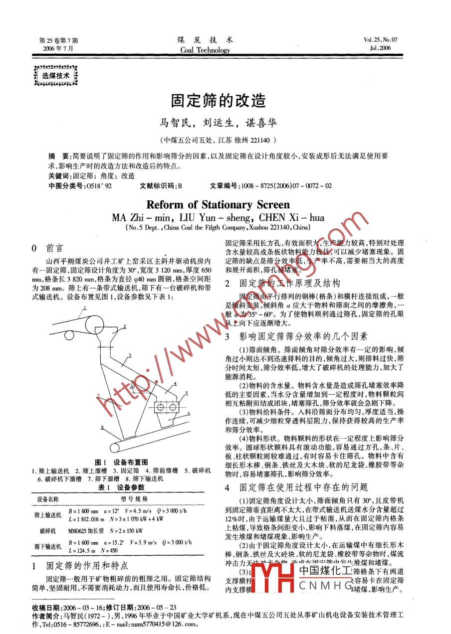 第25卷第7期煤炭技術(shù)vo.25,No.706年7月Coal Technology.u,2006選煤技術(shù)固定篩的改造馬智民,劉運(yùn)生,諶喜華(中煤五公司五處,江蘇徐州22140)摘要:簡(jiǎn)要說(shuō)明了固定篩的作用和影響篩分的因素,以及固定篩在設(shè)計(jì)角度較小,安裝成形后無(wú)法滿(mǎn)足使用要求,影響生產(chǎn)時(shí)的改造方法和改造后的特點(diǎn)關(guān)鍵詞:固定篩;角度;改造中圖分類(lèi)號(hào):O5189文獻(xiàn)標(biāo)識(shí)碼文章編號(hào):1008-8725(2006)07-0072-02Reform of Stationary ScreenMA Zhi-min, LIU Yun-sheng, CHEN Xi-hua(No 5 Dept. China Coal the Fifgth Company, Xuzhou 221 140, China)0前言固定篩釆用長(zhǎng)方孔,有效面積大,生產(chǎn)能力較高,特別對(duì)處理含水量較高或條板狀物料能力較佳,可以減少堵塞現(xiàn)象。固山西平朔煤炭公司井工礦上窯采區(qū)主斜井驅(qū)動(dòng)機(jī)房?jī)?nèi)定篩的缺點(diǎn)是篩分效率低,生產(chǎn)率不高,需要相當(dāng)大的高度有一固定篩,固定篩設(shè)計(jì)角度為30°,寬度3120mm,厚度650和展開(kāi)面積,篩孔易堵塞。mm,格條長(zhǎng)38020m,格條為直徑q40m圓鋼,格條空間距為208m。上有一條帶式輸送機(jī)篩下有一臺(tái)破碎機(jī)和帶2固定篩的工作原理及結(jié)構(gòu)式輸送機(jī)。設(shè)備布置見(jiàn)圖1,設(shè)備參數(shù)見(jiàn)下表1:固定篩由平行排列的鋼棒(格條)和橫桿連接組成,一般是傾斜安裝,傾斜角a應(yīng)大于物料和篩面之間的摩擦角般a為35~60°。為了使物料順利通過(guò)篩孔,固定篩的孔眼從上向下應(yīng)逐漸增大3影響固定篩篩分效率的幾個(gè)因素(1)篩面傾角。篩面傾角對(duì)篩分效率有一定的影響,傾角過(guò)小則達(dá)不到迅速排料的目的,傾角過(guò)大,則排料過(guò)快,篩分時(shí)間太短,篩分效率低增大了破碎機(jī)的處理能力,加大了(2)物料的含水量。物料含水量是造成篩孔堵塞效率降低的主要因素,當(dāng)水分含量增加到一定程度時(shí),物料顆粒間相互粘附而結(jié)成團(tuán)塊,堵塞篩孔,篩分效率就會(huì)急劇下降(3)物料給料條件。入料沿篩面分布均勻,厚度適當(dāng),操作連續(xù),可減少細(xì)粒穿透料層阻力,保持獲得較高的生產(chǎn)率和篩分效率(4)物料形狀。物料顆料的形狀在一定程度上影響篩分效率。圓球形狀顆料具有滾動(dòng)功能,容易通過(guò)方孔,條、片、板、柱狀顆粒則較難通過(guò),有時(shí)容易卡住篩孔。物料中含有圖1設(shè)備布置圖1.鄉(xiāng)上輸送機(jī)2.篩上溜槽3.固定篩4.篩前溜槽5.破碎機(jī)細(xì)長(zhǎng)形木棒、鋼條、鐵絲及大木塊、軟的尼龍袋、橡膠帶等雜6.破碎機(jī)下溜槽7.篩下溜槽8.篩下輸送機(jī)物時(shí),容易堵塞篩孔,影響篩分效率表1設(shè)備參數(shù)4固定篩在使用過(guò)程中存在的問(wèn)題備名稱(chēng)型號(hào)規(guī)格(1)固定篩角度設(shè)計(jì)太小,篩面傾角只有30°,且皮帶機(jī)篩上輸送機(jī)B=1600mma=12°V=4.5m/sQ=300h到固定篩垂直距離不太大,在帶式輸送機(jī)送煤水分含量超過(guò)L=1812016mN=3x1070kW+4k12%時(shí),由于運(yùn)輸煤量大且過(guò)于粘濕,從而在固定篩內(nèi)格條破碎機(jī)MM25加長(zhǎng)型N=2x150kW上粘煤,導(dǎo)致格條間距變小,影響下料落煤,在固定篩內(nèi)容易發(fā)生堆煤和堵煤現(xiàn)象,影響生產(chǎn)篩下輸送機(jī)、B=160ma=15.2V=39m/sQ=30h(2)由于固定篩角度設(shè)計(jì)太小,在運(yùn)輸煤中有細(xì)長(zhǎng)形木L=]24.5mN=450棒、鋼條、鐵絲及大砼塊、軟的尼龍袋、橡膠帶等雜物時(shí),煤流1固定篩的作用和特點(diǎn)沖擊力堆煤和堵煤中國(guó)煤化工篩格條下有兩道簡(jiǎn)單堅(jiān)固用,不需要消耗動(dòng),而且使用壽命長(zhǎng),價(jià)格低。表支糊CNMHG培爆,影響生產(chǎn)收稿日期:2006-03-16;修訂日期:2006-05-23作者簡(jiǎn)介:馬智民(1972-),男,199年畢業(yè)于中國(guó)礦業(yè)大學(xué)礦機(jī)系,現(xiàn)在中煤五公司五處從事礦山機(jī)電設(shè)備安裝技術(shù)管理工作,Tel:0516-857726%6,;E-mai:mm5770415@126.como第25卷第7期煤炭技術(shù)Vd.25,No.07Coal Technology杏花選煤廠原煤車(chē)間破碎機(jī)改造應(yīng)用與維護(hù)郝錫林(雞西礦業(yè)集團(tuán)杏花選煤廠,黑龍江雞西158173)摘要:2HCL高強(qiáng)力雙齒輥破碎機(jī)投入運(yùn)行以來(lái),不僅滿(mǎn)足了洗選工藝對(duì)粒度的要求,也提高了精煤產(chǎn)率,創(chuàng)造了較高的經(jīng)濟(jì)效益。關(guān)鍵詞:破碎機(jī);粒度;維護(hù);經(jīng)濟(jì)效益中圖分類(lèi)號(hào):TD451文獻(xiàn)標(biāo)識(shí)碼:B文章編號(hào):1008-81725(200607-0073-02Use and Repair of Breaker in Raw Coal ShopHAO Xi-lin(Jixi Mining Group, Jixi Xinghua Coal Preparation Plant, Jixi 158173, China)ing processing, but also improvs cleaning coal rate and creates higher economy benefi. size cAbstract: Using ZPGL high-strength double toothed roll breaker not only satisfied with size demand for washKey words: breaker; size; repair; economy benefit0前言12PGL-400×750雙齒輥破碎機(jī)杏花選煤廠經(jīng)過(guò)可行性研究于2004年11月在不影響正1.1主要結(jié)構(gòu)常生產(chǎn)的情況下,將二段兩臺(tái)PEF40×600型顎式破碎機(jī)改由電動(dòng)機(jī)限矩型液力偶合器、聯(lián)接罩、減速器、機(jī)體、滾為2PGL-400×750型高強(qiáng)力雙齒輥破碎機(jī)經(jīng)過(guò)一年多的生輪托架集中潤(rùn)滑系統(tǒng)、電氣控制系統(tǒng)