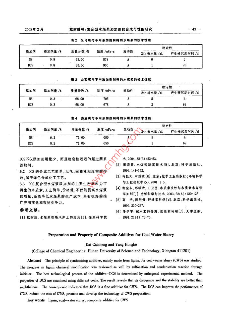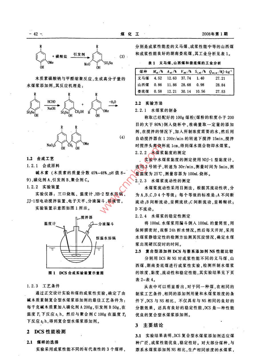 第1期(總第134期)煤化工No. 1(Total No 134)2008年2月Coal Chemical IndustryFeb.2008復合型水煤漿添加劑的合成與性能研究戴財勝楊紅波(湖南科技大學湘潭411201)摘要探討了以堿木質素為主要原料合成水煤漿添加劑的原理。采用在引發(fā)劑的作用下,對木質素進行磺化縮聚改性,提高了此類添加劑的成漿性能,并通過正交設計實驗法確定了復合型水煤漿添加劑DCS的最佳合成工藝條件。不同煤種的成漿實驗表明,DCS除具有萘系水煤漿添加劑的良好的分散性能外,還具有良好的穩(wěn)定性能,是一種性能優(yōu)良的復合型水煤漿添加劑。DCS添加劑可以提高水煤漿的成漿性能,降低其制漿成本促進水煤漿技術的推廣與發(fā)展。關鍵詞木質素水煤漿復合型水煤漿添加劑文章編號:1005-9598(2008)-01-004103中圖分類號:Q351.377文獻標識碼:A水煤漿是一種煤基流體燃料,由70%左右的煤中,經強堿處理的天然木質素大分子醚鍵斷裂,生成炭、30%左右的水和少量的添加劑,經一定的工藝過程較小的分子。與天然木質素相比,堿木質素具有平均制備而成。它既保持了煤炭原有的特性,又具有和石分子量較低、有明顯的多分散性、酚羥基和甲氧基含油一樣的流動性和穩(wěn)定性。水煤漿添加劑是水煤漿制量較高、醇羥基含量較低等特點。堿木質素分子中含備中的關鍵技術之一,它直接影響水煤漿的性能和生有芳香環(huán)和C3脂肪鏈組成C的單元疏水骨架和羥基產成本,因此研發(fā)性價比優(yōu)良的水煤漿添加劑是推廣及少量羧基,但是缺乏強親水性官能團,水溶性差,表和應用水煤漿的重要任務山面活性低③。而對木質素進行磺化是一種較好的改變木質素又稱作木素,是自然界唯一能提供可再生其表面性能的方法。若以NaSO3為磺化劑,在較高芳基化合成物的非石化資源,它和纖維素、半纖維素的溫度下,在其側鏈引入磺酸基,反應如下:是構成植物骨架的主要成分,其在陸地植物中的含量僅次于纖維素,每年產量約600億t田,是價格低廉,HC-SO-N來源豐富的可再生資源。本文主要介紹以木質素為主150℃-200℃要原料生產復合型水煤漿添加劑(DCS)的原理和工+Na2SO3一藝,并探討了DCS在水煤漿制備中的分散性能和水煤漿的穩(wěn)定性能。s03和C=0在低溫下就可使堿木質素磺甲基化1DCs的合成木質素的磺甲基化選擇性發(fā)生在酚羥基的鄰位,側鏈不發(fā)生反應11合成原埋堿木質素存在于燒堿法或硫酸鹽制漿法的廢液HOCH2-SO,木質素木質素基金項目:本項目由湖南省教育廳科研基金資助(項目編號:04c238)收稿日期:2007-11-12作者簡介:戴財勝(1965-),男,2000年博士畢業(yè)于中國礦業(yè)大學礦物加工工程專業(yè)教授,中國煤炭學會煤化工專業(yè)委為了提高堿木質素的磺化率,可采用引發(fā)劑先行員會委員,現從事煤化工和潔凈煤技術的研究與教學工作。誘導,反應原理如下煤化工2008年第1期分別是成漿性能差的義馬煤、成漿性能中等的山西煤+磺酸鹽引發(fā)劑和成漿性能良好的湖南婁底煤,其工業(yè)分析見表1。SO Na表1義馬煤、山西煤和婁底煤的工業(yè)分析煤種MA/%AM/%V4/%S4/%Q/MJkg1木質素磺酸鈉與甲醛縮聚反應,生成高分子量的義馬煤452126337.741.4027水煤漿添加劑,其反應機理是山西煤0.8611.8628.680.9828婁底煤0.5812.2130.1410.5627.5322實驗方法2.2.1水煤漿的制備稱取已經配好的100g煤粉(煤粉的粒度小于200目的大于80%)倒人燒杯中,準確量取一定量的添加劑,在攪拌的情況下,加入所制濃度需要的水,然后用(4)自動攪拌器在1200r/min的轉速下攪拌15min,攪拌時攪拌頭離燒杯底1cm,得到煤水混合物即水煤漿2.2.2水煤漿黏度的測定12合成工藝實驗中水煤漿黏度的測定使用NDJ-1型黏度計,1.2.1合成原料選用3號轉子,轉速為30r/min,測量時間為5min,測堿木素(木質素的質量分數45%-48%,pH值8~量溫度為25℃,測量容器為100L燒杯。9)、磺化劑A、引發(fā)劑B、聚合劑C。2.2.3水煤漿流動性的測定1.2.2實驗裝置水煤漿流動性采用目測法,根據其流動性狀,分實驗儀器:三口燒瓶、溫度計、HB-2型水浴鍋為AB、C、D4個等級;每個等級的標準是:A不間斷J1型電動攪拌裝置、電子天平、分液漏斗、移液管。流動;B間斷流動,呈稠流狀;C間斷流動,呈稀糊狀;實驗裝置示意圖如圖1所示。D不流動攪拌器2.2.4水煤漿的穩(wěn)定性測定溫度計分液漏斗將100mL水煤漿用漏斗倒人100mL的量筒里,用保鮮膜密封,觀察24h析水情況。然后每天開封,采用恒溫水浴鍋水煤漿靜穩(wěn)定性的檢測方法測其沉淀情況,確定水煤漿出現硬沉淀時的時間。23復合型添加劑DCS與綦系添加劑Ns性能比較分別用DCS和NS對成漿性能不同的義馬煤、山西煤、湖南婁底煤進行成漿性實驗,檢測所制水煤漿圖1DCS合成實驗裝置示意圖的濃度、黏度、流動性和穩(wěn)定性能,其實驗結果見下頁表2~表4。1.2.3工藝條件從表中可以明顯看出,對于同一種煤,在相同的通過正交設計實驗和煤的成漿性實驗確定了由制漿工藝條件、相同的添加劑用量和水煤漿濃度的條堿木質素制復合型水煤漿添加劑的最佳工藝條件為:件下,DS與NS相比,不僅具有與NS相同的良好的每千克堿木質素加入磺化劑A200g,引發(fā)劑B50g在分散效果,還具有良好的穩(wěn)定性能,DCS是一種性能溫度T下反應th,然后與聚合劑C100g在溫度T2優(yōu)良的復合型水煤漿添加劑。下反應h2h,得到復合型水煤漿添加劑。3主要結論2DCS性能檢測3.1實驗結果表明,DCS復合型水煤漿添加劑適應煤21煤樣