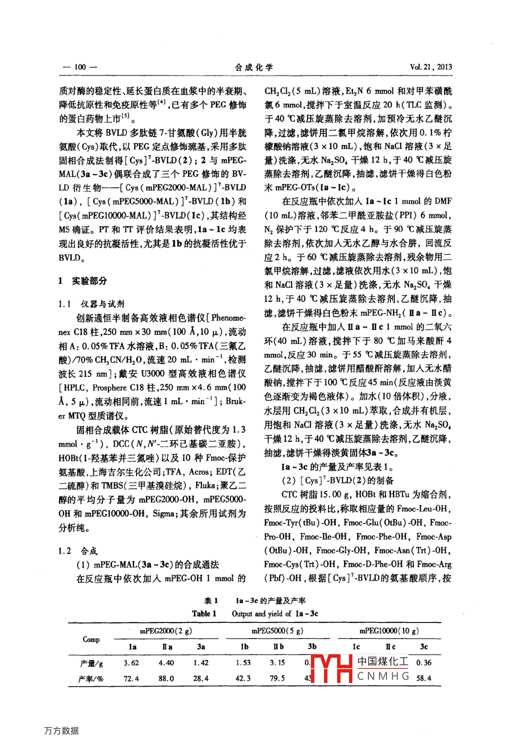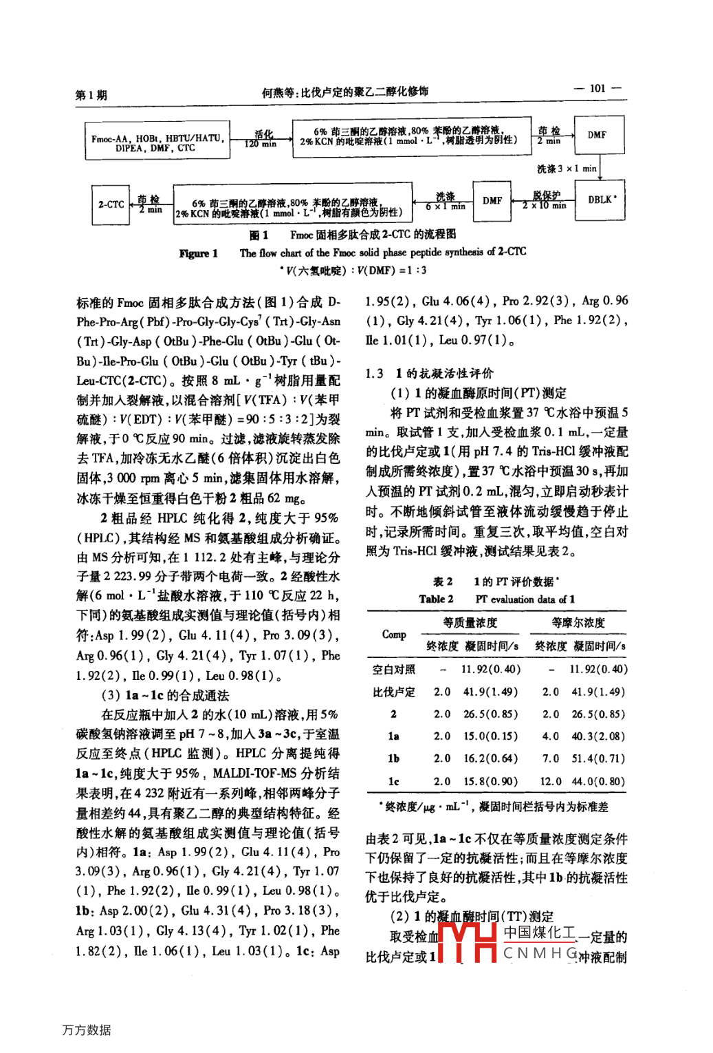 2013年第21卷合成化學(xué)第1期,099-102Chinese Journal of Synthetic ChemistryNo.1,099~102制藥技術(shù)比伐盧定的聚乙二醇化修飾何燕,鄧言波,王良友(1.蘇州大學(xué)醫(yī)學(xué)部放射醫(yī)學(xué)與防護(hù)學(xué)院江蘇蘇州2151232.蘇州中科天馬肽工程中心有限公司江蘇蘇州215101)摘要:將比伐盧定(BVLD)多肽鏈7甘氨酸(Cly)用半胱氨酸(Cys)取代,以聚乙二醇(PEG)定點(diǎn)修飾巰基,采用多肽固相合成法制得[Cy]BLD(2);2與 mPEG-MAL(3a~3c)偶聯(lián)合成了三個(gè)聚乙二醇化修飾的比伐盧定衍生物—[Cys( mPEG200MAL)]BvLD(1a),[Cys(mPG500MAL)]-BvLD(1b)和[Cys(mPEG000MAL)]BvLD(1c),其結(jié)構(gòu)經(jīng)MS確證。PT和T評價(jià)結(jié)果表明,1a-1c均表現(xiàn)出良好的抗凝活性,尤其是1b的抗凝活性優(yōu)于比伐盧定:比伐盧定;聚乙二醇化修飾;多肽合成;抗凝活性中圖分類號:062972;R914.5文獻(xiàn)標(biāo)識碼:A文章編號:1005-1511(2013)01009904PEGylation of BivalirudinHE Yan. DENG Yan-Do WANG IInstitute of Radiological Medicine and Protection, Soochow University, Suzhou 215123, China2, Suzhou China Tech Peptide Co. Ltd., Suzhou 215101,ChinaAbstract: Three PEGylation bivalirudin( BVLD )derivatives, Cys( mPEG2000-MAL)]-BVLD(1a), [Cys( mPEG5000-MAL)]-BVLD(Ib)and Cys(mPEG10000-MAL)J-BVLD(1c),weresynthesized by addition reaction of mPEG-MAL(3a-3c)and cys] -BVLD(2)which was preparedby replacing the 7-glycine( Gly )of BVLD by cysteine( Cys)with the solid phase peptide synthesisThe structures were confirmed by Ms. The results of Pt and tt evaluation showed that la-Ic exhibited good anticoagulation activities, especially 1b was better than bivalirudinKeywords: bivalirudin; PEGylation; peptide synthesis; anticoagulation activity比伐盧定(BVLD)是由20個(gè)氨基酸(DPhe-250mg,價(jià)格昂貴。其在腎功能正常的患者體內(nèi)Po- Arg- Pro-Gly-Gly-Gly-Gly- Asn-Gly- Asp-Phe-Glu-的清除半衰期為25min,雖然比伐盧定于2000年Cu- Ile-Pro-Glu-Glu- Tyr-Leu)組成的水蛭素的衍被批準(zhǔn)用于經(jīng)皮冠狀動(dòng)脈腔內(nèi)血管成形術(shù)的抗凝生物是凝血酶的直接可逆的二價(jià)抑制劑,可治療在2005年被批準(zhǔn)用于接受經(jīng)皮冠狀動(dòng)脈介以與凝血酶的催化位點(diǎn)和陰離子結(jié)合位點(diǎn)(底物入治療的抗凝治療,但是昂貴的價(jià)格限制了其識別位點(diǎn))結(jié)合。BVLD于200年12月15日在臨床上的應(yīng)用。因此,開發(fā)長效、安全、經(jīng)濟(jì)的被美國FDA批準(zhǔn)上市。類似藥物十分必要。蛋白質(zhì)經(jīng)聚乙二醇化修飾BvLD是一種合成的多肽藥物,單次劑量為( PEGylation)后能顯著改善其特性,如增加蛋白收稿日期:20120705;修訂日期:201211基金項(xiàng)目:江蘇省“大學(xué)生實(shí)踐創(chuàng)新訓(xùn)練計(jì)劃”資助項(xiàng)目(5731504610)中國煤化工作者簡介:何燕(1990-),女,漢族新疆昌吉呼圖壁人,在讀本科生,主要從*YHCNMHG通信聯(lián)系人:王良友,副研究員,E-mal:jiangyang@gai.com100一合成化學(xué)vol.21,2013質(zhì)對酶的穩(wěn)定性延長蛋白質(zhì)在血漿中的半衰期、CH2Cl2(5mL)溶液,Et3N6mmol和對甲苯磺酰降低抗原性和免疫原性等4,已有多個(gè)PEG修飾氯6mml,攪拌下于室溫反應(yīng)20h(TC監(jiān)測)。的蛋白藥物上市。于40℃減壓旋蒸除去溶劑,加預(yù)冷無水乙醚沉本文將BVLD多肽鏈7甘氨酸(Cy)用半胱降,過濾,濾餅用二氯甲烷溶解,依次用0.1%檸氨酸(Cys)取代,以PEC定點(diǎn)修飾巰基,采用多肽檬酸鈉溶液(3×10mL),飽和NaCl溶液(3×足固相合成法制得[Cys]BvLD(2);2與mPEG-量)洗滌無水Na2SO4干燥12h,于40℃減壓旋MAL(3a~3c)偶聯(lián)合成了三個(gè)PEG修飾的BV-蒸除去溶劑,乙醚沉降抽濾濾餅干燥得白色粉LD衍生物——[cys(mPEG2000MAL)]BVLD末 mPEG-OTs(Ia-le)(1a),[ Cys(mPEG5000-MAL )]'-BVLD(1b)F在反應(yīng)瓶中依次加入Ia~lc1mmol的DMFCys(mPG00OMAL)]BVLD(1c),其結(jié)構(gòu)經(jīng)(10mL)溶液鄰苯二甲酰亞胺鹽(P6mmolMs確證。PT和TT評價(jià)結(jié)果表明,1a~1c均表N2保護(hù)下于120℃反應(yīng)4h。于90℃減壓旋蒸現(xiàn)出良好的抗凝活性,尤其是1b的抗凝活性優(yōu)于除去溶劑,依次加入無水乙醇與水合肼,回流反BvLD。應(yīng)2h。于60℃減壓旋蒸除去溶劑,殘余物用氯甲烷溶解,過濾濾液依次用水(3×10mL),飽1實(shí)驗(yàn)部分和NaCl溶液(3×足量)洗滌,無水Na2SO4干燥1.1儀器與試劑12h,于40℃減壓旋蒸除去溶劑,乙醚沉降,抽創(chuàng)新通恒半制備高效液相色譜儀[ Phenome濾濾餅干燥得白色粉末 mPEG-NH2(Ⅱa~IenexC】8柱,250mm×30mm(100A,10μ),流動(dòng)在反應(yīng)瓶中加人Ⅱa~Ⅱe1mmol的二氧六相A:0.05%TFA水溶液,B:0.05%TFA(三氟乙環(huán)(40m)溶液,攪拌下于80℃加馬來酸酐4酸)70%CH2CN/H2O,流速20mL·min-1,檢測mmo,反應(yīng)30min。于55℃減壓旋蒸除去溶劑波長215m],戴安U00高效液相色譜儀乙醚沉降,抽濾,濾餅用醋酸酐溶解,加人無水醋[HPLC, Prosphere C18 #, 250 mm x4. 6 mm(100酸鈉,攪拌下于100℃反應(yīng)45min(反應(yīng)液由淡黃A,5μ),流動(dòng)相同前,流速1mL·min];Bmk.色逐漸變?yōu)楹稚后w)。加水(10倍體積),分液,er MtQ型質(zhì)譜儀水層用CH2Cl2(3×10mL)萃取,合成并有機(jī)層,固相合成載體cTC樹脂(原始替代度為13用飽和NaCl溶液(3×足量)洗滌,無水Na2SOmnlg2),Dc(M,N一二環(huán)己基碳二亞胺),千燥12b,40℃減壓旋秦除去溶劑,乙醚沉降,HoB(L羥基苯并三氮唑)以及10種Fm0c保護(hù)抽濾,濾餅干燥得淡黃固體3-3氨基酸,上海吉爾生化公司;TFA, Acros;EDT(乙Ia~3c的產(chǎn)量及產(chǎn)率見表1。二硫醇)和TMBS(三甲基溴硅烷), Fluka;聚乙二2)[Cy