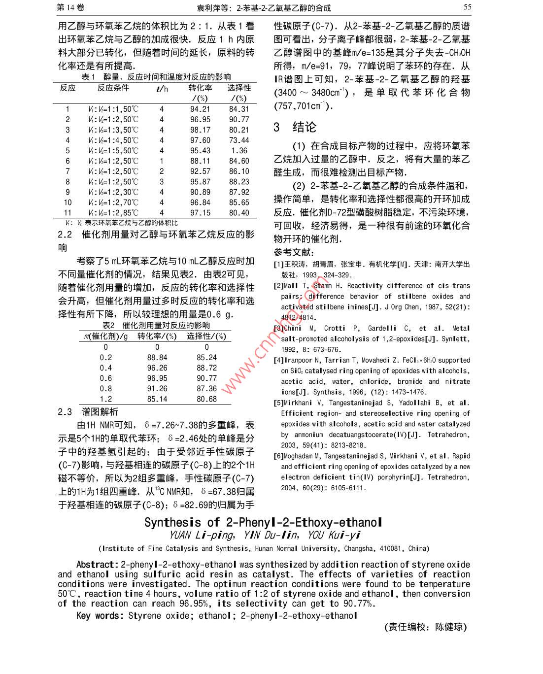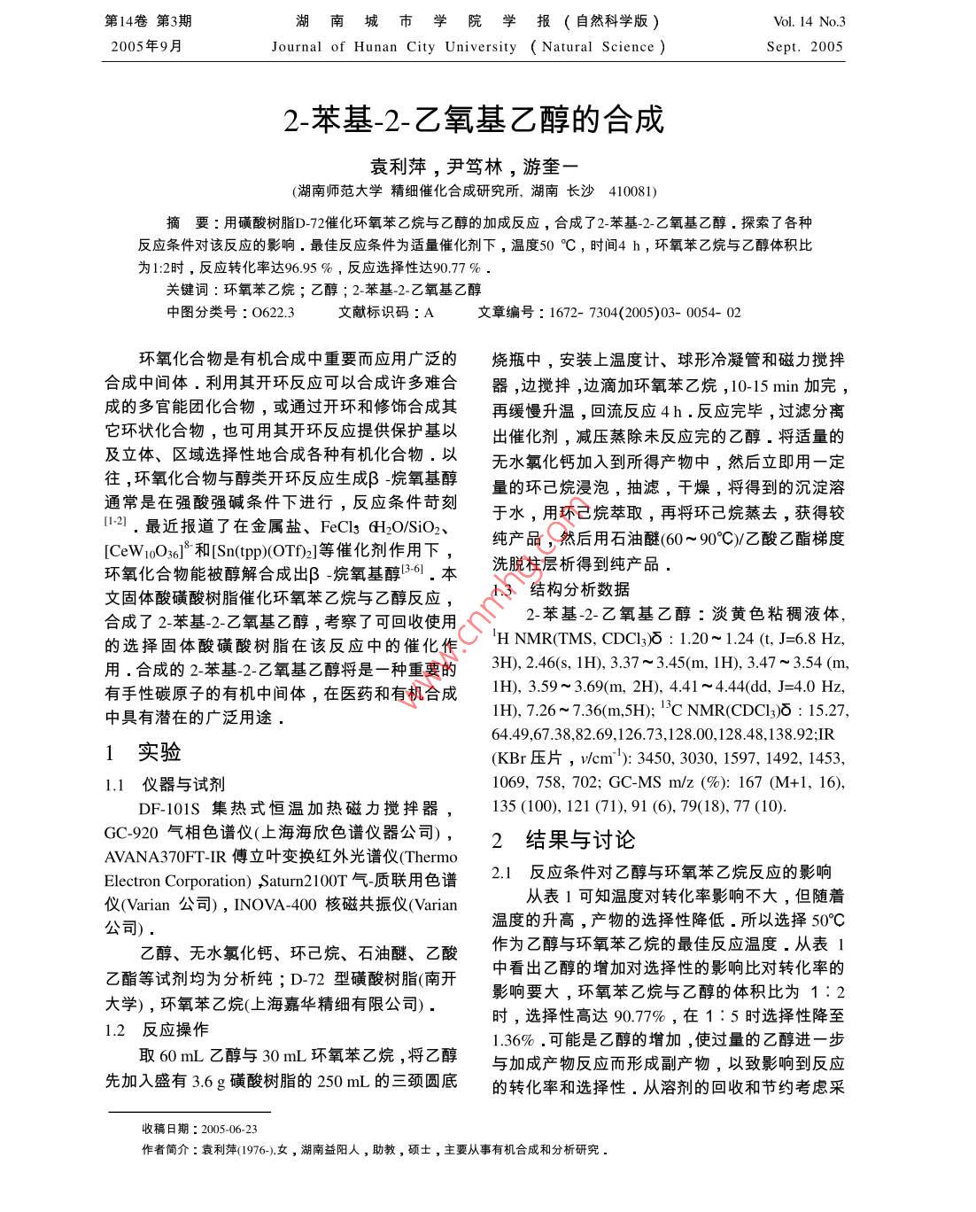 第14卷第3期湖南城市學(xué)院學(xué)報(bào)(自然科學(xué)版)VoL. 14 No. 32005年9月Journal of Hunan City University Natural ScienceSept. 20052苯基2-乙氧基乙醇的合成袁利萍,尹篤林,游奎(湖南師范大學(xué)精細(xì)催化合成研究所,湖南長(zhǎng)沙410081)要:用磺酸樹脂D-η2催化環(huán)氧苯乙烷與乙醇的加成反應(yīng),合成了2-苯基-2-乙氧基乙醇,探索了各種反應(yīng)條件對(duì)該反應(yīng)的影響,最佳反應(yīng)條件為適量催化劑下,溫度50℃C,時(shí)間4h,環(huán)氧苯乙烷與乙醇體積比為1:2時(shí),反應(yīng)轉(zhuǎn)化率達(dá)9695%,反應(yīng)選擇性達(dá)9077%關(guān)鍵詞:環(huán)氧苯乙烷;乙醇;2-苯基-2-乙氧基乙醇中圖分類號(hào):O622.3文獻(xiàn)標(biāo)識(shí)碼:A文章編號(hào):1672-7304(2005)03-0054-02環(huán)氧化合物是有機(jī)合成中重要而應(yīng)用廣泛的燒瓶中,安裝上溫度計(jì)、球形冾凝管和磁力攪拌合成中間體.利用其開環(huán)反應(yīng)可以合成許多難合器,邊攪捭,邊滴加環(huán)氧苯乙烷,10-15min加完,成的多官能團(tuán)化合物,或通過(guò)開環(huán)和修飾合成其再緩慢升溫,回流反應(yīng)4h,反應(yīng)完畢,過(guò)濾分離它環(huán)狀化合物,也可用其開環(huán)反應(yīng)提供保護(hù)基以出催化劑,減壓蒸除未反應(yīng)完的乙醇.將適量的及立體、區(qū)域選擇性地合成各種有機(jī)化合物.以無(wú)水氯化鈣加入到所得產(chǎn)物中,然后立即用一定往,環(huán)氧化合物與醇類開環(huán)反應(yīng)生成β-烷氧基醇量的環(huán)己烷浸泡,抽濾,干燥,將得到的沉淀溶通常是在強(qiáng)酸強(qiáng)堿條件下進(jìn)行,反應(yīng)條件苛刻于水,用環(huán)己烷萃取,再捋環(huán)己烷蒸去,獲得較12.最近報(bào)道了在金屬鹽、 FeCl3 6H2O/SIO、純產(chǎn)品,然后用石油醚(60~90℃c)乙酸乙酯梯度ICeW1O36和Snp)OT2]等催化劑作用下,環(huán)氧化合物能被醇解合成出β烷氧基醇6,本洗脫柱層析得到純產(chǎn)品文固體酸磺酸樹脂催化環(huán)氧苯乙烷與乙醇反應(yīng)1.3結(jié)構(gòu)分析數(shù)據(jù)合成了2-苯基2-乙氧基乙醇,考察了可回收使用2-苯基-2-乙氧基乙醇:淡黃色粘稠液體的選擇固體酸磺酸樹脂在該反應(yīng)中的催化作HNMR(IMS.CDCl37:120~1.24(tJ=68H,用.合成的2-苯基2-乙氧基乙醇捋是一種重要的H),2.46(s,1H,3.37~3.45m,1H,3.47~3.54(m,有手性碳原子的有機(jī)中間體,在醫(yī)藥和有機(jī)合成1HD,359~369(m,2H).4.41~4.44d,J=40Hz中具有潛在的廣泛用途1H,7.26~7,36(m,5H);1CNMR(CDCl3:15.27,644967388269,12673,128.0,128.48,13892IR1實(shí)驗(yàn)(KBr壓片,vcm3):3450,3030,1597,1492,1453,1.1儀器與試劑1069,758,702; GC-MS m/(%):167(M+1,16)DF-101S集熱式恒溫加熱磁力攪拌器135(100),121(71),91(6),79(18),77(10)GC920氣相色諧儀(上海海欣色譜儀器公司),2結(jié)果與討論Electron Corporation) Saturn2l00T氣質(zhì)聯(lián)用色譜2.1反應(yīng)條件對(duì)乙醇與環(huán)氧苯乙烷反應(yīng)的影響儀( Varian公司), INOVA400核磁共振儀 Varian從表1可知溫度對(duì)轉(zhuǎn)化率影響不大,但隨著公司)溫度的升高,產(chǎn)物的選擇性降低。所以選擇50°c乙醇、無(wú)水氯化鈣、環(huán)己烷、石油獸、乙酸作為乙醇與環(huán)氧苯乙烷的最佳反應(yīng)溫度,從表1乙酯等試劑均為分析純;D-72型磺酸樹脂(南開中看出乙醇的增加對(duì)選擇性的影響比對(duì)轉(zhuǎn)化率的大學(xué)),環(huán)氧苯乙烷(上海嘉華精細(xì)有限公司)影響要大,環(huán)氧苯乙烷與乙醇的體積比為1:212反應(yīng)操作時(shí),選擇性高達(dá)90.77%,在1:5時(shí)選擇性降至1.36%.可能是乙醇的增加,使過(guò)量的乙醇進(jìn)一步取60mL乙醇與30mL環(huán)氧苯乙烷,將乙醇與加成產(chǎn)物反應(yīng)而形成副產(chǎn)物,以致影響到反應(yīng)先加入盛有36g磺酸樹脂的250mL的三頸圓底的轉(zhuǎn)化率和選擇性,從溶劑的回收和節(jié)約考慮采收稿日期:200506-23作者簡(jiǎn)介:袁利萍(1976-)女,湖南益陽(yáng)人,助教,碩士,主要從事有機(jī)合成和分析研究第14卷袁利萍等:2苯基-2-乙氧基乙醇的合成用乙醇與環(huán)氧苯乙烷的體積比為2:1.從表1看性碳原子(C-7).從2-苯基-2-乙氧基乙醇的質(zhì)譜岀環(huán)氧苯乙烷與乙醇的加成很快.反應(yīng)1h內(nèi)原圖可看岀,分子離子峰都很弱,2-苯基-2-乙氧基料大部分已轉(zhuǎn)化,但隨著時(shí)間的延長(zhǎng),原料的轉(zhuǎn)乙醇譜圖中的基峰me=135是其分子失去-CHOH化率還是有所提高.所得,m/e=91,79,77峰說(shuō)明了苯環(huán)的存在.從1醇量、反應(yīng)時(shí)間和溫度對(duì)反應(yīng)的影響lR譜圖上可知,2-苯基-2-乙氧基乙醇的羥基反應(yīng)反應(yīng)條件th轉(zhuǎn)化率選擇性(3400~3480cm),是單取代苯環(huán)化合物k=1:1,50℃484.31(757,701cm)96.9590.773k:k1:350℃498.1780.213結(jié)論4V:V=1:4,50℃5:k=1:5,50℃95.431.36(1)在合成目標(biāo)產(chǎn)物的過(guò)程中,應(yīng)將環(huán)氧苯6:=1:2,50℃188.1184.60乙烷加入過(guò)量的乙醇中.反之,將有大量的苯乙71:=1:2,50℃2醛生成,而很難檢測(cè)出目標(biāo)產(chǎn)物.8:=1:2,50℃395.8788.239:=1:2,30℃490.8987.922)2-苯基-2-乙氧基乙醇的合成條件溫和,10:k=1:2,70℃496.8485.操作簡(jiǎn)單,是轉(zhuǎn)化率和選擇性都很高的開環(huán)加成11:k=1:2,85℃41580.40反應(yīng).催化劑D-72型磺酸樹脂穩(wěn)定,不污染環(huán)境,M:陘表示環(huán)氧苯乙烷與乙醇的體積比可回收,經(jīng)濟(jì)易得,是一種很有前途的環(huán)氧化合2.2催化