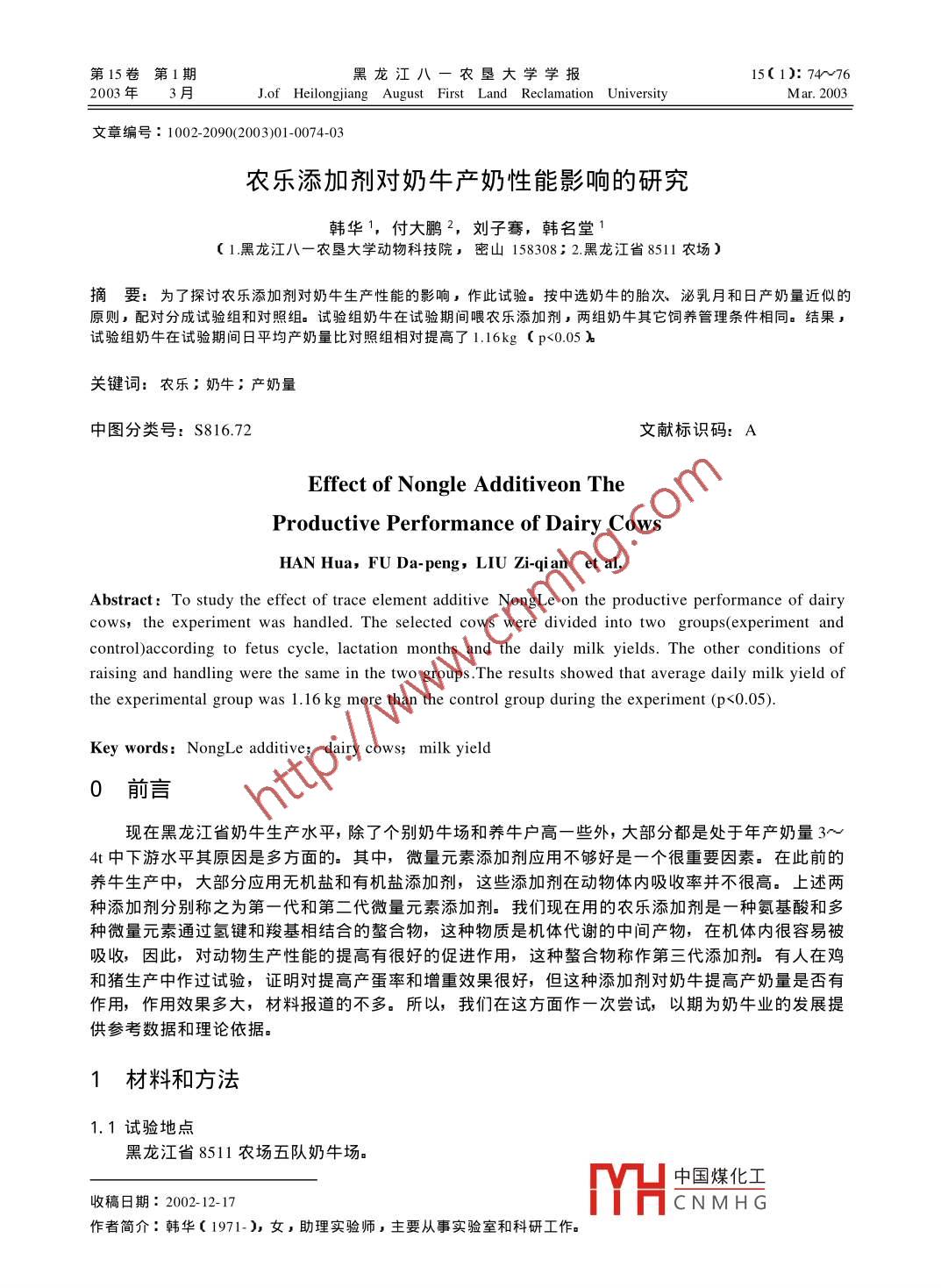 第15卷第1期黑龍江八一農(nóng)墾大學(xué)學(xué)報(bào)15( 1): 74~762003年3 月J.of Heilongjiang August First Land Reclamation UniversityM ar.2003文章編號(hào): 1002-2090(2003)01 -0074-03農(nóng)樂添加劑對(duì)奶牛產(chǎn)奶性能影響的研究.韓華1,付大鵬2,劉子騫,韓名堂( 1.黑龍江八一農(nóng)墾大學(xué)動(dòng)物科技院,密山158308; 2.黑龍江省8511農(nóng)場) .摘要: 為了探討農(nóng)樂添加劑對(duì)奶牛生產(chǎn)性能的影響,作此試驗(yàn)。按中選奶牛的胎次、泌乳月和日產(chǎn)奶量近似的原則,配對(duì)分成試驗(yàn)組和對(duì)照組。試驗(yàn)組奶牛在試驗(yàn)期間喂農(nóng)樂添加劑,兩組奶牛其它飼養(yǎng)管理?xiàng)l件相同。結(jié)果,試驗(yàn)組奶牛在試驗(yàn)期間日平均產(chǎn)奶量比對(duì)照組相對(duì)提高了1.16kg(p<0.05》關(guān)鍵詞:農(nóng)樂;奶牛;產(chǎn)奶量中圖分類號(hào): S816.72文獻(xiàn)標(biāo)識(shí)碼: AEffect of Nongle Additiveon TheProductive Performance of Dairy CowsHAN Hua, FU Da-peng, LIU Zi-qian et al. .Abstract: To study the effect of trace element additive NongLe on the productive performance of dairycowS; the experiment was handled. The selected cows were divided into two groups(experiment andcontrol)according to fetus cycle, lactation months and the daily milk yields. The other conditions ofraising and handling were the same in the two groups .The results showed that average daily milk yield ofthe experimental group was 1.16 kg more than the control group during the experiment (p<0.05).Key words : NongLe additive; dairy cows; milk yield0前言現(xiàn)在黑龍江省奶牛生產(chǎn)水平,除了個(gè)別奶牛場和養(yǎng)牛戶高一些外,大部分都是處于年產(chǎn)奶量3~4t中下游水平其原因是多方面的。其中,微量元素添加劑應(yīng)用不夠好是-個(gè)很重要因素。在此前的養(yǎng)牛生產(chǎn)中,大部分應(yīng)用無機(jī)鹽和有機(jī)鹽添加劑,這些添加劑在動(dòng)物體內(nèi)吸收率并不很高。上述兩種添加劑分別稱之為第-代和第二代微量元素添加劑。我們現(xiàn)在用的農(nóng)樂添加劑是-種氨基酸和多種微量元素通過氫鍵和羧基相結(jié)合的螯合物,這種物質(zhì)是機(jī)體代謝的中間產(chǎn)物,在機(jī)體內(nèi)很容易被吸收,因此,對(duì)動(dòng)物生產(chǎn)性能的提高有很好的促進(jìn)作用,這種螯合物稱作第三代添加劑。有人在雞和豬生產(chǎn)中作過試驗(yàn),證明對(duì)提高產(chǎn)蛋率和增重效果很好,但這種添加劑對(duì)奶牛提高產(chǎn)奶量是否有作用,作用效果多大,材料報(bào)道的不多。所以,我們?cè)谶@方面作一次嘗試,以期為奶牛業(yè)的發(fā)展提.供參考數(shù)據(jù)和理論依據(jù)。1材料和方法1.1試驗(yàn)地點(diǎn)黑龍江省8511農(nóng)場五隊(duì)奶牛場。中國煤化工收稿日期: 2002- 12-17MYHCNMH G作者簡介:韓華(1971-),女,助理實(shí)驗(yàn)師,主要從事實(shí)驗(yàn)室和科研工作。..第1期韓華等:農(nóng)樂添加劑對(duì)奶牛產(chǎn)奶性能影響的研究1.2試驗(yàn)時(shí)間2001年6月2日至6月25日,計(jì)23d,在正式試驗(yàn)開始前有7d預(yù)試期。1.3添加劑來源廣西南寧農(nóng)樂廠供應(yīng)。1. 4試驗(yàn)牛的選擇在8511農(nóng)場五隊(duì)奶牛群中選供試牛18頭,按胎次、泌乳月和日產(chǎn)奶量近似的原則配對(duì)分成試驗(yàn)組和對(duì)照組,各9頭。供試牛情況見表1。表1供試牛胎次、泌乳月和日產(chǎn)奶量情況表(單位: kg)試驗(yàn)鄉(xiāng)對(duì)照組牛號(hào)胎次泌乳月_日產(chǎn)奶量泌乳月日產(chǎn)奶量.526.7526.5919.75192927.7523. 530.75322818.7516.752.894.5625.253.004.2225.17經(jīng)過生物統(tǒng)計(jì)處理,t 檢驗(yàn)試驗(yàn)組和對(duì)照組奶牛平均日單產(chǎn)差異不顯著(p>0.05)。農(nóng)樂的飼喂:在試驗(yàn)期試驗(yàn)組奶牛按添加劑說明,1支農(nóng)樂(5mL)用15kg水稀釋拌到精料中,一天分三次喂給9頭奶牛,每隔兩天喂一天。試驗(yàn)組和對(duì)照組奶牛其它飼養(yǎng)管理?xiàng)l件相同。2試驗(yàn)結(jié)果2.1產(chǎn)奶量情況見表2。表2供試牛產(chǎn)奶量統(tǒng)計(jì)表(單位: kg)日期( d)260試驗(yàn)組207.25228.25220232.35214.25215.7223.1214206.5 .22 1.25215219.25206.95210220.6198.313151618220.1209.8209.5212.1221.5231.9217.4212.4214.8 .208.7192.3197.5216.6211.7200.7200平均日20222325試驗(yàn)天數(shù)總產(chǎn)奶量產(chǎn)奶量214.1211.4220.7214.8225.8217.95009.7924.2209207.2205.6204.2206.6197.64769.3523.04從表2可見,兩組奶牛因受某些因素(見討論與分析)影響,日平均單產(chǎn)和開始相比都有所下降,但試驗(yàn)組奶牛比對(duì)照組相應(yīng)增加了1.16kg (P<0.05)。2.2飼料消耗情況試驗(yàn)組奶牛平均每頭每日耗料11.01kg, 玉米青貯29.66 kg,:MYH中國煤化工10.52kg,玉米青貯29.39kg。耗料情況,試驗(yàn)組奶牛略高于對(duì)照組,玉米青CNMH G持平。.7黑龍江八一農(nóng)墾大學(xué)學(xué)報(bào)第15卷3討論與分析3.1兩組奶牛平均日產(chǎn)奶量雖然都有所下降,但試驗(yàn)組奶牛比對(duì)照組相對(duì)的有所提高,增加了1.16kg。說明農(nóng)樂對(duì)奶牛產(chǎn)奶量的提高是有-定作用的。3.2由于8511農(nóng)場五隊(duì)奶牛飼養(yǎng)水平比較高,試驗(yàn)組和對(duì)照組奶牛,在試驗(yàn)開始時(shí),平均日產(chǎn)奶量都在25kg以上,所以奶牛產(chǎn)奶量想大幅度的提高是不可能的,我們的試驗(yàn)也證明了這一點(diǎn),僅有1.16kg°由此我們可以推斷,農(nóng)樂
