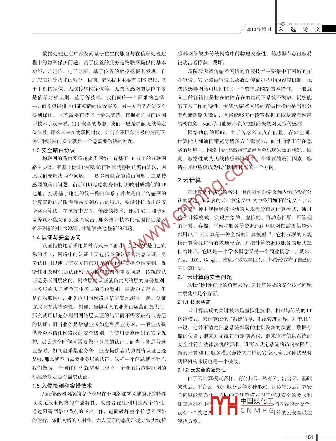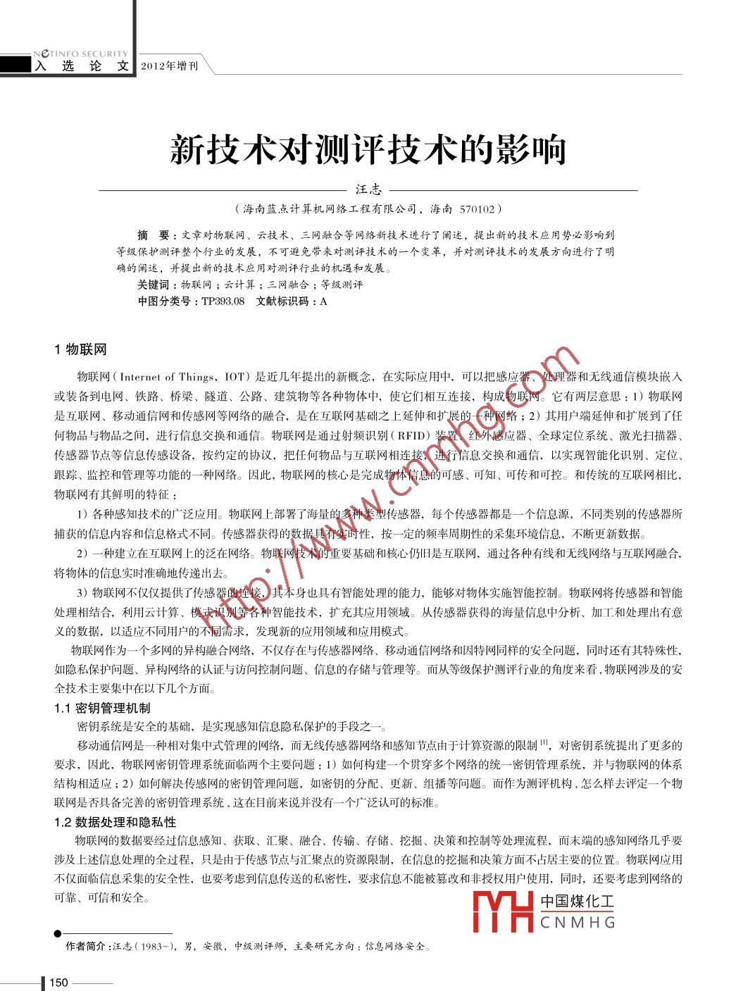 NETINFO SECURITY入選_論文2012年增刊新技術(shù)對(duì)測(cè)評(píng)技術(shù)的影響汪志(海南藍(lán)點(diǎn)計(jì)算機(jī)網(wǎng)絡(luò)工程有限公司,海南570102)摘要:文章對(duì)物聯(lián)網(wǎng)、云技術(shù)、三網(wǎng)融合等網(wǎng)絡(luò)新技術(shù)進(jìn)行了闡述,提出新的技術(shù)應(yīng)用勢(shì)必影響到等級(jí)保護(hù)測(cè)評(píng)整個(gè)行業(yè)的發(fā)展,不可避免帶來(lái)對(duì)測(cè)評(píng)技術(shù)的一個(gè)變革,并對(duì)測(cè)評(píng)技術(shù)的發(fā)展方向進(jìn)行了明確的闡述,并提出新的技術(shù)應(yīng)用對(duì)測(cè)評(píng)行業(yè)的機(jī)遇和發(fā)展。關(guān)鍵詞:物聯(lián)網(wǎng);云計(jì)算;三網(wǎng)融合;等級(jí)測(cè)評(píng)中圖分類(lèi)號(hào): TP393.08文獻(xiàn)標(biāo)識(shí)碼 : A1物聯(lián)網(wǎng)物聯(lián)網(wǎng)( Internet of Things, I0T) 是近幾年提出的新概念,在實(shí)際應(yīng)用中,可以把感應(yīng)器、處理器和無(wú)線通信模塊嵌入或裝備到電網(wǎng)、鐵路、橋梁、隧道、公路、建筑物等各種物體中,使它們相互連接,構(gòu)成物聯(lián)網(wǎng)。它有兩層意思: 1)物聯(lián)網(wǎng)是互聯(lián)網(wǎng)、移動(dòng)通信網(wǎng)和傳感網(wǎng)等網(wǎng)絡(luò)的融合,是在互聯(lián)網(wǎng)基礎(chǔ)之上延伸和擴(kuò)展的一種網(wǎng)絡(luò);2)其用戶端延伸和擴(kuò)展到了任何物品與物品之間,進(jìn)行信息交換和通信。物聯(lián)網(wǎng)是通過(guò)射頻識(shí)別(RFID)裝置、紅外感應(yīng)器、全球定位系統(tǒng)、激光掃描器、傳感器節(jié)點(diǎn)等信息傳感設(shè)備,按約定的協(xié)議,把任何物品與互聯(lián)網(wǎng)相連接,進(jìn)行信息交換和通信,以實(shí)現(xiàn)智能化識(shí)別、定位、跟蹤、監(jiān)控和管理等功能的一種網(wǎng)絡(luò)。因此,物聯(lián)網(wǎng)的核心是完成物體信息的可感、可知、可傳和可控。和傳統(tǒng)的互聯(lián)網(wǎng)相比,物聯(lián)網(wǎng)有其鮮明的特征:1)各種感知技術(shù)的廣泛應(yīng)用。物聯(lián)網(wǎng)上部署了海量的多種類(lèi)型傳感器,每個(gè)傳感器都是--個(gè)信息源,不同類(lèi)別的傳感器所捕獲的信息內(nèi)容和信息格式不同。傳感器獲得的數(shù)據(jù)具有實(shí)時(shí)性,按-定的頻率周期性的采集環(huán)境信息,不斷更新數(shù)據(jù)。2) -種建立在互聯(lián)網(wǎng)上的泛在網(wǎng)絡(luò)。物聯(lián)網(wǎng)技術(shù)的重要基礎(chǔ)和核心仍舊是互聯(lián)網(wǎng),通過(guò)各種有線和無(wú)線網(wǎng)絡(luò)與互聯(lián)網(wǎng)融合,將物體的信息實(shí)時(shí)準(zhǔn)確地傳遞出去。3)物聯(lián)網(wǎng)不僅僅提供了傳感器的連接,其本身也具有智能處理的能力,能夠?qū)ξ矬w實(shí)施智能控制。物聯(lián)網(wǎng)將傳感器和智能處理相結(jié)合,利用云計(jì)算、模式識(shí)別等各種智能技術(shù),擴(kuò)充其應(yīng)用領(lǐng)域。從傳感器獲得的海量信息中分析、加工和處理出有意義的數(shù)據(jù),以適應(yīng)不同用戶的不同需求,發(fā)現(xiàn)新的應(yīng)用領(lǐng)域和應(yīng)用模式。物聯(lián)網(wǎng)作為一- 個(gè)多網(wǎng)的異構(gòu)融合網(wǎng)絡(luò),不僅存在與傳感器網(wǎng)絡(luò)、移動(dòng)通信網(wǎng)絡(luò)和因特網(wǎng)同樣的安全問(wèn)題,同時(shí)還有其特殊性,如隱私保護(hù)問(wèn)題、異構(gòu)網(wǎng)絡(luò)的認(rèn)證與訪問(wèn)控制問(wèn)題、信息的存儲(chǔ)與管理等。而從等級(jí)保護(hù)測(cè)評(píng)行業(yè)的角度來(lái)看,物聯(lián)網(wǎng)涉及的安全技術(shù)主要集中在以下幾個(gè)方面。1.1密鑰管理機(jī)制密鑰系統(tǒng)是安全的基礎(chǔ),是實(shí)現(xiàn)感知信息隱私保護(hù)的手段之一移動(dòng)通信網(wǎng)是-種相對(duì)集中式管理的網(wǎng)絡(luò),而無(wú)線傳感器網(wǎng)絡(luò)和感知節(jié)點(diǎn)由于計(jì)算資源的限制",對(duì)密鑰系統(tǒng)提出了更多的要求,因此,物聯(lián)網(wǎng)密鑰管理系統(tǒng)面臨兩個(gè)主要問(wèn)題: 1)如何構(gòu)建一- 個(gè)貫穿多個(gè)網(wǎng)絡(luò)的統(tǒng)- - 密鑰管理系統(tǒng),并與物聯(lián)網(wǎng)的體系結(jié)構(gòu)相適應(yīng); 2)如何解決傳感網(wǎng)的密鑰管理問(wèn)題,如密鑰的分配、更新、組播等問(wèn)題。而作為測(cè)評(píng)機(jī)構(gòu),怎么樣去評(píng)定一個(gè)物聯(lián)網(wǎng)是具備完善的密鑰管理系統(tǒng),這在目前來(lái)說(shuō)并沒(méi)有一-個(gè)廣 泛認(rèn)可的標(biāo)準(zhǔn)。1.2數(shù)據(jù)處理和隱私性物聯(lián)網(wǎng)的數(shù)據(jù)要經(jīng)過(guò)信息感知、獲取、匯聚、融合、傳輸、存儲(chǔ)、挖掘、決策和控制等處理流程,而末端的感知網(wǎng)絡(luò)幾乎要涉及上述信息處理的全過(guò)程,只是由于傳感節(jié)點(diǎn)與匯聚點(diǎn)的資源限制,在信息的挖掘和決策方面不占居主要的位置。物聯(lián)網(wǎng)應(yīng)用不僅面臨信息采集的安全性,也要考慮到信息傳送的私密性,要求信息不能被篡改和非授權(quán)用戶使用,同時(shí),還要考慮到網(wǎng)絡(luò)的可靠、可信和安全。中國(guó)煤化工MHCNMHG作者簡(jiǎn)介:汪志( 1983-),男,安徽,中級(jí)測(cè)評(píng)師,主要研究方向:信息網(wǎng)絡(luò)安全