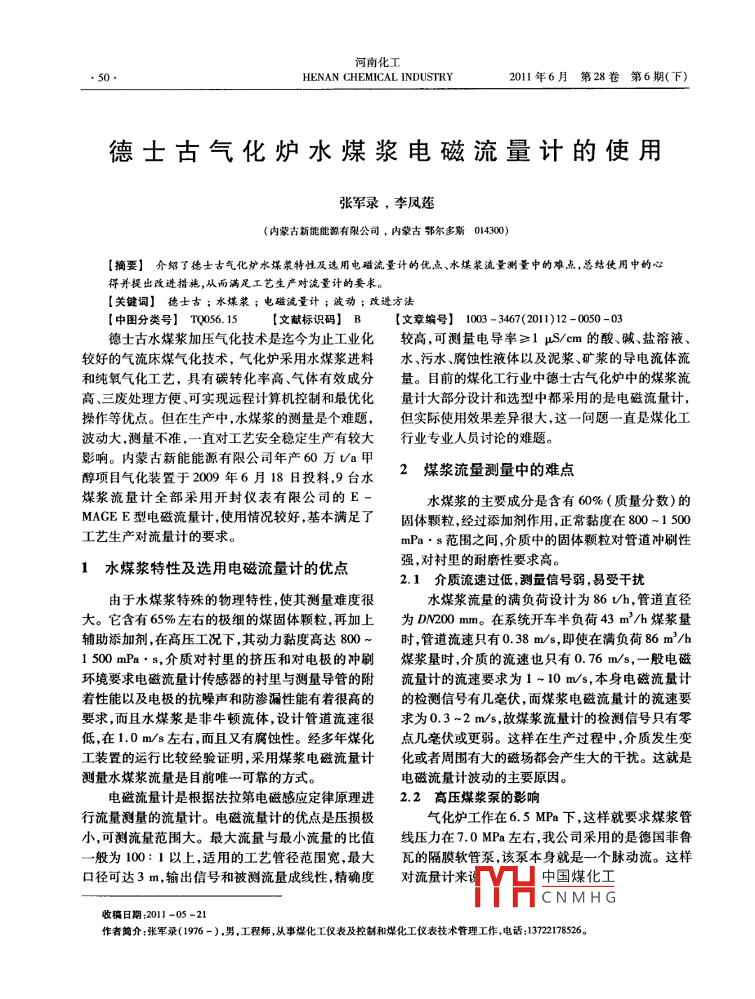 河南化工●50.HENAN CHEMICAL INDUSTRY2011年6月第28卷 第6期(下)德士古氣化爐水煤漿電磁流量計(jì)的使用張軍錄,李鳳蓮(內(nèi)蒙古新能能源有限公司,內(nèi)蒙古鄂爾多斯014300)[摘要]介紹了 德士古氣化爐水煤漿特性及選用電磁流量計(jì)的優(yōu)點(diǎn)、水煤漿流量測(cè)量中的難點(diǎn),總結(jié)使用中的心.得并提出改進(jìn)措施,從而滿(mǎn)足工藝生產(chǎn)對(duì)流量計(jì)的要求。[關(guān)鍵詞]德士古;水煤漿;電磁流量計(jì);波動(dòng);改進(jìn)方法[中圖分類(lèi)號(hào)] TQ056. 15[文獻(xiàn)標(biāo)識(shí)碼] B[文章編號(hào)] 1003 - 3467(2011)12 -0050 -03德士古水煤漿加壓氣化技術(shù)是迄今為止工業(yè)化較高,可測(cè)量電導(dǎo)率≥1 μS/cm的酸、堿、鹽溶液、較好的氣流床煤氣化技術(shù),氣化爐采用水煤漿進(jìn)料水、污水腐蝕性液體以及泥漿、礦漿的導(dǎo)電流體流和純氧氣化工藝,具有碳轉(zhuǎn)化率高、氣體有效成分量。目前的煤化工行業(yè)中德士古氣化爐中的煤漿流高、三廢處理方便、可實(shí)現(xiàn)遠(yuǎn)程計(jì)算機(jī)控制和最優(yōu)化量計(jì)大部分設(shè)計(jì)和選型中都采用的是電磁流量計(jì),操作等優(yōu)點(diǎn)。但在生產(chǎn)中,水煤漿的測(cè)量是個(gè)難題,但實(shí)際使用效果差異很大,這- -問(wèn)題一直是煤化工波動(dòng)大,測(cè)量不準(zhǔn),一直對(duì)工藝安全穩(wěn)定生產(chǎn)有較大行業(yè)專(zhuān)業(yè)人員討論的難題。影響。內(nèi)蒙古新能能源有限公司年產(chǎn)60萬(wàn)Va甲2煤漿流量測(cè)量中 的難點(diǎn)醇項(xiàng)目氣化裝置于2009年6月18日投料,9臺(tái)水煤漿流量計(jì)全部采用開(kāi)封儀表有限公司的E -水煤漿的主要成分是含有60% (質(zhì)量分?jǐn)?shù))的MAGE E型電磁流量計(jì),使用情況較好,基本滿(mǎn)足了固體顆粒,經(jīng)過(guò)添加劑作用,正常黏度在800~1500工藝生產(chǎn)對(duì)流量計(jì)的要求。mPa.s范圍之間,介質(zhì)中的固體顆粒對(duì)管道沖刷性1水煤漿特性及選用電磁流量計(jì)的優(yōu)點(diǎn)強(qiáng),對(duì)襯里的耐磨性要求高。2.1介質(zhì)流速過(guò)低,測(cè)量信號(hào)弱,易受干擾由于水煤漿特殊的物理特性,使其測(cè)量難度很水煤漿流量的滿(mǎn)負(fù)荷設(shè)計(jì)為86 Vh,管道直徑大。它含有65%左右的極細(xì)的煤固體顆粒,再加上為DN200 mm。在系統(tǒng)開(kāi)車(chē)半負(fù)荷43 m'/h煤漿量輔助添加劑,在高壓工況下,其動(dòng)力黏度高達(dá)800~時(shí),管道流速只有0.38 m/s,即使在滿(mǎn)負(fù)荷86 m'/h1500mPa.s,介質(zhì)對(duì)襯里的擠壓和對(duì)電極的沖刷煤漿量時(shí),介質(zhì)的流速也只有0. 76 m/s,-般電磁環(huán)境要求電磁流量計(jì)傳感器的襯里與測(cè)量導(dǎo)管的附流量計(jì)的流速要求為1 ~ 10 m/s,本身電磁流量計(jì)著性能以及電極的抗噪聲和防滲漏性能有著很高的的檢測(cè)信號(hào)有幾毫伏,而煤漿電磁流量計(jì)的流速要要求,而且水煤漿是非牛頓流體,設(shè)計(jì)管道流速很求為0.3 ~2 m/s,故煤漿流量計(jì)的檢測(cè)信號(hào)只有零低,在1.0 m/s左右,而且又有腐蝕性。經(jīng)多年煤化點(diǎn)幾毫伏或更弱。這樣在生產(chǎn)過(guò)程中,介質(zhì)發(fā)生變工裝置的運(yùn)行比較經(jīng)驗(yàn)證明,采用煤漿電磁流量計(jì)化或者周?chē)写蟮拇艌?chǎng)都會(huì)產(chǎn)生大的干擾。這就是測(cè)量水煤漿流量是目前唯一可靠的方式。電磁流量計(jì)波動(dòng)的主要原因。電磁流量計(jì)是根據(jù)法拉第電磁感應(yīng)定律原理進(jìn)2.2高壓煤漿泵的影響行流量測(cè)量的流量計(jì)。電磁流量計(jì)的優(yōu)點(diǎn)是壓損極氣化爐工作在6.5 MPa下,這樣就要求煤漿管小,可測(cè)流量范圍大。最大流量與最小流量的比值線(xiàn)壓力在7.0 MPa左右,我公司采用的是德國(guó)菲魯--般為100:1以上,適用的工藝管徑范圍寬,最大瓦的隔膜軟管泵,該泵本身就是-一個(gè)脈動(dòng)流。這樣口徑可達(dá)3m,輸出信號(hào)和被測(cè)流量成線(xiàn)性,精確度對(duì)流量計(jì)來(lái)中國(guó)煤化工YHCNMHG收稿日期:2011 -05 -21作者簡(jiǎn)介:張軍錄(1976 -) ,男,工程師,從事煤化工儀表及控制和煤化工儀表技術(shù)管理工作,電話(huà):13722178526.河南化工2011年6月第28卷 第6期(下)HENAN CHEMICAL INDUSTRY.51.水煤漿中成分不穩(wěn)定,特別是鐵屑含量的變化途徑:煤經(jīng)過(guò)輸送皮帶送人氣化煤倉(cāng),煤稱(chēng)重給料機(jī)對(duì)電磁流量計(jì)的干擾非常大。如若煤漿中的鐵屑含進(jìn)行計(jì)量,和水、添加劑進(jìn)行一定配比后研磨,生成量較高,電磁流量計(jì)在工作時(shí)其傳感器測(cè)量腔內(nèi)產(chǎn)的水煤漿流人磨機(jī)出料槽通過(guò)小煤漿泵送人大煤漿生的磁場(chǎng)會(huì)使金屬顆粒磁化,促使煤漿內(nèi)的金屬顆槽待用,在開(kāi)車(chē)時(shí)通過(guò)高壓煤漿泵送入氣化爐。產(chǎn)粒吸附在測(cè)量電極附近,對(duì)電極形成極化電壓,會(huì)加生鐵屑的主要途徑有煤礦采煤時(shí)產(chǎn)生的磁性金屬、大電磁流量計(jì)的測(cè)量精度并造成增大波動(dòng)量。磨煤機(jī)磨煤時(shí)鋼棒脫落產(chǎn)生的鐵屑、煤漿槽產(chǎn)生的鐵銹及煤漿輸送管線(xiàn)產(chǎn)生的鐵銹,鐵質(zhì)物體在通過(guò)3使用中的經(jīng) 驗(yàn)及改進(jìn)措施流