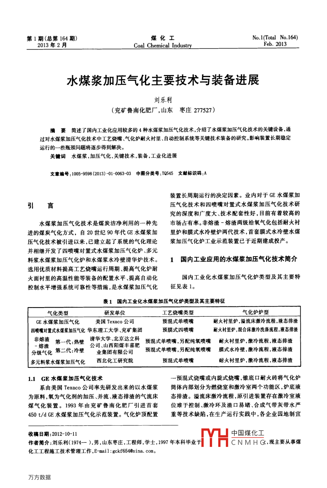第1期(總第164期)煤化工No. 1(Total No 164)2013年2月Coal Chemical IndustryFeb. 2013水煤漿加壓氣化主要技術與裝備進展劉樂利(兗礦魯南化肥廠,山東棗莊277527)摘要簡述了國內工業(yè)化應用較多的4種水煤漿加壓氣化技術,介紹了水煤漿加壓氣化技術的關鍵設備,通過對水煤漿加壓氣化技術中工藝燒嘴、氣化爐耐火襯里、自動控制系統(tǒng)等關鍵技術裝備的研究,影響裝置長期穩(wěn)定運行的一些瓶頸問題將逐步得到解決。關鍵詞水煤漿,加壓氣化,關鍵技術,裝備,工業(yè)化進展文章編號:1005-9598(2013)-010063-03中圖分類號:545文獻標識碼:A裝置長周期運行的決定因素。業(yè)內對于GE水煤漿加引言壓氣化技術和四噴嘴對置式水煤漿加壓氣化技術研究的深度和廣度大、技術配套性好,目前有著較高的水煤漿加壓氣化技術是煤炭潔凈利用的一種先市場占有率。非熔渣-熔渣兩級給氧氣化包括耐火襯進的煤炭氣化方式,自20世紀90年代E水煤漿加里爐和膜式水冷壁爐兩代技術,首套膜式水冷壁水煤壓氣化技術被引進以來,已建立起了系統(tǒng)的氣化理論漿加壓氣化爐工業(yè)示范裝置已于近期建成投產。并相繼開發(fā)了四噴嘴對置式水煤漿加壓氣化爐、多元料漿水煤漿加壓氣化爐和水煤漿水冷壁清華爐技術。1國內工業(yè)應用的水煤漿加壓氣化技術簡介選用優(yōu)質材料提高工藝燒嘴運行周期、提高氣化爐耐火面襯里的高溫性能等裝備的配置水平、提高自動化國內工業(yè)化水煤漿加壓氣化爐類型及其主要特控制水平增強系統(tǒng)可靠性等措施是水煤漿加壓氣化征見表1。褒1國內工業(yè)化水煤漿加壓氣化爐類型及其主要特征氣化類型研發(fā)單位工藝燒嘴類型氣化爐爐型GE水煤漿加壓氣化美國 Texaco公司預混式單噴嘴耐火襯里爐溢流床激冷流程,液態(tài)排渣四噴嘴對置式水煤漿加壓氣化華東理工大學、兗礦集團預膜式四噴嘴耐火襯里爐,混合床激冷洗滌流程液態(tài)排渣非熔渣第一代:熱壁清華大學、北京達立科預混式單噴嘴,另配純氧噴嘴耐火襯里爐激冷流程液態(tài)排渣熔渣公司、山西陽煤豐喜肥分級氣化第二代:冷壁業(yè)集團有限公司預混式單噴嘴另配純氧噴嘴膜式水冷壁激冷流程液態(tài)排渣多元料漿水煤漿加壓氣化西北化工研究院預混式單噴嘴耐火襯里爐,激冷流程,液態(tài)排渣1.1GE水煤漿加壓氣化技術預混式燒嘴或內旋式燒嘴,錐底口耐火磚將氣化爐系由美國 Texaco公司率先研發(fā)出來的以水煤漿筒體內部劃分為燃燒室和激冷室兩個功能區(qū),爐底液為原料氧為氣化劑的加壓、并流、液態(tài)排渣的氣流床態(tài)排渣。溢流床激冷流程,原引進裝置存在激冷室液煤氣化裝置。1993年由兗礦魯南化肥廠引進首套位難于控制、激冷環(huán)及渣口易堵、合成氣帶灰?guī)畤?50t/dGE水煤漿加壓氣化示范裝置。氣化爐頂配置重等技術缺陷,在生產運行實踐中,各企業(yè)因地制宜收稿日期:2012-10-11作者簡介:劉樂利(1974—),男,山東棗莊,工程師,學士,1997年本科畢業(yè)LH中國煤化工CNMH,現主要從事煤化工工程施工技術管理工作,E-mail:gckf654sina.com。煤化工2013年第1期地進行了技改,上述問題已經基本得到解決。因在線料的混合及氣化反應,與同體積單噴嘴的氣化爐相氣化工藝燒嘴僅為1只,在單爐產氣量方面,受高壓比,可提高產氣能力。該技術主要創(chuàng)新點是:氧氣分級煤漿輸送系統(tǒng)裝備大型化后制造水平、燒嘴放大后耐供給,使氣化爐一段燒嘴的氧氣量可脫離爐內部分氧用性能以及生產機動性、負荷調整彈性等方面因素的化反應所需的碳與氧的化學當量比約束,使爐內溫度影響,大幅增加單爐投煤量的技術和裝備難度比較更加均勻,平均溫度提高,有利于煤的氣化;由于氧的大。國外E爐單爐最大投煤量已經達到2000t/d,分級供給,為主燒嘴降低氧碳比創(chuàng)造了條件,降低主國內為1000t/d。受國內自主水煤漿加壓氣化技術燒嘴附近的溫度,延長燒嘴使用壽命。該爐采用獨特的影響,國家已經不再鼓勵引進該技術。的組合燒嘴,使系統(tǒng)的點火與投料程序一體化。非熔12四噴嘴對置式水煤漿加壓氣化技術渣段和熔渣段的溫度控制是關鍵,通過氧氣的分級加爐頂配置有1臺開工燒嘴(烘爐完成后,在投料人,改善了氣化爐燒嘴運行環(huán)境,使氣化爐內軸向溫前拆除爐口用耐火堵頭封閉),在拱頂和筒體結合部度分布比較合理。第一代耐火襯里爐和第二代膜式水下方,水平均布4支工藝燒嘴,形成撞擊流場。采用噴冷壁爐分別于2006年和2011年在山西陽煤豐喜肥淋床與鼓泡床相結合的復合床型的洗滌冷卻室(激冷業(yè)(集團)有限責任公司建成了500t/d和750t/d的室),也是該氣化技術不同于GE氣化技術的一個重要工業(yè)示范裝置,其工業(yè)化進程有了一個較好的開始。的部分,它克服了GE技術在這個部位存在的缺點。洗14多元料漿水煤漿加壓氣化技術滌冷卻室合成氣出口的折流擋板,加大了合成氣出口氣化爐爐頂配置1只預混式噴嘴,在水煤漿中加過流面積,降低了合成氣出口的阻力;設有旋風分離人一定的油,以減少水煤漿中水分,增加了人爐料漿器,有效減少了合成氣帶水、帶灰情況的發(fā)生。在引進有效反應物的濃度。水煤漿加壓氣化屬多元料漿的特的GE爐原設計中,洗滌冷卻室渣口端安裝有動力除定形式2。該技術對油制氣改煤制氣的原料結構調整渣器,因運行效果不好
