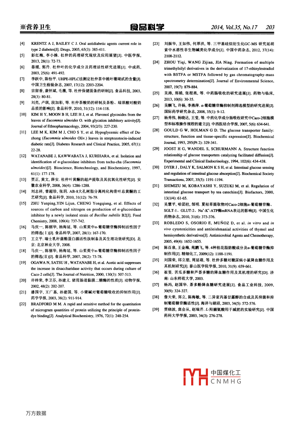 ※營養(yǎng)衛(wèi)生品科獸2014,Vl.35,N.17197杜仲葉乙醇提取物的降糖作用機理張紅霞,楊丹丹,王鳳,李伊嬌,范俊峰*(北京林業(yè)大學生物科學與技術(shù)學院,北京100083)摘要:為了闡明杜仲葉的降血糖功效及其機制,采用酶抑制劑模型,篩選高抑制率的杜仲葉乙醇提取物并判斷其對α-葡萄糖苷酶的抑制類型;借助Caco-2人結(jié)腸腺癌細胞模型,研究杜仲葉20%乙醇解吸物對α-葡萄糖苷酶活性及葡萄糖轉(zhuǎn)運蛋白的影響;氣相色譜質(zhì)譜聯(lián)用分析杜仲葉20%乙醇解吸物主要成分。杜仲葉20%乙醇解吸物可競爭性地抑制a葡萄糖苷酶,其抑制常數(shù)K值為3290mg/mL。它對Caco-2細胞中的a葡萄糖苷酶有較強抑制作用,其Cs為0.57mg/mL,且對Caco2細胞攝取葡萄糖也有一定抑制作用,1mg/mL時抑制率可達2625%。氣相色譜質(zhì)譜分析表明杜仲葉20%乙醇解吸物主要有DL異檸檬酸內(nèi)酯、百里酚、兒茶素、2.6-二羥基苯甲酸和3,4羥基-苯丙烯酸等。這些結(jié)果表明,杜仲葉乙醇提取物可以通過抑制a-葡萄糖苷酶活性,降低葡萄糖吸收來實現(xiàn)降血糖的效果。關(guān)鍵詞:杜仲葉;Cao-2細胞;a-葡萄糖苷酶;降血糖;葡萄糖轉(zhuǎn)運;兒茶素Ethanol Extract of Eucommia ulmoides Leaves Inhibits Alpha-Glucosidase in Caco-2 CellsZHANG Hong-xia, YANG Dan-dan, WANG Feng, LI Yi-jiao, FAN Jun-fengCollege of Biological Sciences and Technology, Beijing Forestry University, Beijing 100083, China)Abstract: The inhibitory effects of 40% ethanol extract of Eucommia ulmoides leaves on alpha-glucosidase and glucosetransport were investigated in Caco-2 cells in vitro to elucidate the anti-hyperglycemic mechanism of Eucommia ulmoidesleaves. The alpha-glucosidase inhibitors in the ethanol extract were also identified by GC-MS analysis. The kinetic studyshowed that the 20% ethanol elution fraction(EEB) from macroporous resin AB-8 of the ethanol extract of Eucommiaulmoides leaves could competitively inhibit alpha-glucosidase with a k, value of 32.90 me/mL, indicating that alphaglucosidase has a strong affinity with the extract. Meanwhile, the inhibition was found to be reinforced as the concentrationof EEB increased. For investigation of the inhibitory effect of EEB in Caco-2 cells, cytotoxicity assays were firstly conductedby using different concentrations of EEB (0.05, 0.10, 0.20, 0.50 and 1.00 mg/mL) to determine the safety level at which cellgrowth and viability could not be affected. All tested concentrations of eeB had no effect on the growth or viability of Caco-2cells. Subsequently, EEB at various concentration exhibited effective suppression on alpha-glucosidase by using maltose(28 mmol/L)as the substrate in Caco-2 cells in a concentration-dependent manner with an ICso of 0.57 mg/mL. Furthermore,EEB could also attenuate glucose transport in Caco-2 cells, which could be decreased to 26. 25% by EEB(l mg/mL).Theseresults indicate that EEB exerts strong anti-hyperglycemic effect by suppressing disaccharidase and glucose transportorsGC-MS analysis was conducted to elucidate the composition of the ethanol extract of Eucommia ulmoides leaves. It wasfound that acids, monosaccharides, polyphenols, esters, amino acids were the main components of EEB. Further analysis byGC-MS revealed that the ethanol extract was rich in DL-isocitric acid lactone, thymol, catechin, 2, 6-dihydroxybenzoic acidand 3, 4-dihydroxy cinnamic acid. These compounds may play important roles in the hypoglycemic effect of the extract. Thepresent study suggests Eucommia ulmoides leaves are a medicinal food material for preventing and treating diabetes, andcould be further developed into healthful productsKey words: Eucommia ulmoides leaves; Caco-2 cells; a-glucosidase; hypoglycemic; glucose transport; catechin中圖分類號:TS2521文獻標志碼:A文章編號:1002-6630(2014)170197-07doi:10.7506spkx1002-6630201417038收稿日期:2013-11-03V凵中國煤化工基金項目:國家自然科學基金面上項目(J03516)CNMHG作者簡介:張紅霞(1988-),女,碩士研究生,研究方向為功能性食品。E-mail:Luludeero305@)sina.cn*通信作者:范俊峰(1970—),男,副教授,博士,研究方向為植源性多肽和黃酮的抗血栓、抗糖尿病功能。E-mail: fanjunfeng@ bjfu. edu. cr1982014,Vl.35,N.17自品科字※營養(yǎng)衛(wèi)生糖尿病已被列為繼心腦血管疾病、腫瘤之后的第三細胞北京協(xié)和醫(yī)院;MEM培養(yǎng)基、胎牛血清美國大致死性疾病。碳水化合物在人體內(nèi)必須經(jīng)由α葡萄 Gibco公司;96孔培養(yǎng)板、24孔培養(yǎng)板、細胞培養(yǎng)瓶、糖苷酶水解其α-1,4糖苷鍵,生成葡萄糖、果糖、半乳糖磷酸鹽緩沖液( phosphate buffered saline,PBs)、胰蛋后才能被小腸吸收。因此通過抑制a葡萄糖苷酶活性,白酶美國 Hy Clone公司;阿卡波糖拜耳醫(yī)藥保健可延遲或阻礙多糖在消化道內(nèi)水解,以降低人體血糖濃有限公司;麥芽糖(分析純)北京化工廠:葡萄糖試度,可有效防治糖尿病。a葡萄糖苷酶抑制劑,己第劑盒上海超研試劑有限公司:NO雙(三甲基硅烷3次被亞太地區(qū)糖尿病治療藥物指南推薦為降餐后血糖的基)三氟乙酰胺(MObs( trimethylsily) trifluoroacetamide,線藥物。a-葡萄糖苷酶抑制劑越來越成為近年來藥物 BSTFA)、三甲基氯硅烷( trimethylchlorosilane,TMCS)化學的研究熱點。上海安普儀器試劑公司。杜仲( Eucommia ulmoides Oliver)是藥理性質(zhì)很強的中藥材,杜仲有降血壓、提高免疫力、抗衰老、補1.2儀器與設備腎、強筋健骨等作用6。同時,杜仲也是中國傳統(tǒng)的藥LL-1500真空冷凍干燥機賽默飛世爾科技有限公食同用的保健食品,以杜仲鮮葉為原料炮制而成的杜仲司; GC/MS-QP2010A氣質(zhì)聯(lián)用儀日本島津公司