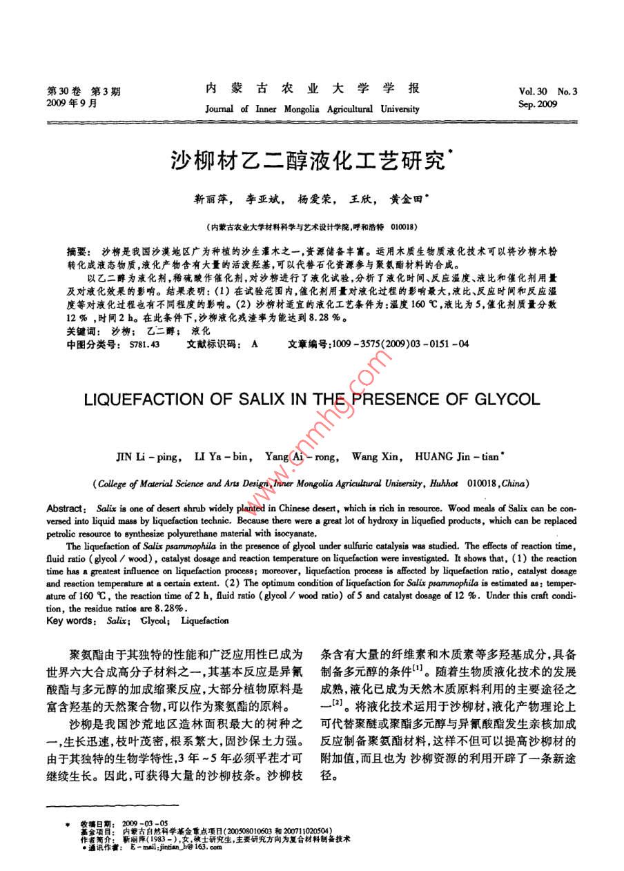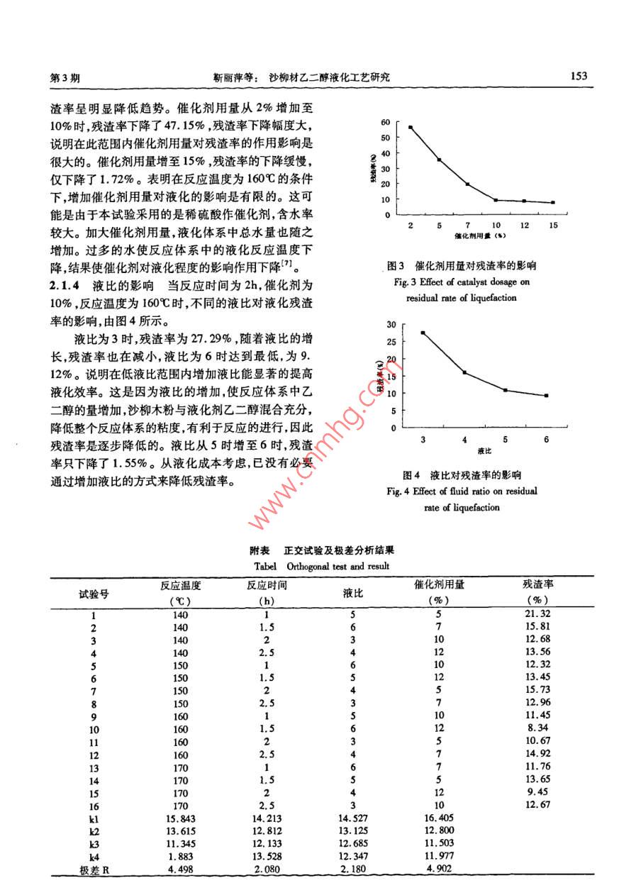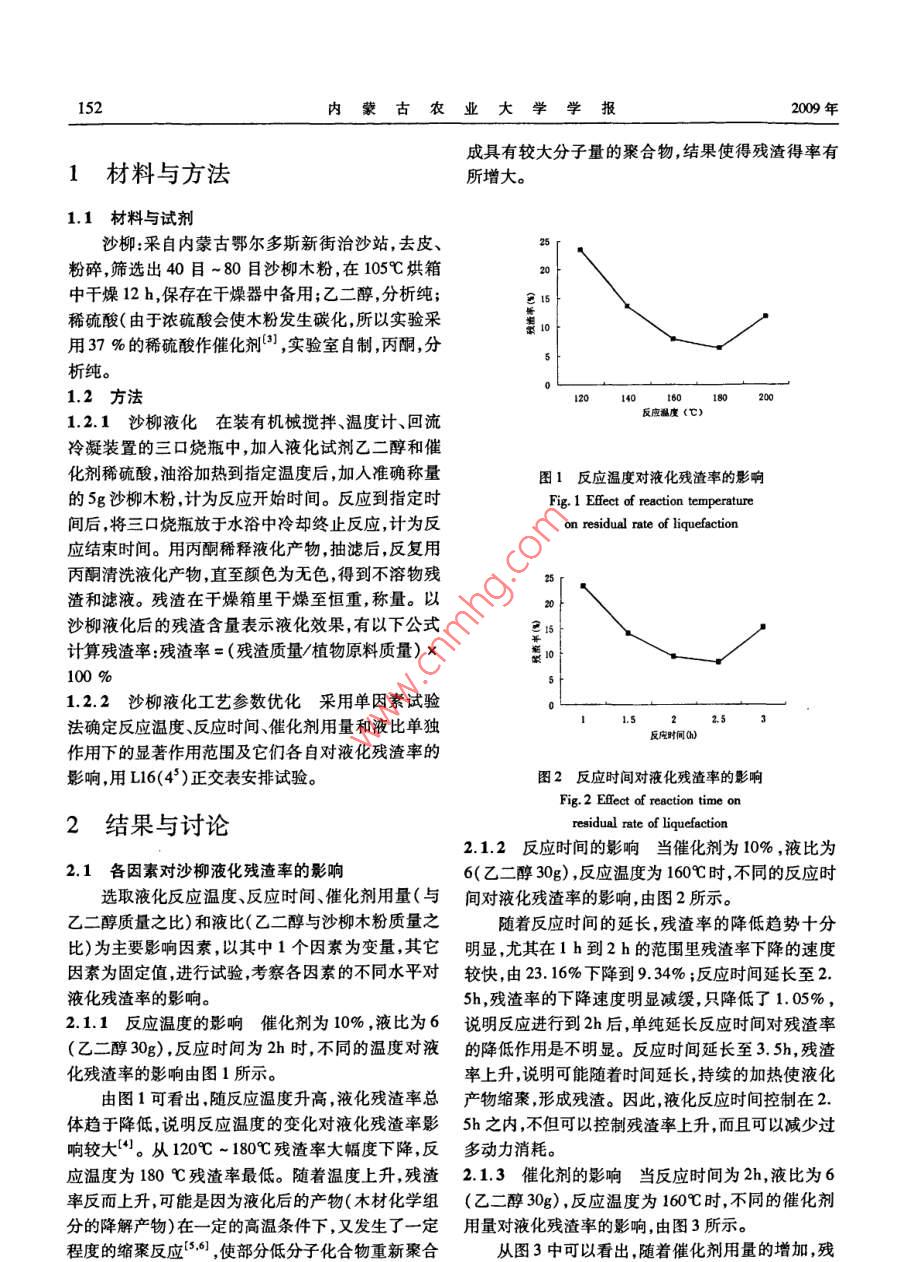 第30卷第3期內(nèi)蒙古農(nóng)業(yè)大學學報2009年9月Joumal of Inner Mongolia Agricultural Universitysep.2009沙柳材乙二醇液化工藝研究靳麗萍,李亞斌,楊愛榮,王欣,黃金田(內(nèi)蒙古農(nóng)業(yè)大學材料科學與藝術(shù)設(shè)計學院呼和活特010018)摘要:沙柳是我國沙漢地區(qū)廣為種植的沙生灌木之一,資源儲備豐富。運用木質(zhì)生物質(zhì)液化技術(shù)可以將沙柳木粉轉(zhuǎn)化成液態(tài)物質(zhì),液化產(chǎn)物含有大量的活潑羥基,可以代替石化資源參與聚氨酯材料的合成。以乙二醇為液化劑,稀硫酸作催化劑,對沙柳進行了液化試驗,分析了液化時間、反應(yīng)溫度、液比和催化劑用量及對液化效果的影響。結(jié)果表明:(1)在試驗范圍內(nèi),催化劑用量對液化過程的影嘲最大,液比、反應(yīng)時間和反應(yīng)溫度等對液化過程也有不同程度的影響。(2)沙柳材適宜的液化工藝條件為:溫度160℃,液比為5,催化劑質(zhì)量分數(shù)12%,時間2h。在此條件下,沙柳液化殘渣率為能達到8.28%。關(guān)鍵詞:沙柳;乙二醇;液化中圖分類號:S78143文獻標識碼:A文章編號:1009-3575(2009)03-0151-04LIQUEFACTION OF SALIX IN THE PRESENCE OF GLYCOLJIN Li-ping, LI Ya-bin, Yang Ai-rong, Wang Xin, HUANG Jin-tianCollege of Material Science and Arts Design, Inner Mongolia Agricultral University, Huhhot 010018, ChinaAbstract: Salix is one of desert shrub widely planted in Chinese desert, which is rich in resource. Wood meals of Salix can be con-versed into liquid mass by liquefaction technic. Because there were a great lot of hydroxy in liquefied products, which can be replacedpetrolic resource to synthesize polyurethane material with isocyanate.The liquefaction of Salir psammophila in the presence of glycol under sulfuric catalysis was studied. The effects of reaction timefluid ratio(glycol/wood ), catalyst dosage and reaction temperature on liquefaction were investigated. It shows that, (1)the reactiontime has a greatest influence on liquefaction process; moreover, liquefaction process is affected by liquefaction ratio, catalyst dosageand reaction temperature at a certain extent. (2)The optimum condition of liquefaction for Sali psammophila is estimated as: temper-ature of 160C, the reaction time of 2 h, fluid ratio(glycol/ wood ratio )of 5 and catalyst dosage of 12 % Under this craft condi-tion, the residue ratios are 8. 28%oKey words: Salix: Glycol; Liquefaction聚氨酯由于其獨特的性能和廣泛應(yīng)用性已成為條含有大量的纖維素和木質(zhì)素等多羥基成分,具備世界六大合成高分子材料之一,其基本反應(yīng)是異氰制備多元醇的條件。隨著生物質(zhì)液化技術(shù)的發(fā)展酸酯與多元醇的加成縮聚反應(yīng),大部分植物原料是成熟,液化已成為天然木質(zhì)原料利用的主要途徑之富含羥基的天然聚合物,可以作為聚氨酯的原料。將液化技術(shù)運用于沙柳材,液化產(chǎn)物理論上沙柳是我國沙荒地區(qū)造林面積最大的樹種之可代替聚醚或聚酯多元醇與異氰酸酯發(fā)生親核加成生長迅速,枝葉茂密,根系繁大,固沙保土力強。反應(yīng)制備聚氨酯材料,這樣不但可以提高沙柳材的由于其獨特的生物學特性3年~5年必須平茬才可附加值,而且也為沙柳資源的利用開辟了一條新途繼續(xù)生長。因此,可獲得大量的沙柳枝條。沙柳枝徑。然科學基金重點項目(2008010603和20011020504)生,主要研究方向為復合材料制備技術(shù)nail jintian he152內(nèi)蒙古農(nóng)業(yè)大學學報2009年成具有較大分子量的聚合物,結(jié)果使得殘渣得率有1材料與方法所增大。1.1材料與試劑沙柳:采自內(nèi)蒙古鄂爾多斯新街治沙站,去皮、粉碎,篩選出40目~80目沙柳木粉,在105℃烘箱中干燥12h保存在干燥器中備用;乙二醇,分析純;稀硫酸(由于濃硫酸會使木粉發(fā)生碳化,所以實驗采5050用37%的稀硫酸作催化劑,實驗室自制,丙酮,分析純。1.2方法1.2.1沙柳液化在裝有機械攪拌、溫度計、回流反應(yīng)溫度《℃冷凝裝置的三口燒瓶中,加入液化試劑乙二醇和催化劑稀硫酸,油浴加熱到指定溫度后,加入準確稱量圖1反應(yīng)溫度對液化殘渣率的影響的5g沙柳木粉計為反應(yīng)開始時間。反應(yīng)到指定時Fig. 1 Effect of reaction temperature間后,將三口燒瓶放于水浴中冷卻終止反應(yīng),計為反sidual rate of liquefaction應(yīng)結(jié)束時間。用丙酮稀釋液化產(chǎn)物,抽濾后,反復用丙酮清洗液化產(chǎn)物,直至顏色為無色,得到不溶物殘渣和濾液。殘渣在干燥箱里干燥至恒重,稱量。以沙柳液化后的殘渣含量表示液化效果,有以下公式計算殘渣率:殘渣率=(殘渣質(zhì)量/植物原料質(zhì)量)100%1.2.2沙柳液化工藝參數(shù)優(yōu)化采用單因素試驗法確定反應(yīng)溫度、反應(yīng)時間、催化劑用量和液比單獨反應(yīng)時間作用下的顯著作用范圍及它們各自對液化殘渣率的影響,用L16(4)正交表安排試驗。圖2反應(yīng)時間對液化殘渣率的影響2結(jié)果與討論2.1.2反應(yīng)時間的影響當催化劑為10%,液比為2.1各因素對沙柳液化殘渣率的影響6(乙二醇30g),反應(yīng)溫度為160℃時,不同的反應(yīng)時選取液化反應(yīng)溫度、反應(yīng)時間催化劑用量(與間對液化殘渣率的影響,由圖2所示。乙二醇質(zhì)量之比)和液比(乙二醇與沙柳木粉質(zhì)量之隨著反應(yīng)時間的延長,殘渣率的降低趨勢十分比)為主要影響因素,以其中1個因素為變量,其它明顯,尤其在1h到2h的范圍里殘渣率下降的速度因素為固定值進行試驗考察各因