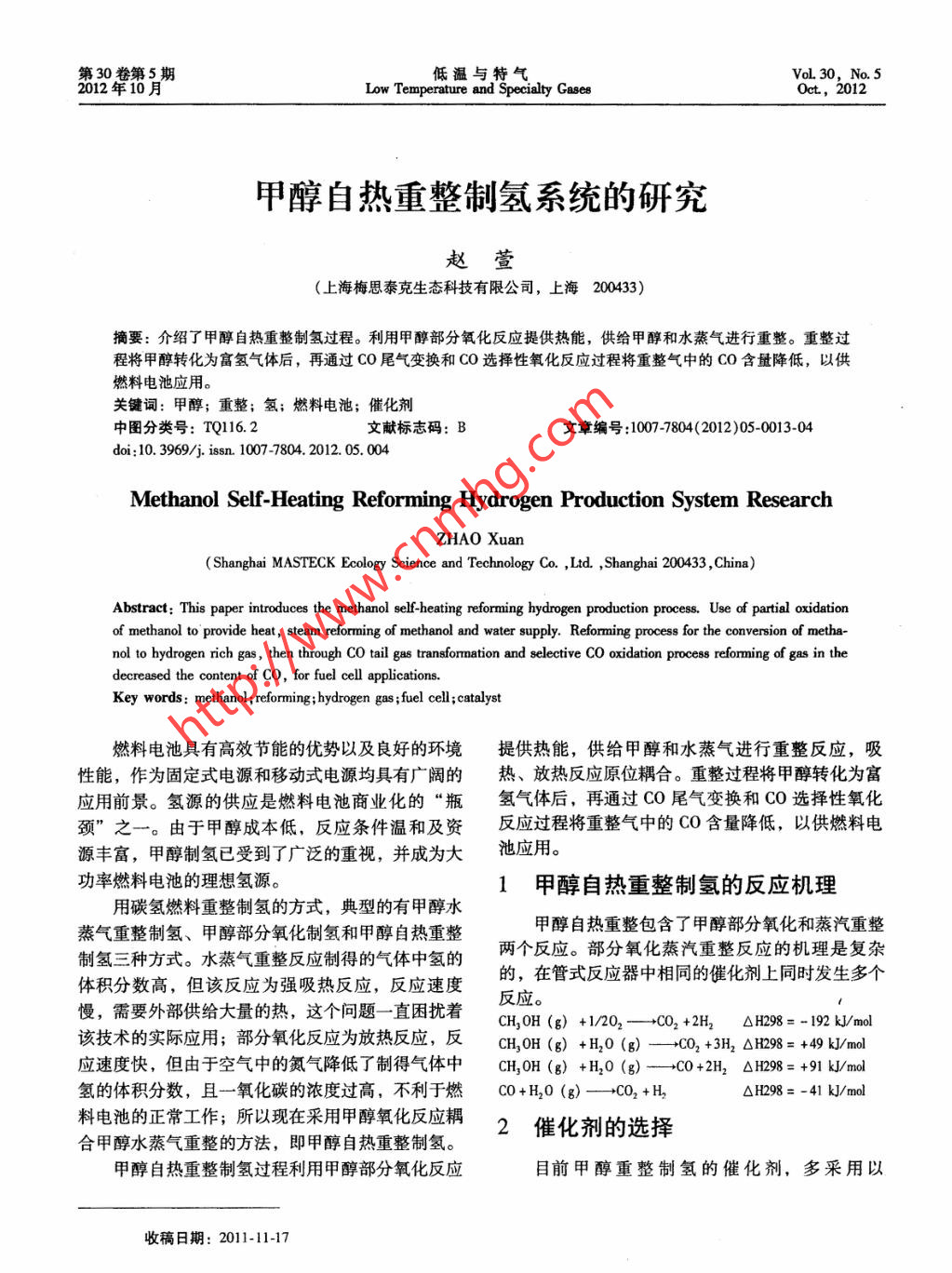 第30卷第5期低溫與特氣VoL.30,No.52012年10月Low Temperature and Specialty GasesOct, 2012甲醇自熱重整制氫系統(tǒng)的研究趙萱(.上海梅思泰克生態(tài)科技有限公司,上海200433)摘要:介紹了甲醇自熱重整制氫過程。利用甲醇部分氧化反應(yīng)提供熱能,供給甲醇和水蒸氣進行重整。重整過程將甲醇轉(zhuǎn)化為富氫氣體后,再通過CO尾氣變換和CO選擇性氧化反應(yīng)過程將重整氣中的CO含量降低,以供燃料電池應(yīng)用。關(guān)鍵詞:甲醇;重整;氫;燃料電池;催化劑中圖分類號: TQ116.2文獻標志碼: B文章編號:1007-7804(2012)05-0013-04doi: 10.3969/j. issn. 1007-7804. 2012. 05. 004Methanol Self-Heating Reforming Hydrogen Production System ResearchZHAO Xuan(Shanghai MASTECK Ecology Science and Technology Co. ,Ltd. ,Shanghai 200433 ,China)Abstract; This paper introduces the methanol self-heating reforming hydrogen production process. Use of partial oxidationof methanol to provide heat, steam reforming of methanol and water supply. Reforming process for the conversion of metha-nol to hydrogen rich gas, then through CO tail gas transformnation and selective CO oxidation process reforming of gas in thedecreased the content of CO, for fuel cell applications.Key words: methanol; reforming; hydrogen gas ;fuel cell ;catalyst燃料電池具有高效節(jié)能的優(yōu)勢以及良好的環(huán)境提供熱能,供給甲醇和水蒸氣進行重整反應(yīng),吸性能,作為固定式電源和移動式電源均具有廣闊的熱、放熱反應(yīng)原位耦合。重整過程將甲醇轉(zhuǎn)化為富應(yīng)用前景。氫源的供應(yīng)是燃料電池商業(yè)化的“瓶氫氣體后, 再通過CO尾氣變換和CO選擇性氧化頸”之一。由于甲醇成本低,反應(yīng)條件溫和及資反應(yīng)過程將重整氣中的CO含量降低,以供燃料電源豐富,甲醇制氫已受到了廣泛的重視,并成為大池應(yīng)用。功率燃料電池的理想氫源。1甲醇自熱重整制氫的反應(yīng)機理用碳氫燃料重整制氫的方式,典型的有甲醇水蒸氣重整制氫、甲醇部分氧化制氫和甲醇自熱重整甲醇自熱重整包含了甲醇部分氧化和蒸汽重整制氫三種方式。水蒸氣重整反應(yīng)制得的氣體中氫的兩個反應(yīng)。部分氧化蒸汽重整反應(yīng)的機理是復(fù)雜體積分數(shù)高,但該反應(yīng)為強吸熱反應(yīng),反應(yīng)速度的,在管式反應(yīng)器中相同的催化劑上同時發(fā)生多個慢,需要外部供給大量的熱,這個問題- - 直困擾著反應(yīng)。CH,0H (g) +1/202- +CO2 +2H2△H298 = - 192 kJ/mol該技術(shù)的實際應(yīng)用;部分氧化反應(yīng)為放熱反應(yīng),反CH,0H (g) +H20 (g)一→CO2 +3H2 OH298 = +49 kJ/mol應(yīng)速度快,但由于空氣中的氮氣降低了制得氣體中CH,0H (g) +H20 (g) - +C0+2H2 OH298= +91 kJ/mol氫的體積分數(shù),且一氧化碳的濃度過高,不利于燃CO+H20 (g)-→CO2 +H, .OH298 = -41 kJ/mol料電池的正常工作;所以現(xiàn)在采用甲醇氧化反應(yīng)耦2催 化劑的選擇合甲醇水蒸氣重整的方法,即甲醇自熱重整制氫。甲醇自熱重整制氫過程利用甲醇部分氧化反應(yīng)目前甲醇重整制氫的催化劑,多采用以.收稿日期: 2011-11-17第5期趙萱:甲醇自熱重整制氫系統(tǒng)的研究15溶液和空氣流量至設(shè)計值-畔,進行重整反應(yīng);Cu/ZnO/Al2O3催化劑(CB27) ,粒徑為0. 442 ~(6)控制變換反應(yīng)入口溫度在220 C,對變0.681 mm。經(jīng)模擬表明,采用板式反應(yīng)器進行蒸換反應(yīng)催化劑進行在線還原,以變換反應(yīng)器出口產(chǎn)汽重整可以把催化劑溫度控制在-定的溫度范圍品氣中CO濃度不變?yōu)檫€原完全標志;內(nèi);此外,板式反應(yīng)器可以靈活拆卸和組裝,并通(7)變換反應(yīng)催化劑還原完全后,控制甲醇過疊加擴大產(chǎn)量。水溶液和空氣原料至4000 h ~'重整空速設(shè)定值,進5.2換熱器結(jié)構(gòu)行重整反應(yīng),同時嚴格控制重整催化劑入口溫經(jīng)過計算,確定換熱器的結(jié)構(gòu)為固定管板式換度<320 C;熱器。(8)控制選擇性氧化反應(yīng)空氣原氣設(shè)計值,(1)流程:采用殼程為單程、管程為雙程的進行選擇性氧化脫除CO,分析產(chǎn)品氣中CO濃度。結(jié)構(gòu)型式; .4.3 系統(tǒng)運行事項(2) 換熱管及其排列方式:采用無縫鋼管,(1)原料供應(yīng)是否正常(甲醇、甲醇溶液、材料為20號鋼;空氣);(3) 簡體:材料采用16MnR鋼。(2)燃燒溫度是否穩(wěn)定,當(dāng)溫度迅速下降或.6實驗結(jié)果及分析討論快速上升時,檢查原料供應(yīng)是否正常;(3)確保各反應(yīng)溫度正常,重整反應(yīng)人口溫6.1實驗結(jié)果度不超過320 C,低溫變換人口溫度不超過250實驗結(jié)果見表1。C, CO選擇性氧化反應(yīng)溫度在80~90 C;表1實驗結(jié)果(4)觀察系統(tǒng)壓力是否穩(wěn)定,避免超壓;Table 1 The experimental results(5)燃燒尾氣是否及時排空。重整催化劑體積30 mL5技術(shù)要點甲醇體積空速4000 h-12000 mL/min本系統(tǒng)的技術(shù)要點分為三大類:催化劑的制甲醇用量0. 0893 mol/ min備、系統(tǒng)工藝的設(shè)計、系統(tǒng)設(shè)備的設(shè)計。其中,系統(tǒng)設(shè)備中的反應(yīng)器和換熱器的設(shè)計是3. 6075 mL/min至關(guān)重要的,它們的結(jié)構(gòu)和性能直接對實驗結(jié)果產(chǎn)H20/CH,0H 摩爾比1.25生重要的影響。O2/CH,OH 摩爾比0.35.1反應(yīng) 器的結(jié)構(gòu)0. 11 mol/min利用碳氫化合物轉(zhuǎn)化成氫氣的重整制氫系統(tǒng)通重整原料水用量2. 0089 mL/min常由以下幾部分組成:換熱器(氣化、 傳熱等)、重整