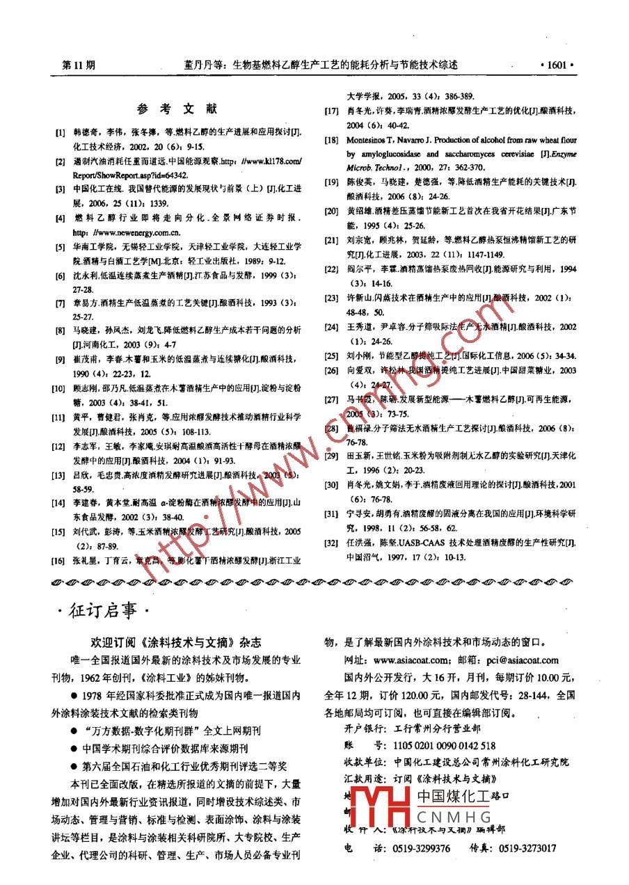 化工進展·1596·CHEMICAL INDUSTRY AND ENGINEERING PROGRESS2007年第26卷第1期生物基燃料乙醇生產(chǎn)工藝的能耗分析與節(jié)能技術綜述董丹丹1,趙黛青1,廖翠萍!,陳憲笙2,唐兆興2(中國科學院廣州能源研究所,廣東廣州510640:2廣東中科天元新能源科技有限公司,廣東廣州510640)摘要:針對如何高效、經(jīng)濟和可持續(xù)發(fā)展生物質液體燃料這一問題,考察了淀粉質原料生產(chǎn)燃料乙醇的整個流程,從原料預處理到酒精脫水,尤其針對蒸餾、蒸煮液化等耗能較大的階段,對不同的生產(chǎn)工藝技術進行了能耗比較分析了不同的節(jié)能技術。通過大量的數(shù)據(jù)分析評述了最佳的技術路線,為燃料乙醇生產(chǎn)系統(tǒng)的節(jié)能降耗提出建議。關鍵詞:燃料乙醇;能耗;淀粉質原料;生產(chǎn)工藝中圖分類號:TS2614:TS262.6;TK08文獻標識碼:A文章編號:1000-6613(207)11-1596-06Energy consumption of fuel ethanol production and review ofenergy-saving technologiesDONG Dandan, ZHAO Daiqing, LIAO Cuiping, CHEN Xiansheng, TANG Zhaoxing2Guangzhou Institute of Energy Conversion, Chinese Academy of Sciences, Guangzhou 510640, Guangdong, China;Guangdong Zhongke Tianyuan New Energy Sources Engineering Co, Ltd, Guangzhou 510640, Guangdong, China)Abstract: Fuel ethanol has become one of the most important liquid fuels because of the shortage offossil fuels. In this paper the production of starchiness-based fuel ethanol is reviewed, from thepretreatment of raw material to the dehydration of product. Different technologies are discussed andtheir energy consumptions are analyzed to find out the best technical route for the producers based onthe statistics. There are five steps to manufacture ethanol, and liquefaction and distillation are theimportant ones, as they consume more energy than others. Waste treatment is discussed based ondifferent raw materials. These results can be useful for the producersKey words fuel ethanol; energy consumption; starchiness-based material; production technology燃料乙醇可以通過谷物、薯類等發(fā)酵制得,脫將10%的燃料乙醇添加到汽油中,有助于遏制我國水后加入體積分數(shù)為5%的變性劑(一般為無鉛汽日益增長的汽油需求量,它作為一種可再生資源代油或無鉛的烴類)成為變性燃料乙醇。燃料乙醇除替石油是解決能源危機的一種行之有效的方法。燃具有替代車用燃料的功能外,還具有用作汽油辛烷料乙醇可以減少環(huán)境污染,對消化玉米、小麥陳化值改進劑和增加汽油氧含量以減少汽車尾氣中的糧,實現(xiàn)農業(yè)的可持續(xù)發(fā)展,促進養(yǎng)殖業(yè)、加工業(yè)CO、烴類污染的功能。由中國石油和化學工業(yè)協(xié)的發(fā)展,提高我國的能源安全和國際競爭力等方面會提供的數(shù)據(jù)顯示,2006年國內汽車產(chǎn)業(yè)持續(xù)快速都具有重要的戰(zhàn)略意義圍發(fā)展,推動汽油表觀消費量較快增長,全年汽油表在2006年國際生物燃料會議上,國家發(fā)改委觀消費量達到了52475萬噸,同比增長87%。中工業(yè)司表示,今后政府將按照資源、技術、環(huán)保和國石油天然氣集團公司所作的預期顯示,2007年和能耗4項扶持指標控制支持范圍和力度;國家還確2010年我國汽油需求將分別達到500萬噸和60收穩(wěn)日萬噸左右2。而我國2006年原油進口量較上年增長基金項中國煤化工08-12005B70101040,14.5%,200年進口量有可能繼續(xù)以兩位數(shù)的勢頭XCNMHG增長,原油對外依存度繼續(xù)擴大。這意味著我國將第一作者簡介董丹丹(1982-),女,碩士研究生。聯(lián)系人青,研究員,主要從事能源利用技術研發(fā)與評價工作。電話會越來越依賴于國外能源國家能源安全提上日程。870601E· mail zhaodq @msgiec accn第11期繭丹丹等:生物基燃料乙醇生產(chǎn)工藝的能耗分析與節(jié)能技術綜述·1597·定了“2007年乙醇補貼統(tǒng)一減少到1373元噸”的選的處理工藝。對各階段消耗的蒸汽、電力以及化新政策,而此前規(guī)定的2005年的補貼是1883元/學品生產(chǎn)所耗能量進行總匯,選用已產(chǎn)業(yè)化技術的噸,2006年是1628元噸。到2008年底,補貼將平均耗能值,可以得出各段的能耗消耗百分比,如再作調整。據(jù)有關專家分析,國家減少補貼的用意圖2所示。分析得知,消耗蒸汽、電力最多的階段是鼓勵相關公司降低生產(chǎn)成本,提高企業(yè)的生產(chǎn)效即是能耗最大的階段,如蒸餾、蒸煮液糖化和脫水率,在現(xiàn)有的補貼政策下實現(xiàn)最大限度的獲利4。段;相比之下,化學品、微生物等的消耗所占的能本文作者對以淀粉為原料燃料乙醇生產(chǎn)流程進行耗量較小5。了分析,對不同的工藝及技術進行了能耗比較,提原料預處理出了各生產(chǎn)階段的節(jié)能措施,用數(shù)據(jù)說明了不同技脫水20%術的節(jié)能效果,旨在為燃料乙醇企業(yè)的技術改革提蒸煮液糖化供建議1工藝流程乙醇的生產(chǎn)方法可概括為兩大類:發(fā)酵法和化酵母發(fā)醇學合成法,我國乙醇生產(chǎn)以發(fā)酵法為主。按生產(chǎn)原料的不同,發(fā)酵法又分為淀粉質原料生產(chǎn)乙醇、糖45%質原料生產(chǎn)乙醇、纖維素原料生產(chǎn)乙醇以及用工廠廢液生產(chǎn)乙醇等。糖質原料生產(chǎn)乙醇比淀粉質原料2燃料乙醇生產(chǎn)各階段能量消耗的構成簡單而直接,但酒槽的處理是其產(chǎn)業(yè)化的難點,2能耗分析和節(jié)能技術階段該原料生產(chǎn)法的研究重點和其推廣產(chǎn)業(yè)化的障在燃料乙醇生產(chǎn)流程