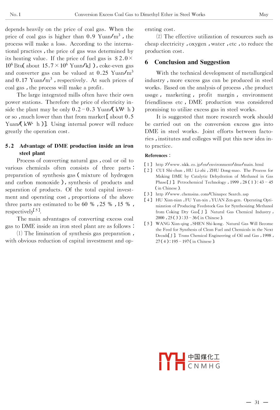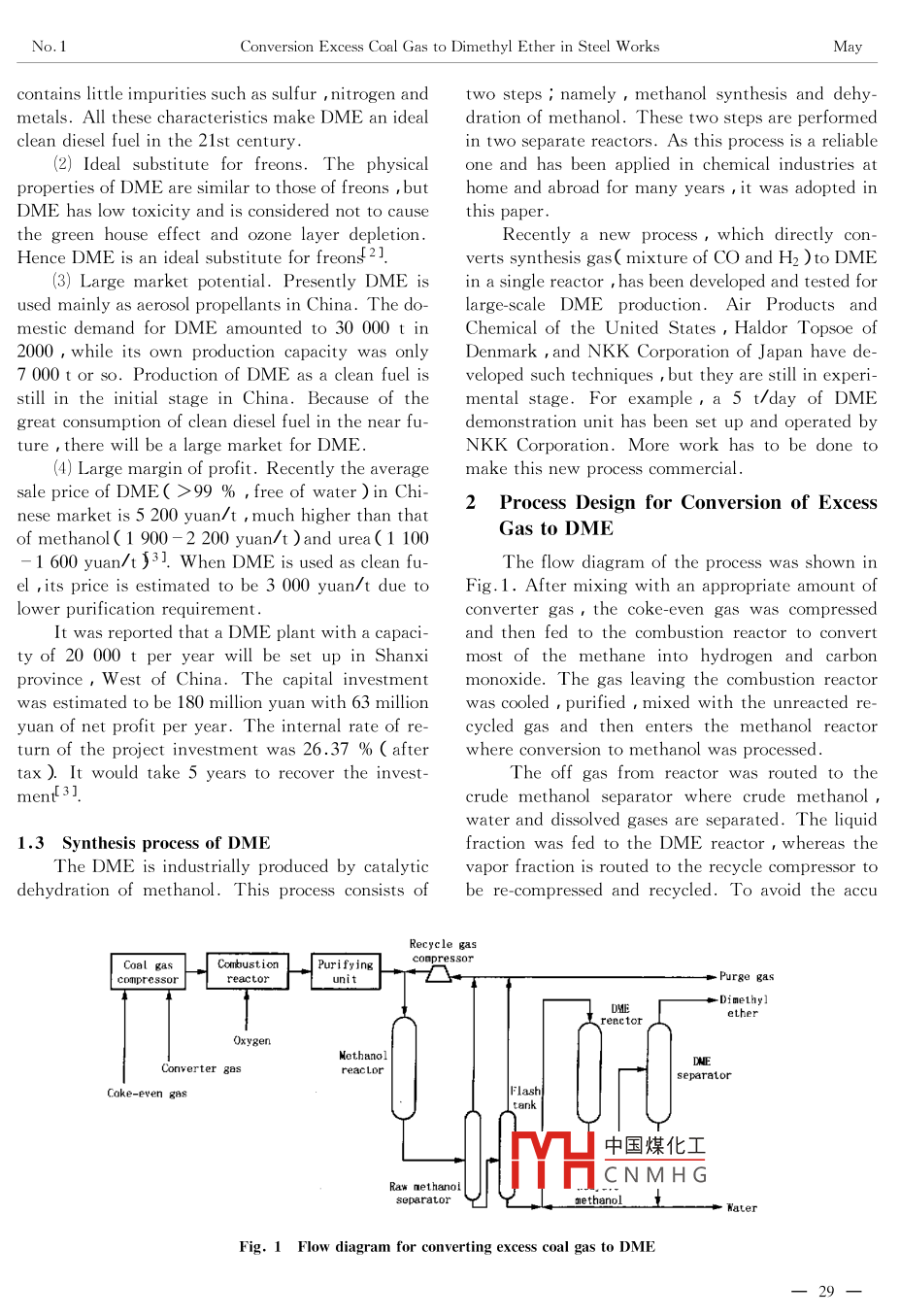 Vol 9 No. 1J. Iron Steel Res., IntMay 2002Conversion Excess Coal Gas to Dimethyl Ether in Steel WorksLI Jun-ling, WEN Hao, GUO Zhan-cheng, XU Zhi-hongInstitute of Chemical Metallurgy, CAS, Beijing 100080 ChinaAbstract: With the technical progress of metallurgical industry more excess gas will be pro-duced in steel works. The feasibility of producing dimethyl ether by gas synthesis was discussed, which focused on marketing energy balance process design economic evaluationand environmental protection etc. DME was considered to be a new way to utilize excess coalgas in steel worksKey words: steel works excess coal gas dimethyl ether chemical technologyWith the technical progress of metallurgical in- the emission of carbon dioxide it is necessary todustry more excess gas will be produced in steel find out another way to utilize excess coal gasworks. Table 1 listed the typical composition of eThe conversion of excess gas to higher-valuecess gas in an steel works. It can be seen that coke- chemicals is a new way for energy saving in ironoven gas mainly consists of hydrogen and methane, steel plants. The production of chemicals from exwhile converter gas contains much more carbon cess gas will not only increase the profit of themoIoxideplant but also reduce the emission of carbon dioxide. It is essential to determine which products canTable 1t an steel works Vol, %ube made from the excess gas. The product to be seCoke-oven gas Blast-furnace gas Converter gaslected should have a large market be produced withCarbon monoxidereliable process appropriate profit margins and enCarbon dioxide20.05,0vironment-friendliness and so on. Taking these fac-Hydrogetors into account dimethyl ether is considered to bea right product to utilize excess gas in steel workIntroduction to dimethyl etherIn China excess gas is used mainly as low valuefuel gas in this way not only the valuable resource 1. I Physical property of dimethyl etherincreased. As stern restrictions have been placed on dimethyl ether( DME )and certain other fuels/,oris wasted, but also the emission of carbon dioxide isTable 2 showed the physical propertiesTable 2 Physical property of DME and certain other fuelsPropaneMethanolDiesel fuelBoiling point!℃l61.56180-370Liquid density( 20C ykg mGas specific gravity relative to air0.55Saturated vapor pressur(25℃y×10Pa9.42249.26Ignition temperature/C235450Explosion limit/%2.1-9.45.5-36Cetane numberNet heating value/k) m-35941391211359822887046442502082083418401.2 Advantage of DMEetc. They were described as follows:There are many advantages of selecting dME as中國煤化工 ventional diesel fuellarge potential of market, large margin of proli, DMEproduct such as environment-friendly properties-umber(>55)and inCNMHGerenons. Moreover, DMEFoundation item: Item Sponsored by National Natural Science Foundation(59874024)Biography LI Jun-ling( 1972-), Male, Doctor candidate Received date: April 3, 2001No. IConversion Excess Coal Gas to Dimethyl Ether in Steel WorksMcontains little impurities such as sulfur nitrogen and two steps i namely methanol synthesis and dehymetals. All these characteristics make dme an ideal dration of methanol. These two steps are performedclean diesel fuel in the 21st centuryn two separate reactors. As this process is a reliable2) Ideal substitute for freons. The physical one and has been applied in chemical industries atproperties of dme are similar to those of freons but home and abroad for many years it was adopted inDME has low toxicity and is considered not to cause this paperthe green house effect and ozone layer depletionRecently a new process which directly conHence dme is an ideal substitute for freons21verts synthesis gas( mixture of CO and H2 )to DME(3)Large market potential. Presently DMEn a single reactor has been developed and tested forused mainly as aerosol propellants in China. The do- large-scale DME production. Air Products andmestic demand for DME amounted to 30 000 t in Chemical of the United States, Haldor Topsoe of2000, while its own production capacity was only Denmark, and NKK Corporation of Japan have de7 000 t or so. Production of dme as a clean fuelveloped such techniques but they are still in experiture, there will be a large market for DME of the mental stage. For example, a 5 t day of DMEstill in the initial stage in China. Becausegreat consumption of clean diesel fuel in the near fu- demonstration unit has been set up and operated byNKK Corporation. More work has to be done to(4)Large margin of profit. Recently the average make this new process commercialle price of dme(>99 % free of water )in Chinese market is 5 200 yuan/t, much higher than thatProcess design for Conversion of excessof methanol( 1 900-2 200 yuan/t)and urea(1 100Gas to dme1 600 yuan/t )3]. When DMEd as clean fuThe flow diagram of the process was shownel its price is estimated to be 3 000 yuan/t due to Fig. 1. After mixing with an appropriatelower purification requirementIt was reported that a dme plant with a capand then fed to the combustion reactor to convertty of 20 000 t per year will be set up in Shanxi most of the methane into hydrogen and carbontal investmentde, Thethe combustion reactewas estimated to be 180 million yuan with 63 million was cooled, purified mixed with the unreacted re-yuan of net profit per year. The internal rate of recycled gas and then enters the methanol reactorturn of the project investment was 26.37 %( aftwhere coonversion to methanol was processedtax ) It would take 5 years to recover the investThe off gas from reactor was routed to themencrude methanol separator where crude methanolater and dissolvedd The liquid1.3 Synthesis process of DMEfraction was fed to the dme reactor, whereas theThe dme is industrially produced by catalytic vapor fraction is routed to the recycle compressor todehydration of methanol. This process consists of be re-compressed and recycled To avoid the accucompressoreactor中國煤化工CNMHGFig. 1 Flow diagram for converting exce