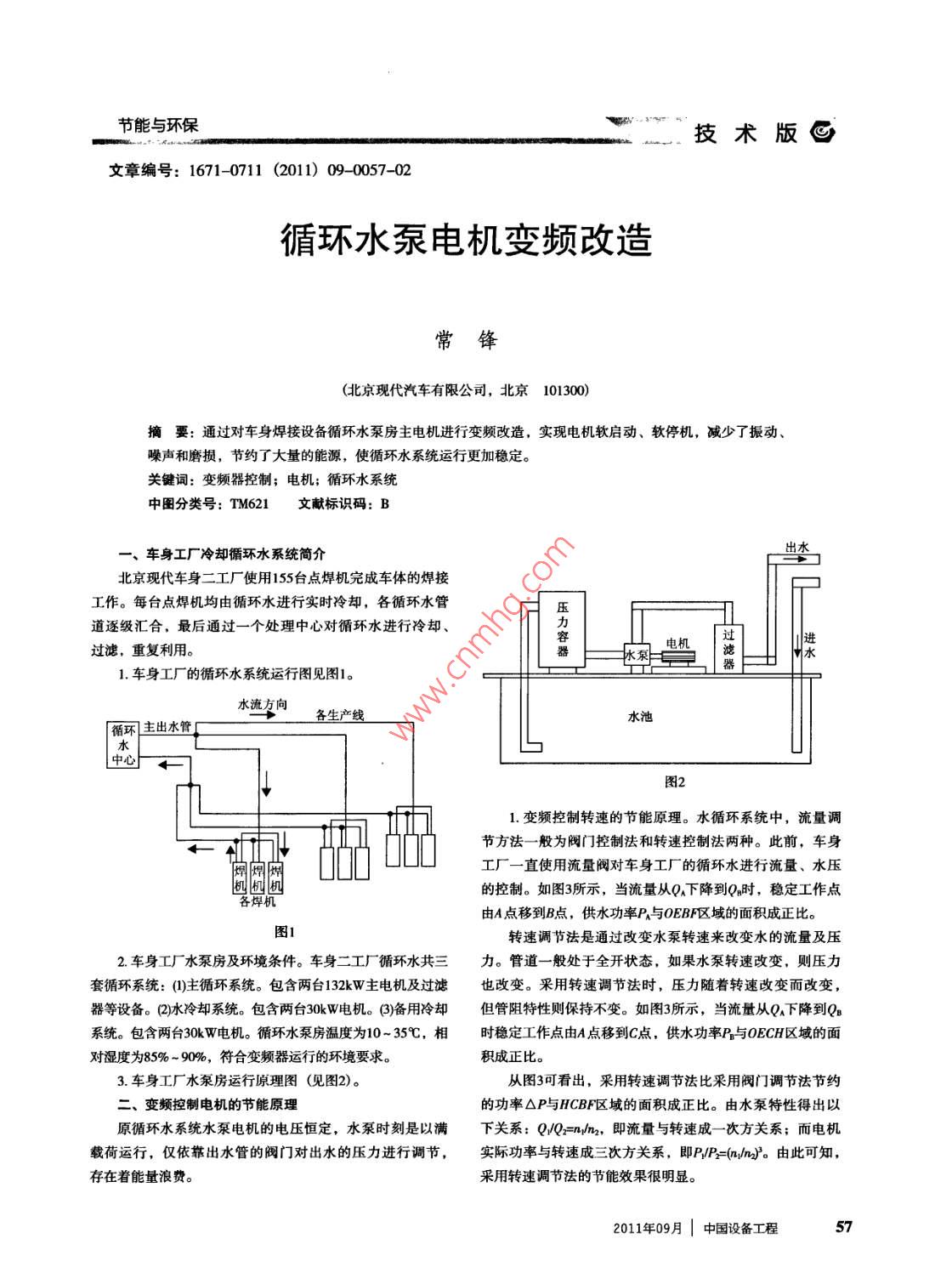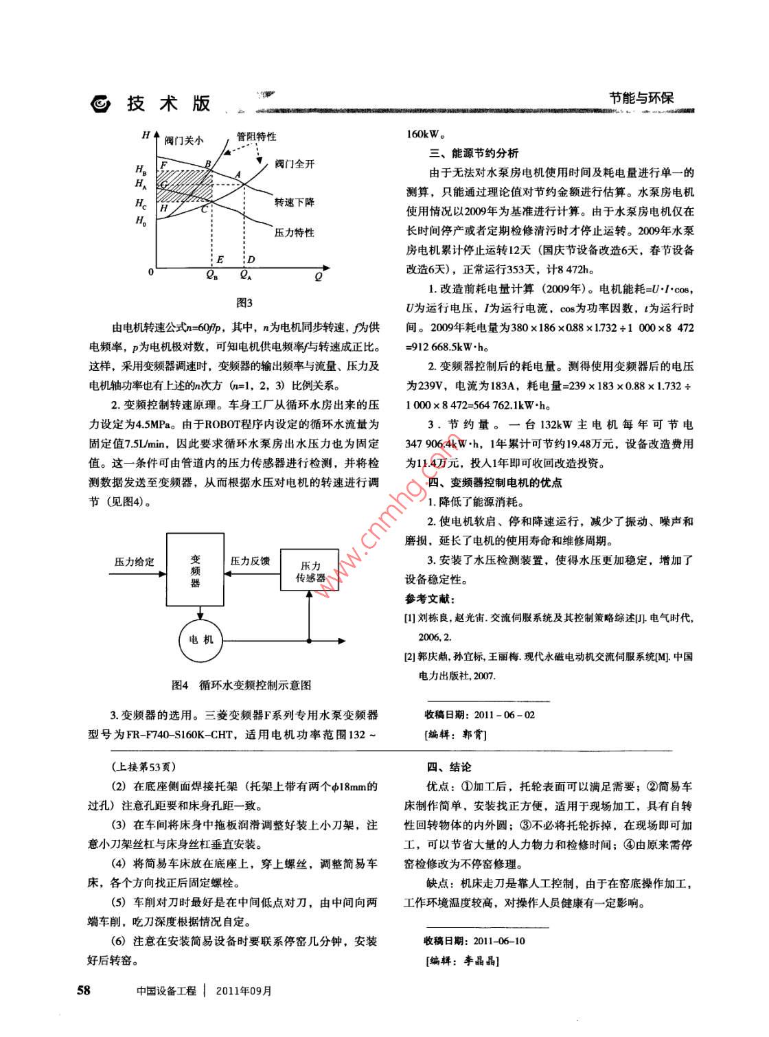 節(jié)能與環(huán)保技術(shù)版@文章編號:1671-0711(2011)090057-02循環(huán)水泵電機(jī)變頻改造常鋒(北京現(xiàn)代汽車有限公司,北京101300)摘要:通過對車身焊接設(shè)備循環(huán)水泵房主電機(jī)進(jìn)行變頻改造,實現(xiàn)電機(jī)軟啟動、軟停機(jī),減少了振動噪聲和磨損,節(jié)約了大量的能源,使循環(huán)水系統(tǒng)運(yùn)行更加穩(wěn)定。關(guān)鍵詞:變頻器控制;電機(jī);循環(huán)水系統(tǒng)中圖分類號:TM621文獻(xiàn)標(biāo)識碼:B一、車身工廠冷卻循環(huán)水系統(tǒng)簡介北京現(xiàn)代車身二工廠使用15臺點焊機(jī)完成車體的焊接工作。每臺點焊機(jī)均由循環(huán)水進(jìn)行實時冷卻,各循環(huán)水管道逐級匯合,最后通過一個處理中心對循環(huán)水進(jìn)行冷卻過濾,重復(fù)利用。壓力容器過濾器進(jìn)水1.車身工廠的循環(huán)水系統(tǒng)運(yùn)行圖見圖1。水流方向主出水管各生產(chǎn)線水池中心←圖21.變頻控制轉(zhuǎn)速的節(jié)能原理。水循環(huán)系統(tǒng)中,流量調(diào)節(jié)方法一般為閥門控制法和轉(zhuǎn)速控制法兩種。此前,車身工廠一直使用流量閥對車身工廠的循環(huán)水進(jìn)行流量、水壓的控制。如圖3所示,當(dāng)流量從Q下降到Q時,穩(wěn)定工作點各焊機(jī)由A點移到B點,供水功率P與OEB區(qū)域的面積成正比。轉(zhuǎn)速調(diào)節(jié)法是通過改變水泵轉(zhuǎn)速來改變水的流量及壓2.車身工廠水泵房及環(huán)境條件。車身二工廠循環(huán)水共三力。管道一般處于全開狀態(tài),如果水泵轉(zhuǎn)速改變,則壓力套循環(huán)系統(tǒng):(1)主循環(huán)系統(tǒng)。包含兩臺132kW主電機(jī)及過濾也改變。采用轉(zhuǎn)速調(diào)節(jié)法時,壓力隨著轉(zhuǎn)速改變而改變,器等設(shè)備。(2)水冷卻系統(tǒng)。包含兩臺30kW電機(jī)。(3)備用冷卻但管阻特性則保持不變。如圖3所示,當(dāng)流量從Q下降到Q系統(tǒng)。包含兩臺30kW電機(jī)。循環(huán)水泵房溫度為10-35℃,相時穩(wěn)定工作點由A點移到C點,供水功率P與OECH區(qū)域的面對濕度為85%~90%,符合變頻器運(yùn)行的環(huán)境要求。積成正比。3.車身工廠水泵房運(yùn)行原理圖(見圖2)。從圖3可看出,采用轉(zhuǎn)速調(diào)節(jié)法比采用閥門調(diào)節(jié)法節(jié)約二、變頻控制電機(jī)的節(jié)能原理的功率△P與HCBF區(qū)域的面積成正比。由水泵特性得出以原循環(huán)水系統(tǒng)水泵電機(jī)的電壓恒定,水泵時刻是以滿下關(guān)系:QQ=nn,即流量與轉(zhuǎn)速成一次方關(guān)系;而電機(jī)載荷運(yùn)行,僅依靠出水管的閥門對出水的壓力進(jìn)行調(diào)節(jié),實際功率與轉(zhuǎn)速成三次方關(guān)系,即PP=(m1n2由此可知存在著能量浪費(fèi)。采用轉(zhuǎn)速調(diào)節(jié)法的節(jié)能效果很明顯。2011年09月|中國設(shè)備工程@技術(shù)版節(jié)能與環(huán)保H↑閥門關(guān)小管阻特性160kW。三、能源節(jié)約分析H閥門全開由于無法對水泵房電機(jī)使用時間及耗電量進(jìn)行單一的測算,只能通過理論值對節(jié)約金額進(jìn)行估算。水泵房電機(jī)轉(zhuǎn)速下降使用情況以2000年為基準(zhǔn)進(jìn)行計算。由于水泵房電機(jī)僅在壓力特性長時間停產(chǎn)或者定期檢修清污時才停止運(yùn)轉(zhuǎn)。200年水泵房電機(jī)累計停止運(yùn)轉(zhuǎn)12天(國慶節(jié)設(shè)備改造6天,春節(jié)設(shè)備E: D0a。ad改造6天),正常運(yùn)行353天,計8472h。1.改造前耗電量計算(2009年)。電機(jī)能耗=U·lcos圖3U為運(yùn)行電壓,Ⅰ為運(yùn)行電流,cos為功率因數(shù),t為運(yùn)行時由電機(jī)轉(zhuǎn)速公式n=60,其中,n為電機(jī)同步轉(zhuǎn)速,供間。2009年耗電量為380×186×088×1732÷1000×8472電頻率,p為電機(jī)極對數(shù),可知電機(jī)供電頻率與轉(zhuǎn)速成正比。=9126685kW·ho這樣,采用變頻器調(diào)速時,變頻器的輸出頻率與流量、壓力及2.變頻器控制后的耗電量。測得使用變頻器后的電壓電機(jī)軸功率也有上述的次方(n=1,2,3)比例關(guān)系為239V,電流為183A,耗電量=239×183×0.88×1.732÷2.變頻控制轉(zhuǎn)速原理。車身工廠從循環(huán)水房出來的壓1000×8472=5647621kWh力設(shè)定為45MPa。由于 ROBOT程序內(nèi)設(shè)定的循環(huán)水流量為3.節(jié)約量。一臺132kW主電機(jī)每年可節(jié)電固定值7.5Lmin,因此要求循環(huán)水泵房出水壓力也為固定3479064kWh,1年累計可節(jié)約1948萬元,設(shè)備改造費(fèi)用值。這一條件可由管道內(nèi)的壓力傳感器進(jìn)行檢測,并將檢為114萬元,投入1年即可收回改造投資。測數(shù)據(jù)發(fā)送至變頻器,從而根據(jù)水壓對電機(jī)的轉(zhuǎn)速進(jìn)行調(diào)四、變頻器控制電機(jī)的優(yōu)點節(jié)(見圖4)1.降低了能源消耗。2.使電機(jī)軟啟、停和降速運(yùn)行,減少了振動、噪聲和磨損,延長了電機(jī)的使用壽命和維修周期。壓力給定變壓力反饋壓力3.安裝了水壓檢測裝置,使得水壓更加穩(wěn)定,增加了傳感器設(shè)備穩(wěn)定性參考文獻(xiàn)劉棟良,趙光宙交流伺服系統(tǒng)及其控制策略綜述j電氣時代電機(jī)2郭慶鼎孫宜標(biāo),王麗梅現(xiàn)代永磁電動機(jī)交流伺服系統(tǒng)M]中國電力出版社,2007圖4循環(huán)水變頻控制示意圖3.變頻器的選用。三菱變頻器F系列專用水泵變頻器收稿日期:2011-06-02型