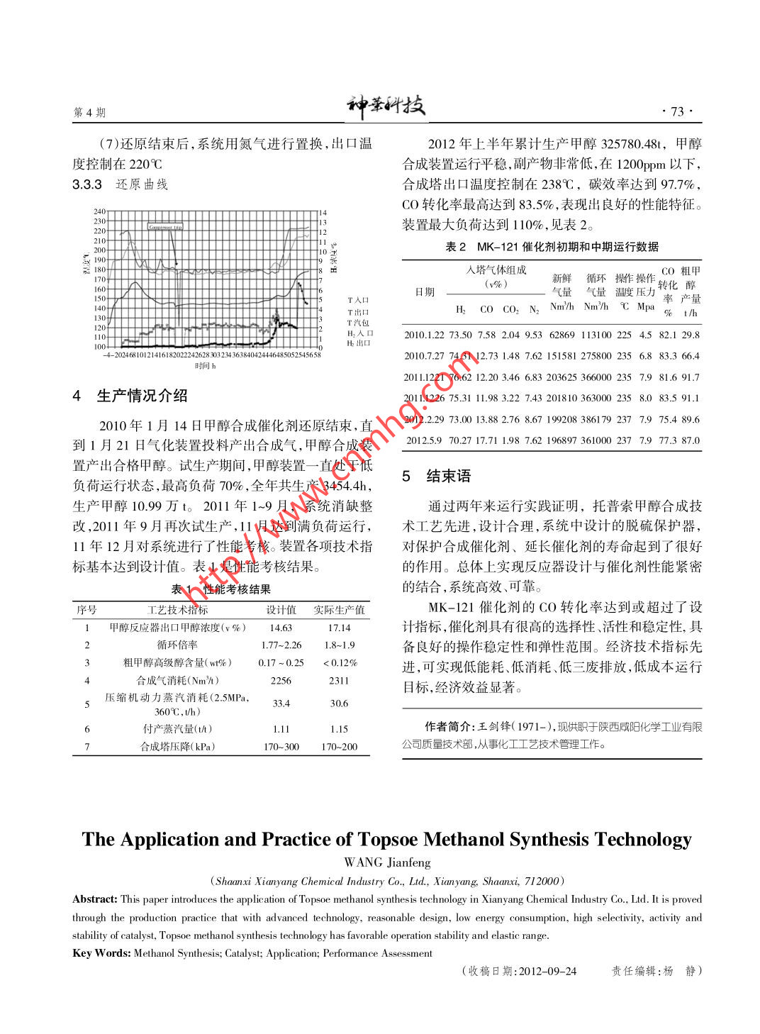 第11卷第4期神華科技2013年7月VOL.11 NO.4July.2013托普索甲醇合成技術(shù)的應(yīng)用與實(shí)踐,王劍鋒(陜西咸陽(yáng)化學(xué)工業(yè)有限公司,陜西咸陽(yáng),712000)摘要:介紹托普索甲醇合成技術(shù)在咸陽(yáng)化工的應(yīng)用情況。通過(guò)生產(chǎn)實(shí)踐證明,托普索甲醇合成技術(shù)具有工藝先進(jìn)、設(shè)計(jì)合理、系統(tǒng)能耗低,催化劑具有很高的選擇性、活性和穩(wěn)定性,具備良好的操作穩(wěn)定性和彈性范圍。關(guān)鍵詞:甲醇合成催化劑應(yīng)用性能考核中圖分類號(hào):O64文獻(xiàn)標(biāo)識(shí)碼:B文章編號(hào):1674- -8492(2013 )04- -071-03陜西咸陽(yáng)化學(xué)工業(yè)有限公司(簡(jiǎn)稱咸陽(yáng)化工)60成裝置,托普索公司工藝設(shè)計(jì)僅使用了43M'催化萬(wàn)t/a甲醇裝置以煤為原料,采用多元料氣化制取合劑,其設(shè)計(jì)能力能否在實(shí)際生產(chǎn)中達(dá)標(biāo),當(dāng)時(shí)咸陽(yáng)成氣粗原料氣,經(jīng)過(guò)低溫甲醇洗凈化獲得合格的合化 工是有些懷疑。后來(lái)的生產(chǎn)實(shí)際證明,這種懷疑成氣,在甲醇合成裝置中合成為粗甲醇。甲醇合成裝是多余的。置引進(jìn)了托普索甲醇合成技術(shù),采用一-臺(tái)管殼式反2甲醇合成裝置簡(jiǎn)述應(yīng)器,裝填MK-121甲醇合成催化劑。2010年1 月14日升溫還原結(jié)束,1月21日投入生產(chǎn),截止到20122.1工藝 流程簡(jiǎn)述年4月30日,實(shí)際運(yùn)行時(shí)間共計(jì)約7968h,累計(jì)生產(chǎn)來(lái)自低溫甲醇洗工段的新鮮原料氣,與來(lái)自氫甲醇43.03萬(wàn)t。運(yùn)行期間,甲醇合成裝置表現(xiàn)出良好回收的滲透氣(富氫氣)混合,進(jìn)入合成氣壓縮機(jī)一的操作穩(wěn)定性、較高的轉(zhuǎn)化率和催化劑活性,以及較段升壓至合成壓力,隨后和噴人的一-小部分高壓鍋好的適應(yīng)性。爐給水混合,- .起進(jìn)入第一原料氣中間換熱器,被來(lái)自甲醇反應(yīng)器的氣體加熱,原料氣預(yù)熱后進(jìn)人脫硫1甲醇合成技術(shù)的選擇罐脫除COS和HS。甲醇合成裝置是甲醇生產(chǎn)關(guān)鍵工序之一,關(guān)系脫硫罐是--個(gè)裝有ZnO脫硫劑的簡(jiǎn)單的固定床到整套生產(chǎn)裝置經(jīng)濟(jì)效益的優(yōu)劣。其中起核心作用反應(yīng)器,采用托普索HTZ -5型催化劑。的是催化劑的性能和由催化劑性能決定的合成效率、來(lái)自循環(huán)氣壓縮機(jī)的循環(huán)氣,在第二原料氣中循環(huán)倍率、合成氣消耗,及由此決定的裝置規(guī)模一間換熱器被預(yù)熱后,與來(lái)自脫硫罐的原料氣混合。資大小和動(dòng)力消耗?;旌虾蟮暮铣蓺庥身敳窟M(jìn)人甲醇反應(yīng)器,進(jìn)行甲醇咸陽(yáng)化工在2005年項(xiàng)目籌建時(shí),對(duì)國(guó)內(nèi)、國(guó)外合成反應(yīng)。甲醇合成技術(shù)和甲醇生產(chǎn)企業(yè)進(jìn)行了廣泛的調(diào)查。合成反應(yīng)器出口反應(yīng)氣體的溫度約為230~259C,當(dāng)時(shí)以華東理工大為代表的絕熱一管殼外冷復(fù)合型出塔氣分為兩部分,分別在第一-和第二中間換熱器甲醇合成反應(yīng)器,有運(yùn)行業(yè)績(jī)的最大規(guī)模是20萬(wàn)t被合成新鮮氣和循環(huán)氣冷卻,再進(jìn)人循環(huán)水冷卻器甲醇/ao以杭州林達(dá)公司開(kāi)發(fā)的均溫型甲醇合成反應(yīng)中 被進(jìn)一步冷卻至40C。此時(shí)大部分甲醇冷凝下來(lái),器技術(shù),有2套20萬(wàn)t的運(yùn)行業(yè)績(jī);國(guó)外商業(yè)化經(jīng)典氣液混合物在高壓分離器中進(jìn)行氣液分離,粗甲醇低壓氣相法甲醇合成工藝技術(shù)主要有德國(guó)魯奇、丹減壓進(jìn)入低壓分離器進(jìn)行閃蒸,除去液體甲醇中溶麥托普索英國(guó)戴維和日本三菱瓦斯工藝等。其中以解的大部分氣體后,粗甲醇被送往中間罐區(qū)的粗甲德國(guó)魯奇、丹麥托普索和英國(guó)戴維技術(shù)較好,業(yè)績(jī)較醇罐,再用粗甲醇泵送往精餾工段。多。經(jīng)過(guò)多個(gè)回合與多家專利商的技術(shù)談判,最終確系統(tǒng)排出的弛放氣,進(jìn)人氫回收裝置回收氫氣認(rèn)采用托普索公司甲醇合成技術(shù)。甲醇合成反應(yīng)熱由反應(yīng)器殼側(cè)的飽和水汽移但對(duì)于60萬(wàn)t甲醇/a(300天)生產(chǎn)能力的合出。 副產(chǎn)2.7~3.88MPaG的飽和蒸汽。王劍鋒:托普索甲醇合成技術(shù)的應(yīng)用與實(shí)踐第4期2.2主要設(shè) 備簡(jiǎn)介3.3催化劑還原設(shè)備名稱設(shè)備規(guī)格MK-121型甲醇合成催化劑,是以氧化銅為主體φ 2900 x 94 x 6375V=148.4m?的銅鋅鋁系催化劑。使用前須經(jīng)過(guò)還原才具有活性,脫硫保護(hù)反應(yīng)器催化劑容積V=45.1m’工業(yè)上一般采用合成氣,或純氫氣進(jìn)行催化劑的還甲醇合成反應(yīng)器φ 3905 x 69 x 7700催化劑容積V=43.1m’原,單純采用氫氣的還原反應(yīng)式如下:第一中間換熱器φ 1100 x 59 x 10375(立式、列管式)F=876.1m2CuO+ H2→Cu+ H2O△H450K = -89.00 kJ/mol第二中間換熱器φ 1658 x 79x 15020(立式、列管式)F=1741m2水冷器φ 2266 x 83 x 10(臥式列管式)F=2375m2氧化銅的還原也可以采用CO,須注意的是,由高壓分離器φ 2400x 76x 3845,V=21m2于CO參與的還原反應(yīng)熱效應(yīng),是用H2作為還原劑低壓分離器φ 1600x 8x 5350, V=11.93m'的兩倍,在采用含有CO的合成氣進(jìn)行催化劑還原合成塔汽包φ 2400x 43 x 1000, V=49.2m3時(sh