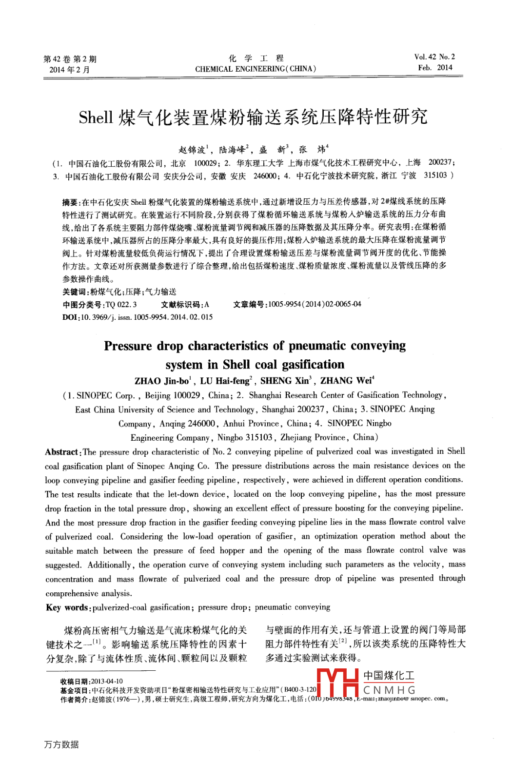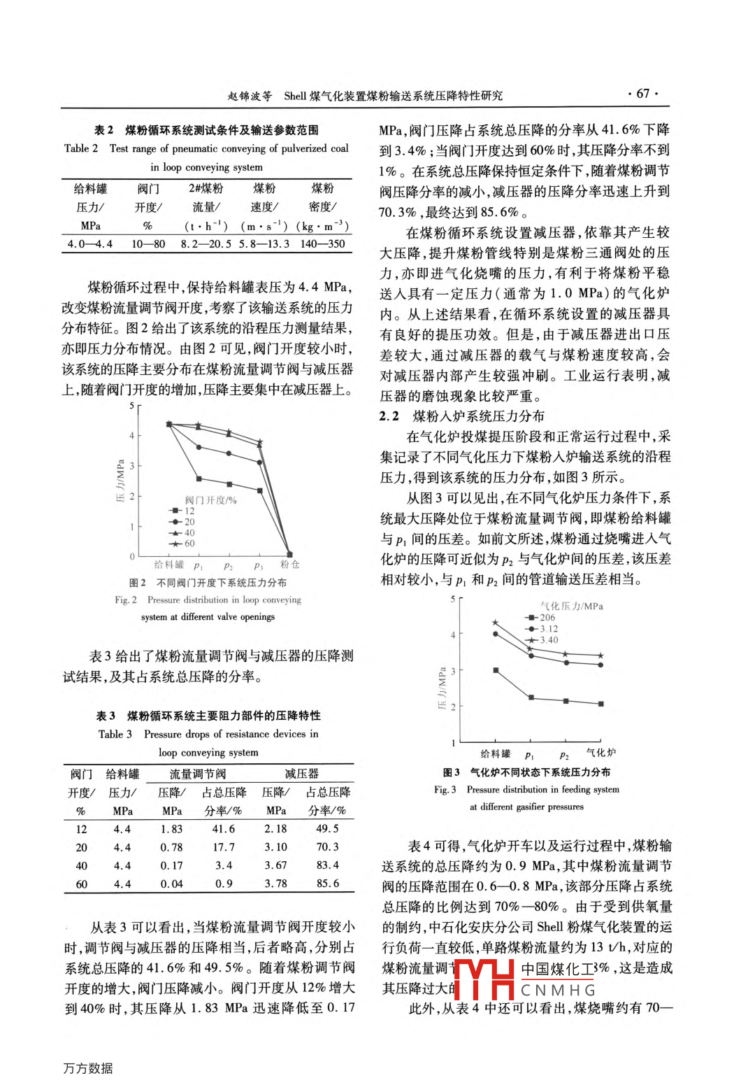 第42卷第2期化學(xué)工程Vol. 42 No. 22014年2月CHEMICAL ENGINEERING( CHINA)Feb.2014Shell煤氣化裝置煤粉輸送系統(tǒng)壓降特性研究趙錦波',陸海峰',盛新’,張煒(1.中國石油化工股份有限公司,北京10020; 2.華東理工大學(xué)上海市煤氣化技術(shù)工程研究中心,上海200237;3.中國石油化工股份有限公司安慶分公司,安徽安慶246000; 4. 中石化寧波技術(shù)研究院,浙江寧波315103 )摘要:在中石化安慶Shell粉煤氣化裝置的煤粉輸送系統(tǒng)中,通過新增設(shè)壓力與壓差傳感器,對2#煤線系統(tǒng)的壓降特性進(jìn)行了測試研究。在裝置運行不同階段,分別獲得了煤粉循環(huán)輸送系統(tǒng)與煤粉人爐輸送系統(tǒng)的壓力分布曲線,給出了各系統(tǒng)主要阻力部件煤燒嘴、煤粉流量調(diào)節(jié)閥和減壓器的壓降數(shù)據(jù)及其壓降分率。研究表明:在煤粉循環(huán)輸送系統(tǒng)中,減壓器所占的壓降分率最大,具有良好的提壓作用;煤粉入爐輸送系統(tǒng)的最大壓降在煤粉流量調(diào)節(jié)閥上。針對煤粉流量較低負(fù)荷運行情況下,提出了合理設(shè)置煤粉輸送壓差與煤粉流量調(diào)節(jié)閥開度的優(yōu)化、節(jié)能操作方法。文章還對所獲測量參數(shù)進(jìn)行了綜合整理,給出包括煤粉速度、煤粉質(zhì)量濃度、煤粉流量以及管線壓降的多參數(shù)操作曲線。關(guān)鍵詞粉煤氣化;壓降;氣力輸送中圖分類號:TQ 022.3文獻(xiàn)標(biāo)識碼:A文章編號:1005-9954(2014)02 0065-04DOI:10. 3969/j. issn. 1005 9954.2014. 02.015Pressure drop characteristics of pneumatic conveyingsystem in Shell coal gasificationZHAO Jin-bo' , LU Hai-feng2 , SHENG Xin' , ZHANG Wei'(1. SINOPEC Corp. , Beijing 100029, China; 2. Shanghai Research Center of Gasification Technology,East China University of Science and Technology,Shanghai 200237, China; 3. SINOPEC AnqingCompany,Anqing 246000, Anhui Province, China; 4. SINOPEC NingboEngineering Company,Ningbo 315103 , Zhejiang Province, China)Abstract :The pressure drop characteristic of No.2 conveying pipeline of pulverized coal was investigated in Shellcoal gasification plant of Sinopec Anqing Co. The pressure distributions across the main resistance devices on theloop conveying pipeline and gasifier feeding pipeline , respectively,were achieved in different operation conditions.The test results indicate that the let-down device, located on the loop conveying pipeline, has the most pressuredrop fraction in the total pressure drop, showing an excellent effect of pressure boosting for the conveying pipeline.And the most pressure drop fraction in the gasifier feeding conveying pipeline lies in the mass flowrate control valveof pulverized coal. Considering the low-load operation of gasifier, an optimization operation method about thesuitable match between the pressure of feed hopper and the opening of the mass flowrate control valve wassuggested. Additionally, the operation curve of conveying system including such parameters as the velocity, mass .concentration and mass flowrate of pulverized coal and the pressure drop of pipeline was presented throughcomprehensive analysis.Key words : pulverized-coal gasification ; pressure drop; pneumatic conveying煤粉高壓密相氣力輸送是氣流床粉煤氣化的關(guān)與壁面的作用有關(guān),還與管道上設(shè)置的閥門等局部鍵技術(shù)之-[。影響輸送系統(tǒng)壓降特性的因素十阻力部件特性有關(guān)(2] ,所以該類系統(tǒng)的壓降特性大分復(fù)雜,除了與流體性質(zhì)流體間、顆粒間以及顆粒多通過實驗測試來獲得。中國煤化工收稿日期:201304-10基金項目:中石化科技開發(fā)資助項目“粉煤密相輸送特性研究與工業(yè)應(yīng)用"( B400-3-120.MHCNMH G作者簡介:趙錦波( 1976-) ,男,碩士研究生,高級工程師,研究方向為煤化工,電話:(010)0498348 ,-mal:zhaojinDo@ sinopee. com。
