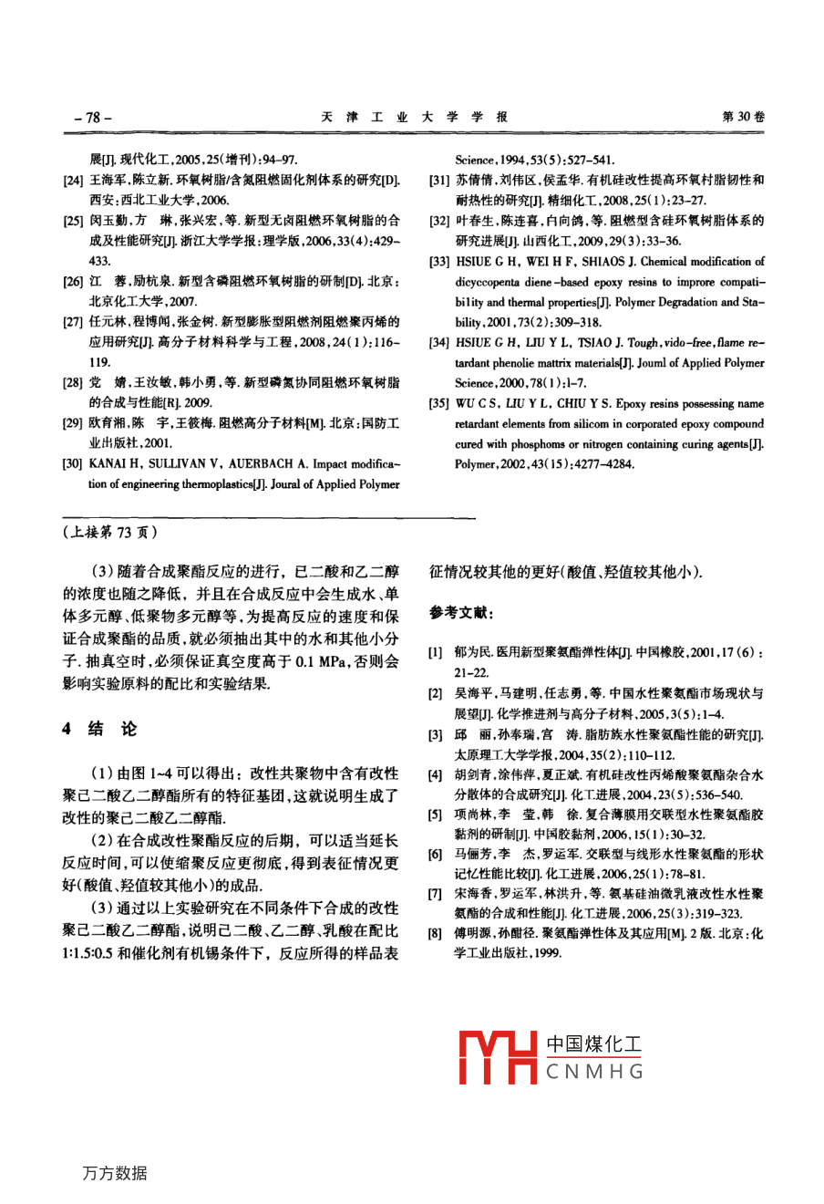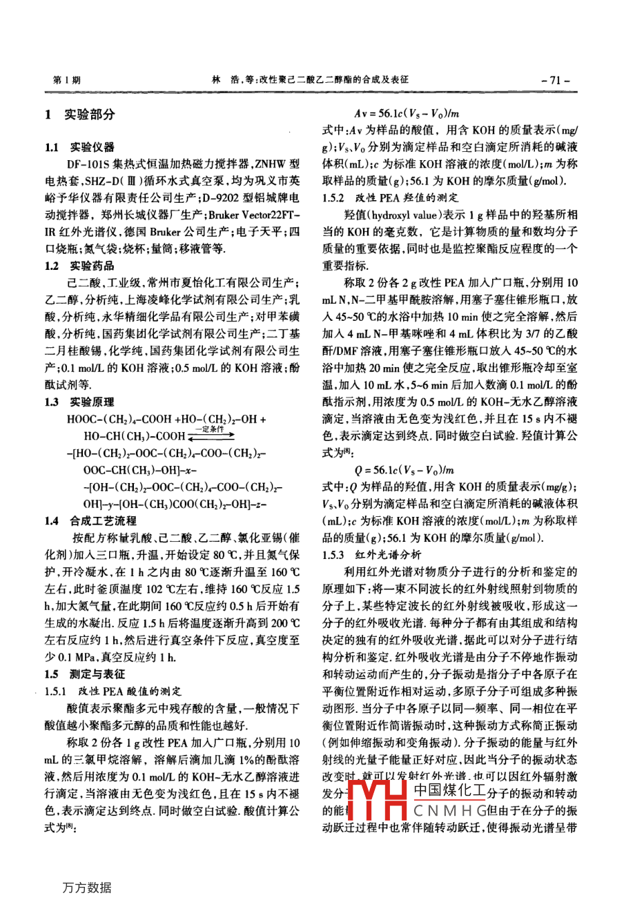 第30卷第1期天津工業(yè)大學學報Vol 30 No.0l1年2月JOURNAL OF TIANJIN POLYTECHNIC UNIVERSITYFebruary 2011改性聚己二酸乙二醇酯的合成及表征林浩,劉艷君(西安工程大學紡織與材料學院西安710048)摘要:在分析聚酯多元醇(PEA)合成方法的基礎(chǔ)上,研究釆用己二酸、乙二醇和乳酸合成改性聚己二酸乙二醇酯的合成方法和工藝.將已二酸、乙二醇和乳酸按1:1.2:0.5、1:13:0.5、1:14:0.5、1:1.5:0.5、1:1.6:0.5的不同配比;和改變?nèi)樗岬暮?將己二酸、乙二醇和乳酸按1:15:0.5和1:15:0.2配比,分別采用對甲笨磺酸和有機錫2種不同的催化劑,在不同的反應時間等條件下合成改性共聚物聚酯多元醇,并利用紅外光譜(rTIR)分析研究合威改性共聚物的化學組成結(jié)果表明:合成的改性共聚物中含有聚己二釀乙二醇酯所有的特征基團.并且通過化學滴定的方法,計算出了合成共聚物的酸值、羥值和數(shù)均分子質(zhì)量根據(jù)計算結(jié)果綜合分析,得出了采用有機錫為催化劑,己二酸、乙二醇和乳酸按1:15:0.5的配比合成的共聚物樣品表征情況最佳的結(jié)論.關(guān)鍵詞:改性PEA;可生物降解性;聚酯多元醇中圖分類號:TQ342文獻標志碼:A文章編號:1671-024X(2011)01-007004Synthesis and characterization of modified polyethylene adipate estersLIN Hao, LIU Yan-jun(School of Textile and Material, Xi'an Polytechnic University, Xi'an 710048, China)Abstract: The experiment is to synthesize polyol of PU soft segment. First of all, a number of conditions for synthesizingpolyol were discussed. The ratio of the adipic acid, ethylene glycol and lactic acid(1:1. 2: 0.5, 1:1.3 0.5.1:1.4:0.5. 1: 1.5: 0.5. 1:1. 6:0.5), different catalysts, different lactic acid content (1: 1.5: 0.5. 1: 1.5: 0. 2)and the lengthof reaction time were investigated to synthesize modified PEA (polyethylene adipate esters ) The infraredspectroscopy (FTIR)was used to confirm the chemical composition of copolymers. The acid value andhydroxyl value of modified PEA was calculated by chemical titration. And the number average molecularweight was calculated. Sample color and viscosity was observed with naked eyes. The experimental resultsshowed that under different conditions, adipic acid modified polyethylene glycol esters were prepared. Andthe modified PEA showed the better performance with 1: 1.5: 0.5 of adipic acid, ethylene glycol, lactic acidand organotin catalystKey words: modified polyethylene adipate esters; biodegradability; polyester polyols生物可降解聚氨酯材料具有優(yōu)異的機械性能、良保、低消耗的水性聚氨酯日益得到重視.但水性聚好的血液相容性、組織相容性、生物可降解性和可設(shè)氨酯膠黏劑難以降解,給環(huán)境帶來污染,又會給回收計性,因而在生物醫(yī)學上得到了廣泛的應用目前利用帶來不便.近年來,人們開始探討聚氨酯彈性體廣泛使用的聚氨酯多為溶劑型聚氨酯,其易揮發(fā)、易可生物降解性,而合成可生物降解的水性聚氨酯關(guān)鍵燃易爆、有一定毒性、氣味大并且能造成空氣污染,生之處是合成改性的聚酯多元醇本文對合成以乳酸改產(chǎn)使用中浪費大隨著制備水性聚氨酯已日趨完善,性的聚己二酸乙二醇酯二元醇的反應條件進行了初加之人們對環(huán)保的關(guān)注和各國對揮發(fā)性有機化合物步的研究,并得到了最佳的合成條件;并利用紅外及有毒物的限制日趨嚴格,更使以水為介質(zhì)的高環(huán)譜(中國煤化工寧表征CNMHG收稿日期:201009-15基金項目:陜西省重點學科專項資金資助項(2浩(1985-),男,碩士研究生通信作者:劉艷君(1962),女教授頓士生導師E- mail: Lauyj00oe163com第I期林浩,等:改性聚己二酸乙二醇酯的合成及表征1實驗部分Av=561c(Vs-Vo)/m式中:Av為樣品的酸值,用含KOH的質(zhì)量表示(mg11實驗儀器g);vs、Vo分別為滴定樣品和空白滴定所消耗的堿液DF-l01S集熱式恒溫加熱磁力攪拌器,ZNHW型體積(mL);c為標準KOH溶液的濃度(mo/L);m為稱電熱套,SHZ-D(Ⅲ)循環(huán)水式真空泵,均為鞏義市英取樣品的質(zhì)量(g);561為KOH的摩爾質(zhì)量(gmol)峪予華儀器有限責任公司生產(chǎn);D-9202型鋁城牌電1.52改性PEA羥值的測定動攪拌器,鄭州長城儀器廠生產(chǎn); Bruker vector22FT-羥值( hydroxyl value)表示1g樣品中的羥基所相IR紅外光譜儀,德國 Bruker公司生產(chǎn);電子天平;四當?shù)腒OH的毫克數(shù),它是計算物質(zhì)的量和數(shù)均分子口燒瓶;氮氣袋;燒杯;量筒;移液管等.質(zhì)量的重要依據(jù),同時也是監(jiān)控聚酯反應程度的一個12實驗藥品重要指標己二酸,工業(yè)級,常州市夏怡化工有限公司生產(chǎn);稱取2份各2g改性PEA加入廣口瓶,分別用10乙二醇,分析純,上海凌峰化學試劑有限公司生產(chǎn);乳mLN,N-二甲基甲酰胺溶解,用塞子塞住錐形瓶口,放酸,分析純,永華精細化學品有限公司生產(chǎn);對甲苯磺45-50℃的水浴中加熱10min使之完全溶解,然后酸,分析純國藥集團化學試劑有限公司生產(chǎn);二丁基加入4mLN-甲基咪唑和4mL體積比為37的乙酸二月桂酸錫,化學純,國藥集團化學試劑有限公司生酐DMF溶液,用塞子塞住錐形瓶口放入45-50℃的水產(chǎn);0.1moML的KOH溶液;0.5moL的KOH溶液;酚浴中加熱20min使之完全反應,取出錐形瓶冷卻至室酞試劑等溫,加入10mL水,5-6min后加入數(shù)滴0.1mo/L的酚1.3實驗原理酞指示劑,用濃度為05mo的KOH-無水乙醇溶液HOOC-(CH2)4-COOH +H0-( CH2)2-oH滴定,當溶液由無色變?yōu)闇\紅色,并且在15s內(nèi)不褪HO-CH(CH, )-COOH色,表示滴定達到終點同時做空白試驗羥值計算公-[HO-(CH2)r-0OC-(CH2)-C00-(CH2)r式為:0OC-CH(CH,)-OH]-x
