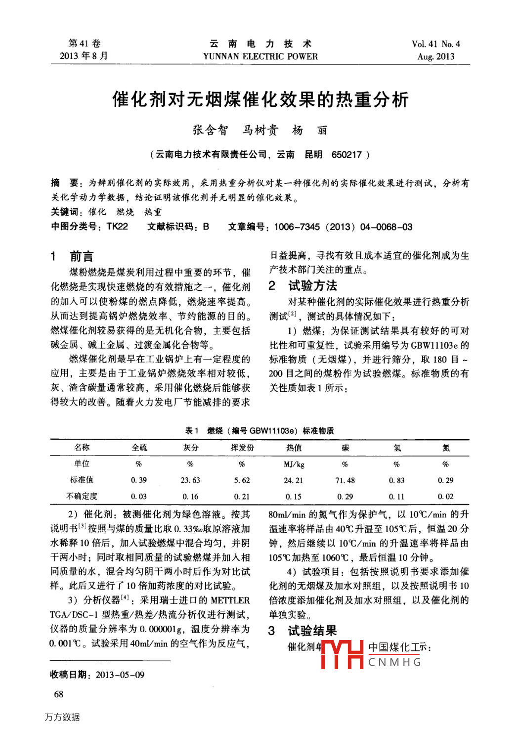 第41卷云南電力技術(shù)Vol. 41 No. 42013年8月YUNNAN ELECTRIC POWERAug.2013催化劑對(duì)無(wú)煙煤催化效果的熱重分析張含智馬樹貴楊麗(云南電力技術(shù)有限責(zé)任公司,云南昆明650217)摘要:為辨別催化劑的實(shí)際效用,采用熱重分析儀對(duì)某一種催化劑的實(shí)際催化效果進(jìn)行測(cè)試,分析有關(guān)化學(xué)動(dòng)力學(xué)數(shù)據(jù),結(jié)論證明該催化劑并無(wú)明顯的催化效果。關(guān)鍵詞:催化燃燒熱重中圖分類號(hào):TK22文獻(xiàn)標(biāo)識(shí)碼:B文章編號(hào):1006-7345(2013)04-0068-031前言日益提高,尋找有效且成本適宜的催化劑成為生煤粉燃燒是煤炭利用過(guò)程中重要的環(huán)節(jié),催產(chǎn)技術(shù)部門關(guān)注的重點(diǎn)。化燃燒是實(shí)現(xiàn)快速燃燒的有效措施之一催化劑2試驗(yàn)方法的加入可以使粉煤的燃點(diǎn)降低,燃燒速率提高。對(duì)某種催化劑的實(shí)際催化效果進(jìn)行熱重分析從而達(dá)到提高鍋爐燃燒效率、節(jié)約能源的目的。測(cè)試2,測(cè)試的具體情況如下燃煤催化劑較易獲得的是無(wú)機(jī)化合物,主要包括1)燃煤:為保證測(cè)試結(jié)果具有較好的可對(duì)堿金屬、堿土金屬、過(guò)渡金屬化合物等。比性和可重復(fù)性,試驗(yàn)采用編號(hào)為GBW11103e的燃煤催化劑最早在工業(yè)鍋爐上有一定程度的標(biāo)準(zhǔn)物質(zhì)(無(wú)煙煤),并進(jìn)行篩分,取180目~應(yīng)用,主要是由于工業(yè)鍋爐燃燒效率相對(duì)較低,200目之間的煤粉作為試驗(yàn)燃煤。標(biāo)準(zhǔn)物質(zhì)的有灰、渣含碳量通常較高,采用催化燃燒后能夠獲關(guān)性質(zhì)如表1所示得較大的改善。隨著火力發(fā)電廠節(jié)能減排的要求表1燃燒(編號(hào)GBW103e)標(biāo)準(zhǔn)物質(zhì)名稱全硫灰分揮發(fā)份熱值單位標(biāo)準(zhǔn)值不確定度0.030.160.210.150.110.022)催化劑:被測(cè)催化劑為綠色溶液。按其80ml/min的氮?dú)庾鳛楸Wo(hù)氣,以10℃/min的升說(shuō)明書③按照與煤的質(zhì)量比取0.33%取原溶液加溫速率將樣品由40℃升溫至105℃后,恒溫20分水稀釋10倍后,加入試驗(yàn)燃煤中混合均勻,并陰鐘,然后繼續(xù)以10℃/min的升溫速率將樣品由干兩小時(shí);同時(shí)取相同質(zhì)量的試驗(yàn)燃煤并加入相105℃加熱至1060℃,最后恒溫10分鐘。同質(zhì)量的水,混合均勻陰干兩小時(shí)后作為對(duì)比試4)試驗(yàn)項(xiàng)目:包括按照說(shuō)明書要求添加催樣。此后又進(jìn)行了10倍加藥濃度的對(duì)比試驗(yàn)化劑的無(wú)煙煤及加水對(duì)照組,以及按照說(shuō)明書103)分析儀器4:采用瑞士進(jìn)口的 METTLER倍濃度添加催化劑及加水對(duì)照組,以及催化劑的TGA/DSC-1型熱重/熱差/熱流分析儀進(jìn)行測(cè)試,單獨(dú)實(shí)驗(yàn)。儀器的質(zhì)量分辨率為0.0001g,溫度分辨率為3試驗(yàn)結(jié)果0.001℃。試驗(yàn)采用40ml/min的空氣作為反應(yīng)氣,催化劑單H中國(guó)煤化工示:CNMHG收稿日期:2013-05-09第41卷催化劑對(duì)無(wú)煙煤催化效果的熱重分析2013年第4期Lab:配TERSTAR. SW 9 10圖1催化劑單獨(dú)的熱重分析圖1中上面為熱重(TG)曲線,下面為熱流燃燒過(guò)程放熱6760.08mJ,助燃劑基本由水構(gòu)成(DSC)曲線,助燃劑的溫度到104℃時(shí),其質(zhì)量千燥完畢后其干基發(fā)熱量為2550kg/kg由41.0785mg減小到2.65088mg且無(wú)放熱現(xiàn)象發(fā)按說(shuō)明書要求添加催化劑的無(wú)煙煤及加水對(duì)生,說(shuō)明助燃劑中大部分為不放熱易蒸發(fā)物質(zhì),照組的熱重分析如圖2、圖3所示:溫度到105℃后熱流呈正至542℃放熱結(jié)束,整個(gè)201246加藥無(wú)煙煤ab: METTLESTAR·s9.10圖2添加催化劑的無(wú)煙煤熱重分析2012416加水無(wú)煙煤06.04.201214:28:372:=x22:=2=圖3加水對(duì)照組的熱重分析按說(shuō)明書10倍濃度添加催化劑的尢煙煤及加水對(duì)照組的v凵中國(guó)煤化工示CNMHG2013年第4期云南電力技術(shù)第41卷5無(wú),3033日5112))汽無(wú)圖410倍濃度添加催化劑的無(wú)煙煤熱重分析水難江0.211226,田m1,“,,,,,,“,,,如,試無(wú)證,其日日∠FLab: METTLERSTAR·SH9圖5對(duì)應(yīng)加水對(duì)照?qǐng)D的熱重分析最終處理后的實(shí)驗(yàn)結(jié)果數(shù)據(jù)如表2所示:表2實(shí)驗(yàn)結(jié)果數(shù)據(jù)名稱著火點(diǎn)燃盡溫度活化能放熱量試樣質(zhì)量單位助燃劑(推薦值)與標(biāo)準(zhǔn)物質(zhì)656.18964.0414825014.75水(推薦值)與標(biāo)準(zhǔn)物質(zhì)651.15969.10184.1414467014.77助燃劑(十倍推薦值)與標(biāo)準(zhǔn)物質(zhì)660.76945.714178014.71水(十倍推薦值)與標(biāo)準(zhǔn)物質(zhì)658.76937.7013687014.72助燃劑6760.0841.084結(jié)束語(yǔ)2)根據(jù)以往研究者對(duì)燃煤催化劑的研究可1)通過(guò)分別加入助燃劑和水電標(biāo)準(zhǔn)物質(zhì)熱知”:較為廉坩北瀏營(yíng)需要的關(guān)重測(cè)試可知:該助燃劑并無(wú)化學(xué)動(dòng)力學(xué)上的催化鍵元素占燃煤中國(guó)煤化工2%方效果顯示。能達(dá)到相對(duì)明,MH賣第7頁(yè))第41卷基于滯環(huán)控制的三相四線制AC/DC系統(tǒng)2013年第4期平衡電流幅值變化情況,可以看出其幅值可以控制在一定范圍內(nèi),能夠保證系統(tǒng)的穩(wěn)定運(yùn)行。//A時(shí)點(diǎn)一租電壓2相電液時(shí)間采樣點(diǎn)t/sa)AC/DC逆變條件下三相電壓、電流波形b)AC/DC逆變條件下