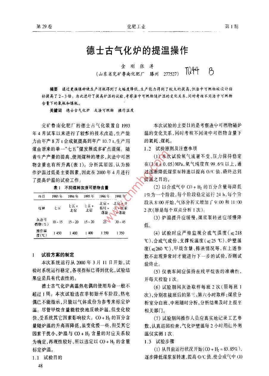 第29卷化肥工業(yè)第1期德士古氣化爐的提溫操作金剛張濤(山東省兗礦魯南化肥廠滕州277527)TQ44 B摘要通過更換煤種使生產(chǎn)消耗得到了大幅度降低,生產(chǎn)能力得到了較大的提高,但渣中可燃物較設(shè)計指標提高了2-3倍。為此進行了提高爐溫的試驗,考察渣中可燃物隨爐溫的變化關(guān)系。同時考核不同渣中可燃物含量下的氧耗和謀耗。關(guān)鍵詞德士古氣化爐 灰渣可燃物 操作溫度兗礦魯南化肥廠的德士古氣化裝置自1993本次試驗的主要日的是考察渣中可燃物隨爐年4月試車以來進行了較多的技術(shù)改造,生產(chǎn)能溫的變化關(guān)系.同時考核不同淹中可燃物含量下力由年產(chǎn)8萬t合成氨提高到年產(chǎn)10.71,生產(chǎn)用的氧耗、煤耗。煤由原來的單一“七五”煤發(fā)展成多礦點混煤、 隨1.2 試驗原則及注意事項著生產(chǎn)產(chǎn)量的提高使用煤種的增多,灰渣中可燃(1)本次試驗氧氣流量不變、壓力保持穩(wěn)定物含量也有所升高(表1)。分析其原因,認為操在(3.8+0.05)MPa,氧氣純度在99. 6%以上,通作爐溫過低是主要因素,因此在2000年4月進行過逐漸降低煤漿泵轉(zhuǎn)速以提高0/C值最終達到了提高爐溫的試驗工作:提溫之月的。表1不同煤種灰渣可燃物含 l(2)以合成氣中C0+ H2的百分含量每降低項目1993年 1994年 1995年 1996年 1998年1%為一個階段,每個階段穩(wěn)定運行24 h,每個價燦種七五+七i+北省+井段從8:00開始,氣體分析又增加廣9:00和11:00北宿北落陵: +落陵2次(原是每個雙點分析I次):從渣可(3)爐溫提升應緩慢,煤漿泵轉(zhuǎn)速應緩慢降燃物(2)10-15 15-20 15-202S30~45低。度(心)1450 1400 I 4001350 1 350(4)試驗時應嚴格監(jiān)視合成氣溫度(≤218C)、合成氣成份、支撐板溫度(≤25 C)、爐壁溫度(≤260 C)、甲烷含量、排渣情況等,在上述參1試驗方 案的制定數(shù)不出現(xiàn)異常時才能進行下一步的試驗,否則試本次系統(tǒng)運行從2000年3月11日開始,試驗終止驗時系統(tǒng)運行穩(wěn)定,各項指標已得到優(yōu)化,試驗結(jié)(5)儀表車間應保持在線甲烷表的準確性,果應是具有代表性的。并每天校驗1次:德士古氣化爐高溫熱電偶的使用壽命一般不(6)試驗期間灰渣取樣每班2次(原每班1超過1周。本次試驗選在非初始開車階段,熱電次),分別在接班后的第三<第六小時取樣;煤質(zhì)分偶已不能指示,只能以氣體成份為參考來標定爐析室分白班、中班隨時分析,分析結(jié)果及時上報至溫。盡管甲烷含量能較快地反映爐溫,但變化較相關(guān)部門???受系統(tǒng)其它因素影響較大。C0+ H的百分含(7)試驗期間操作人員應真實地記錄工藝參量隨爐溫的升高而降低,雖變化慢-些,但受其它數(shù),認真巡回檢查,氣化爐壁溫每2小時用紅外測因素干擾小,爐溫與C0+H2含量的對應關(guān)系較溫儀實測1次:為確定,再現(xiàn)性較好,所以選定以C0+H2的含量1.3試驗步驟標定爐溫。(1)從月前運行狀況開始(C0+ H2=83.85%),1.1 試驗月的逐步降低煤漿泵轉(zhuǎn)速,提高0/C值.使合成氣中0048第29卷化肥工業(yè)第1期+ H2的含量為82% ~ 83%。(5)分析渣中可燃物,如果含量降至20%,試(2)第二階段再降低煤漿泵的轉(zhuǎn)速,使臺成驗結(jié)束并恢復原工況。氣中CO+ H2的含量為81% ~ 82%。(3)第三階段再降低煤漿泵的轉(zhuǎn)速,使合成2試驗情況介紹氣中CO+ H的含量為80% ~ 81%。2.1試驗過程 .(4)第四階段再降低煤漿泵的轉(zhuǎn)速,使合成(1)第一階段4月5日8:00開始提爐溫至氣中C0+ H2的含量為79% ~ 80%。10:00基本調(diào)整完畢,目標值是C0+ H2的含量為表2試驗前后數(shù)據(jù)對比82%~83%并維持2h穩(wěn)定運行。①試驗前②第一③第二同比增加同比增加(2)第二階段4月6日8:00開始提爐溫至項目平均值階段階段° ②-① 3-①10:00調(diào)整完畢,目標值CO+ H2含量為81% ~C0+H(%) 83.8582.70 81.84-1.15 -2.0C02(%) 15.9416.95 17.74 +1.01 +1.8082%,但因6日15:00跳車而停止試驗。2.2數(shù)據(jù)對比6259(x10-%)試驗前后數(shù)據(jù)對比見表2cH產(chǎn)量328.25 328.18 329.62 -0.07 +1.37煤氣產(chǎn)量873.35 882.70 887.40 +9.35 +14.053試驗結(jié)果CO+H:產(chǎn)員(1)操作爐溫的確定依據(jù)是煤的灰熔點,一732.3730.0 726.3 -2.3 - 6.0(km'/d)般在煤的灰熔點FT以上50 C左右。由于所使用.總耗鋇國(km'/d.標態(tài))263.9264,8 267.2 +0.9 +3.3的煤的灰熔點較低,所以爐溫也較低,試驗過程中總投煤漿量520.2 506.7 494.5 -13.5 -25.7高出正常爐溫約100 C,具有較大的風險性。(n2/d)比氧耗[m2/(2)本次試驗雖然只進行了2個階段即被終I 00m(Co+ 360.4 362.7 367.9 +2.3 +7.5止,但從數(shù)據(jù)上看已顯示出趨向性。H:),標態(tài)](3)從表2可以看出,在其它條件不變的情比故耗[kg/1000m 565.3 554.0 541.0 -11.3 -24.3況下(氧氣流量、煤漿濃度、產(chǎn)氨量),提高爐溫,比.(CO+ H)]氧耗增加,比煤耗降低,灰渣可燃物降低。1 000 .江氣串(xr煤氣1679.0 1742.0 1794.5 +63 +11s.5m(CO+ H2)多耗氧分別為2.3 m?(標態(tài))和7.5/m2煤漿)m(標態(tài)),1 000 m2(CO+ H)少耗煤分別為11.3平均煤漿66.32 66.51 66.21 +0.19 -0.11kg和24.3kg。由此可見,提高爐溫能提高煤的利濃度(%)長渣可用率,降低生產(chǎn)成本,但還要綜合考慮比氧耗的增燃物(%)43.96 36.47 31.83 -7.49 -12.13加和耐火磚的壽命等-系列因素。,折算成24h(收稿日期2001- 10-08)新型低溫甲醇催化劑交聯(lián)速度,生成較傳統(tǒng)催化劑活性表面積更大、熱-種操作溫度較傳統(tǒng)工業(yè)催化劑低100C的穩(wěn)定性更高的凝結(jié)物