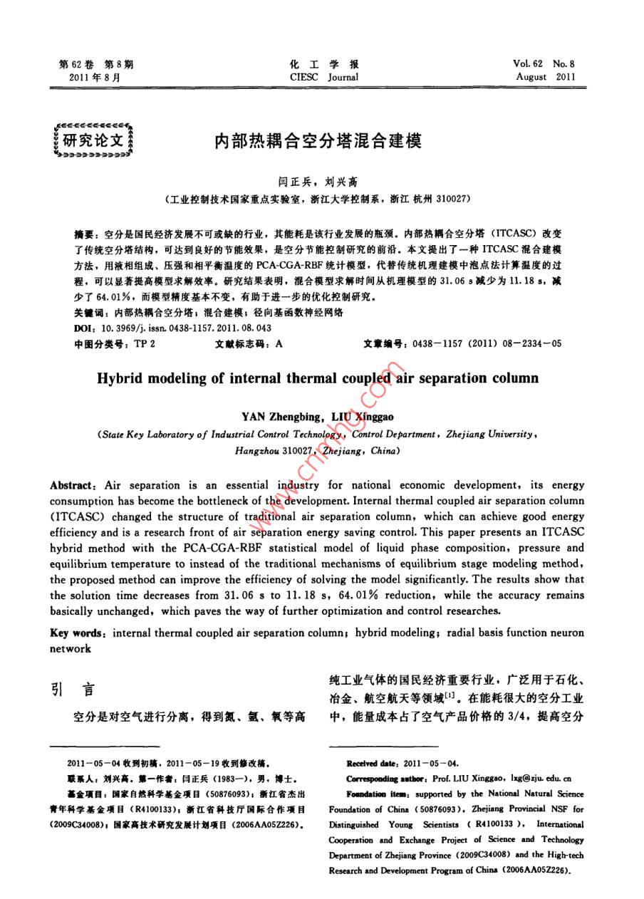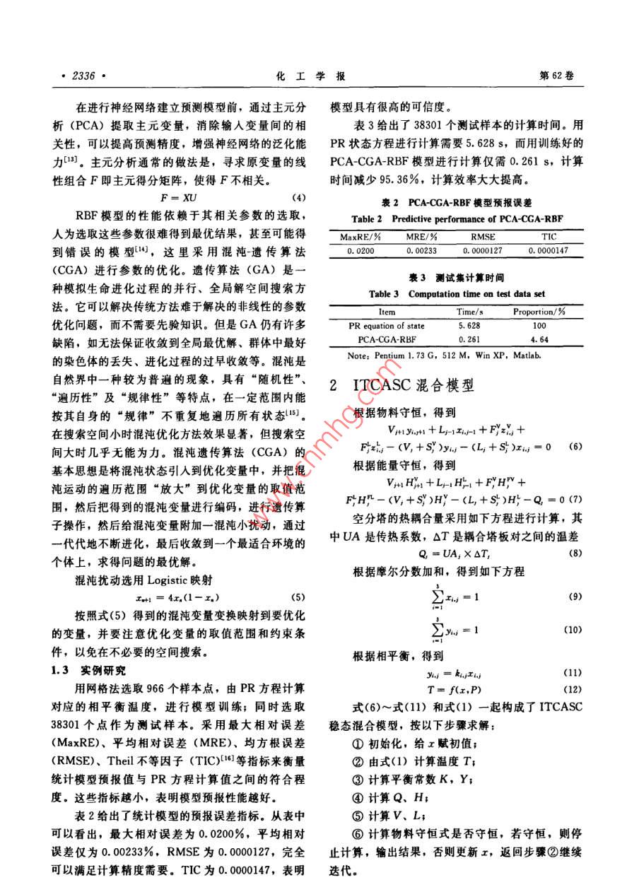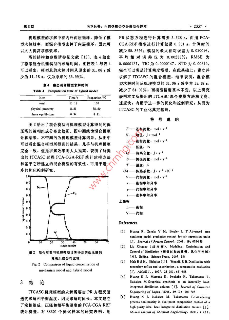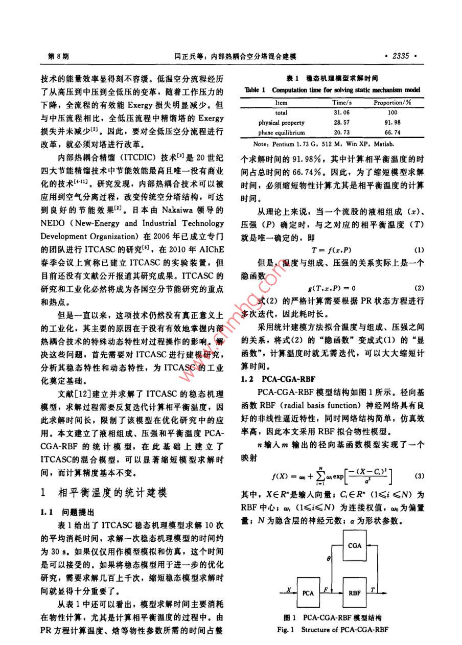 第62卷第8期化工學報Vol. 62 No 82011年8月CIESC JournalAugust 2011研究論文內部熱耦合空分塔混合建模閆正兵,劉興高(工業(yè)控制技術國家重點實驗室,浙江大學控制系,浙江杭州310027)摘要:空分是國民經濟發(fā)展不可或缺的行業(yè),其能耗是該行業(yè)發(fā)展的瓶頸。內部熱耦合空分塔( ITCASC)改變了傳統(tǒng)空分塔結構,可達到良好的節(jié)能效果,是空分節(jié)能控制研究的前沿。本文提出了一種 ITCASC混合建模方法,用液相組成、壓強和相平衡溫度的 PCA-CGA-RBF統(tǒng)計模型,代替?zhèn)鹘y(tǒng)機理建模中泡點法計算溫度的過程,可以顯著提高模型求解效率。研究結果表明,混合模型求解時間從機理模型的31.06s減少為1.18s,減少了64.01%,而模型精度基本不變,有助于進一步的優(yōu)化控制研究關鍵詞:內部熱耦合空分塔;混合建模;徑向基函數神經網絡DoI;10.3969/ ]. Issn.0438-1157.2011.08.043中圖分類號:TP2文獻標志碼:A文章編號:0438-1157(2011)08-2334-05Hybrid modeling of internal thermal coupled air separation columnYAN Zhengbing, LIU Xinggao(State Key Laboratory of Industrial Control Technology, Control Department, Zhejiang University,ChinaAbstract: Air separation is an essential industry for national economic development, its energyconsumption has become the bottleneck of the development. Internal thermal coupled air separation column(ITCASC)changed the structure of traditional air separation column, which can achieve good energyefficiency and is a research front of air separation energy saving control. This paper presents an ITCASChybrid method with the PCA-CGA-RBF statistical model of liquid phase composition, pressure andequilibrium temperature to instead of the traditional mechanisms of equilibrium stage modeling methodthe proposed method can improve the efficiency of solving the model significantly. The results show thatthe solution time decreases from 31.06 s to 11 18 s, 64.01% reduction, while the accuracy remainsbasically unchanged, which paves the way of further optimization and control researches.Key words: internal thermal coupled air separation column: hybrid modeling: radial basis function neuron引言純工業(yè)氣體的國民經濟重要行業(yè),廣泛用于石化冶金、航空航天等領域(。在能耗很大的空分工業(yè)空分是對空氣進行分離,得到氮、氬、氧等高中,能量成本占了空氣產品價格的3/4,提高空分2011-05-04收到初稿,2011-05-19收到修改稿Received date: 2011-05-04.聯系人:劉興高.第一作者:閆正兵(1983-),男,博士Correspondinganthor:Prof.LIUXinggao,Ixg@zjuedu.cn基金項目:國家自然科學基金項目(50876093);浙江省杰出Foundation item: supported by the National Natural Science青年科學基金項目(R4100133);衝江省科技廳國際合作項目 Foundation of China(50876093), Zhejiang Provincial NSF for2009c34008);國家高技術研究發(fā)展計劃項目(2006AA0526), Distinguished Young Scientists(R4100133), intermationalDepartment of Zhejiang Province(2009C34008)and the High-techResearch and Development Program of China (2006AA05Z226)第8期同正兵等:內部熱耦合空分塔混合建模技術的能量效率顯得刻不容緩。低溫空分流程經歷衰1穩(wěn)態(tài)機理模型求解時間了從高壓到中壓到全低壓的變革,隨著工作壓力的be1 Computation time for solving static mechanism m下降,全流程的有效能 Exergy損失明顯減少。但Time/sropo與中壓流程相比,全低壓流程中精餾塔的 Exergyphysical property28.579】.98損失并未減少口。因此,要對全低壓空分流程進行phase equilibrium20.7366.74改革,就必須對塔進行改革Note: Pentium 1.73 G, 512 M, Win XP. Matlab.內部熱耦合精餾( ITCDIC)技術是20世紀個求解時間的91.98%,其中計算相平衡溫度的時四大節(jié)能精餾技術中節(jié)能效能最高且唯一沒有商業(yè)間占總時間的6674%。因此,為了縮短模型求解化的技術41.研究發(fā)現,內部熱耦合技術可以被時間,必須縮短物性計算尤其是相平衡溫度的計算應用到空氣分離過程,改變傳統(tǒng)空分塔結構,可達時間到良好的節(jié)能效果2。日本由 Nakaiwa領導的從理論上來說,當一個流股的液相組成(x)NEDO( New-Energy and Industrial Technology壓強(P)確定時,與之對應的相平衡溫度(T)Development Organization)在2006年已成立專門就是唯一確定的,即的團隊進行 ITCASC的研究,在2010年AChET=f(r, P)春季會議上宜稱已建立 ITCASC的實驗裝置,但但是,溫度與組成、壓強的關系實際上是一個目前還沒有文獻公開報道其研究成果。 ITCASC的隱函數研究和工業(yè)化必然將成為各國空分節(jié)能研究的重點g(T,I, P)=0和熱點。式(2)的嚴格計算需要根據PR狀態(tài)方程進行但是一直以來,這項技術仍然沒有真正意義上多次迭代,因此耗時長。的工業(yè)化,其主要的原因在于沒有有效地掌握內部釆用統(tǒng)計建模方法擬合溫度與組成、壓強之間熱耦合技術的特殊動態(tài)特性對過程操作的影響。解的關系,將式(2)的“隱函數”變成式(1)的“顯決這些問題,首先需要對 ITCASC進行建模研究,函數”,計算溫度時就無需迭代,可以大大編短計分析其穩(wěn)態(tài)特性和動態(tài)特性,為 ITCASC的工業(yè)算時間?;於ɑA1. 2 PCA-CGA-RBF文獻[12]建立并求解了 ITCASC的穩(wěn)態(tài)機理PCA-CGA-RBF模型結構如圖1所示。徑向基模型,求解過程需要反復迭代計算相平衡溫度,因函數RBF( radial basis function)神經網絡具有良此求解時間長,限制了該模型在優(yōu)化研究中的應好的非線性逼近特性,同時網絡結構簡單,仿真效用。本文建立了液相組成、壓強和平衡溫度PCA-率高,因此本文采用RBF擬合物性模型