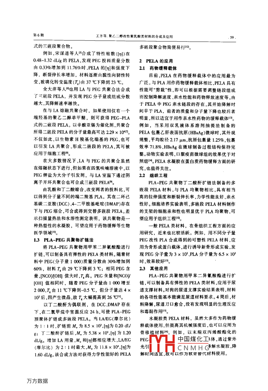 綜述合成樹脂及憋料,2003.20(6):58CHINA SYNTHETIC RESIN AND PLASTICS聚乙二醇改性聚乳酸類材料的合成及應(yīng)用*汪朝陽1.2趙耀明“(1.華南理工大學(xué)材料學(xué)院,廣州,510640; 2. 華南師范大學(xué)化學(xué)系,廣州, 510631)摘要:介紹了丙交酯與環(huán)氧乙烷開環(huán)共秦合.丙交酯與秦乙二醇(PEC)開環(huán)共聚合.以及在其基礎(chǔ)t的擴(kuò)鏈3種主要的聚乙二醇改性秦乳酸(PELA)合成方法,井慨括了各種PELA合成材料的性能與應(yīng)用。為了得到功能化和親水性理想的聚乳酸類生物降解商分子,聚乳酸樹脂的PEG改性合成工作越來越引人注目。以PEC、乳酸等為原料,通過簡單易行的直接聚合法合成PELA類材料,降低PELA類材料的成本,是未來研究的重要方向。關(guān)鍵詞:聚乳酸類生物降解高分子 聚乙二醉 改性合成開環(huán)聚合直接聚合聚乳酸(PLA)是一種生物降解高分子,具有.要另加偶聯(lián)劑,因此,其應(yīng)用目前很少。最近,也有良好的生物相容性。其合成原料乳酸來自于天然利用乳酸直接聚 合法合成PELA類材料的報道。的可再生資源一淀粉發(fā)酵, 對可持續(xù)發(fā)展具有1.1 LA 與EO開環(huán)共聚合法.重要意義,其研究受到廣泛關(guān)注.1。但是,PLA存.LA與EO的開環(huán)共聚合通常在甲苯溶液中在親水性不足、官能團(tuán)單一等缺點(diǎn),因此,近年來進(jìn)行,以錫、鋁有機(jī)金屬催化劑催化,獲得的對PLA的功能化與親水性改性進(jìn)行了探索,合成PELA為多嵌段共聚物。但如果以萘鉀.3,3-二乙了許多新型的PLA類生物降解高分子21。氧基丙醇為引發(fā)體系,采用逐步陰離子聚合法,先聚乙二醇(PEG)既溶于水又溶于有機(jī)溶劑,使EO開環(huán)變成末端活性的聚環(huán)氧乙烷大陰離具有較好的兩親性以及良好的生物相容性,端基子,再引發(fā)LA開環(huán)聚合,則可以得到PEG-PLA可以進(jìn)一步反應(yīng)合成新的化合物。另外,PEG分二嵌段的PELAIH。子量范圍廣,選擇余地大,并被美國聯(lián)邦藥品管理在上述二嵌段的PELA中,PEG末段的縮醛局批準(zhǔn)可用于人體田。因此,作為最常用的PLA改.結(jié)構(gòu)在酸性溶液中易轉(zhuǎn)變?yōu)槿┗?。醛基可以與蛋性手段之一,聚乙二醇改性聚乳酸(PELA)的合成白質(zhì)等分子中的氨基反應(yīng)而鍵合。因此,這種特殊與應(yīng)用研究日益受到重視。的二嵌段PELA,能在水相中充分發(fā)揮PEG鏈段最近,隨著研究的深入,PELA的合成新方阻抗非特異性蛋白的作用,或?qū)⑷┗M(jìn)行其他轉(zhuǎn)法、材料新類型和新應(yīng)用層出不窮。本文對近年來變而進(jìn)--步改善材料的性能{。PELA的合成及應(yīng)用進(jìn)展進(jìn)行了綜述。1.2LA與PEG共聚合法由于PEG的處理使用比EO更方便安全,1 PELA 的合成方法因此LA與PEG共聚合法在PELA的合成中更為PELA的合成方法通常有3種:(1)丙交酯常用。此時,合成的PELA一般為PLA-PEG PLA(LA)與生成PEG的單體環(huán)氧乙烷(EO)共聚合;(2) LA與PEG共聚合;(3)在各種PLA-PEC共收稿日期: 2003-06-24。聚物基礎(chǔ)上用二異氰酸酯、二酸酐.不飽和鍵光照修改稿收到日期: 2003- 08-16。華南理T.大學(xué)在讀研交聯(lián)聚合等擴(kuò)鏈?zhǔn)侄芜M(jìn)一步提高分子量。中國煤化工的合成研究。其中,應(yīng)用最多的是第二種合成方法,即用DHCNMHG8851。PEG等引發(fā)LA進(jìn)行開環(huán)聚合。當(dāng)然,制備PELA,通訊聯(lián)系人。聯(lián)系電話:(020)87113644; E -mail:也可以將PLA與PEG進(jìn)行共混,但效果較差,需psymzhao@scut.edu.cno第6期.工方等.聚厶二醇改性聚乳酸類材料的合成及應(yīng)用9,式的三嵌段聚合物。多嵌段聚合物簡便易行四。例如,宋謀道等人哈成了特性粘數(shù)([m)在0.48-1.32 dLUg的PELA,發(fā)現(xiàn)PEG投料質(zhì)量分?jǐn)?shù)2 PELA 的應(yīng)用由0.33%增加到11.76%時,PELA的[n]和強(qiáng)度下2.1藥物縵釋載體降,斷裂伸長率增加,材料逐漸由脆性向韌性轉(zhuǎn)目前,PELA在藥物緩釋載體中的應(yīng)用最為.變,玻璃化轉(zhuǎn)變溫度(T)由37 C下降到23 C。廣泛。與PLA用作藥物緩釋載體相比, PELA具有全大萍等人問也用LA與PEG共聚合法合成性能可"剪裁"性,即可以根據(jù)需要調(diào)整鏈段組成了三嵌段PELA,并發(fā)現(xiàn)PEG分子量或組成分?jǐn)?shù)而控制降解速度、親水性能和藥物釋放速度等。由越大,其降解速率越快。于PELA中PEG親水鏈段的存在,其開始降解時在與LA熔融共聚合時,如果使用僅有一個間早于PLA,前者的質(zhì)量和分子量下降也較后者端羥基的聚乙二醇單甲醚,則可獲得PEG -PLA明顯,所以適宜于用作親水性藥物的緩釋載體網(wǎng)。式的二嵌段PELA。以辛酸亞錫為催化劑,共聚合例如,當(dāng)采用雙乳液體系溶劑抽提法制備的所得二嵌段PELA的分子量最高可達(dá)2.29 x 104m7。PELA包裹乙肝表面抗原(HBsAg)微球時,其外觀不僅如此,以生物素H羧基化端基的PEC,也可規(guī)整,平均粒徑2.17 μm,抗原包裏量1.25%,包裹以引發(fā)LA共聚合,形成二嵌段的PELA,其可被效率71.8%,HBsAg在微球制備過程結(jié)構(gòu)保持完應(yīng)用于細(xì)胞工程圖。整動物實(shí)驗表明,口服疫苗微球組的效果優(yōu)于對在大多數(shù)情況下,LA與PEG的共聚合雖然照組叫。PELA水凝膠在蛋白質(zhì)藥物緩釋方面的研在熔融狀態(tài)下進(jìn)行,但如果在四氫呋喃溶液中,以究,也值得關(guān)注。PEG鉀鹽為大分子引發(fā)劑,與LA室溫下通過陰2.2 組織工程離子開環(huán)