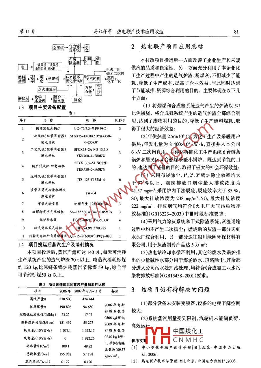 第29卷第11期石油化工應(yīng)用Vol 29 No 112010年11月PETROCHEMICAL INDUSTRY APPLICATIONNov.2010熱電聯(lián)產(chǎn)技術(shù)應(yīng)用改造馬紅萍,邢雅愛(ài)(寧夏開(kāi)元豐友化工股份有限公司,寧夏銀川750021)摘要:熱電聯(lián)產(chǎn)技術(shù)改造在煤化工生產(chǎn)企業(yè)中的應(yīng)用,通過(guò)以新帶老的方式,不但達(dá)到了節(jié)能降耗的目的,而且取得了極大的經(jīng)濟(jì)效益和社會(huì)環(huán)保效益。關(guān)鍵詞:熱電聯(lián)產(chǎn);節(jié)能降耗中圖分類(lèi)號(hào):TM621文獻(xiàn)標(biāo)識(shí)碼:B文章編號(hào):1673-5285(20101-0080-02本公司公司是一家以無(wú)煙煤為原料生產(chǎn)尿素的循環(huán)流化床鍋爐是一種新?tīng)t型,主要由給料系統(tǒng)中型氮肥企業(yè),公司先后通過(guò)兩次大規(guī)模擴(kuò)能降耗技循環(huán)床(主床)、燃燒室、高溫再循環(huán)物料分離器和循環(huán)術(shù)改造,現(xiàn)有裝置生產(chǎn)能力為年產(chǎn)合成氨14萬(wàn)t,尿物料返回系統(tǒng)組成。高速氣流使燃料顆粒、石灰石粉與素23萬(wàn)t。公司供熱系統(tǒng)由6臺(tái)20th的鏈條爐供灰形成流態(tài)化的固態(tài)化床層在循環(huán)床內(nèi)強(qiáng)烈擾動(dòng),增給,先期建設(shè)的4臺(tái)鍋爐已使用39年,后期續(xù)運(yùn)也有加了燃料燃燒時(shí)間,其燃燒效率可達(dá)%6%以上,鍋爐26年設(shè)備陳舊老化燃燒效率低于80%熱效率低熱效率達(dá)85%以上,且燃料適應(yīng)性廣。本項(xiàng)目充分利于0%,環(huán)保裝置為簡(jiǎn)易的水膜除塵,除渣釆用水力用煙煤摻燒造氣爐渣作為鍋爐燃料,從而消除了固體沖渣系統(tǒng),主要污染物SO2煙塵不能穩(wěn)定達(dá)標(biāo)排放。廢渣的堆放及環(huán)境污染。合成氨裝置造氣系統(tǒng)每天產(chǎn)生造氣爐渣100t(低位為滿(mǎn)足鍋爐環(huán)保排放要求,采用爐內(nèi)脫硫方式,即發(fā)熱值7220kJ^kg)、粉煤灰25t(低位發(fā)熱值28由正壓濃相氣力輸送系統(tǒng)向燃燒室內(nèi)添石灰石粉作為515kJ/kg);每年產(chǎn)生的灰、渣4.1萬(wàn)t,同時(shí)6臺(tái)鏈脫硫劑,石灰石粉既用作脫硫又起到循環(huán)物料作用。煙條鍋爐每天產(chǎn)生的爐渣約150t。若不進(jìn)行綜合利氣除塵采用除塵效率可達(dá)98%以上的脈沖式布袋除塵用,既對(duì)環(huán)境造成污染,又造成資源浪費(fèi),也造成二器;除塵器和尾部煙道的排灰由正壓氣力輸送系統(tǒng)輸送次堆積污染至灰?guī)?爐渣經(jīng)冷渣器冷卻后,由皮帶輸送至中轉(zhuǎn)渣庫(kù)。1熱電聯(lián)產(chǎn)技術(shù)改造項(xiàng)目介紹儲(chǔ)存在中轉(zhuǎn)渣庫(kù)內(nèi)的渣和灰?guī)靸?nèi)的灰,及時(shí)轉(zhuǎn)運(yùn)至水泥廠(chǎng)和制磚廠(chǎng)綜合利用,灰?guī)?、渣?kù)頂部均設(shè)小型的高效公司資源綜合利用熱電聯(lián)產(chǎn)項(xiàng)目原設(shè)計(jì)為4臺(tái)75t脈沖式布袋除塵器以防輸送灰渣過(guò)程中產(chǎn)生二次環(huán)境循環(huán)流化床鍋爐配套1臺(tái)2MW和1臺(tái)6MW抽汽背污染。壓汽輪發(fā)電機(jī)組,以滿(mǎn)足公司生產(chǎn)規(guī)模達(dá)到18萬(wàn)t合成根據(jù)公司化工生產(chǎn)用汽量大,系統(tǒng)用蒸汽壓力等級(jí)氨、30萬(wàn)t尿素的供熱和用汽需求。本期建設(shè)3臺(tái)75不同的特點(diǎn)采用抽汽背壓式發(fā)電機(jī)組。鍋爐產(chǎn)生的次UC-753-M19型循環(huán)流化床鍋爐配套1臺(tái)CB1249高溫次髙壓蒸汽供汽輪發(fā)電機(jī)組發(fā)電。抽凝機(jī)產(chǎn)生的1570785抽汽背壓汽輪發(fā)電機(jī)組附屬設(shè)施有點(diǎn)火油泵0785MPa抽汽與抽背機(jī)排汽并網(wǎng)后外供04-06MPa房、煤庫(kù)、碎煤樓、石灰石粉庫(kù)、灰?guī)?、渣倉(cāng)、煙囪、空壓站、熱用戶(hù)用汽,抽背機(jī)抽汽外供1.3MPa熱用戶(hù)用汽,從化學(xué)水處理等。而實(shí)現(xiàn)了能量梯級(jí)利用1.1項(xiàng)目要點(diǎn)介紹1.2T中國(guó)煤化工CNMHG收稿日期:2010-10-10修回日期:2010-10-16作者簡(jiǎn)介:馬紅萍,女(1977-),1999年畢業(yè)于湖北武漢化工學(xué)院無(wú)機(jī)化工專(zhuān)業(yè),工學(xué)學(xué)士,化工工程師,從事煤化工工程技術(shù)工作;郵箱:nxma@163com第11期馬紅萍等熱電聯(lián)產(chǎn)技術(shù)應(yīng)用改造2熱電聯(lián)產(chǎn)項(xiàng)目應(yīng)用總結(jié)本技改項(xiàng)目投運(yùn)后一方面改善了企業(yè)生產(chǎn)和采暖米次網(wǎng)工生產(chǎn)過(guò)程中產(chǎn)生的造氣爐渣粉煤灰不但減少了能供汽的品質(zhì)和穩(wěn)定性,另一方面充分利用了本企業(yè)化耗、降低了生產(chǎn)成本,提高了企業(yè)效益,與此同時(shí)達(dá)到點(diǎn)火油泵房了節(jié)能減排、資源綜合利用的目的。主要體現(xiàn)在以下幾渣倉(cāng)個(gè)方面13項(xiàng)目主要設(shè)備配置(1)將煙煤和合成氨系統(tǒng)造氣產(chǎn)生的爐渣以5:1比例摻燒,將合成氨系統(tǒng)產(chǎn)生的造氣爐渣全部綜合利序號(hào)數(shù)量臺(tái)用,達(dá)到了廢物利用的目的,降低了生產(chǎn)燃料煤耗,取循環(huán)流化床鍋爐UG-753-M19(98G)3得了很大的經(jīng)濟(jì)效益;次風(fēng)機(jī)(配帶消音器)SFGX75-NO|8.5DYKK450-2)年供熱量256×10GJ,為化工生產(chǎn)及采暖用戶(hù)附電動(dòng)機(jī)供熱;年發(fā)電量為8400×104kW·h,直接并入本公司二次風(fēng)機(jī)(配帶消音器)SFCX75-2ANO13.6D6kV二次網(wǎng)