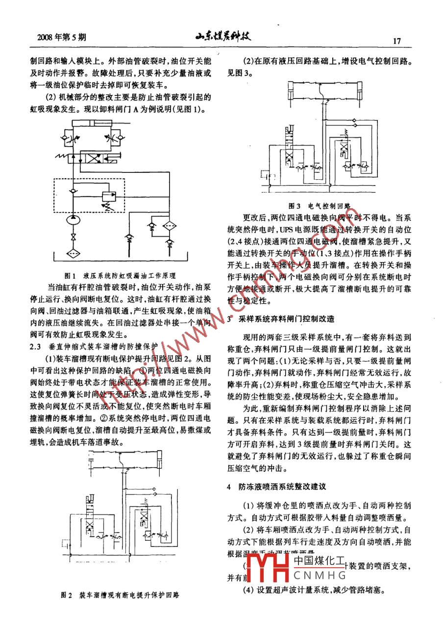 16∽東科墳2008年第5期KSS快速裝車糸統(tǒng)的改造宋志光(神華集團準格爾能源公司選煤廠,內(nèi)蒙古準格爾010900)關鍵詞快速裝車系統(tǒng)棄料閘門采樣系統(tǒng)中圖分類號TD53文獻標識碼BKSs快速裝車系統(tǒng)是準格爾能源公司上世紀90年代初引進的新型列車裝載系統(tǒng)。隨著公司的發(fā)展.2快速裝車系統(tǒng)整改措施選煤廠裝車外運量逐年增加,對裝車系統(tǒng)的穩(wěn)定性及2.1液壓系統(tǒng)油溫保護可靠性提出更高要求。現(xiàn)有油溫保護是現(xiàn)場手動控制的風冷散熱裝置,1快速裝車系統(tǒng)不能根據(jù)實際油溫自動啟停,運行狀況也不能實時監(jiān)控。對此,將其改造為具有實時油溫監(jiān)測并根據(jù)設定工藝流程上,現(xiàn)用的兩套KSS系統(tǒng)主要由重型鋼油溫自動啟停的風冷散熱裝置。結(jié)構支撐架系統(tǒng)、緩沖倉、稱重倉、裝車溜槽、配料稱重在油箱上加裝一套溫度變送器并將變送器輸出的系統(tǒng)、液壓控制系統(tǒng)、配電和自動控制系統(tǒng)、三級采樣4~20mA信號接入模擬量輸人模塊。當實際油溫高及防凍液噴灑系統(tǒng)構成。目前,影響裝車系統(tǒng)穩(wěn)定性于設定值時,過濾泵和散熱風扇啟動散熱;當油溫降至與可靠性的問題主要表現(xiàn)在以下幾方面。停止值時,過濾泵和散熱風扇自動停止。取散熱風扇(1)液壓系統(tǒng)中沒有完善的油位、油溫保護裝置,與過濾泵的運行信號作為散熱器的運行指示;過載保不能有效控制高油溫、低油位故障的發(fā)生。護信號作為散熱器的故障指示。這樣,散熱器的實際(2)垂直伸縮式裝車溜槽斷電提升保護的可靠性狀況就被實時監(jiān)控起來提高了穩(wěn)定性和可靠性。低,不能避免溜槽被撞或減少撒煤埋軌事故的發(fā)生2.2液壓系統(tǒng)低油位保護3)三級采樣系統(tǒng)棄料閘門控制不合理,無效運現(xiàn)用油位、油溫開關實現(xiàn)低油位保護。為監(jiān)測到行時間長、防塵性能差、故障率高。準確的油溫值,油位、油溫開關安在正常工作油位的中(4)防凍液噴灑系統(tǒng)自動化程度低、保護不齊全,部。外部油管破裂時,現(xiàn)有低油位保護裝置既不能及故障率高,影響裝車。時動作又不能防止虹吸現(xiàn)象發(fā)生,使油液大量外泄,系統(tǒng)恢復正常工作的時間變長,影響裝車外運。對此,分收稿日期:2008-05-13兩方面對現(xiàn)有低油位保護裝置整改。作者簡介:宋志光(1970-),男,內(nèi)蒙古赤峰人,助理工程師電力(1)電氣系統(tǒng)。油箱上另加一套油位開關,裝在統(tǒng)及自動化工程專業(yè),從事機電設備管理工作多年。194年畢業(yè)正常工作油位下50mm處,將其觸點分別接到主泵控于內(nèi)蒙古煤校礦山機電,205年畢業(yè)于太原理工大學“內(nèi)應力場”范圍支承壓力高峰隨采場推進擴展延伸,中,鉆桿拔出后,鉆孔直徑在8h內(nèi)變形嚴重部分被壓以此判斷可能發(fā)生沖擊地壓的起點、終點,有足夠的實,證明了煤層中壓力在一定程度上得到了釋放。內(nèi)應力場”寬度作為緩沖區(qū)。根據(jù)其位置以及危險區(qū)3結(jié)語的全長,判斷超前巷道中可能發(fā)生沖擊破壞的范圍。(3)現(xiàn)場觀測:在距工作面20-30m范圍內(nèi),巷道利用綜合機械配套設備回采煤柱月產(chǎn)原煤3~4.5兩幫經(jīng)常出現(xiàn)片幫此范圍內(nèi)經(jīng)常有頂板來壓的劇烈萬t提高了礦井的煤炭回收率。釆用綜采支架支護頂響動煤層內(nèi)應力較嚴重。該區(qū)域頂板下沉量達到10板適應了采場壓力強烈的特點,為工作人員的安全作mm/d。工作面集中通過腰巷和橫川時,壓力顯現(xiàn)較強業(yè)提供了保障。實踐證明,在工作面頂板的可靠支護烈,煤壁前方增壓區(qū)波及到50m范圍。為防止煤層發(fā)下,中國煤化工是可行的但必須考生煤體突出,在距工作面50m范圍內(nèi)采取向煤壁內(nèi)鉆慮孔卸壓,鉆機自工作面上下巷向煤壁內(nèi)打100m鉆力的LCNMHG島孤立煤柱受多應有可靠的施工措施孔,孔深15m,間距5.0m。卸壓鉆孔緩解了頂板整體防止煤層在回采過程中受回采壓力擾動造成集中應下沉對煤層的壓力,為內(nèi)應力提供了釋放空間。施工力的瞬間釋放。2008年第5期∽東埋科墳17制回路和輸入模塊上。外部油管破裂時,油位開關能2)在原有液壓回路基礎上,增設電氣控制回路。及時動作并報警。故障處理后,只要補充少量油液或見圖3。將一級油位保護臨時去掉即可恢復裝車。2)機械部分的整改主要是防止油管破裂引起的虹吸現(xiàn)象發(fā)生?,F(xiàn)以卸料閘門A為例說明(見圖1)。四圖3電氣控制回路更改后,兩位四通電磁換向閥平時不得電。當系統(tǒng)突然停電時,U電源既能通過轉(zhuǎn)換開關的自動位(2、4接點)接通兩位四通電磁閥,使溜槽緊急提升,又能通過轉(zhuǎn)換開關的手動位(1、3接點)作用在操作手柄開關上,由裝車操作人員提升溜槽。在轉(zhuǎn)換開關和操圖1液壓系統(tǒng)防虹吸漏油工作原理作手柄控制下,兩個電磁換向閥可分別在系統(tǒng)斷電時當油缸有桿腔油管破裂時油位開關動作,油泵方便地接通或斷開,極大提高了溜槽斷電提升的可靠停止運行、換向閥斷電復位。這時,油缸有桿腔通過換性與穩(wěn)定性。向閥、回油過濾器與油箱聯(lián)通,產(chǎn)生虹吸現(xiàn)象,使油箱內(nèi)的液壓油繼續(xù)流失。在回油過濾器處串接一個單向3采樣系統(tǒn