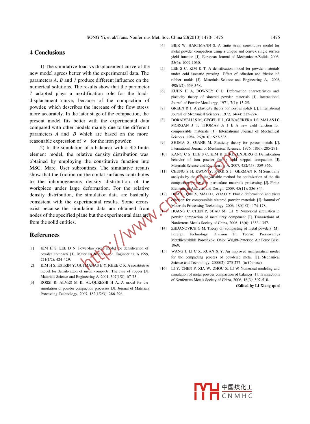Available online at www.sciencedirect.comTransactions ofPScienceDirectNonferrous MetalsScienceSociety of ChinaELSEVIER PressTrans. Nonferrous Met. Soc. China 20(2010) 1470-1475www.nmsc.cnImproved model and 3D simulation of densification process for iron powderSONG Yi(宋毅), LI Yuan-yuan(李元元), ZHOU Zhao-yao(周照耀),ZHENG Zhen-xing(鄭振興), CHEN Pu-qing(陳普慶)School of Mechanical and Automative Engineering, South China University of Technology, Guangzhou 510640, ChinaReceived 1 September 2009; accepted 2 February 2010Abstract: A new model for describing the compaction process of iron powder was proposed based on the continuum hypothesis andelliptical yield criterion. To simulate the densification behaviour, the constitutive model was implemented in M arc computer program.For the relationship between load and displacement, different models were compared and the influence of the parameters in theconstitutive equations was determined by means of simulation and experiments. The density distribution of a balancer was measuredand simulated. The results show that the parameter ? adopted plays a modification role for the load-displacement curve, andcompared with other models the present model fits better with the experimental data in the later stage of the compaction processmainly due to the different parameters A and B. The friction on the contact surface contributes to the inhomogeneous densitydistribution under large deformation of the workpiece. The comparison between the simulation and experimental data indicates thatthis model can be used to predict the powder compact process precisely and effectively.Key words: powder compaction; simulation; iron; density distribution; constitutive modelare based on the constitutive function of porous material1 Introductionwhich is not in accordance with the properties of thepowder material completely.Powder forming is a highly developed process ofA new constitutive relation under a general form ofmanufacturing ferrous matrix or ceramic matrixthe yield function with an ellipsoidal yield surface for thecomposite material products, which combines the costdensification process of iron powder during the coldand material saving advantages of conventional powdercompaction was reported which was put forward basedmetallurgy with the high production rates and propertyon the speciality of powder. The action mechanisms ofenhancement of forging. So me important factors, such asdifferent parameters in the yield function were analyzedpressure,temperature and strain rate, determine the in detail. And the finite element calculations derivedproduct quality. Therefore, these process factors shouldfrom user-subroutines of Marc were compared withexperimental data.experimental approaches to manufacture high strengthand accuracy parts with homogeneous density2 Constitutive modeldistribution[ 1-5].During the deep exploration of powder formingTaking into account of the influence of porosity andphenomenon, a number of constitutive models werehydrostatic pressure of porous materials, one generalproposed based on the hypothesis that powder wasform of the yield criterion isconsidered as a continuous, elasto-plastic, andcompressible medium With some classical ellipticalAJ2+B.J=ηsζ=s艮(1)yield equations[6- 9], they are commonly integrated withJ2 and J1 are the second invariant of deviatoricfinite element method (FEM) for the investigation ofstress tensor and the first invariant of stress tensor,metal powder. However, most of these models[10-12]respectively. Ss is the yield stress of the dense referenceFoundation item: Project(50325516) supported by the National Natural Science Foundation 0中國(guó)煤化工,rted by ChinaEatceanionana Keoearch undcConaond)i Froflet0onsp suporteaby the Natl IMYHCNMH G& Povince, ChinasCorresponding author: SONG Yi; Tel: +86-20-87112933; E-mail: songyi0591 @ gmail.comPgmail.comDOI: 10.1016/S1003-6326(09)60323-XSONG Yi, et al/Trans. Nonferrous Met. Soc. China 20(2010) 1470- 14751471material and SR is the flow stress of the porous material.η=(ρ°-pρ2)/l-ρ?)(8)The parameter ? is a function of relative density ? andrepresents contribution of geometric hardening. A and BIt produced better results with the experimental data. Inare the coefficients of the yield criterion which can bethis work, the elasto-plastic deformation of iron powderpresented as functions of material Poisson ratio vwith low initial density was analyzed and the yieldKUHN and DOWNEY[6], and DORAIVELU et al[8]criterion was put forward as follows:put forward the following functions:(1.86p+1.14)Ji +0.32(1-p)J}=(P -起3n=s民A=2(1+v ), B=(1-2v )/3(21-ρ(9)For the uniaxial stress condition, J1= σ1 ,J2=σ/3 and sp=s, i.e. A and B satisfy theDuring the compaction of powder material, thfollowing relationship :density is closely related to the plastic strain. The densityincreases gradually with the cumulation of plastic strainA/3+B=1(3and the property of material changes simultaneously. TheVarious relationships between V and ? wereevolution of density must follow the mass conservationproposed by many investigators[6, 8, 13]. According toequation and the relationship between relative densitythe experimental data, ZHDANOVICH[ 14] assumed thatand plastic strain is given as follows:v =0.5?"Po462l3ρ+Sp=(4 +?4)(2+?12)(l3+?13)KUHN and DOWNEY[6], and DORAIVELU eal[8] applied n=2 to the yield criterion. W ANG et al[15]Po4213=ρoexp(- eδ;)(10)adopted a linear relationship between V and ? for iron1123 exp(eBδo)powder material[15]:where ?o and (?+? ?) are the relative densities before andv =0.93?- 0.43(5after deformation, l; and (;+?l) are the dimensions of amicro -unit before and after deformation, and ε} is theCompared with KUHN's[6] formula by compactioncumulative logarithmic plastic strain. .experiments of iron powder, Eq.(5) fits better with theexperimental data. Therefore, Marx- Davies function was3 Three-dimensional FEM analysis andadopted in this work for the higher precisio