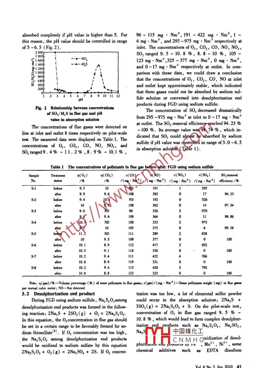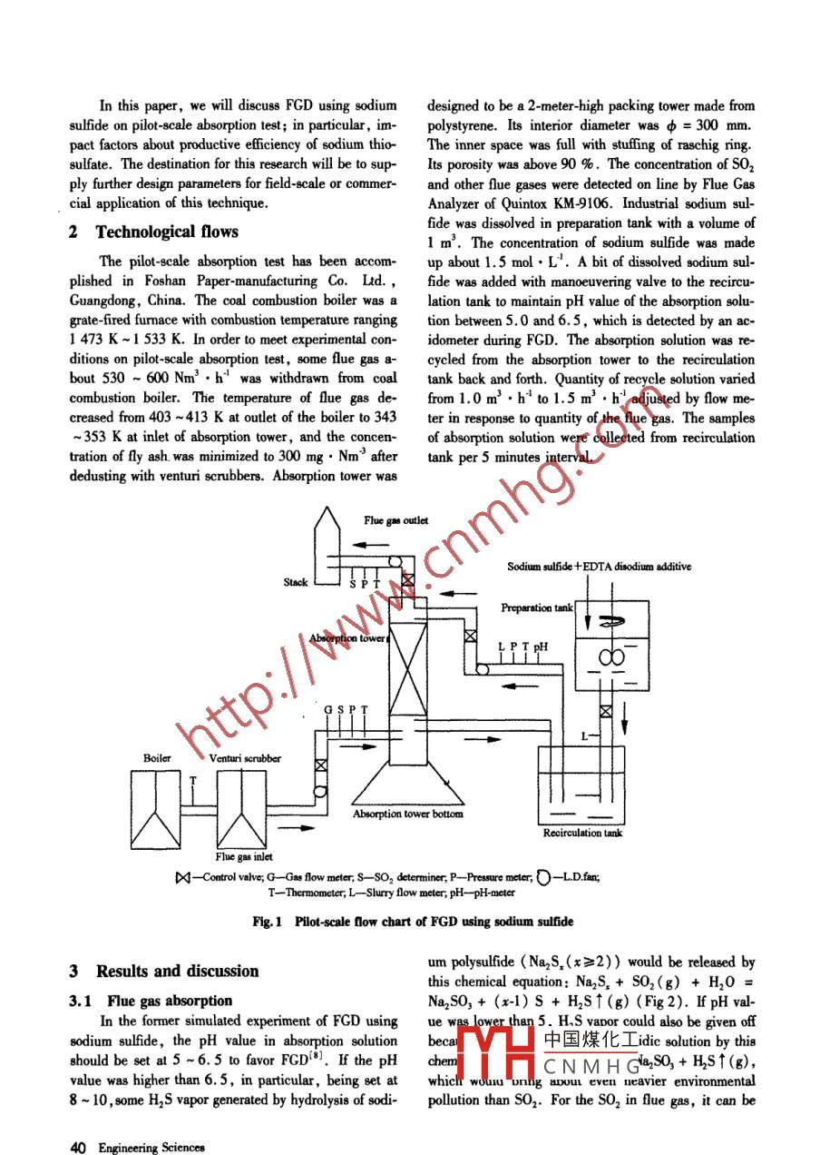 Flue gas desulphurization using sodiumsulfide on pilot scaleyu GuonangSchool of Environmental Science and Engineering, South China University of Technology, Guangghou 510640, China)Abstract: A novel technique of flue gas desulphurization( FGD) using industrial sodium sulfide as absorbent is de-scribed to remove SO, in flue gas. The FGD byproduct in this novel technique is sodium thiosulfate( Na2S,0,.5H,0Hypo )which can be used as chemical raw material. Optimal operating parameters about this technique have been determined. In order to enhance productive efficiency of sodium thiosulfate, EDTA disodium additive is added into absorptionsolution to prevent oxidation of sodium thiosulfate. Its optimal concentration is 0. 02 wt. % The pH value of absorptionsolution is set in the range of 5-6.5. Experimental results show that SO, removal efficiency averagely reach 98. 72%The highest productive efficiency of sodium thiosulfate reaches 83. 24 % The sodium thiosulfate formed during FGD cabe separated from saturated absorbent by filtration, concentration and crystallization. The filtrate after separating sodiumthiosulfate will be reused as SO, absorbent by replenishing some fresh sodium sulfideKey words: FGD; sodium sulfide; absorbents; sodium thiosulfate1 Introductionuation(46]. Meanwhile, the calcinations of limestonewill release tremendous amounts of carbon dioxide intoMost of flue gas desulphurization( FGD) technol- the atmosphere as a greenhouse gas, which is believedogies(S0, scrubbing technologies )in commercial ap- to cause global warming 71plication nowadays use calcareous compounds as soIt may be a novel FGD technique using sodiumesebents are mainly constituted sulfide to remove SO2 in flue gas. The sodium sulfideof limestone, calcium hydroxide and calcium oxide. possesses powerful absorbability for SO 2 because of itsThe limestone has plentiful resource in nature. It is strong alkalinity in water caused by hydrolysis of sodi-also convenient to be mined and conversed into calcium um sulfide. Hence, it is no doubt that FGD using sodi-hydroxide by calcinations and hydrationum sulfide could acquire higher removal efficiIn the past decade years, FGD technologies made The crucial problem to be solved is how to cona considerable progress in removal efficiency, reliabili- these different desulphurization end products into a sin-ty and costs. In particular, the limestone-gypsum gle chemical compound which could be purified or reprocess is the front-running FGD technologies. There used as useful chemical raw materialIr main types of FGD technologies, the spraThe sodium thiosulfate( Hypo, Na,S,O,.5H,O)scrubber, the packed tower, the jet bubbling reactor, perhaps is a more desirable end product, which isand the double loop reactor. Unfortunately, all widely applied in industries, agricultures, medicinesthese technologies still have some drawbacks in the and other areas. In thetime it is also much eas-process of FGD2.3. To generate an appropriate droplet ier to be handled and transported. What more impor-distribution, sprayers in a spray tower need to be per- tant is, because Hypo contains five crystal waters infectly designed to prevent being fouled. Plugging could every single molecule of sodium thiosulfate, its molecu-often occur in the packing layers of packed tower if the lar weight is as large as 248, which is 3 times largerslurry ph is not carefully controlled. Bubbling towers molecular weight than only 78 of that of sodium sul-also have similar problems. All those cases increase fide. Therefore, this desulphurization technique willthe operating risk and the final FGD costs .Moreo. bring better benefit than other desulphurization tech-ver, spray dry or semidry desulphurization technique niques. On the other hand, there is not plugging hap-eg a great deal ofpedifficult to be reused and only for landfillYH中國煤化工 fide because of itsCNMHGReceived 1 Nowember 2008Vol 8 No. 2, Jun 2010 39In this paper, we will discuss FGD using sodium designed to be a 2-meter- high packing tower made fromsulfide on pilot-scale absorption test; in particular, im- polystyrene. Its interior diameter was 300 mmpact factors about productive efficiency of sodium thio- The inner space was full with stuffing of raschig ringsulfate. The destination for this research will be to sup- Its porosity was above 90 % The concentration of so 2ply further design parameters for field-scale or commer- and other flue gases were detected on line by Flue Gascial application of this techniqueAnalyzer of Quinto KM-9106. Industrial sodium sul-Technological flowsfide was dissolved in preparation tank with a volume ofI m. The concentration of sodium sulfide was madeplish he pilot-scale absorption test has been accom- up about 1.5 mol.L'. A bit of dissolved sodium sulLtdfide was added with manoeuvering valve to the recircuGuangdong, China. The coal combustion boiler was a lation tank to maintain ph value of the absorption solugrate-fired furnace with combustion temperature ranging tion between 5.0 and 6. 5, which is detected by an ac-1 K-1 533 K. In order to meet experimental con- idometer during FGD. The absorption solution was re-ditions on pilot-scale absorption test, some flue gas a- cycled from the absorption tower to the recirculationbout 530 -600 Nm. hwas withdrawn from coal tank back and forth. Quantity of recycle solution variedcombustion boiler. The temperature of flue gas de- from 1.0 m. h"to 1. 5 m. h"adjusted by flow mecreased from 403-413 K at outlet of the boiler to 343 ter in response to quantity of the flue gas. The samples353 K at inlet of absorption tower, and the concen- of absorption solution were collected from recirculationtration of fly ash was minimized to 300 mg Nm"after tank per 5 minutes interval.dedusting with venturi scrubbers. Absorption tower wasAbsorption toweriBoilerVenturi scrubberRecirculation tankDA-Control valve; G-Gas flow meter S-SO, determiner, P--Pressure meter, O-LDfan,Fig 1 Pilot-scale flow cha