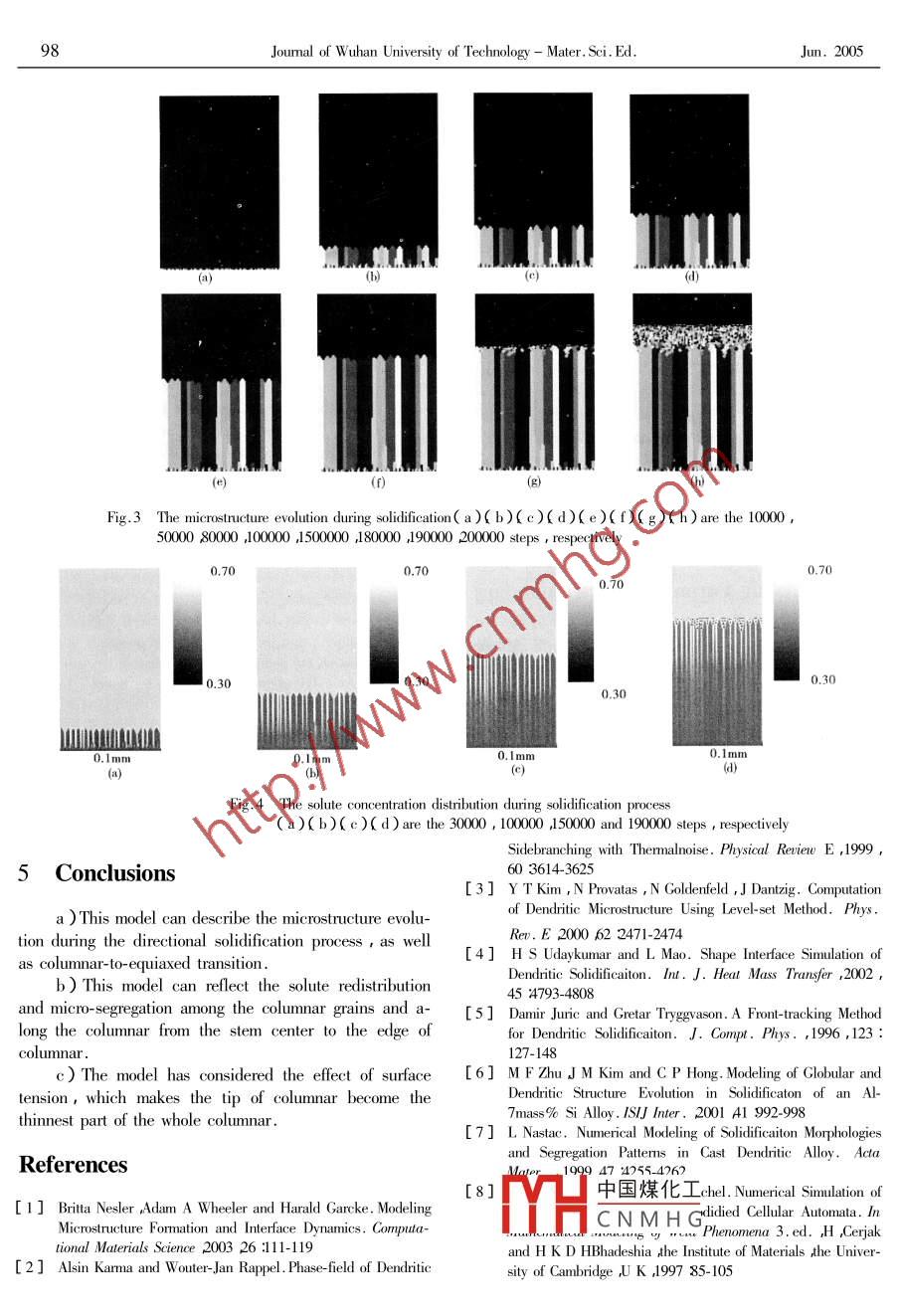 Vol.20 No.2Journal of W uhan University of Technology - Mater. Sci. Ed.Jun. 2005Modeling of Microstructure Evolution during DirectionalSolidification ProcessLI Qiang' 2 LI Dianzhong QIAN Bainian2( 1. School of Material Science and Engineering , Shengyang University of Technology , Shenyang 110023 , China ;2. Institute of Metal Research , Chinese Academy of Sciences Shenyang 1 10016 China )Abstract : A model was presented to dlescribe the microstructure evolution during the directional solidificao-tion process. In this model , the problem of diferent properties in the solid and liquid phuase uwas solred by makingthe properies continuous al the solid liquid inteface. Furthermore ,a random noise rwas incorporated to reflethe anisotropic grouth. Moreoter ,the weraging solute conservation uwas dereloped to heep the total solute conser-vation in the interface region. A simple ingot was simulated by this method , the model can represent the mi-crostructure evolution , solute concentration redistibution , micro- segregation and the columnar-to- equiaxed transi-ion.Key words : directional solidifiction ; microstructure evolution ; columnar to- equiaxed transition ;micro-segregation1 Introductionterface was continuous in thermal solute. In fact ,thethermal physical difference in both solid and liquid phaseswill lead to a heat transferring boundary different from theDirectional solidification is an important materialformer model. In addition , beside the solid/liquid inter-processing method to obtain the specifie properties , whichface, there is a solute concentration gap to reflect theis used widely in aerospace , super alloy etc. Because thechemical potential equilibrium. If the solute concentrationdirectional solidification can get a strong preferential ori-is continuous beside the interface , the chemical potentialentation microstructure that has superior properties in thewill be in unequillibrium.preferential orientation than those in other orientations ,In order to overcome these problems , a continuouslots of researchers used the phase field method to simulatemodel is presented. Firstly , the whole simulated zone is .the solidification structure 13]. Karma and Rappel useddivided into three possible zones , solid , liquid and inter-this method to simulate the dendrite evolution in three di-face , in which the physical properties in different zonesmensions 61. However , a phase function has to be intro-are different except for the density , and then in the inter-duced into the phase field model that had no real physicalfacial region the physical properties are equal to the summeaning. Furthermore ,the phase field required theof solid fraction multiplying the solid physical propertiesmeshed size be smaller than the thickness of interface lay-and liquid fraction multiplying the liquid physical proper-er , which limits the calculating scale. In addition , theties, which make the discontinuous physical propertiesthickness of interface is variable , which not consists withcontinuous. In addition , in this model a random noise isreal solidification structure.incorporated into the model to reflect the anisotropicThe front-tracking methoct4 5 J can track the precisegrowth. Moreover ,because the heat transfer model isposition of interface. But this method needs to know theadopted as a macro-heat transfer model,the model can bedetail of interface , and most of calculating times are con-extended to the macro-scale simulation .sumed in iteration of solving interface position ,whichlimits the calculating scale.2 Mathematical ModelCellular automaton method671 has a simple transi-tion rule and physical background of solidification. C FThe model is based on the following assumptions :Hong used the KGT model and iteration method to obtainthe density of material is not changed during the phasethe velocity of dendrite tip , then by using this velocity tctransition process ; the solute can not diffuse across thecalculate the growth length and solid fractiort 81. However ,sol中國(guó)煤化工the solute in the liquidphasFunid phase ,and the solutemost of the researchers assumed that the thermal physicsin IYHCN M H G.e in the solid phase ;thein both solid and liquid phases was the same , and the in-influence of liquid flow is neglected ; in the whole simu-lated zone there are only three kinds of states , liquid( Received :0ct. 212004 ;Accepted Jan. 18 2005 )phase,solid phase and interface. The liquid phase stateLI Qianf李強(qiáng)) E-mail :qli@ imr. ac . cn* Funded 芳芳數(shù)據(jù)”Program of Chind No. 2001AA339030 )is taken as zero , and the state of interface zones is asumed as a random number bigger than zero , whose stateVol.20 No.2L Qiang et al :Modeling of Microstructure Evolution during Diretional....95number is not changed but the solid fraction.interface , subscript s and l stand for the solid and liquidIn the solid phase zone , energy conservation equa-phase ,respectively. h the heat transfer coefficient ( W/tion is :m2K ), q the heat flux through the boundary.pCpataTv.( K。V T)(1)The above Eq.( 7 ) can be discretized as equations( 13)( 14):species conservation equation is :V.= dI-kF(1--DC(i-1 j))(i-1 j)+ .at= V( D, VC、)(2)(1-C(i+1門C*(i ;i)In the liquid phase zone , energy conservation equa-C*(i i)')f(i+ 1 j)]+k:pD。C(i-1j))f(i-1 1)+pCpi=v(K1VT)(3)d(1- kpkp° C*(i j).C(i+1門r Cc(n)6i+1j)] (13)a7= v(D VC). (4)V, =d(1- 1D、f(1-C(i j-1))fi j- 1)+In the solid-liquid interface zone , energy conserva-C"(i j)tion equation is :C(igj+ 1)?)ri j+ 1)]+af。pCp= V.(KV T)+pLg(5)kpD。[(1 -C( i j-1))f(i j-1)+Cp=Cp f.+Cpi fi k=h: f.+hi fi f.+fi=1(1- hpkp" C*(i ;)(6)C(ij+l)In the flux of the solute across the solid/ liquid inter-(1 -C((;)rij+1)]( 14)faceif11,12]:where , C* is the interface solute concentration , which is(1- kp)C* V=D(Cλ-D(2) (7)the liquid solute concentration in the liquid side of inter-anface ,a the meshed size.The solute concentration partition ahead of solid-liq-Based on the KGT