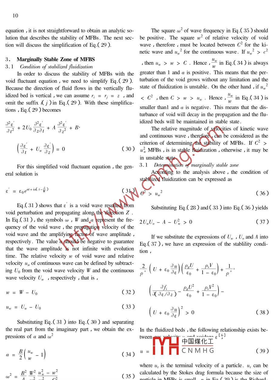 Journal of Hydrodynamics Ser. B A(2002 )7-14China Ocean Press, Beijing- Printed in ChinaDETERMINATION OF MARGINALLY STABLE ZONE OF GAS-SOLID MAGNETICALLY FLUIDIZED BEDSGui Ke-ting, Zhang Hui, Shi Ming-hengThe Key Laboratory of Clean Coal Power Generation and Combustion Technology of Ministry of Education SoutheastUniversity Nanjing 210018, ChinaReceived Oct. 11, 2000)ABSTRACT: The void fluctuation of magnetically fluidized beds 2. THE VOID FLUCTUATION IN MFBSas analyzed and their maginally stable zone was determined. The 2.1 Two-phase model of MFBsanalysis was based on the two-phase model of magnetically fluidizedIn order to study the void fluctuation on mfbs, webed and wave theory. The marginally stable zone determined by thispaper matches well withDetrimental resultsneed to model MFBs with a void fluctuation equationThe equation can be derived from the following two-phasKEY WORDS: fluidized bed magnetic field, marginally stalmodel of MFBs which was developed by Gui et al (4/actuation(1a)1. INTRODUCTIONThe Magnetically Fluidized Beds( MFBs )constitute xa new technology in the application of fluidization. As the+[(1-∈)]=0(1b)external magnetic fields suppress gas bubbles and improvethe contact between gas and solids in the beds MFBs willEfind many applications in industry, such as filtration, Pg at+uj十paration and synthesis reactions etc. Hence, it is impor-123)(1c)tant that mfbs can achieve stable fluidization with the aidof the magnetic fields. This type of MfBs has been calledMagnetically Stabilized fluidized Beds( MSBs ) by some p(1-eX31u ar=nffI-e )p:+nfneauthors, and numbers of research works on msbs havebeen reported. Among these works, the most distin-uished was that by rosensweig 2. His criterion of the(i=123)(1d)magnetically stable fluidization sets up a sharp theoreticalboundary between stable fluidization and unstable onewhere e is the values of voidage u the gas velocity,vHowever, because of the random property of gas-solid the particle velocity Ey the stress tensor of fluid, Pg , psflows in MFBS the experimental results reported by somethe density of gas and solid respectively nfi the dragauthors showed that it was not a sharp boundary but a force between gas and particles, nfmi the magnetic forcemarginally stable zone located between stable and unstable resulted from the external magnetic field and gi the accel-fluidization 33. In this paper, therefore we will analyze eration owing to gravity. The subscripts (j)=1 2 3void fluctuation of MFBs with the help of wave theory, denote three components in the direction X,Y,Z.Theand determine the zone of marginal stability based on the expressions of Ei, nfi and nfmi are also developed byFinally we will compare the theoretical zone of marginal Guf sassumption of stable propagation of void wave in the be中國煤化工CNMHGability with experPi oi(2)8nf:=(1-6)18usEu-vi )-(1-e oog: (3) tion takes place in gas-solid system each dependent vari-Considering the situation in which a small perturbaable in Eqs. (5), (6)and(9 )can be expressed as the2(1-c)M(4) sum of an average value and a small perturbed value,thatIn Eqs. (2)-(4), Pe is the gas pressure /u the vis- u;= U; +ui(1la)cosity do the particle diameter , di the Krone symbols e)the correcting coefficient of drag force due to voids, v:=v+(11b)uo the magnetic conductivity ,xs the magnetic susceptibility of solid and M, the solid magnetization. Substitutinge =Eo+e(1le)Eqs. (2)-(4)into Eq (1),we obtainf i+ Fi+ dfi(1ld)(5)where dfi is the effects of the small perturbation on gassolid system which can be expressed as(1-ε)(6)dfi,, dfif(12)uupgat +uj1Eq(1118and ignoring all the small quantities of order greater tha(7)one, we have18Pd6gE(14)3+(3-2e)yothe external forces exerted on gas and solids in MFBs. Pg at +dIn Eqs. (7)-(8), the terms on the right hand-ps at/(15Let fgi and fsi in Eqs. (7)-(8)represent the externalforces respectively and subtract(8)from(7 ), then weTaking the derivative of Eq 15 )with respect to rhavethe Eqs. 13 )and( 14 )with respect to t and r:, respectively and summing them together we have(B+,B)+23r(tat2fa-fs→x-f(9)aepUW)x0)(16)The external force fi is a function of u;, vi, e and中國煤化工that isCN MH Give of Eq. 12 )with re-spect to ri lead tof=從n,n,∈,)(10)x0)a(1019f).a2.2oid教equation in MFBs9afi Ui ai Vi dfithe void fluctuation equation of the MFBsPP),02∈cP2Vx ae /ar ar: d r(17)psi)+ ar drjAccording to the wave theory the force df; resultedfrom the small perturbation can be considered as the furtion of voidage e gas velocity u; and total flux j; of gasrade /arand solid phases 5, that isa2f i=f(ji e,ui)(23The relationship between total flux j; and voidageIn the above equation letcan be expressed asu i(1-ε)(19)A*=g+1-E0(24)Hence, it follows thatU1,P)(25)=(U;-V;)∈0xc/(26)afi dfi afB1(1,Of(27)(20)where Uoi defined by Eq. 25 )is in accordance withaverage velocity of kinetic wave5].Furthermore,defineSubstituting Eq. 20 ) into Eq (17)yieldthe relative velocity of kinetic wave asx0)=-102+2[U;-εoC oiUoj-Aiji()()+x00n)n1(21)(U1-V夏U1-V).0f(28)In Eq. 21), the coefficient of gradient ar. correWith the notations of Eqs、24)~(28),Fqs、23sponds well with the expression of the velocity of continu- can be expressed asous wave5], that isf中國煤化工CNMHGwhere Ube considered as the velocity of the continEq. 29) is the void fluctuant equation derived fromuous wave. Substituting Eq( 21)into Eq (16), leads to the two-phase model of MFBs. For this partial differentialequation it is not straightforward to obtain an analytic so- The square a2 of wave frequency in Eq. 35)shouldlution that describes the stability of MFBs. The next sec- be positive. The square w2 of relative velocity of voidtion will discuss the simplification of Eq. 29wave, therefore, must be located between C2 for thenetic wave and u for the continuous wave, If u>3. Marginally stable Zone of MFBsof stabilized fluidicthen u o > w>C. Hence, in Eq. 34 )is alwaysIn order to discuss the stability of M