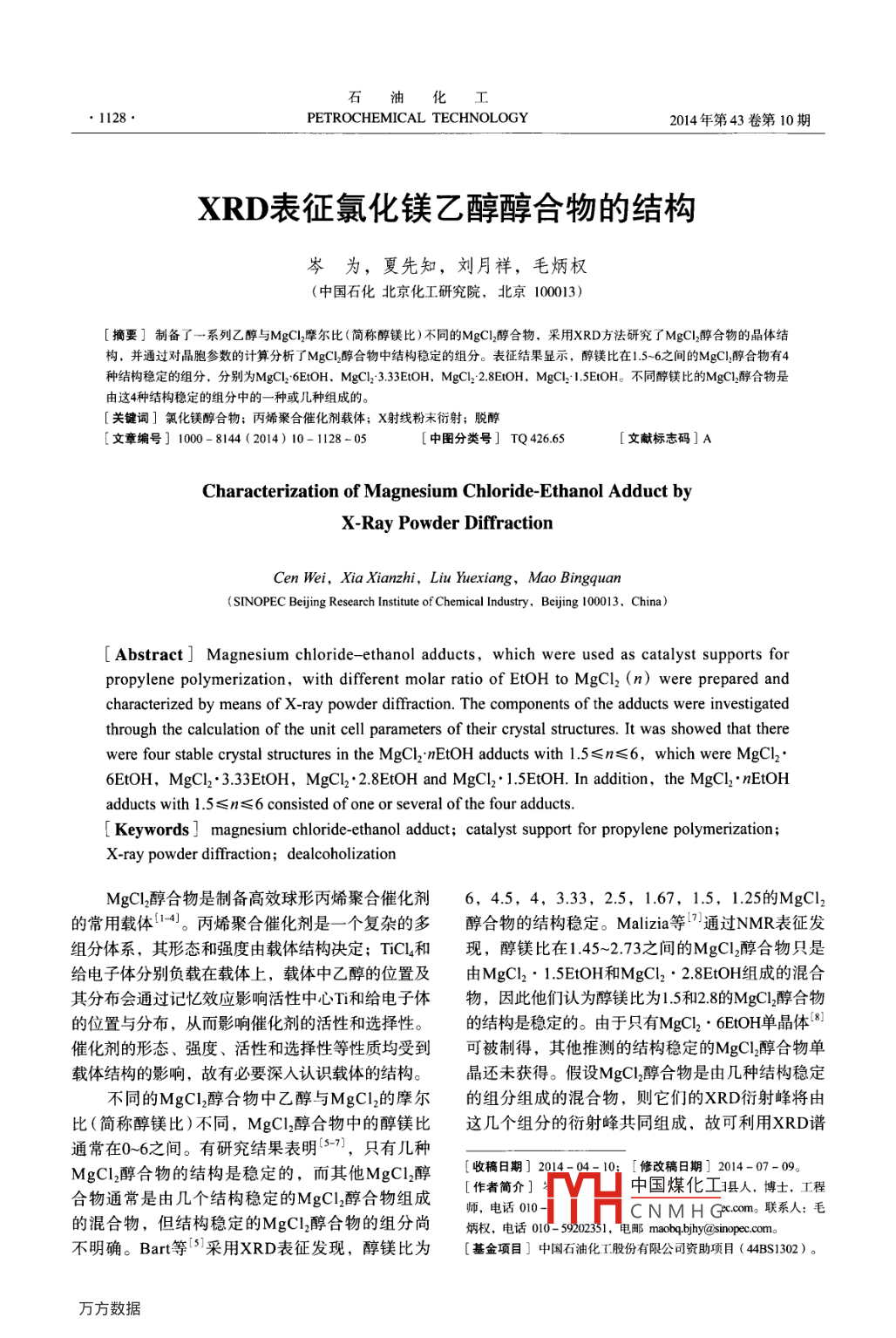 石油化工1128PETROCHEMICAL TECHNOLOGY2014年第43卷第10期ⅩRD表征氯化鎂乙醇醇合物的結(jié)構(gòu)岑為,夏先知,劉月祥,毛炳權(quán)(中國(guó)石化北京化工研究院,北京100013)[摘要]制備了一系列乙醇與MgCl2摩爾比(簡(jiǎn)稱醇鎂比)不同的MgCl2醇合物,采用XRD方法研究了MgCl2醇合物的晶體結(jié)構(gòu),并通過對(duì)晶胞參數(shù)的計(jì)算分析了MgCl醇合物中結(jié)構(gòu)穩(wěn)定的組分。表征結(jié)果顯示,醇鎂比在1.5-6之間的MgCl2醇合物有4種結(jié)構(gòu)穩(wěn)定的組分,分別為MgCl26EOH,MgCl23.33EtOH,MgCl22.8EOH,MgC21.5EOH。不同醇鎂比的MgCl2醇合物是由這4種結(jié)構(gòu)穩(wěn)定的組分中的一種或幾種組成的。關(guān)鍵詞]氯化鎂醇合物;丙烯聚合催化劑載體;Ⅹ射線粉末衍射;脫醇[文章編號(hào)]1000-8144(2014)10-128-05[中圖分類號(hào)]TQ42665文獻(xiàn)標(biāo)志碼]ACharacterization of Magnesium Chloride-Ethanol Adduct byX-Ray Powder DiffractionCen Wei, Xia Xianzhi, Liu Yuexiang, Mao bingquan(SINOPEC Beijing Research Institute of Chemical Industry, Beijing 100013, China)Abstract] Magnesium chloride-ethanol adducts, which were used as catalyst supports forpropylene polymerization, with different molar ratio of EtoH to MgCI,(n)were prepared andcharacterized by means of X-ray powder diffraction. The components of the adducts were investigatedthrough the calculation of the unit cell parameters of their crystal structures. It was showed that therewere four stable crystal structures in the Mg Cl, nEtoH adducts with 1.5