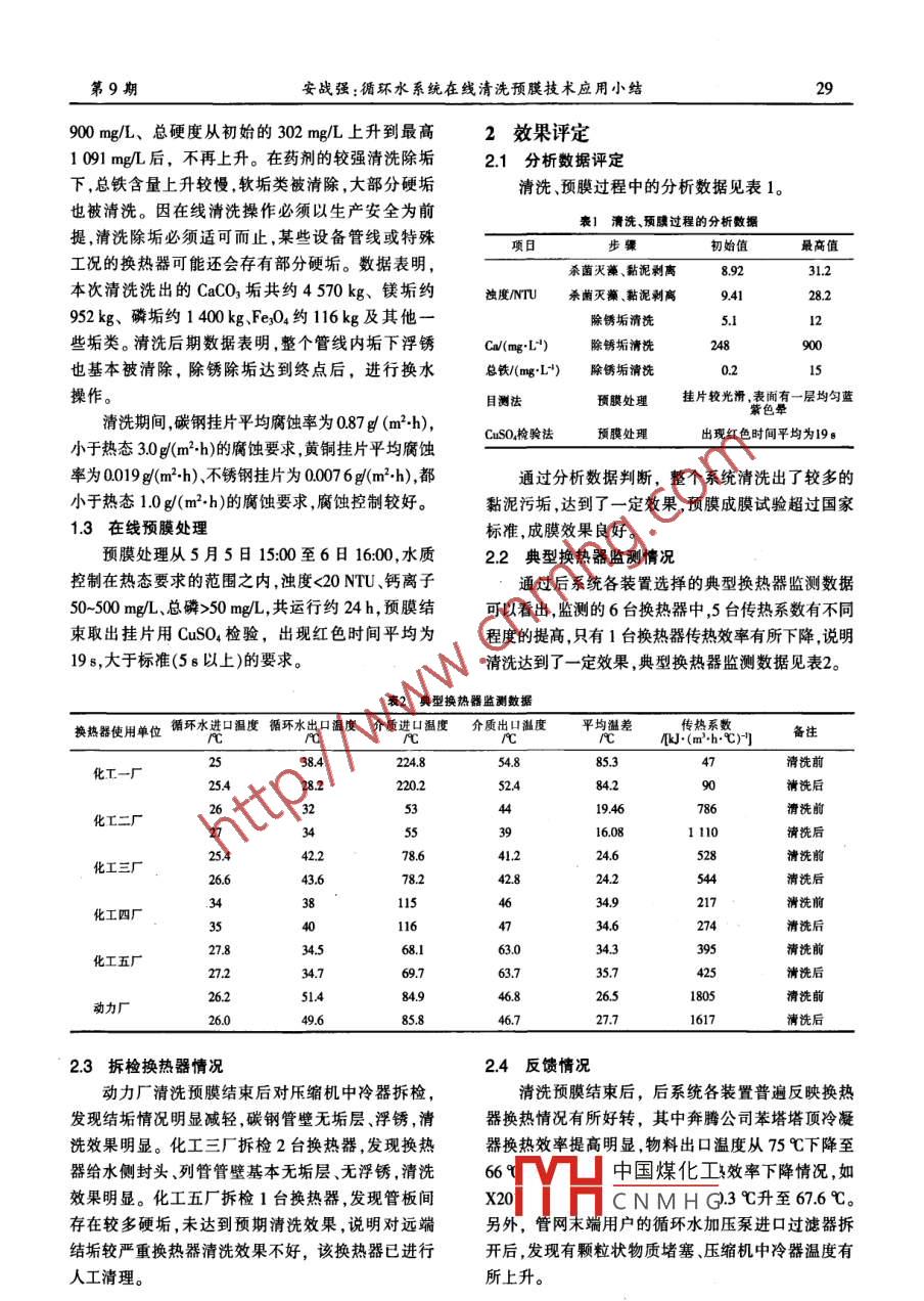 第9期中國氯堿No.9282010年9月China Chlor- AlkaliSep,2010循環(huán)水系統(tǒng)在線清洗預(yù)膜技術(shù)應(yīng)用小結(jié)安戰(zhàn)強(中平能化集團(tuán)尼龍化工公司,河南平頂山467013)摘要:總結(jié)了循環(huán)水系統(tǒng)在線清洗預(yù)膜的控制過程技術(shù)要點和效果,對存在的問題提出了處理建議。關(guān)鍵詞:循環(huán)水;換熱器;在線清洗預(yù)膜;效果中圖分類號:TQ022.12文獻(xiàn)標(biāo)識碼:B文章編號:1009- 1785(2010)09 -0028- -02Summary of on-line cleaning pre -film process of circulating watersystemAN Zhan-qiang(Nelon Chemical Co, Ltd, Zhongping Energy and Chemical Group, Pingdingshan 467013, China)Abstract: The control process, main points of technology and effects of the circulating water system onlinecleaning pre- flm were summarized. The treatment suggestions of existing problems were put forward.Key words: circulating water; heat exchanger; online cleaning pre-film; effect為提高換熱設(shè)施的換熱效率、延長設(shè)備使用壽清洗出約286 kg沉積的有機物,殺菌滅藻、剝離處命,中平能化集團(tuán)尼龍化工公司在2010年5月對循理效果較明顯。環(huán)水系統(tǒng)進(jìn)行在線化學(xué)清洗和預(yù)膜處理。本次清洗強力殺菌剝離濁度趨勢見圖1。預(yù)膜委托專業(yè)水處理公司總承包,負(fù)責(zé)技術(shù)方案的設(shè)計、實施并保證清洗預(yù)膜效果。0一:第一次1過程控制325第二次201.1 殺菌剝離三15由于循環(huán)水系統(tǒng)自2007年大修以來,運行時國10間較長且曾發(fā)生物料泄漏,存留在管線、換熱器內(nèi)0:00 04:48 09:36 14:24 19:12 00:00 04:48的黏泥量、菌群種類、結(jié)垢物較多,決定投加較大圈1強力殺菌剝離濁度數(shù)據(jù)趨勢圉劑量固體殺菌劑、黏泥剝離劑交替殺菌剝離2次。從殺菌剝離的水質(zhì)分析數(shù)據(jù)及現(xiàn)場水體表面觀察,1.2 |中國煤化工系統(tǒng)存在較多污垢沉積。第1次殺菌剝離濁度由HCNMHG二6:45至4日10:008.92 mg/L上升至最高31.2 mg/L,帶出約155 kg菌結(jié)束,整個有優(yōu)過程約21 n。其間,pH值控制為藻、黏泥。第2次殺菌剝離,濁度由9.41 mg/L上升至3.7左右,水中總鐵含量從初始的0.2 mg/L上升到最高28.2 mg/L,洗出約131 kg菌藻、黏泥,2次共最高15 m/L,Ca2+從初始的248 mg/L上升到最高.第9期安戰(zhàn)強:循環(huán)水系統(tǒng)在線清洗預(yù)膜技術(shù)應(yīng)用小結(jié)29900 mg/L、總硬度從初始的302 mg/L上升到最高.2效果評定.1091mg/L后,不再上升。在藥劑的較強清洗除垢2.1 分析數(shù)據(jù)評定下,總鐵含量上升較慢,軟垢類被清除,大部分硬垢清洗預(yù)膜過程中的分析數(shù)據(jù)見表1。也被清洗。因在線清洗操作必須以生產(chǎn)安全為前表1清洗、預(yù)膜過程 的分析數(shù)據(jù)提,清洗除垢必須適可而止,某些設(shè)備管線或特殊項日步驟初始值最高值工況的換熱器可能還會存有部分硬垢。數(shù)據(jù)表明,殺菌滅藁、黏泥剝離8.9231.2本次清洗洗出的CaCO3垢共約4570 kg、鎂垢約濁度/NTU殺菌滅藻、黏泥剝離9.4128.2952kg、磷垢約1 400kg、Fe;04約116kg及其他一除銹垢清冼5.12些垢類。清洗后期數(shù)據(jù)表明,整個管線內(nèi)垢下浮銹Ca/(mg:-L")除銹垢清洗)0也基本被清除,除銹除垢達(dá)到終點后,進(jìn)行換水總鐵/(mgL")).215操作。目測法頇膜處理掛片較光滑,表面有一層均勻藍(lán)紫色暈清洗期間,碳鋼掛片平均腐蝕率為0.87 g/ (m2:h),CuSO,檢驗法預(yù)膜處理出現(xiàn)紅色時間平均為198小于熱態(tài)3.0 g(m2.h)的腐蝕要求,黃銅掛片平均腐蝕率為0.019 g(m2.h)、不銹鋼掛片為0.007 6g(m'.h),都通過分析數(shù)據(jù)判斷,整個系統(tǒng)清洗出了較多的小于熱態(tài)1.0g(m2.h)的腐蝕要求,腐蝕控制較好。黏泥污垢,達(dá)到了一定效果,預(yù)膜成膜試驗超過國家1.3 在線預(yù)膜處理標(biāo)準(zhǔn),成膜效果良好。預(yù)膜處理從5月5日15:00至6日16:00,水質(zhì)2.2典型換熱器 監(jiān)測情況控制在熱態(tài)要求的范圍之內(nèi),濁度<20 NTU、鈣離子通過后系統(tǒng)各裝置選擇的典型換熱器監(jiān)測數(shù)據(jù)50~500 mg/L、總磷>50 mg/L,共運行約24 h,預(yù)膜結(jié)可以看出,監(jiān)測的6臺換熱器中,5臺傳熱系數(shù)有不同束取出掛片用CuSO4檢驗,出現(xiàn)紅色時間平均為程度的提高,只有1臺換熱器傳熱效率有所下降,說明19s,大于標(biāo)準(zhǔn)(5s以上)的要求。清洗達(dá)到了一定效果,典型換熱器監(jiān)測數(shù)據(jù)見表2。表2典型換熱器監(jiān)測數(shù)據(jù)換熱器使用單位循環(huán)水進(jìn)口溫度循環(huán)水出口溫度介質(zhì)進(jìn)口溫度 介 質(zhì)出口溫度平均溫差傳熱系數(shù)備注_心小(m'.hC門38.4224.87清洗前化工一廠25.420.2S2.484.290清洗后4419.46化工二廠2:3453916.081 11042.278.641.224.652化工三廠6.643.678.224.2544381151634.9217化工四廠35401734.627427.834.568.163.034.3395清洗前.化工五廠7.234.769.763.75.7清洗后.26.251.484.946.826.51805動力廠26.049.685.846.727.716172.3拆檢換熱器情況2.4 反饋情況動力廠清洗預(yù)膜結(jié)束后對樂縮機中冷器拆檢,清洗預(yù)膜結(jié)束后,后系統(tǒng)各裝置普遍反映換熱發(fā)現(xiàn)結(jié)垢情況明顯減輕,碳鋼管壁無垢層、浮銹,清器換熱情況有所好轉(zhuǎn),其中奔騰公司苯塔塔頂冷凝洗效果明顯?;と龔S拆檢2臺換熱器,發(fā)現(xiàn)換熱.器換熱效率提高明顯,物料出口溫度從75 C下降至器給水側(cè)封頭、列管管壁基本無垢層、無浮銹,清洗66