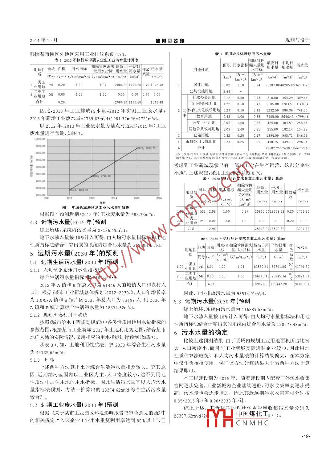 規(guī)劃與設(shè)計建材與裝飾2014年10月某市工業(yè)新城污水水量論證方法研究劉倩(廣東省建筑設(shè)計研究院廣東廣州510010)摘要:本文采用多種污水水量預測方法,對某市工業(yè)新城污水水量進行了詳細論證。通過對一系列預測參數(shù)的比較和相互驗證,選取了較合理的數(shù)據(jù)作為某市工業(yè)新城近、遠期污水量的預測結(jié)果,并以此作為某市工業(yè)新城污水廠近、遠期處理規(guī)模的設(shè)計依據(jù)。關(guān)鍵詞:污水水量預測;人均綜合生活用水量指標法;土地利用性質(zhì)法中圖分類號:X703文獻標識碼:B文章編號:1673-0038(2014 )44-0018-031引語年綜合生活污水排放系數(shù)取0.85;2030年綜合生活污水排放系某市工業(yè)新城目前處在開發(fā)初級階段,隨著各企業(yè)的陸續(xù)進數(shù)取0.85。本工程中工業(yè)廢水排放系數(shù)取0.70。駐,工業(yè)園區(qū)開始形成規(guī)模,污染問題日益凸顯,并對周邊居民地下水滲入量:本次計算地下水滲入系數(shù)取10號。生活造成了一定影響,對工業(yè)新城自身發(fā)展也產(chǎn)生-定制約。 需| 4 近期污水量(2015年)的預測要對該片區(qū)近、遠期污水量進行分析論證,建設(shè)該產(chǎn)業(yè)園的污水| 4.1 近期生活污水量(2015年)預測處理系統(tǒng),解決園區(qū)污水出路問題。本文僅采用人均綜合生活用水量指標法預測2015年生活污2常用污水水量預測方法水量。綜合生活污水量指標:取220I/cap"do本工程中城市污水量計算分為城市綜合生活污水量和工業(yè)2012年A鎮(zhèn)和B鎮(zhèn)總?cè)丝跒?1446 人的城鎮(zhèn)人口和農(nóng)村人廢水量兩部分。均采用用水量(平均日)乘以污水排放系數(shù)確定???。根據(jù)《某市工業(yè)新城總體規(guī)劃(2012~2030>》,人口年增長率2.1生活污水量預測方法為1.0號,A鎮(zhèn)和B鎮(zhèn)2015年總?cè)丝跒?3308人,則2015年A生活污水量主要預測方法有:城市單位人口綜合用水量指標鎮(zhèn)和B鎮(zhèn)計算綜合生活污水量為13927.76m/do法、城市單位建設(shè)用地綜合用水量指標法、單位人口綜合生活用由于現(xiàn)狀已新建辦公用地約為0.15km?,商業(yè)設(shè)施用地約為水量指標法、建設(shè)用地性質(zhì)指標法、年遞增率法、定額法等。1.15km?, 按單位用地用水量指標0.5萬m/km°d計算。考慮0.85排放系數(shù),則2015年該部分用地產(chǎn)生污水量約為5525m/d。2.2工業(yè)廢水量常用預測方法工業(yè)廢水量主要預測方法:建設(shè)用地性質(zhì)用水量指標法、單鑒于現(xiàn)狀在此用地范圍內(nèi)辦公人員基本不為區(qū)域內(nèi)的戶籍位產(chǎn)值用水量指標法產(chǎn)業(yè)規(guī)劃用水量指標法。人口,故2015年總生活污水量需增加該部分污水量,則總生活3本工程采用的污水水量預測方法及參數(shù)污水量為19452.76m/d.4.2近期工業(yè)廢水量(2015年)預測3.1生活污 水水量預測方法生活污水量預測方法除實測法外,主要分為以規(guī)劃人口數(shù)為某市工業(yè)新城目前處于建設(shè)初期,產(chǎn)業(yè)規(guī)劃仍未明確,缺少基準和以用地性質(zhì)為基準的兩類計算方法。其中,單位人口綜合該目標年土地利用規(guī)劃情況,現(xiàn)狀已進駐的企業(yè)也較少且發(fā)展生活用水量指標法和建設(shè)用地性質(zhì)用水量指標法較之其他更為年限較短,沒有完備的資料作為數(shù)據(jù)支撐,因此2015年工業(yè)廢水量無法采用用地性質(zhì)用水量指標法預測水量,只能用工業(yè)廢準確。因此,本工程生活污水量預測分別采用單位人口綜合生活用水年增長率法預測。根據(jù)調(diào)查, 2012年有實測的工業(yè)污水量數(shù)據(jù),約為2739.6*m/d。水量指標法和用地性質(zhì)用水量指標法進行計算與校核。根據(jù)《關(guān)于某市工業(yè)園區(qū)環(huán)境影響報告書審查意見的函》中3.2工 業(yè)廢水量預測方法的相關(guān)規(guī)定,“入園企業(yè)工業(yè)用水重復利用率達到80號以上”,對某市工業(yè)新城目前正在建設(shè)初期,產(chǎn)業(yè)規(guī)劃還未完善,已進于2013年落戶并投產(chǎn)企業(yè),須執(zhí)行上述規(guī)定的企業(yè)(在產(chǎn)業(yè)轉(zhuǎn)駐的企業(yè)也較少且發(fā)展年限較短,沒有完備的資料制作圖表作|移園內(nèi)的企業(yè))用地情況及水量如表1。為數(shù)據(jù)支撐,因此本工程采用建設(shè)用地性質(zhì)用水量指標法預測表1 2013執(zhí)行環(huán)評要求企業(yè)工業(yè)污水量計算表工業(yè)廢水量。用地性地塊面積「用水指標 扣除管網(wǎng)福天 最高日平均日排放污水量3.3污水量論證有關(guān)參數(shù)質(zhì)量用水指標用水量用水十,系數(shù)一代號(km2)萬m/km'"d) O萬m/km*d) (mld)| (m'd)(m'd)污水量的預測,通常需要考慮各種用水量指標、污水排放系1M10.23|1.0| 200.001028.575 0.20 285.72數(shù)、地下水滲入量等有關(guān)參數(shù)。I業(yè)用地人均綜合生活污水量指標:2015年污水系統(tǒng)內(nèi)人均綜合生2業(yè)用地M2 0.35|1.50.30| 4565.22 3260.87|0.20 652.17合計.58| 6565.22 4689.44活污水量定額指標為220L/cap.d,2030 年的指標為250L/cap.d。城市污水排放系數(shù):分為綜合生活污水排放系數(shù)和工業(yè)廢水排年o平均日用水量一最高中國煤化工中參數(shù)參考銘外給水設(shè)計規(guī)范)放系數(shù)。本工程的2012年綜合生活污水排放系數(shù)取0.80;2015結(jié)合其他MHCNM
