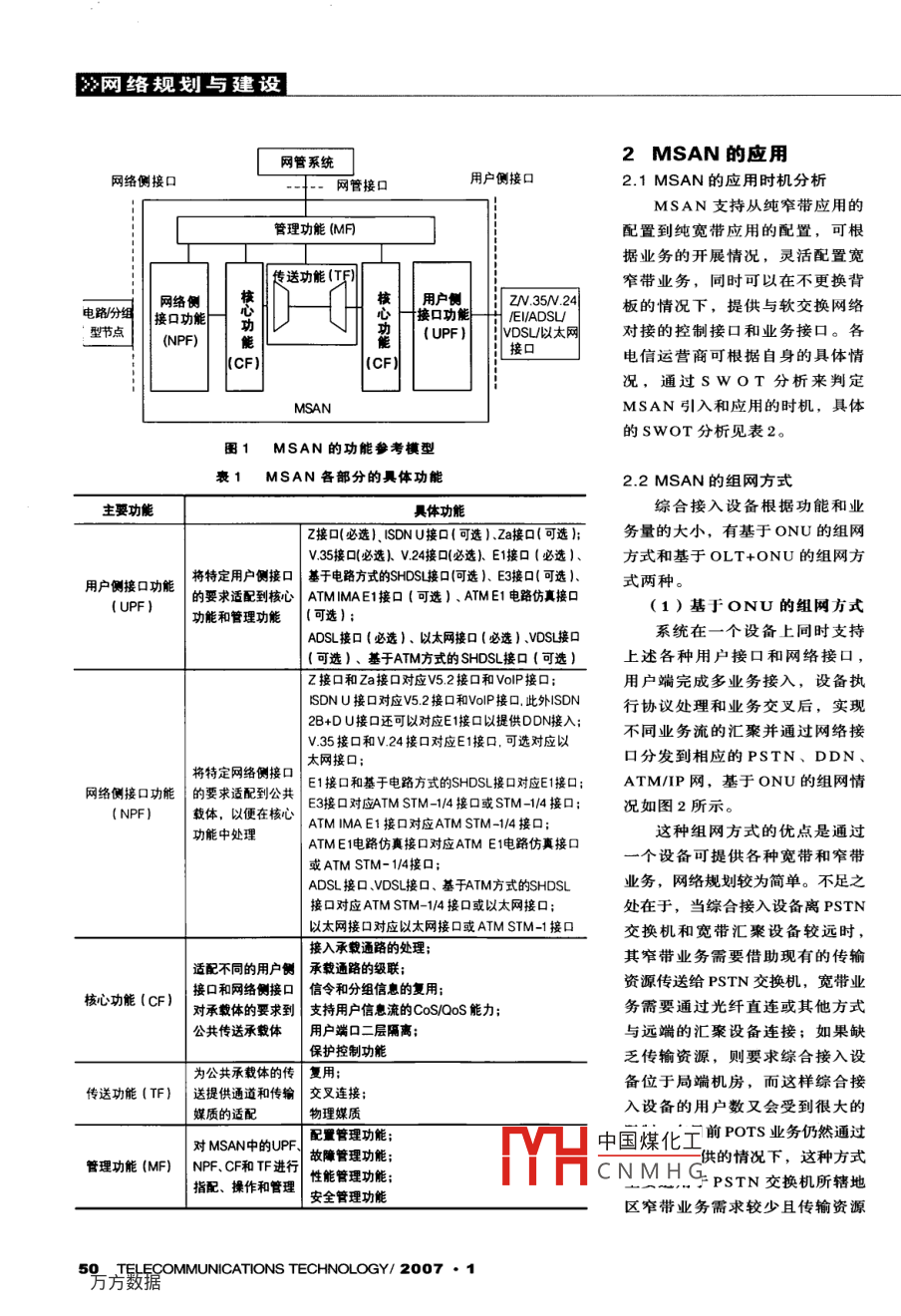 電信技術(shù)MSAn及其應(yīng)用陳錦發(fā)福建省郵電規(guī)劃設(shè)計(jì)院有限公司福州3500031.2功能參考模型要:介紹了MSAN的定義、功能模型及其特點(diǎn),并詳細(xì)探討MSAN主要包括用戶側(cè)接口功能了MSAN的應(yīng)用時(shí)機(jī)、組網(wǎng)方式以及不同場景下的應(yīng)用等。(UPF)、網(wǎng)絡(luò)側(cè)接口功能(NPF)、核心關(guān)調(diào): MSAN NGN ONU功能(CF)、傳送功能(TF)和管理功能隨著接入業(yè)務(wù)需求的多元化和NGN(MF)。其功能模型如圖1所示。技術(shù)的不斷發(fā)展成熟,MSAN( Multi各部分的具體功能見表1。Service Access Network,綜合業(yè)務(wù)接入網(wǎng)絡(luò))及其設(shè)備越來越受關(guān)注。MSAN1.3MsAN的特點(diǎn)融合了各種寬帶與窄帶接入技術(shù),同時(shí)MSAN可通過統(tǒng)一的平臺(tái)提供多種可提供各種業(yè)務(wù)的接入,并具備窄帶業(yè)務(wù)的綜合接入,在建設(shè)、運(yùn)維、演進(jìn)等PSTN和軟交換網(wǎng)絡(luò)接入能力。方面具有鮮明的特點(diǎn)。隨著MSAN的建設(shè),各種業(yè)務(wù)接入1MSAN簡述網(wǎng)絡(luò)將逐步消失而統(tǒng)一到綜合接入網(wǎng)中。1.1定義也就是說,MSAN建設(shè)將使紛繁復(fù)雜的MSAN是融合了多種有線接入技術(shù),網(wǎng)絡(luò)結(jié)構(gòu)變得簡潔、清晰。MSAN建成之可同時(shí)提供傳送寬帶業(yè)務(wù)和窄帶業(yè)務(wù)所后,各種業(yè)務(wù)的帶寬調(diào)配方便,而且可根需公共傳送承載能力的系統(tǒng)。它由提供據(jù)業(yè)務(wù)的重要性提供各種形式的保護(hù)寬帶和笮帶業(yè)務(wù)的網(wǎng)絡(luò)側(cè)接口和相關(guān)用即使要開展一些新業(yè)務(wù),也不需重復(fù)建戶側(cè)接口之間的一系列傳送實(shí)體組成,設(shè),從而降低建網(wǎng)成本??捎删W(wǎng)管接口進(jìn)行管理·在傳統(tǒng)的運(yùn)維體系中,窄帶接入和MSAN著眼于綜合業(yè)務(wù)接入:窄帶提寬帶接入是分開管理的,而MSAN融合供語音/DDN/ SHDSL等業(yè)務(wù)接入,通過了寬帶接入技術(shù)和窄帶接入技術(shù),因此V5接入到PSTN;寬帶提供xDSL/ LAN MSAN的管理是集中管理。它可加快響等業(yè)務(wù)接入,通過 GE/FE/ATM上聯(lián)至IP/應(yīng)速度、降低運(yùn)維成本。ATM網(wǎng)。MSAN可根據(jù)寬窄帶業(yè)務(wù)的H中國煤化工N滴進(jìn)的能力,可例靈活調(diào)整用戶板的數(shù)量,可拓居YHa級(jí)支持軟交換的演EPON/GPON/ WIMAX的接入,并具有CNMHG展新技術(shù),NGN演進(jìn)的能力。種新興業(yè)務(wù),進(jìn)而保護(hù)運(yùn)營商的建設(shè)投資。www.ttm.comcn49≯網(wǎng)絡(luò)規(guī)劃與建設(shè)網(wǎng)管系統(tǒng)2MSAN的應(yīng)用網(wǎng)絡(luò)側(cè)接口網(wǎng)管接口用戶側(cè)接口2.1MsAN的應(yīng)用時(shí)機(jī)分析MSAN支持從純窄帶應(yīng)用的管理功能MF配置到純寬帶應(yīng)用的配置,可根據(jù)業(yè)務(wù)的開展情況,靈活配置寬送功能(T窄帶業(yè)務(wù),同時(shí)可以在不更換背絡(luò)側(cè)核核用戶側(cè)電路分板的情況下,提供與軟交換網(wǎng)絡(luò)接口功能ElADSU/型節(jié)點(diǎn)F)VDS以太網(wǎng)對(duì)接的控制接口和業(yè)務(wù)接口。各接(CF電信運(yùn)營商可根據(jù)自身的具體情況,通過SWOT分析來判定MSANMSAN引入和應(yīng)用的時(shí)機(jī),具體的SwOT分析見表2圖1MSAN的功能參考模型衰1MSAN各部分的具體功能2.2MsAN的組網(wǎng)方式主要功能具體功能綜合接入設(shè)備根據(jù)功能和業(yè)z接口(必選)SDNU接口(可選)、Za接囗(可選);務(wù)量的大小,有基于ONU的組網(wǎng)V.35接口必選V24接口必選)、E1接口(必選方式和基于OLT+ONU的組網(wǎng)方用戶側(cè)接口功能將特定用戶側(cè)接口基于電路方式的SHDS接口何可選)、E3接口(可選式兩種。的要求適配到核心 ATMIMAE1接囗(可選)、ATME1電路仿真接囗功能和管理功能(可選)(1)基于ONU的組網(wǎng)方式ADSL接口(必選)、以太網(wǎng)接口(必選)、VDSL接囗系統(tǒng)在一個(gè)設(shè)備上同時(shí)支持可選)、基于ATM方式的 SHDSL接囗(可選上述各種用戶接口和網(wǎng)絡(luò)接口接口和za接口對(duì)應(yīng)v52接口和voP接口;用戶端完成多業(yè)務(wù)接入,設(shè)備執(zhí)sDNU接口對(duì)應(yīng)v52接囗和voP接口,此外SDN行協(xié)議處理和業(yè)務(wù)交叉后,實(shí)現(xiàn)V35接口和V24接口對(duì)應(yīng)E1接口,可選對(duì)應(yīng)以不同業(yè)務(wù)流的匯聚并通過網(wǎng)絡(luò)接太網(wǎng)接口;口分發(fā)到相應(yīng)的PSTN、DDN將特定網(wǎng)絡(luò)側(cè)接口E1接口和基于電路方式的 SHDSL接口對(duì)應(yīng)E1接口;ATM/IP網(wǎng),基于ONU的組網(wǎng)情網(wǎng)絡(luò)側(cè)接口功能|的要求適配到公共E3接口對(duì) ATM STM4接口或SM4接口:況如圖2所示。NPF)載體,以便在核心ATM IMA E1接口對(duì)應(yīng) ATM STM-14接口;功能中處理這種組網(wǎng)方式的優(yōu)點(diǎn)是通過ATME1電路仿真接口對(duì)應(yīng)ATME1電路仿真接口或 ATM STM-14接口一個(gè)設(shè)備可提供各種寬帶和窄帶ADSL接口、DSL接口、基于ATM方式的 SHDSL業(yè)務(wù),網(wǎng)絡(luò)規(guī)劃較為簡單。不足之接口對(duì)應(yīng) ATM STM-1/4接口或以太網(wǎng)接口處在于,當(dāng)綜合接入設(shè)備離PSTN以太網(wǎng)接口對(duì)應(yīng)以太網(wǎng)接口或 ATM STM-1接口交換機(jī)和寬帶匯聚設(shè)備較遠(yuǎn)時(shí)接入承載通路的