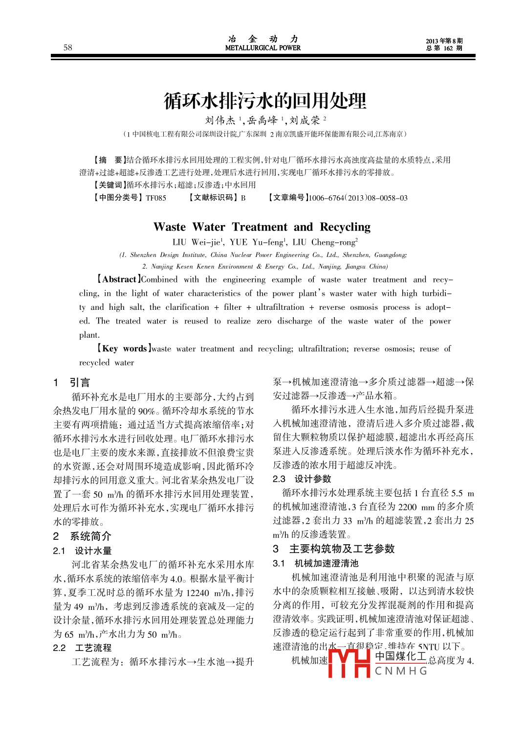 冶金動力013年第8期58METALLURGICAL POWER循環(huán)水排污水的回用處理劉偉杰1,岳禹峰1,劉成榮(1中國核電工程有限公司深圳設計院,廣東深圳2南京覬盛開能環(huán)保能源有限公司,江蘇南京)【摘要】結(jié)合循環(huán)水排污水回用處理的工程實例,針對電廠循環(huán)水排污水高濁度高鹽量的水質(zhì)特點,采用澄清+過濾+超濾+反滲透工藝進行處理,處理后水進行回用,實現(xiàn)電廠循環(huán)水排污水的零排放?!娟P(guān)鍵詞】循環(huán)水排污水;超濾;反滲透;中水回用【中圖分類號】TF085【文獻標識碼】B【文章編號】006-6764(2013)08-0058-03Waste Water Treatment and RecyclingLIU WeiYUE Yu-feng, LIU Cheng-rong( Shenzhen Design Institute, China Nuclear power Engineering Co, Ltd, Shenzhen, Guangdong2. Nanjing Kesen Kenen Enviat Energy Co, Ltd, Nanjing, Jiangsu China【 Abstract creatment and recycling, in the light of water characteristics of the power plants waster water with high turbidity and high salt, the clarification filter ultrafiltration reverse osmosis process is adopted. The treated water is reused to realize zero discharge of the waste water of the power(Key words ]waste water treatment and recycling; ultrafiltration; reverse osmosis; reuse ofrecycled water1引言泵→機械加速澄清池→多介質(zhì)過濾器→超濾→保循環(huán)補充水是電廠用水的主要部分,大約占到安過濾器→反滲透→產(chǎn)品水箱。余熱發(fā)電廠用水量的90%。循環(huán)冷卻水系統(tǒng)的節(jié)水循環(huán)水排污水進入生水池,加藥后經(jīng)提升泵進主要有兩項措施:通過適當方式提高濃縮倍率;對入機械加速澄清池,澄清后進入多介質(zhì)過濾器,截循環(huán)水排污水水進行回收處理。電廠循環(huán)水排污水留住大顆粒物質(zhì)以保護超濾膜,超濾出水再經(jīng)高壓也是電廠主要的廢水來源,直接排放不但浪費寶貴泵進入反滲透系統(tǒng)。處理后淡水作為循環(huán)補充水的水資源,還會對周圍環(huán)境造成影響,因此循環(huán)冷反滲透的濃水用于超濾反沖洗卻排污水的回用意義重大。河北省某余熱發(fā)電廠設2.3設計參數(shù)置了一套50m/h的循環(huán)水排污水回用處理裝置循環(huán)水排污水處理系統(tǒng)主要包括1臺直徑5.5m處理后水可作為循環(huán)補充水,實現(xiàn)電廠循環(huán)水排污的機械加速澄清池,3臺直徑為2200m的多介質(zhì)水的零排放。過濾器,2套出力33m沿h的超濾裝置,2套出力252系統(tǒng)簡介m3/h的反滲透裝置21設計水量3主要構(gòu)筑物及工藝參數(shù)河北省某余熱發(fā)電廠的循環(huán)補充水采用水庫3.1機械加速澄清池水,循環(huán)水系統(tǒng)的濃縮倍率為40。根據(jù)水量平衡計機械加速澄清池是利用池中積聚的泥渣與原算,夏季工況時總的循環(huán)水量為12240m/h,排污水中的雜質(zhì)顆粒相互接觸、吸附,以達到清水較快量為49m/h,考慮到反滲透系統(tǒng)的衰減及一定的分離的作用,可較充分發(fā)揮混凝劑的作用和提高設計余量,循環(huán)水排污水回用處理裝置總處理能力澄清效率。實踐證明,機械加速澄清池對保證超濾、為65mh,產(chǎn)水出力為50m3h反滲透的穩(wěn)定運行起到了非常重要的作用,機槭加2.2工藝流程速澄清池的出穩(wěn)定維持在5NTU以下。工藝流程為:循環(huán)水排污水→生水池→提升機械加速中國煤化工總高度為4CNMHG3年第8期冶金動力METALLURGICAL POWER5995m,停留時間為1.0h,池的設計容積為95m34實際的運行效果3.2多介質(zhì)過濾器4.1超濾出水循環(huán)水經(jīng)過加藥凝聚后,形成大顆粒雜質(zhì),在機SDI是反滲透最重要的進水指標之一,循環(huán)水械加速澄清池中不能完全被去除,將這種原水通過排污水回收裝置自投產(chǎn)以來,超濾產(chǎn)水SDI總體上定厚度的粒狀材料,通過粒料間的間隙形成多層穩(wěn)定在13左右。即使在進水混凝效果不理想等情的過濾結(jié)構(gòu),有效地去除水中的懸浮物、泥沙等雜況下,超濾出水SD也可保持在2.0以下,而反滲透質(zhì),使出水達到超濾進水的相關(guān)要求。過濾器采用石膜進水要求的SD最高限值是50,故超濾的出水英砂、無煙煤雙層濾料。濾層飽和后,可通過逆向水SD指標是可以保證的。流反洗濾料,恢復過濾功能。超濾產(chǎn)水濁度也比較穩(wěn)定,保持在0.NTU以多介質(zhì)過濾器直徑22m,無煙煤填裝高度0.4下,最高為0.16NTU,最小為0035NTU,總體來說石英砂填裝高度0.8m,配套反洗水泵流量120超濾有著非常好的降濁效果,在多介質(zhì)過濾器出水m3/h,揚程25m,功率15kW濁度變化較大情況下,也能很好的降濁,完全能夠滿3.3超濾裝置足反滲透進水濁度<10NTU的要求反滲透設備對于進水的水質(zhì)要求較為嚴格,42反滲透出水般的預處理工藝如混凝、過濾等處理效果并也不理自設備投運以來,超濾出水一直穩(wěn)定,這給反滲想特別是進水中含有較多的污染物時,出水的污染透的良好運行打下了堅實的基礎,反滲透系統(tǒng)運行指數(shù)(SD)很難達到反滲透設備的要求。而超濾技情況見表1術(shù)可以較好地解決這一問題,能夠?qū)δz體、大分子有表11反滲透運行指標表機物、細菌等進行有效截留,出水完全滿足反滲透設備的要求日期回收率%進水電導產(chǎn)水電號導(產(chǎn)水量超濾膜采用荷蘭NORT公司的孔徑為20mm的0l15.1567.51568中空纖維膜,共配置12根,每根過濾面積為40m2,20116267913262.8材質(zhì)為親水性的聚醚砜,中空膜絲的內(nèi)徑為0.80117.186891437mm。膜元件