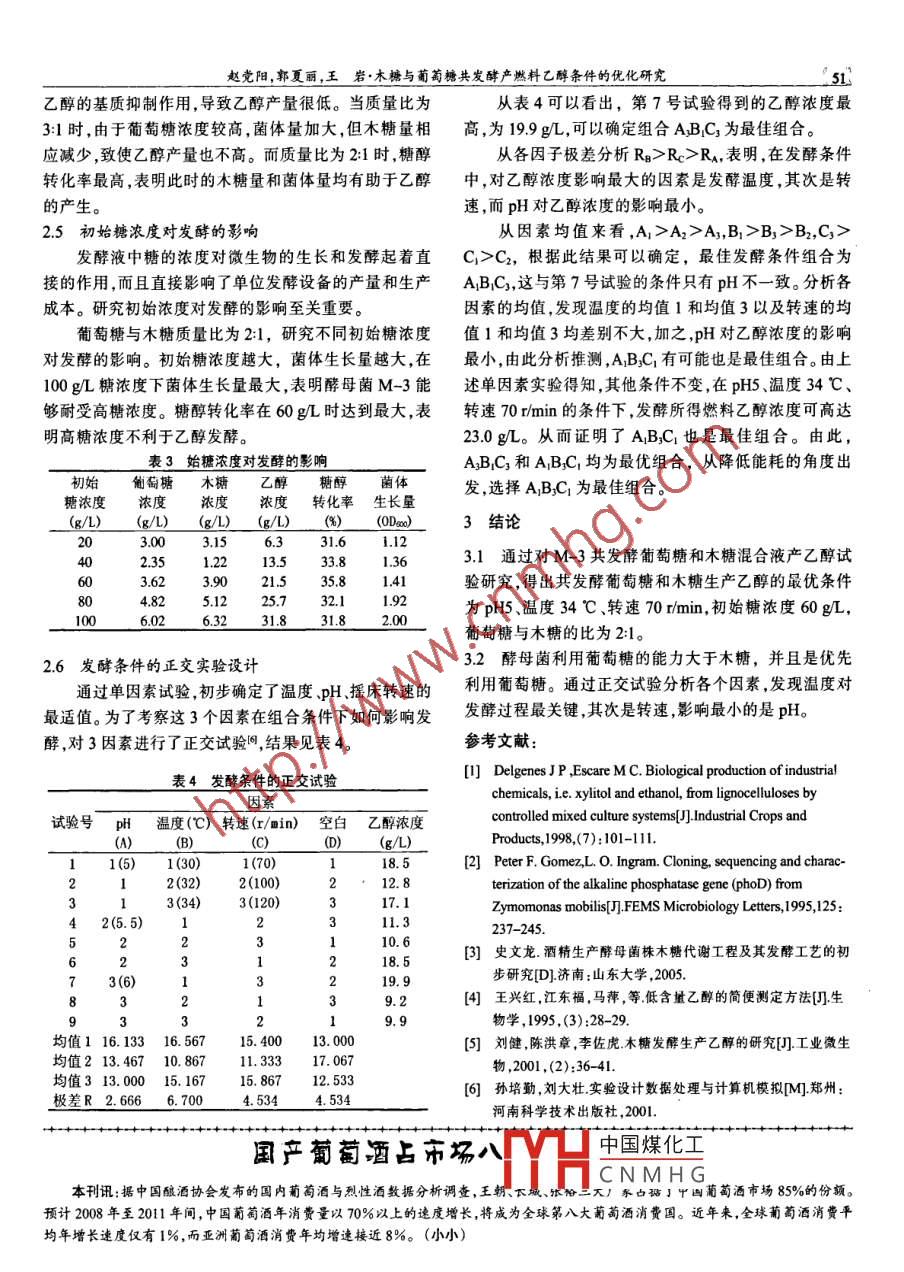 釀酒科技2008年第2期(總第164期) LIQUOR- MAKING SCIENCE& TECHNOLOGY2008No.2(ol.l64)木糖與葡萄糖共發(fā)酵產(chǎn)燃料乙醇條件的優(yōu)化硏究趙黨陽,郭夏麗,王巖鄭州大學化工學院,河南鄭州45001)摘要:對酵母菌M-3進行了葡萄糖和木糖共發(fā)酵產(chǎn)乙醇條件的優(yōu)化研究。結(jié)果表明,發(fā)酵的最優(yōu)憊件為:pH溫度34℃,轉(zhuǎn)速70τmin,初始糖濃度60g,葡萄糖與木糖的質(zhì)量比為21l。在該條件下,發(fā)酵所得燃料乙醇濃度為23.0gL,糖醇轉(zhuǎn)化率為383%關(guān)鍵詞:木糖;葡萄糖;燃料乙醇;發(fā)酵中圖分類號:TS2622;TS2614;TS261;TQ920文獻標識碼:A文章編號:1001-9286(2008)02-0049-03Study on the Optimization of Fuel Ethanol Production Conditions byCo-fermentation of Xylose and glucose by Yeast M-3ZHAO Dang-yang, GUO Xia-li and WANG Yan(School of Chemical Engineering of Zhengzhou University, Zhengzhou, He'nan 450001, China)Abstract: The co-fermentation conditions of xylose and glucose by yeast M-3 to produce fuel ethanol were studied. The results showed that theoptimum conditions were as follows: initial pH value was 6.5 and the temperature was at 34 C, rotating speed was at 70 r/min, initial sugarconcentration was 60 g/L, and mass ratio of glucose and xylose was 2 1. Under the above conditions, the produced fuel ethanol concentrationas 23.0 g/L and the conversion rate of sugar to ethanol was 38.3%Key words xylose; glucose; fuel ethanol; co-fermentation隨著全球能源危機的加劇,人們越來越重視燃料乙111試驗菌種醇的生產(chǎn)。傳統(tǒng)的以淀粉質(zhì)為原料的乙醇生產(chǎn)成本太酵母菌M-3,由鄭州大學環(huán)境與生態(tài)研究所篩選。高,而利用玉米秸稈等農(nóng)作物廢棄物生產(chǎn)燃料乙醇不112混合發(fā)酵培養(yǎng)基僅成本低,同時能緩解廢棄物對環(huán)境的污染,又能減輕混合糖(葡萄糖和木糖,按實驗要求稱量),酵母膏燃料生產(chǎn)對糧食的依賴。因此,以木質(zhì)纖維素原料生產(chǎn)2gL,磷酸二氫鉀1gL,硫酸鎂0.5gL,蛋白胨10gL,燃料乙醇的技術(shù)成為當前的研究焦點。木質(zhì)纖維原料的121℃下滅菌30min,備用。水解液中主要含有葡萄糖和木糖2種成分。同時發(fā)酵1.2試驗方法這2種糖生產(chǎn)燃料乙醇,能夠充分利用原料,降低生產(chǎn)250mL的搖瓶中裝入50mL的混合發(fā)酵培養(yǎng)基,成本。20世紀80年代開始世界范圍內(nèi)掀起了木糖與接入M-3發(fā)酵菌??疾煸诓煌琾H、不同發(fā)酵溫度、不同葡萄糖共同發(fā)酵的研究熱潮,并取得了一定的成果。搖床轉(zhuǎn)速、不同初始糖濃度、葡萄糖與木糖的不同比例Ingram利用基因技術(shù)構(gòu)建菌種 E coli Kol1,該菌幾乎等因素對乙醇發(fā)酵的影響。通過單因素影響實驗和正交可以發(fā)酵木質(zhì)纖維原料水解液中所有的糖分,乙醇生產(chǎn)實驗,確定優(yōu)化的發(fā)酵條件。能力比較高。山東大學也研究了粗糙脈孢菌對木糖和13測定方法葡萄糖的共同發(fā)酵,并取得了一定的成果國。乙醇測定用氧化還原反應比色法岡。本實驗利用實驗室自行篩選的M-3酵母菌對木糖酵母菌生長測定:利用分光光度計,以滅菌的培養(yǎng)和葡萄糖的共同發(fā)酵進行了研究,以期對纖維素燃料乙基為空白,比色皿厚度為05cm,波長600mm,測定培醇的工業(yè)化生產(chǎn)提供一些技術(shù)參考。養(yǎng)液的OD值。用該值表示酵母菌的生長量。1材料與方法木糖含量測定:1mL糖化液加4mL地衣酚試劑保中國煤化工值,結(jié)合木糖標準曲線1.1材料CNMHG收稿日期:2007-11-1作者簡介:趙黨陽(1983-),男河南鎮(zhèn)平縣人碩士研究生,主要從事生物質(zhì)能方面的研究工作。,501釀酒科技208年第2期(總第14期, LIQUOR-MAKING SCIENCE& TECHNOLOGY2000a164總糖和葡萄糖含量測定:總糖含量測定用DNS法,因素之一。在250mL的搖瓶中裝入50mL的發(fā)酵液總糖含量減去木糖含量即得葡萄糖含量葡萄糖與木糖質(zhì)量比為2:1,pH5,溫度34℃,考察不同2結(jié)果與分析搖床轉(zhuǎn)速對發(fā)酵的影響,結(jié)果見圖2。1溫度對發(fā)酵的影響溫度是影響微生物代謝的重要因素之一。在適宜的溫度范圍內(nèi),溫度升高微生物代謝速率相應提高;過高2N或過低的溫度均會降低代謝速率。因此,在不同的溫度一乙醇濃度(g/L)下對酵母菌M-3進行了發(fā)酵試驗。試驗結(jié)果見表1。菌體生長量(OD6)0.5表1溫度對發(fā)酵的影響溫度葡萄糖木糖乙醇醇菌體轉(zhuǎn)速(r/min)(g/l)(g/L)(g/)(%)(ODe) pH圖2搖床轉(zhuǎn)速對發(fā)酵的影響284.125.196.410.70.643.90303.974.8810.317.21.274.02從圖2可以看出,搖床轉(zhuǎn)速對乙醇發(fā)酵影響較大,323.8542615425.71.404.05轉(zhuǎn)速為70rmin時,乙醇濃度達到最大。高于或者低于343.623.901983301.924.1470r/min,乙醇濃度均減小;搖床轉(zhuǎn)速對菌體量也有明顯353.744.1218.130.21.393.91影響,隨著轉(zhuǎn)速的加大菌體量逐漸增加。在低轉(zhuǎn)速條件從表1可看出,隨著溫度的升高,乙醇濃度逐漸增下(<70rmin),發(fā)酵液中溶解氧少,酵母菌M-3生長加。在34℃時乙醇產(chǎn)量最大,為198gL,此時的糖醇轉(zhuǎn)量低,從而影響了酵母菌的發(fā)酵能力;在高轉(zhuǎn)速條件下化率為330%當溫度超過34℃時,乙醇濃度就開始降>70rmi),發(fā)酵液中的溶解氧較充足,菌體的有氧呼低。同時菌體生長量也表現(xiàn)出類似的變化規(guī)律,表明吸作用增強,菌體繁殖速率增加而乙醇產(chǎn)量降低。研究定量的酵母菌數(shù)是乙醇發(fā)酵的必要條件。隨著乙醇濃度表明酵母菌