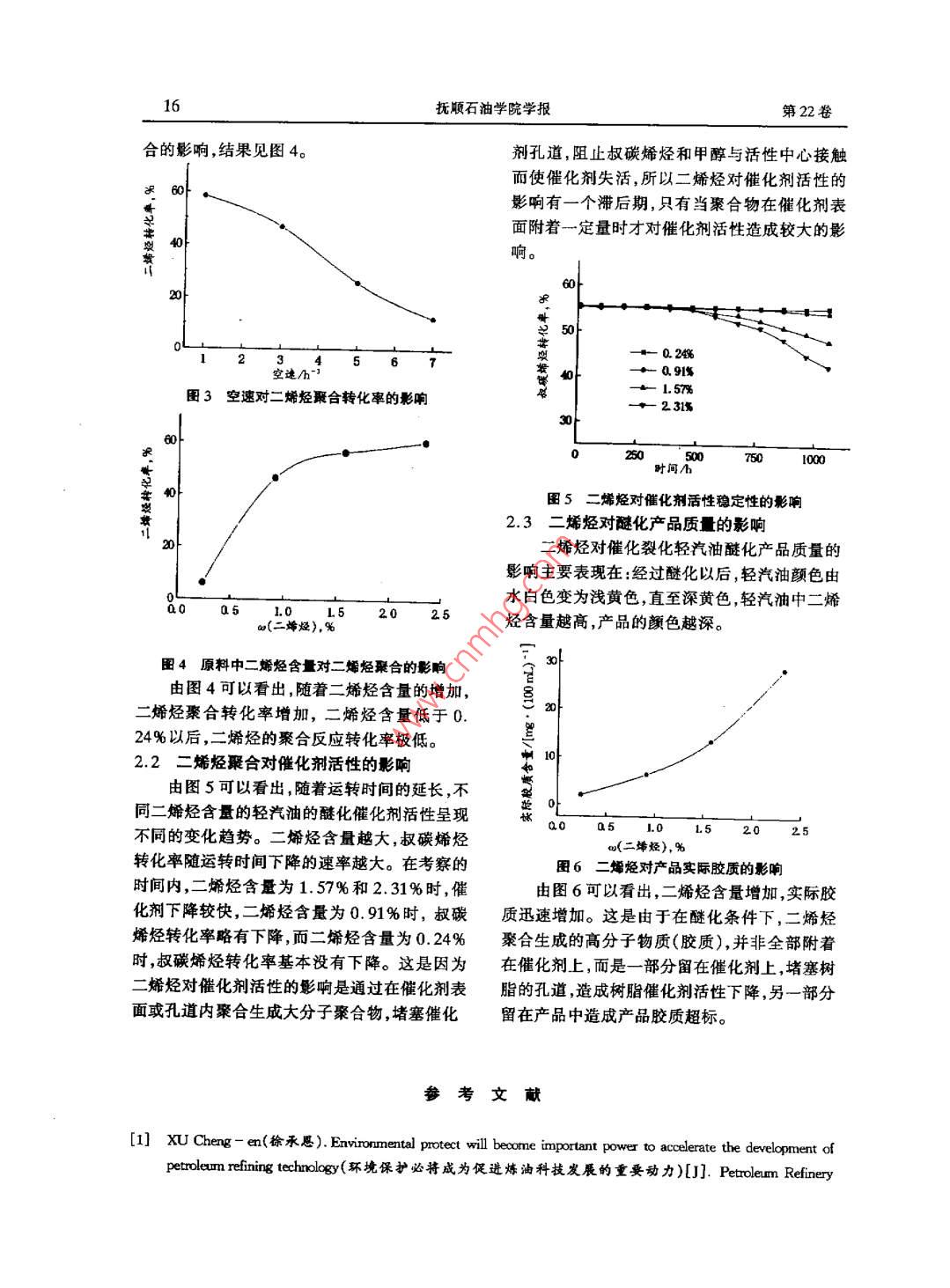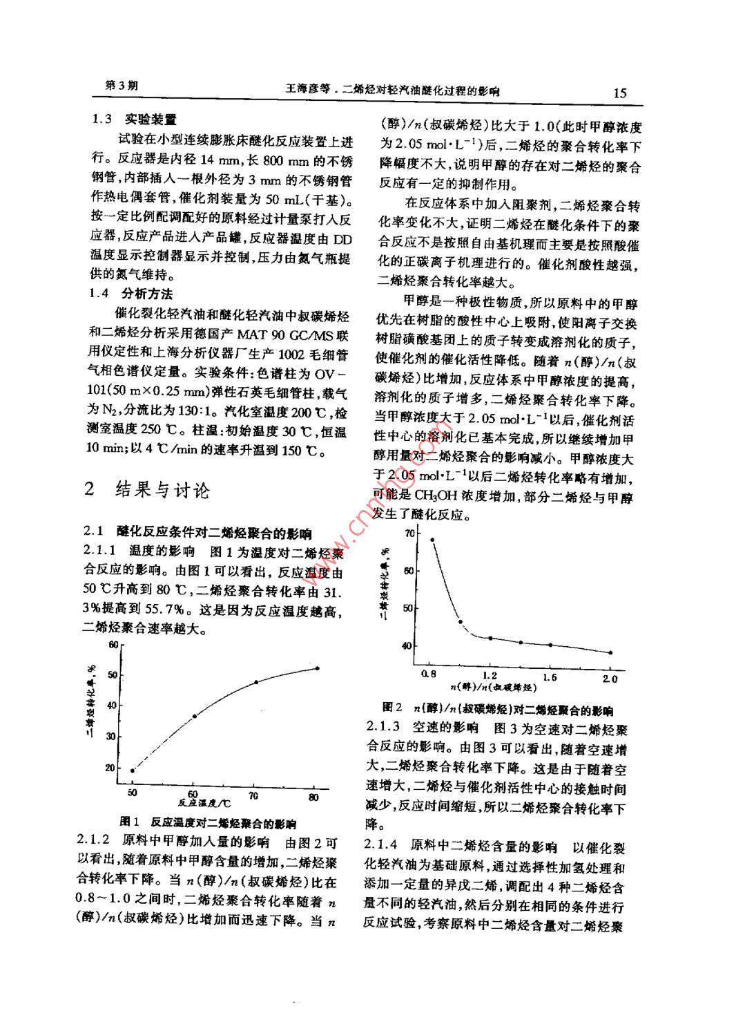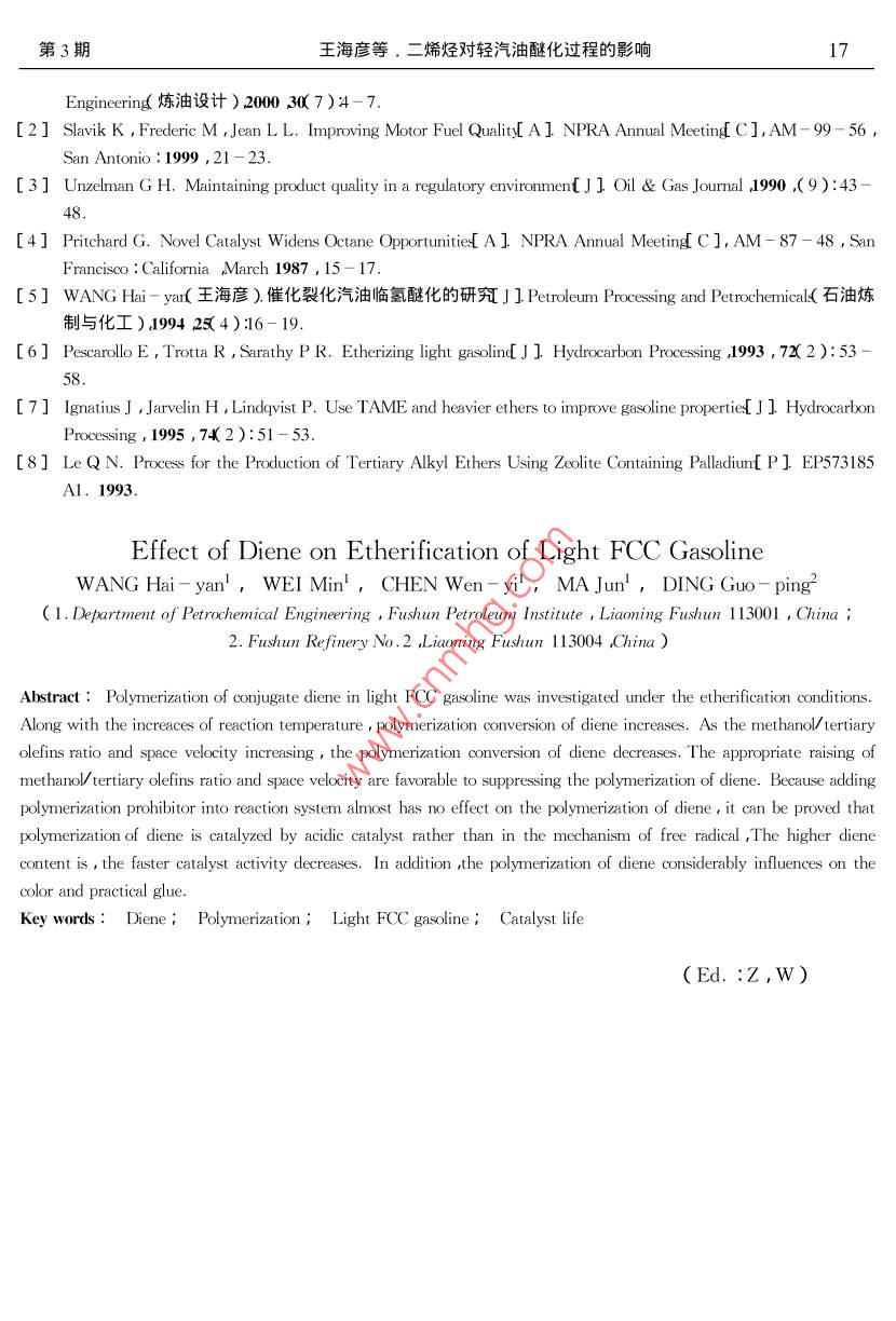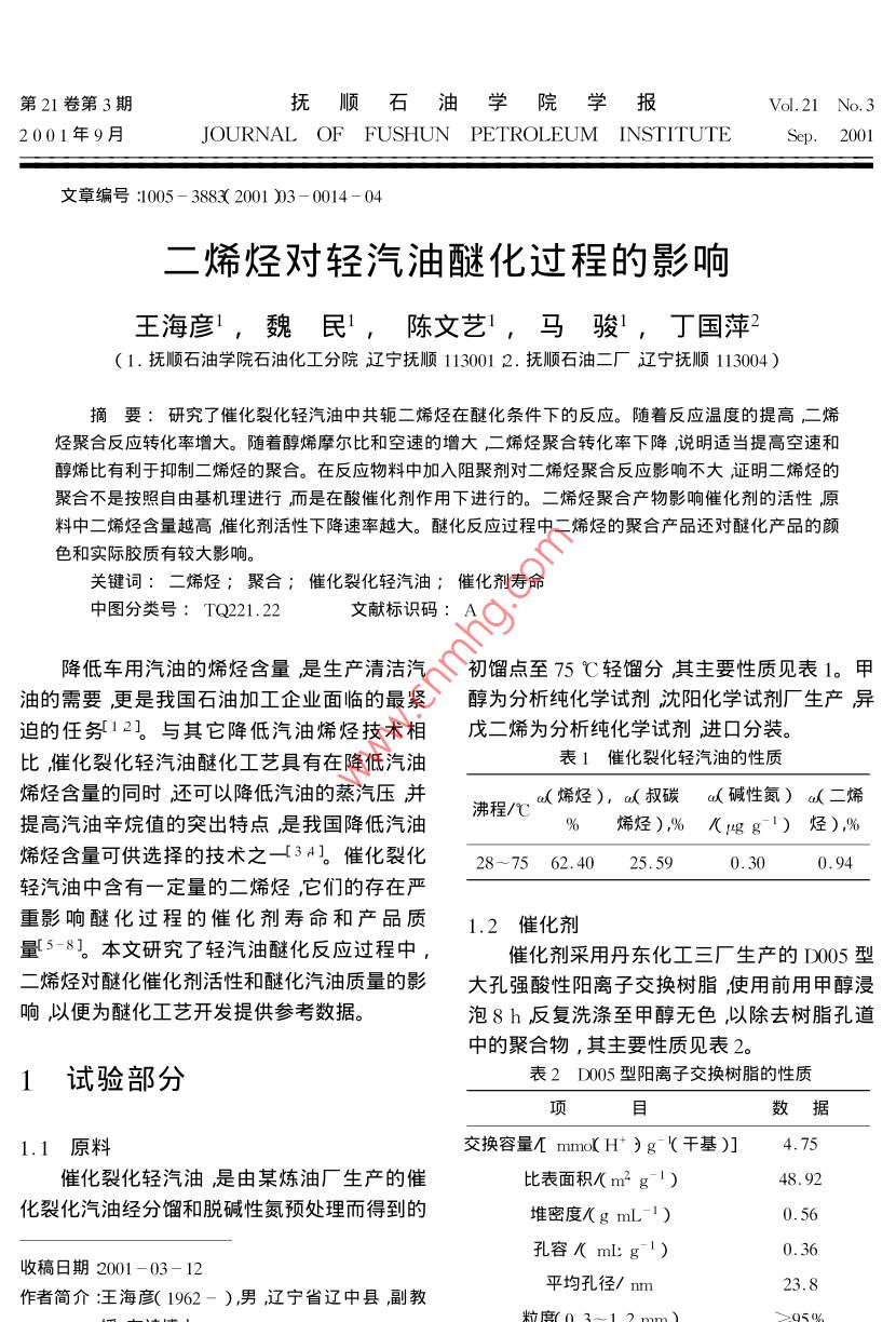 第21卷第3期撫順石油學(xué)院學(xué)報(bào)Vol.21 No. 32001年9月JOURNAL OFFUSHUN PETROL EUM INSTITUTESep.2001文章編號(hào):1005- 3883< 2001 )3-0014- 04二烯烴對(duì)輕汽油醚化過程的影響王海彥,魏民',陳文藝',馬駿',丁國(guó)萍2( 1.撫順石油學(xué)院石油化工分院遼寧撫順113001 2.撫順石油二廠遼寧撫順113004 )摘要: 研究了催化裂化輕汽油中共軛二烯烴在醚化條件 下的反應(yīng)。隨著反應(yīng)溫度的提高二烯烴聚合反應(yīng)轉(zhuǎn)化率增大。隨著醇烯摩爾比和空速的增大二烯烴聚合轉(zhuǎn)化率下降,說明適當(dāng)提高空速和醇烯比有利于抑制二烯烴的聚合。在反應(yīng)物料中加入阻聚劑對(duì)二烯烴聚合反應(yīng)影響不大,證明二烯烴的聚合不是按照自由基機(jī)理進(jìn)行,而是在酸催化劑作用下進(jìn)行的。二烯烴聚合產(chǎn)物影響催化劑的活性原料中二烯烴含量越高催化劑活性下降速率越大。醚化反應(yīng)過程中二烯烴的聚合產(chǎn)品還對(duì)醚化產(chǎn)品的顏色和實(shí)際膠質(zhì)有較大影響。關(guān)鍵詞:二烯烴;聚合;催化裂化輕汽油;催化劑壽命中圖分類號(hào): TQ221.22文獻(xiàn)標(biāo)識(shí)碼: A降低車用汽油的烯烴含量是生產(chǎn)清潔汽初餾點(diǎn)至75 C輕餾分其主要性質(zhì)見表1。甲油的需要更是我國(guó)石油加工企業(yè)面臨的最緊醇為分析純化學(xué)試劑沈陽(yáng)化學(xué)試劑廠生產(chǎn)異迫的任務(wù)[12。與其它降低汽油烯烴技術(shù)相戊二烯為分析純化學(xué)試劑進(jìn)口分裝。比催化裂化輕汽油醚化工藝具有在降低汽油表1催化裂化輕汽油的性質(zhì)烯烴含量的同時(shí)還可以降低汽油的蒸汽壓并ad烯烴), ad叔碳a(堿性氮) a(二烯沸程/C提高汽油辛烷值的突出特點(diǎn)是我國(guó)降低汽油%烯烴),%/(g g1)烴)%.烯烴含量可供選擇的技術(shù)之一[34]。 催化裂化28~75 62. 4025.590.300. 94輕汽油中含有一定量的二烯烴,它們的存在嚴(yán)重影響醚化過程的催化劑壽命和產(chǎn)品質(zhì)1.2 催化劑量5-8。本文研究了輕汽油醚化反應(yīng)過程中,催化劑采用丹東化工三廠生產(chǎn)的D005型二烯烴對(duì)醚化催化劑活性和醚化汽油質(zhì)量的影大孔強(qiáng)酸性陽(yáng)離子交換樹脂,使用前用甲醇浸響,以便為醚化工藝開發(fā)提供參考數(shù)據(jù)。泡8h反復(fù)洗滌至甲醇無(wú)色,以除去樹脂孔道中的聚合物,其主要性質(zhì)見表2。1試驗(yàn)部分表2 D005型陽(yáng)離子交換樹脂的性質(zhì)項(xiàng)目數(shù)據(jù)1.1 原料交換容量[ mmo(H+ )g-'(干基)]4.75催化裂化輕汽油是由某煉油廠生產(chǎn)的催比表面積(m2 g I )48. 92.化裂化汽油經(jīng)分餾和脫堿性氮預(yù)處理而得到的堆密度(g mL-1 )0.56孔容/( ml:g-1)0.36收稿日期2001 -03- 12平均孔徑/ nm .23. 8作者簡(jiǎn)介:王海彥( 1962- ),男遼寧省遼中縣副教.粒度(0.3~ 1.2 mm)≥95%授在讀博土。基金項(xiàng)目:中國(guó)石化集團(tuán)公司資助項(xiàng)目( 195028 )第3期王海彥等.二烯烴對(duì)輕汽油醚化過程的影響151.3實(shí)驗(yàn)裝置(醇)/n(叔碳烯烴)比大于1. 0(此時(shí)甲醇濃度試驗(yàn)在小型連續(xù)膨脹床醚化反應(yīng)裝置上進(jìn)為2.05 mol.L-1)后,二烯烴的聚合轉(zhuǎn)化率下行。反應(yīng)器是內(nèi)徑14 mm,長(zhǎng)800 mm的不銹降幅度不大,說明甲醇的存在對(duì)二烯烴的聚合鋼管,內(nèi)部插人一根外徑為3mm的不銹鋼管反應(yīng)有一定的抑制作用。作熱電偶套管,催化劑裝量為50 mL(干基)。在反應(yīng)體系中加入阻聚劑,二烯烴聚合轉(zhuǎn)按一定比例配調(diào)配好的原料經(jīng)過計(jì)量泵打人反化率變化不大,證明二烯烴在醚化條件下的聚應(yīng)器,反應(yīng)產(chǎn)品進(jìn)人產(chǎn)品罐,反應(yīng)器溫度由DD合反應(yīng)不是按照自由基機(jī)理而主要是按照酸催溫度顯示控制器顯示并控制,壓力由氨氣瓶提化的正碳離子機(jī)理進(jìn)行的。催化劑酸性越強(qiáng),供的氮?dú)饩S持。二烯烴聚合轉(zhuǎn)化率越大。1.4分析方法甲醇是一種極性物質(zhì),所以原料中的甲醇催化裂化輕汽油和醚化輕汽油中叔碳烯烴優(yōu)先在樹脂的酸性中心上吸附,使陽(yáng)離子交換和二烯烴分析采用德國(guó)產(chǎn)MAT 90 GCAMS聯(lián)樹脂磺酸基團(tuán)上的質(zhì)子轉(zhuǎn)變成溶劑化的質(zhì)子,用儀定性和上海分析儀器廠生產(chǎn)1002毛細(xì)管使催化劑的催化活性降低。隨蓍n(醇)/n(叔氣相色譜儀定量。實(shí)驗(yàn)條件:色譜柱為OV -碳烯烴)比增加,反應(yīng)體系中甲醇濃度的提高,101(50 mX0.25 mm)彈性石英毛細(xì)管柱,載氣溶劑化的質(zhì)子增多,二烯烴聚合轉(zhuǎn)化率下降。為N2,分流比為130:1。汽化室溫度200C ,檢當(dāng)甲醇濃度大于2.05 mol.L-'以后,催化劑活測(cè)室溫度250 C。柱溫:初始溫度30 C,恒溫性中心的溶劑化已基本完成,所以繼續(xù)增加甲10 min;以4 C /min的速率升溫到150 C。醇用量對(duì)二烯烴聚合的影響減小。甲醇依度大于2.05 mol"L-以后二烯烴轉(zhuǎn)化率略有增加,2結(jié)果與討論可能是CHzOH濃度增加,部分二烯烴與甲醇發(fā)生了醚化反應(yīng)。2.1醚化反應(yīng)條件對(duì)二烯烴聚合的影響702.1.1溫度的影響圖 1為溫度對(duì)二烯烴聚合反應(yīng)的影響。由圖1可以看出,反應(yīng)溫度由50 C升高到80 C,二烯烴聚合轉(zhuǎn)化率由31.3%提高到55.7%。這是因?yàn)榉磻?yīng)溫度越高,二烯烴聚合速