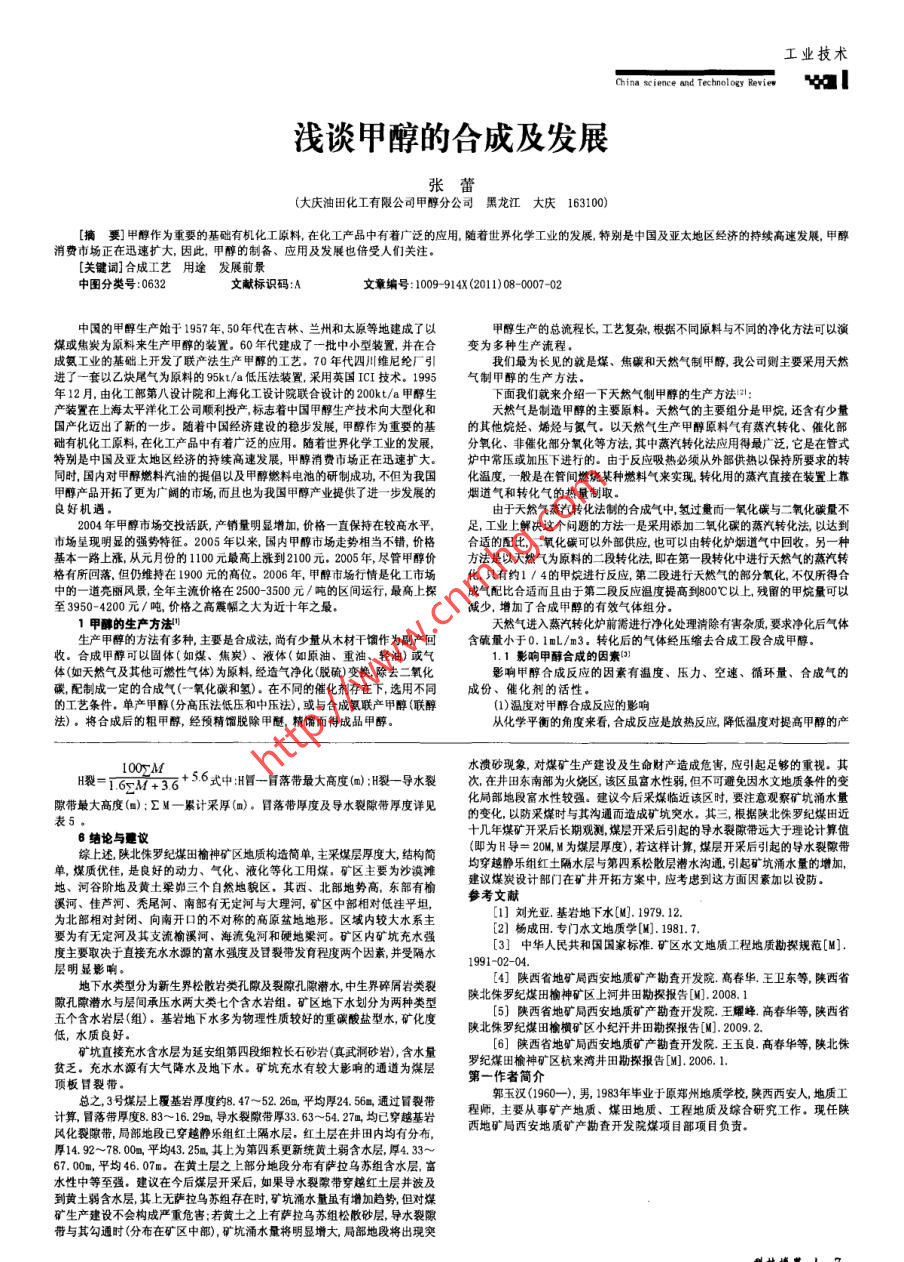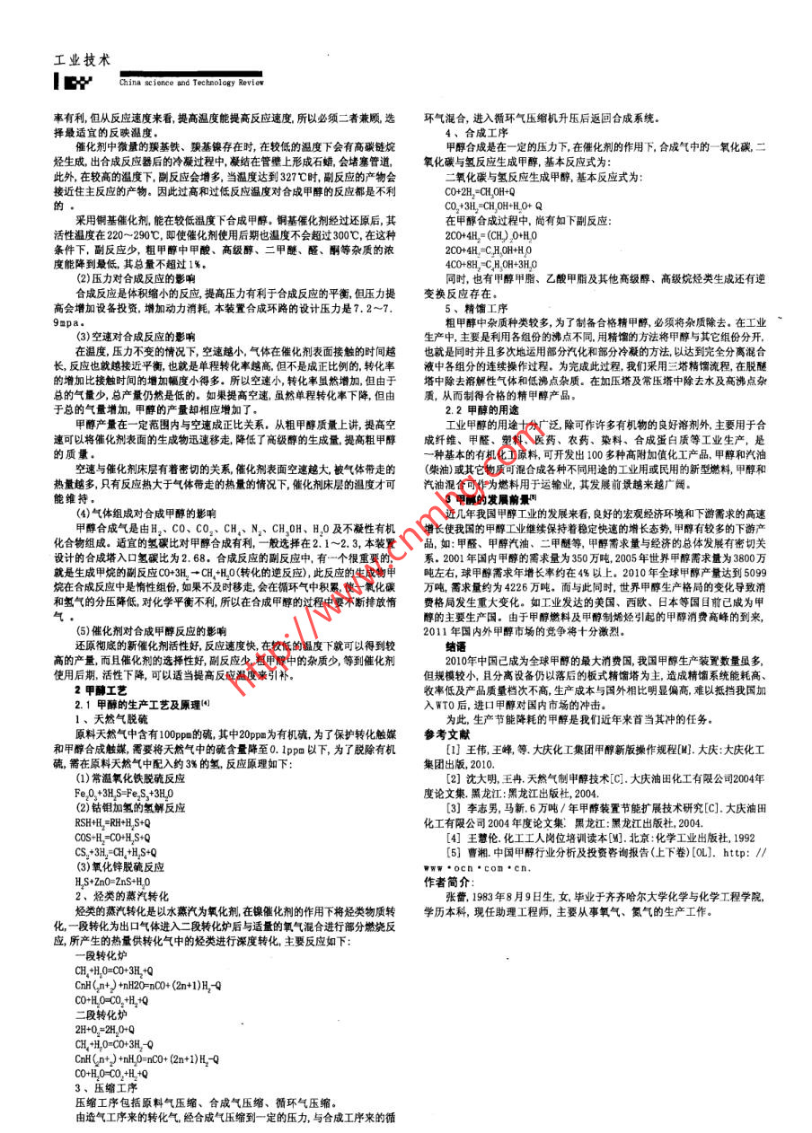 工業(yè)技術(shù)China ience and Technology Reviewl淺談甲醇的合成及發(fā)展張蕾(大慶油田化工有限公司甲醇分公司黑龍江 大慶163100)[摘要] 甲醇作為重要的基礎(chǔ)有機(jī)化工原料,在化I產(chǎn)品中有著廣泛的應(yīng)用,隨著世界化學(xué)工業(yè)的發(fā)展,特別是中國(guó)及亞太地區(qū)經(jīng)濟(jì)的持續(xù)高速發(fā)展,甲醇消費(fèi)市場(chǎng)正在迅速擴(kuò)大,因此,甲醇的制備、應(yīng)用及發(fā)展也倍受人們關(guān)注。[關(guān)鍵詞]合成工藝用途發(fā)展前景中團(tuán)分類(lèi)號(hào):0632文獻(xiàn)標(biāo)識(shí)碼:A文章編號(hào): 1009 914(2011)08 -00020中國(guó)的甲醇生產(chǎn)始于1957年, 50年代在吉林、蘭州和太原等地建成了以甲醇生產(chǎn)的總流程長(zhǎng),工藝復(fù)雜根據(jù)不同原料與不同的凈化方法可以演煤或焦炭為原料來(lái)生產(chǎn)甲醇的裝置。60年代建成了一批中小型裝置,并在合變?yōu)槎喾N生產(chǎn)流程.成氨工業(yè)的基礎(chǔ)上開(kāi)發(fā)了聯(lián)產(chǎn)法生產(chǎn)甲醇的工藝。70年代四川維尼綸廠引我們最為長(zhǎng)見(jiàn)的就是煤、焦碳和天然氣制甲醇,我公司則主要采用天然進(jìn)了一套以乙炔尾氣為原料的95kt/a低壓法裝置,采用英國(guó)ICI技術(shù)。1995氣制甲醉的生產(chǎn)方法。年12月,由化工部第八設(shè)計(jì)院和上海化工設(shè)計(jì)院聯(lián)合設(shè)計(jì)的200kt/a甲醇生下面我們就來(lái)介紹一下天然氣制甲醇的生產(chǎn)方法叫:產(chǎn)裝置在上海太平洋化工公司順利投產(chǎn),標(biāo)志著中國(guó)甲醇生產(chǎn)技術(shù)向大型化和天然氣是制造甲醇的主要原料。天然氣的主要組分是甲烷,還含有少量國(guó)產(chǎn)化邁出了新的一步。隨著中國(guó)經(jīng)濟(jì)建設(shè)的穩(wěn)步發(fā)展,甲醇作為重要的基的其他烷烴、烯烴與氨氣。以天然氣生產(chǎn)甲醇原料氣有蒸汽轉(zhuǎn)化、催化部礎(chǔ)有機(jī)化工原料,在化工產(chǎn)品中有著廣泛的應(yīng)用。隨著世界化學(xué)工業(yè)的發(fā)展,分氧化、非催化部分氧化等方法,其中蒸汽轉(zhuǎn)化法應(yīng)用得最廣泛。它是在管式特別是中國(guó)及亞太地區(qū)經(jīng)濟(jì)的持續(xù)高速發(fā)展,甲醇消費(fèi)市場(chǎng)正在迅速擴(kuò)大。爐中常壓或加壓下進(jìn)行的。由于反應(yīng)吸熱必須從外部供熱以保持所要求的轉(zhuǎn)同時(shí),國(guó)內(nèi)對(duì)甲醇燃料汽油的提倡以及甲醇燃料電池的研制成功,不但為我國(guó)化溫度,-般是在管 間燃燒某種燃料氣來(lái)實(shí)現(xiàn)轉(zhuǎn)化用的蒸汽直接在裝置上靠甲醇產(chǎn)品開(kāi)拓了更為廣關(guān)的市場(chǎng),而且也為我國(guó)甲醇產(chǎn)業(yè)提供了進(jìn)一一步發(fā)展的煙道氣和轉(zhuǎn)化氣的熱量制取。良好機(jī)遇。由于天然氣蒸汽轉(zhuǎn)化法制的合成氣中,氫過(guò)量而一氧化碳與二氧化碳量不2004年甲醇市場(chǎng)交投活躍,產(chǎn)銷(xiāo)量明顯增加,價(jià)格- -直保持在較高水平,足,工業(yè)上解決這個(gè)問(wèn)題的方法一是采用添 加二氧化碳的蒸汽轉(zhuǎn)化法,以達(dá)到市場(chǎng)呈現(xiàn)明顯的強(qiáng)勢(shì)特征。2005年以來(lái),國(guó)內(nèi)甲醇市場(chǎng)走勢(shì)相當(dāng)不錯(cuò),價(jià)格合適的配比,二氧化碳可以外部供應(yīng)。也可以由轉(zhuǎn)化爐煙道氣中回收。另一種基本一路上漲,從元月份的1100元最高上漲到2100元。2005年,盡管甲醇價(jià)方法是以天然氣為原料的二段轉(zhuǎn)化法,即在第-段轉(zhuǎn)化中進(jìn)行天然氣的蒸汽轉(zhuǎn)格有所回落,但仍維持在1900元的高位。2006 年,甲醇市場(chǎng)行情是化工市場(chǎng)化.只有約1 1 4的甲烷進(jìn)行反應(yīng),第二段進(jìn)行天然氣的部分氧化,不僅所得合中的一道亮麗風(fēng)景,全年主流價(jià)格在2500-3500元/噸的區(qū)間運(yùn)行,最高上探成氣配比合適而 且由于第二段反應(yīng)溫度提高到800C以上殘留的甲烷量可以至3950- 4200元/噸,價(jià)格之高震幅之大為近十年之最。減少,增加了合成甲醇的有效氣體組分。1甲醇的生產(chǎn)方法"天然氣進(jìn)入蒸汽轉(zhuǎn)化爐前需進(jìn)行凈化處理清除有害雜質(zhì),要求凈化后氣體生產(chǎn)甲醇的方法有多種,主要是合成法,尚有少量從木材干饋?zhàn)鳛楦碑a(chǎn)回含硫量小于0.1ml/m3.轉(zhuǎn)化后的氣體經(jīng)壓縮去合成工段合成甲醇。收。合成甲醇可以固體(如煤、焦炭)、液體(如原油、重油、輕油)或氣1.1影響甲醇合成的因素()體(如天然氣及其他可燃性氣體)為原料,經(jīng)造氣凈化(脫硫)變換,除去二氧化影響甲醇合成反應(yīng)的因素有溫度、壓力、空速、循環(huán)量、合成氣的碳,配制成- -定的合成氣(-氧化碳和氫)。在不同的催化劑存在下,選用不同成份、催化劑的活性。的工藝條件。單產(chǎn)甲醇(分高壓法低壓和中壓法),或與合成氨聯(lián)產(chǎn)甲醇(聯(lián)醇(1)溫度對(duì)甲醇合成反應(yīng)的影響法)。將合成后的粗甲醇,經(jīng)預(yù)精餾脫除甲醚,精餾而得成晶甲醇。從化學(xué)平衡的角度來(lái)看,合成反應(yīng)是放熱反應(yīng)降低溫度對(duì)提高甲醇的產(chǎn)1005M水潰砂現(xiàn)象,對(duì)煤礦生產(chǎn)建沒(méi)及生命財(cái)產(chǎn)造成危害,應(yīng)引起足夠的重視。其H裂= 165M+36 +5.6式中:H