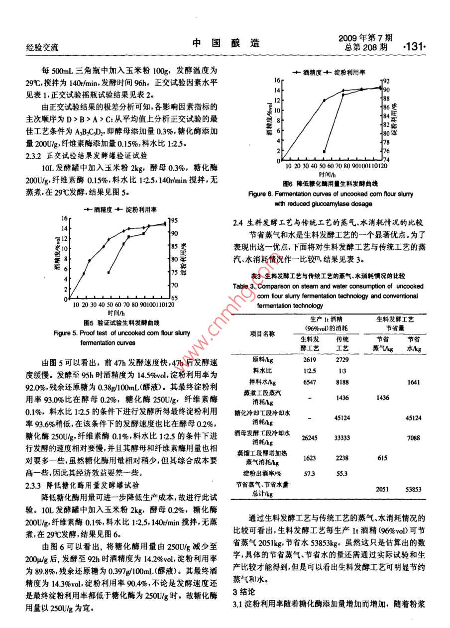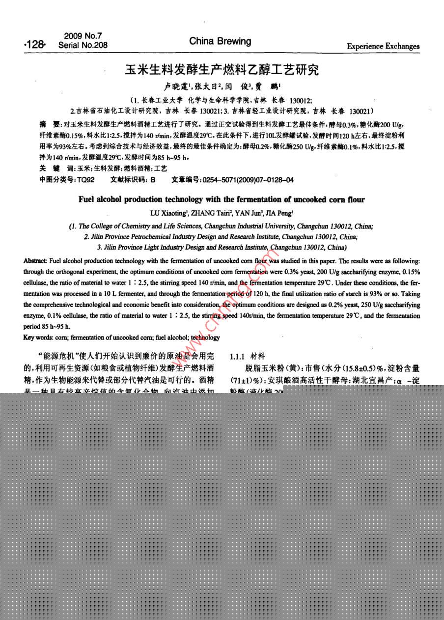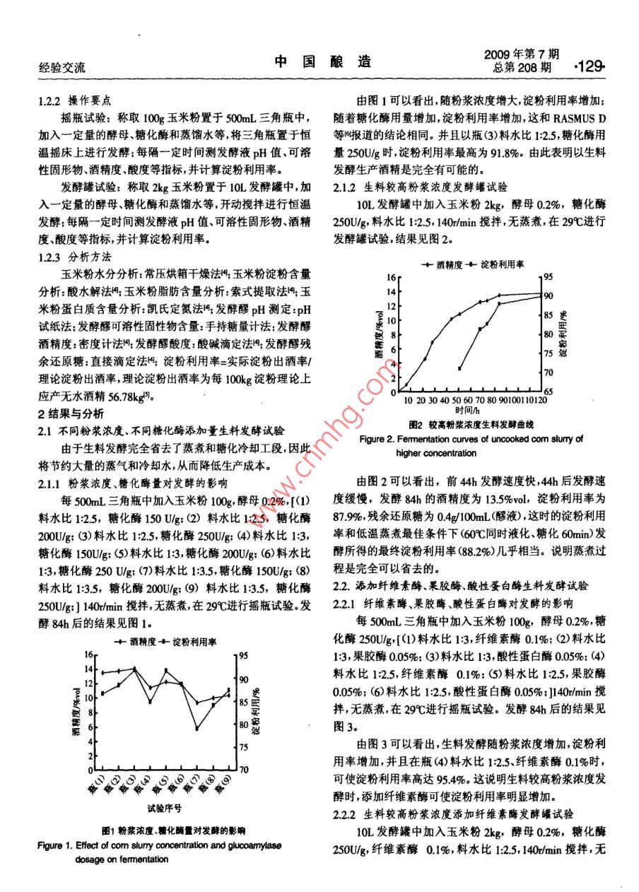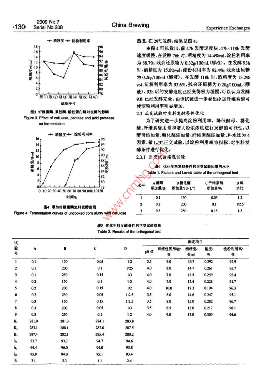 2009No7128 Serial No 208China BrewingExperience Exchanges玉米生料發(fā)酵生產(chǎn)燃料乙醇工藝研究盧曉霆,張?zhí)?閆俊,賈鵬(1.長春工業(yè)大學(xué)化學(xué)與生命科學(xué)學(xué)院,吉林長春130012;2吉林省石油化工設(shè)計研究院,吉林長春130021;3.吉林省輕工業(yè)設(shè)計研究院,吉林長春13021)摘要:對玉米生料發(fā)酵生產(chǎn)燃料酒精工藝進行了研究,通過正交試驗得到生料發(fā)酵工藝最佳條件:酵母03%,糖化酶200Ug纖維素酶015%料水比125,攪拌為140rmin,發(fā)酵溫度29℃.在此條件下,進行10L發(fā)酵罐試驗發(fā)酵時間120h左右,最終淀粉用率為93%左右考慮到綜合技術(shù)與經(jīng)濟效益最終的最佳條件確定為:酵母0.2%,糖化酶250Ug,纖維素酶0.%,料水比125,攪拌為140rmin,發(fā)酵溫度29℃,發(fā)酵時間為85h-95h關(guān)鍵詞:玉米;生料發(fā)酵:燃料酒精:工藝中圖分類號:TQ92文獻標(biāo)識碼:B文章編號:0254-5071(2009)07-012804Fuel alcohol production technology with the fermentation of uncooked corn flotLU Xiaoting, ZHANG Tairi?, YAN Jun, JIA Peng(1. The College of Chemistry and Life Sciences, Changchun Industrial University, Changchun 130012, China;2. Jilin Province Petrochemical Industry Design and Research Institute, Changchun 130012, China3. Jilin Province Light Industry Design and Research Institute, Changchun 130012, China)Abstract: Fuel alcohol production technology with the fermentation of uncooked com flour was studied in this paper. The results were as following:through the orthogonal experiment, the optimum conditions of uncooked com fermentation were 0.3% yeast, 200 U/g saccharifying enzyme, 0.15%cellulase, the ratio of material to water 1:2.5, the stiming speed 140 r/min, and the fermentation temperature 29C. Under these conditions, the fermentation was processed in a 10 L fermenter, and through the fermentation period of 120 h, the final utilization ratio of starch is 93% or so. Takingthe comprehensive technological and economic benefit into consideration, the optimum conditions are designed as 0.2% yeast, 250 U/g saccharifyingenzyme, 0. 1%cellulase, the ratio of material to water 1: 2.5, the stiring speed 140r/min, the fermentation temperature 29C, and the fermentationperiod 85 b-95hKey words: com; fermentation of uncooked com; fuel alcohol; technology“能源危機”使人們開始認(rèn)識到廉價的原油是會用完111材料的,利用可再生資源(如糧食或植物纖維)發(fā)酵生產(chǎn)燃料酒脫脂玉米粉(黃):市售(水分(158±05)%,淀粉含量精,作為生物能源來代替或部分代替汽油是可行的。酒精(71±1)%);安琪釀酒高活性干酵母:湖北宜昌產(chǎn);a-淀是一種具有較高辛烷值的含氧化合物,向汽油中添加粉酶(液化酶2000g:湖南省津市市新型發(fā)酵有限責(zé)任5%-10%無水酒精其辛烷值可提高2~3,發(fā)動機不需任公司生產(chǎn);糖化酶(50000g):無錫市酶制劑廠生產(chǎn):纖維何改動,不會減少發(fā)動機動力而且還有助于汽油的充分素酶(00g0、果膠酶(3000g)、酸性蛋白酶燃燒,降低汽車尾氣中一氧化碳、碳?xì)浠衔锛傲虻呐欧?(00oug):肇東國科北方酶制劑有限公司生產(chǎn)有利于環(huán)境保護。1.12設(shè)備傳統(tǒng)的酒精生產(chǎn)工藝的能耗很高,尤其是其高壓蒸煮10L全自動發(fā)酵罐:上海保興生物設(shè)備有限公司生工段的能耗、氣耗占整個生產(chǎn)工序能量投入的30%40%產(chǎn);氣浴恒溫?fù)u床THZ-82B:江蘇省金壇市醫(yī)療儀器廠;左右,并且由此而產(chǎn)生的生產(chǎn)冷卻用水量猛增也使酒精電熱恒溫干燥箱湖北省黃石市醫(yī)療器械廠生產(chǎn);恒溫水的生產(chǎn)成本增加淀粉質(zhì)原料生料發(fā)酵生產(chǎn)酒精取消了蒸浴鍋:電子天平(精確至0000g);分析天平:托盤天平(精煮工段和冷卻糖化工段,從而大幅度降低蒸汽和水的消耗確至01g);托盤天平(最大量程8kg)及減少設(shè)備的使用,進一步簡化工藝,使勞動強度大幅下1.2方法降降低生產(chǎn)成本岡。本試驗采用脫脂玉米粉為原料,進行121生料發(fā)酵生產(chǎn)燃料酒精工藝流程生料發(fā)酵生產(chǎn)燃料酒精的工藝研究。1材料與方法脫胚玉米粉→調(diào)漿→加入制劑及酵母→生料發(fā)酵→蒸餾→脫1.1材料與設(shè)備水→燃料酒精收稿日期:基金項目:吉林省教育廳十一五’科研規(guī)劃項目(吉教科合字(2007第105號作者簡介;:盧曉鑫(1963-),男吉林長春人,副教授,主要從事食品生物工程產(chǎn)品的開發(fā)研究、設(shè)計與教學(xué)工作2009年第7期經(jīng)驗交流中國釀造總第208期129122操作要點由圖1可以看出,隨粉漿濃度增大,淀粉利用率增加搖瓶試驗:稱取100g玉米粉置于500mL三角瓶中,隨著糖化酶用量增加,淀粉利用率增加,這和 RASMUS D加入一定量的酵母、糖化酶和蒸餾水等將三角瓶置于恒等陶報道的結(jié)論相同。并且以瓶(3)料水比1:2.5,糖化酶用溫?fù)u床上進行發(fā)酵;每隔一定時間測發(fā)酵液pH值可溶量250Ug時,淀粉利用率最高為918%。由此表明以生料性固形物、酒精度、酸度等指標(biāo),并計算淀粉利用率發(fā)酵生產(chǎn)酒精是完全有可能的。發(fā)酵罐試驗:稱取2kg玉米粉置于10L發(fā)酵罐中,加2.1.2生料較高粉漿濃度發(fā)酵罐試驗入一定量的酵母糖化酶和蒸餾水等,開動攪拌進行恒溫10L發(fā)酵罐中加入玉米粉2kg,酵母0.2%,糖化酶發(fā)酵;每隔一定時間測發(fā)酵液pH值、可溶性固形物酒精250U/g,料水比1:25,140m/min攪拌無蒸煮,在29℃進行度、酸度等指標(biāo),并計算淀粉利用率發(fā)酵罐試驗,結(jié)果見圖2123分析方法酒