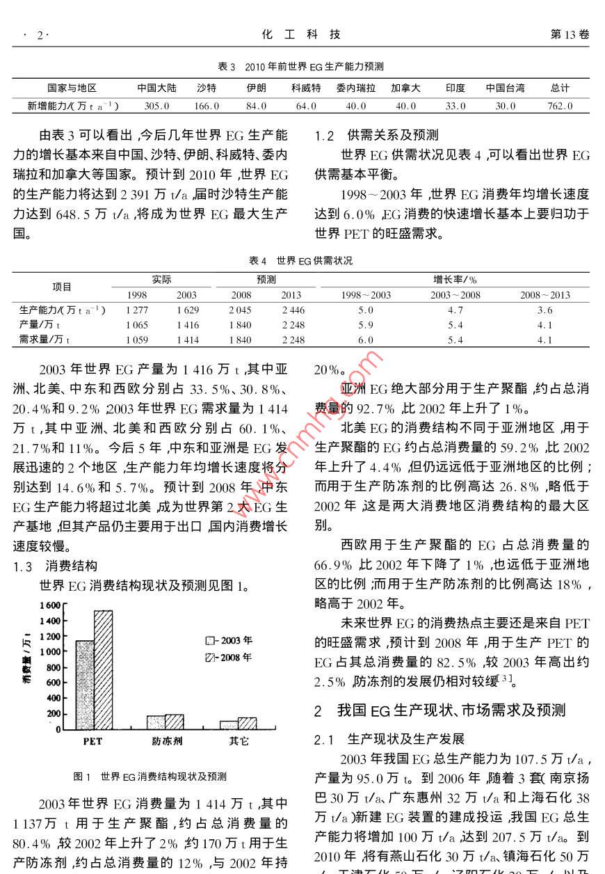 專家論壇化工科技20053(1):1~4scienCe TeChnology In chemical industry乙二醇市場供需分析于力中國石油吉林石化公司吉林吉林132021)摘要綜述了國內(nèi)外乙二醇的生產(chǎn)發(fā)展、供需和消費結(jié)構(gòu)預(yù)測了我國乙二醇的生產(chǎn)和需求根據(jù)目前我國乙二醇的生產(chǎn)狀況和存在的問題提出了發(fā)展建議關(guān)鍵詞乙二醇泩產(chǎn)市場中圖分類號:TQ223.16+2文獻標(biāo)識碼:A文章編號:100805112005m1-000104乙二醇EG)包括一乙二醇MEG)二乙二表12003年世界EG生產(chǎn)情況釀DEG)和三乙二醇(TEG),通常說的EG為地區(qū)國家生產(chǎn)能力占總生產(chǎn)能力MEG。EG是最簡單和最重要的脂肪族二元醇萬ta1)是石油化學(xué)工業(yè)的重要原料。EG最大的用途是北美美國生產(chǎn)聚酯其次是防凍液還可用作溶劑。加拿大世界EG生產(chǎn)現(xiàn)狀、市場需求及預(yù)測墨西哥南美1.1生產(chǎn)現(xiàn)狀及生產(chǎn)發(fā)展巴西委內(nèi)瑞拉8.2世界尤其是東亞和中國聚酯生產(chǎn)的快速發(fā)西歐展極大地拉動了世界EG市場。2003年世界中東EG生產(chǎn)能力達到1628.9萬t/a。由于BASF公215.0司業(yè)務(wù)的退出美國EG生產(chǎn)能力下降到327.5科威特萬t/a西歐和日本EG生產(chǎn)能力均呈現(xiàn)穩(wěn)中略有其它中東國家洲574.0下降的局面而在中東和加拿大等擁有豐富油田35.2日本82.5的區(qū)域EG產(chǎn)能激增。表1列出了2003年世韓國界EG生產(chǎn)情況12中國大陸世界前5名EG生產(chǎn)國依次為美國、中國、沙中國臺灣特、加拿大和韓國其合計產(chǎn)能占世界EG總產(chǎn)能東南亞的64.7%。世界前5名EG生產(chǎn)商依次為DOw72.0俄羅斯化學(xué)沙特 Sabic, shell中國臺灣南亞塑料和中國計1628.9100.0石化股份公司合計產(chǎn)能占世界總產(chǎn)能的43.7%見表22。表3為2010年前世界EG生產(chǎn)能力預(yù)表2世界前5名EG生產(chǎn)商生產(chǎn)能力測3主要生產(chǎn)商生產(chǎn)能力占總生產(chǎn)能力13Shell收稿日期2004-12-13中國臺灣南亞塑料作者簡介:于力(1959),男,遼寧新賓人,碩土研究中國石化股份公司生高級工程師中國石油吉林石化公司總經(jīng)理、黨委書化工科技第13卷表32010年前世界EG生產(chǎn)能力預(yù)測國家與地區(qū)中國大陸沙特伊朗科威特委內(nèi)瑞拉加拿大印度中國臺灣總計新增能力(萬ta1)305.0166.084.064.040.040.033.030.062.0由表3可以看出今后幾年世界EG生產(chǎn)能1.2供需關(guān)系及預(yù)測力的增長基本來自中國、沙特、伊朗、科威特、委內(nèi)世界EG供需狀況見表4,可以看出世界EG瑞拉和加拿大等國家。預(yù)計到2010年世界EG供需基本平衡。的生產(chǎn)能力將達到2391萬t/a屆時沙特生產(chǎn)能1998~2003年,世界EG消費年均增長速度力達到648.5萬t/a將成為世界EG最大生產(chǎn)達到6.0%EG消費的快速增長基本上要歸功于世界PET的旺盛需求表4世界EG供需狀況實際預(yù)測增長率/%項目1998200320081998-20032003-20082008-2013生產(chǎn)能力/萬ta1)1277162920452446產(chǎn)量/萬t10654162248需求量/萬14142003年世界EG產(chǎn)量為1416萬t其中亞20%。洲、北美、中東和西歐分別占33.5%、30.8%亞洲EG絕大部分用于生產(chǎn)聚酯約占總消20.4%和9.2%2003年世界EG需求量為1414費量的92.7%比2002年上升了1%。萬t,其中亞洲、北美和西歐分別占60.1%、北美EG的消費結(jié)構(gòu)不同于亞洲地區(qū)用于21.7%和11%。今后5年中東和亞洲是EG發(fā)生產(chǎn)聚酯的EG約占總消費量的59.2%比200展迅速的2個地區(qū)生產(chǎn)能力年均增長速度將分年上升了4.4%但仍遠遠低于亞洲地區(qū)的比例;別達到14.6%和5.7%。預(yù)計到2008年,中東而用于生產(chǎn)防凍劑的比例高達26.8%,略低于EG生產(chǎn)能力將超過北美成為世界第2大EG生2002年這是兩大消費地區(qū)消費結(jié)構(gòu)的最大區(qū)產(chǎn)基地但其產(chǎn)品仍主要用于出口國內(nèi)消費增長別速度較慢。西歐用于生產(chǎn)聚酯的EG占總消費量的1.3消費結(jié)構(gòu)66.9%比2002年下降了1%,也遠低于亞洲地世界EG消費結(jié)構(gòu)現(xiàn)狀及預(yù)測見圖1。區(qū)的比例而用于生產(chǎn)防凍劑的比例高達18%1600略高于2002年。1400未來世界EG的消費熱點主要還是來自PET的旺盛需求預(yù)計到2008年用于生產(chǎn)PET的-2008年EG占其總消費量的82.5%,較2003年高出約2.5%防凍劑的發(fā)展仍相對較緩3國黝,_現(xiàn)2我國EG生產(chǎn)現(xiàn)狀、市場需求及預(yù)測PET防凍劑其它2.1生產(chǎn)現(xiàn)狀及生產(chǎn)發(fā)展2003年我國EG總生產(chǎn)能力為107.5萬t/a,圖1世界EG消費結(jié)構(gòu)現(xiàn)狀及預(yù)測產(chǎn)量為95.0萬t。到2006年隨著3套南京揚2003年世界EG消費量為1414萬t其中30萬v/a、廣東惠州32萬va和上海石化381137萬t用于生產(chǎn)聚酯,約占總消費量的萬va)建EG裝置的建成投運我國FG總生80.4%較200年上升了2%約170萬t用于生產(chǎn)能力將增加100萬a達到207.5萬ao到產(chǎn)防凍劑約占總消費量的12%與2002年持2010年將有燕山石化30萬a鎮(zhèn)海石化50萬第1期于力.乙二醇市場供需分析412.5萬t/24表5為我國EG生產(chǎn)現(xiàn)狀及預(yù)上防凍劑的需求折合EG的表觀需求量約510測萬t當(dāng)量需求約610萬t缺口200萬t。表6為表5我國EG生產(chǎn)現(xiàn)狀及預(yù)測中國EG供需預(yù)測003年至2010年表6中國EG供需預(yù)測萬t廠名生產(chǎn)能力產(chǎn)量新增能力預(yù)計開萬ta-1)/萬t萬ta-1)車時間2005年2010年20